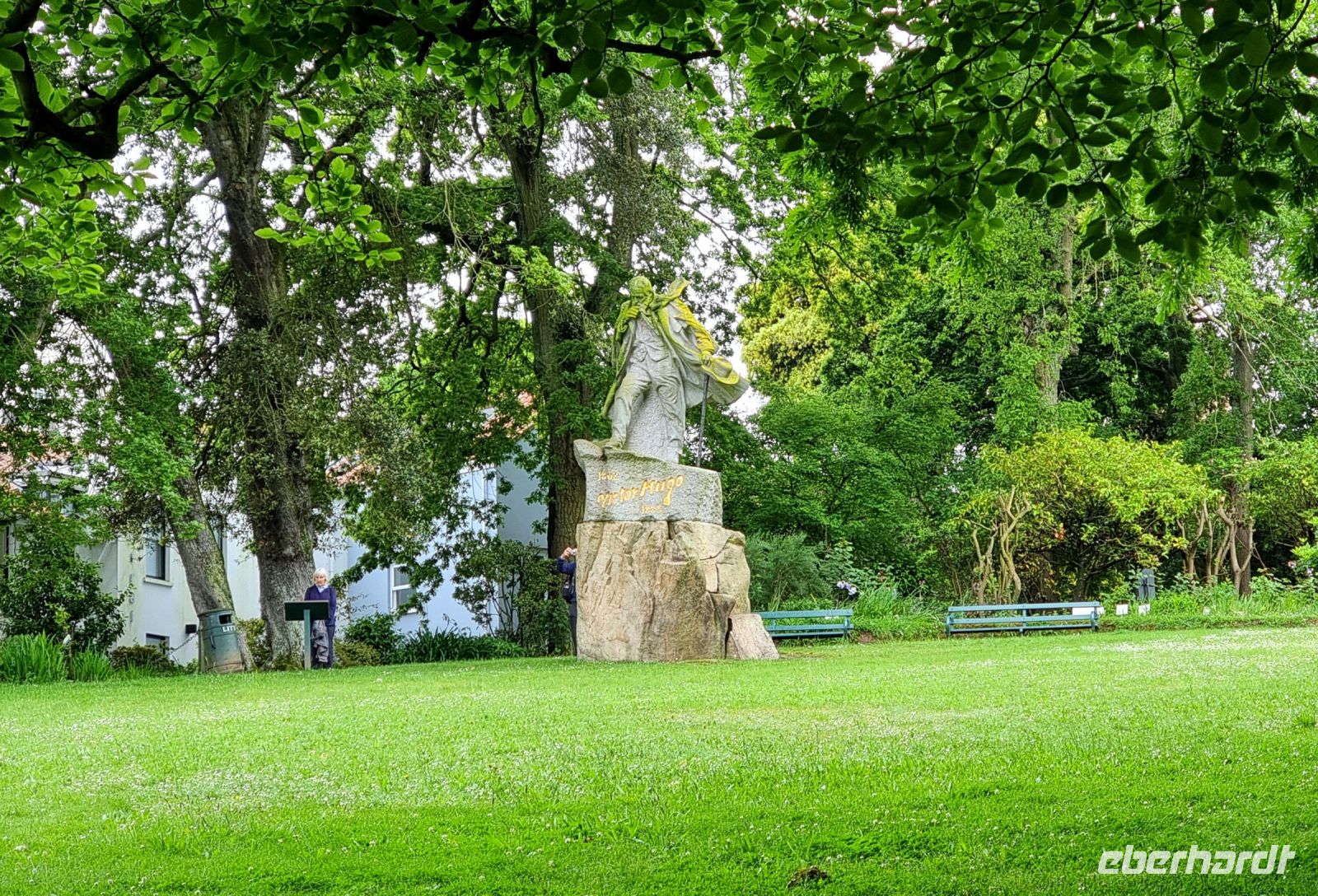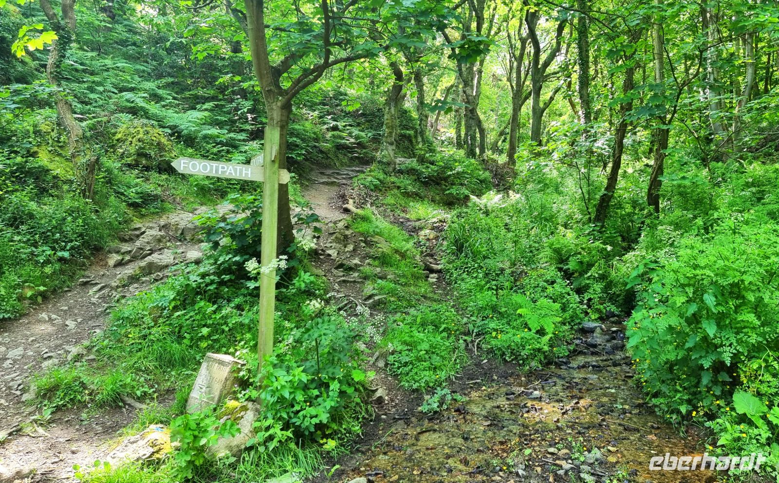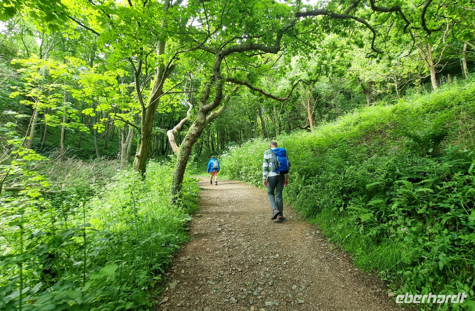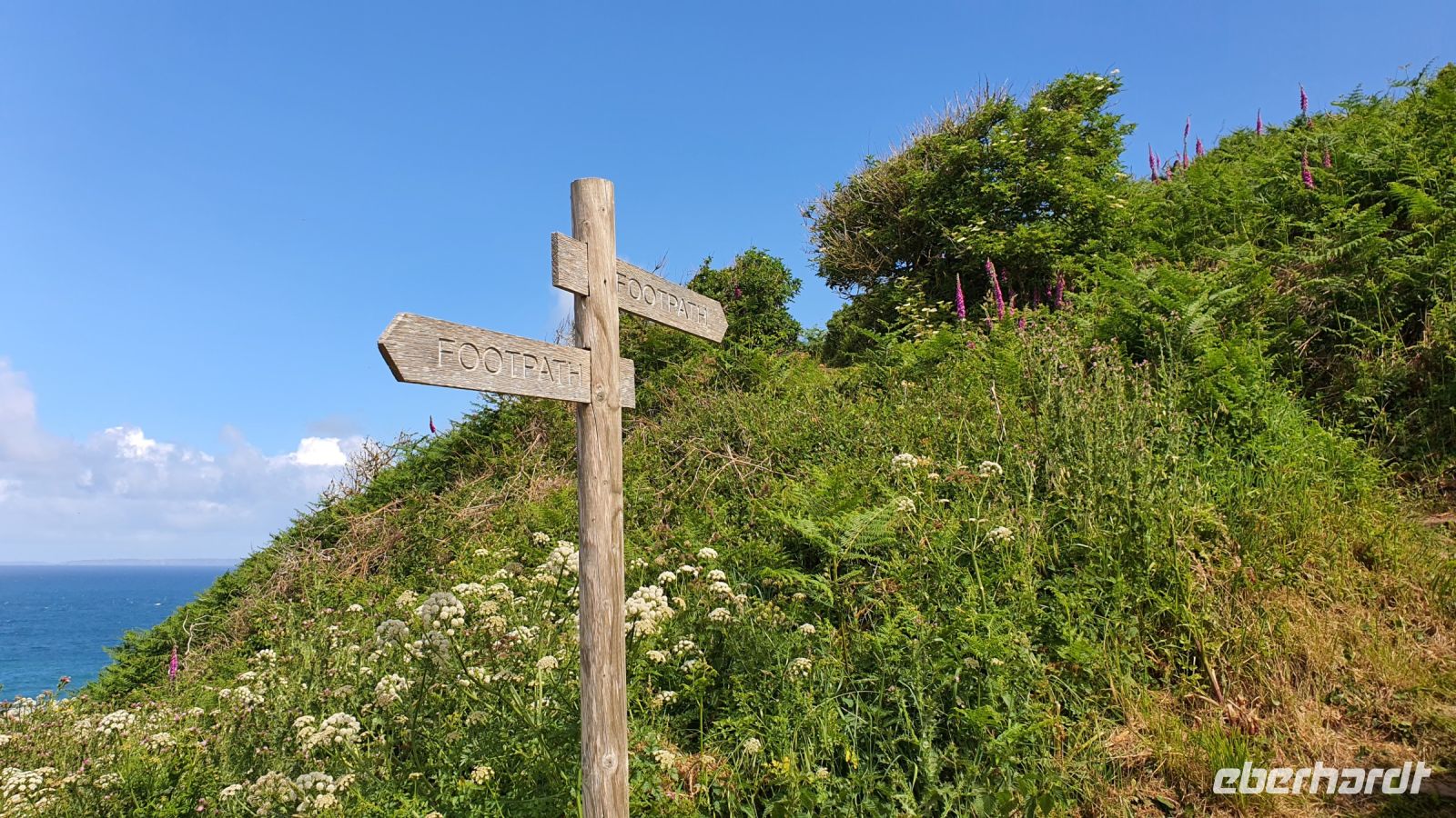 Gegen 13.00 Uhr wanderten wir weiter. Von der Bucht lag nun wieder ein Anstieg hinauf zum Küstenpfad vor uns. Mit vielen Treppen und durch kleine Waldgebiete liefen wir auch vorbei an einem Gedenkstein für gefallene Briten, die hier durch Deutsche Landminen verletzt wurden.