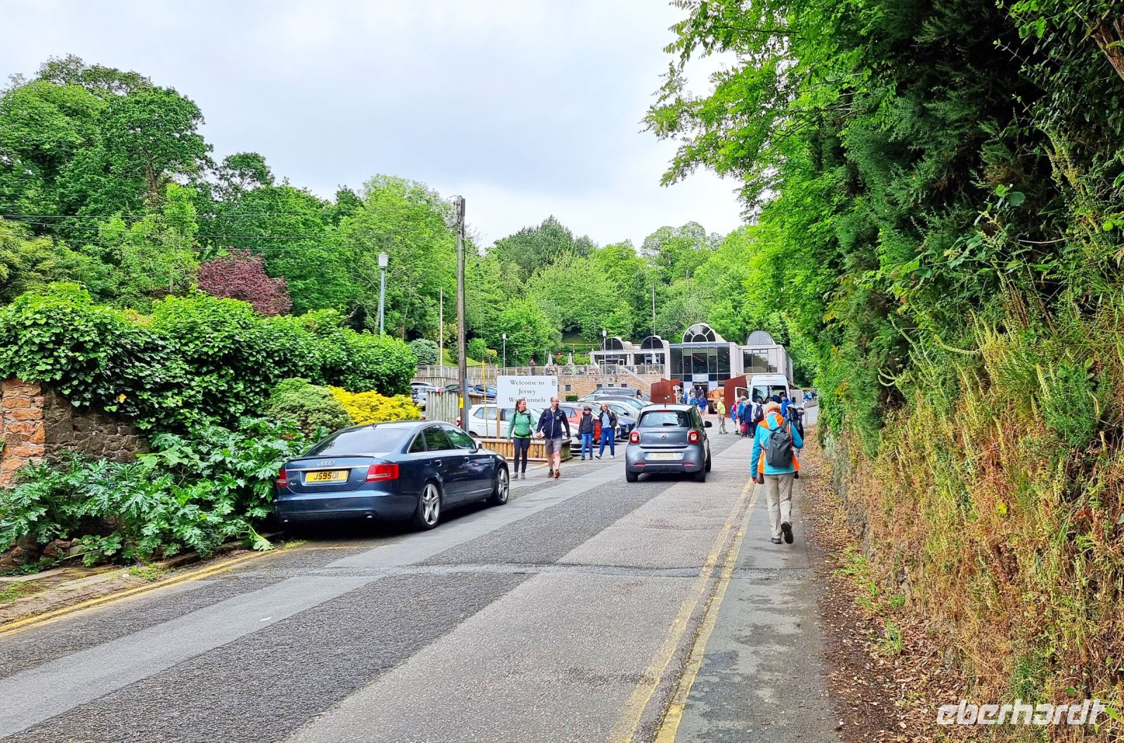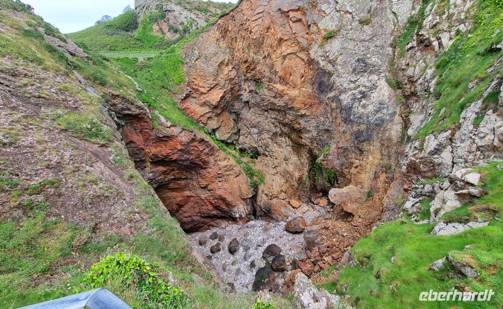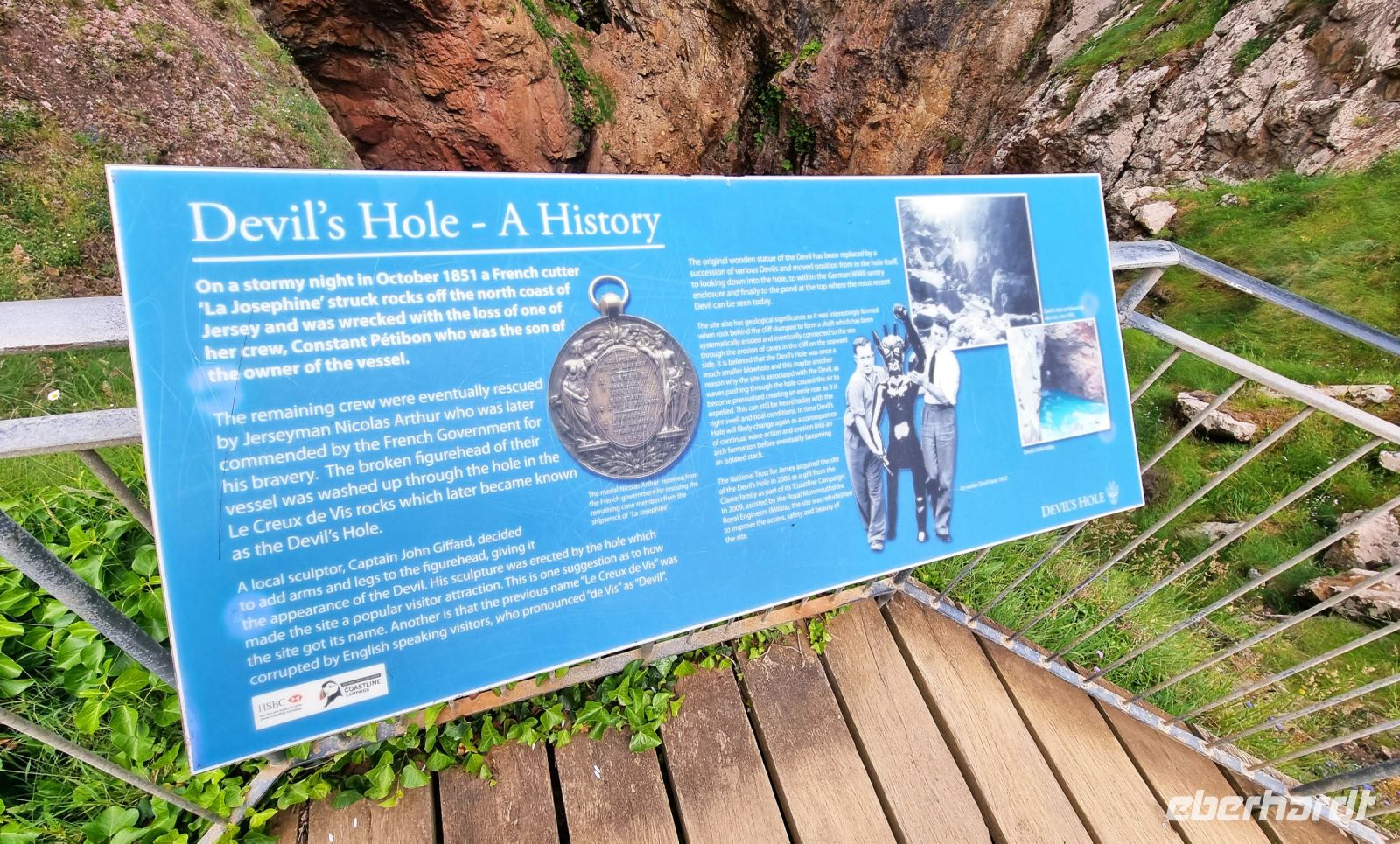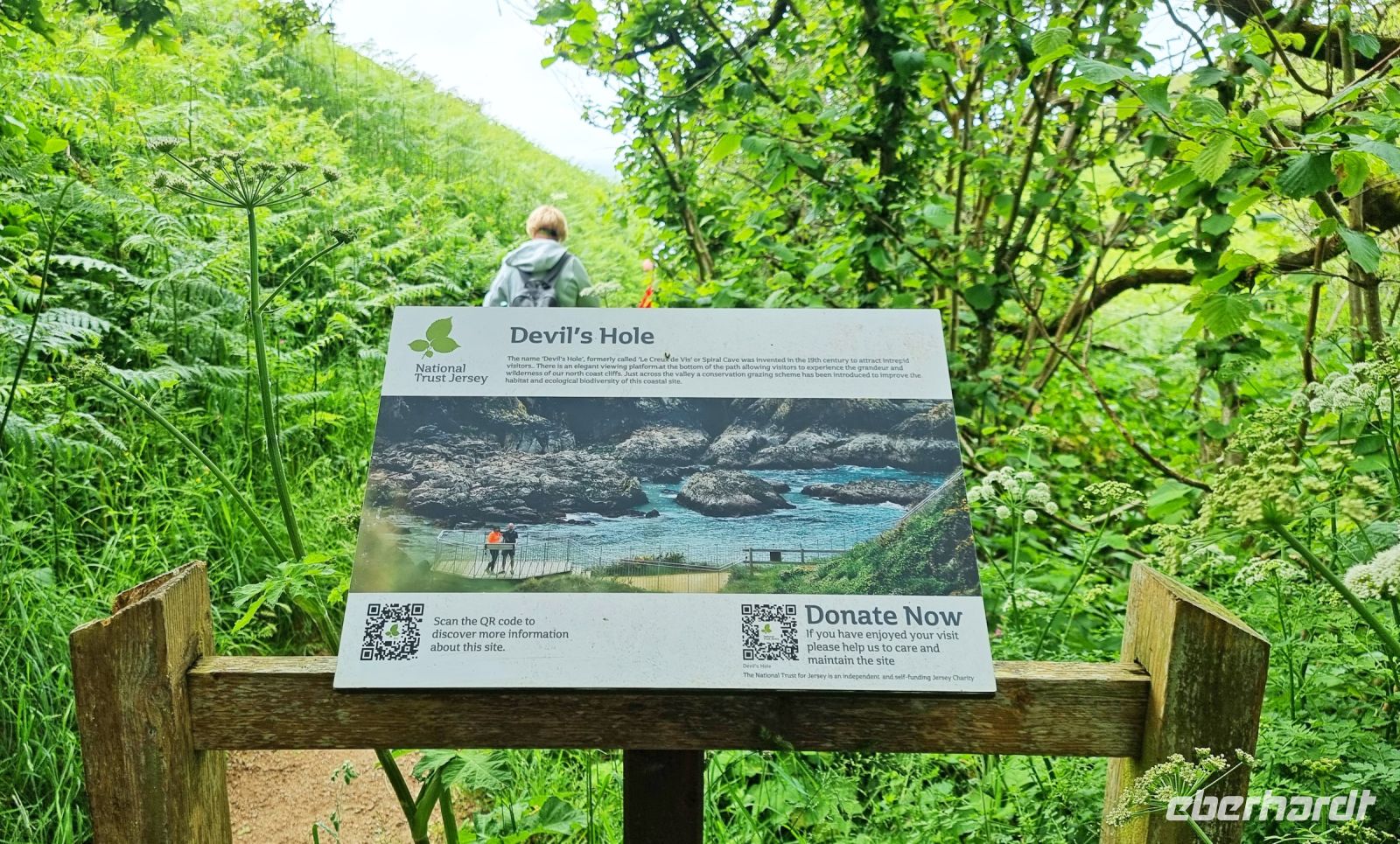 Am Teich mit der Teufelsfigur geht ein Wanderweg hinunter zum Devil's Hole, einer eingestürzten Felsenhöhle, die nach einem Schiffsunglück im 18. Jh. zur Touristenattraktion wurde. Unten gibt es eine Aussichtsplattform und ein paar Infotafeln zur Geschichte des Devil's Hole. Dann gingen wir wieder hinauf zum alten Pub Priory Inn, wo uns gegen 17.00 Uhr unser Bus abholte und uns zurück nach St. Helier fuhr. Die Wanderung war wirklich wunderbar und hat allen sehr gut gefallen. Die Temperaturen waren mit 15 bis 20 °C angenehm zum Wandern und es wehte immer ein frischer Küstenwind. Gute Wanderschuhe und eine Wind- und Regenjacke sollte man dabei haben. Wanderstöcke sind kein Muss, können aber bei An- und Abstiegen hilfreich sein, wenn man sich damit sicherer fühlt.