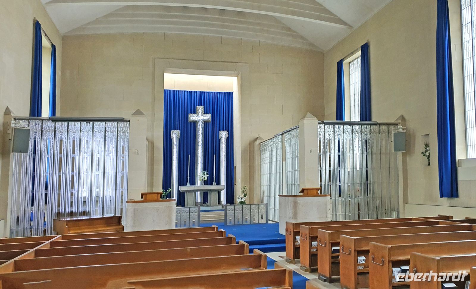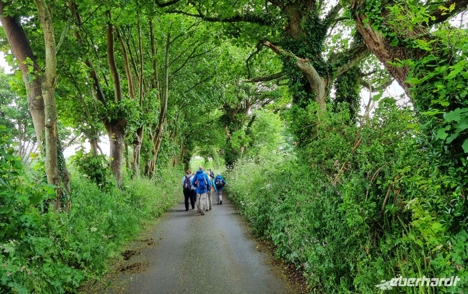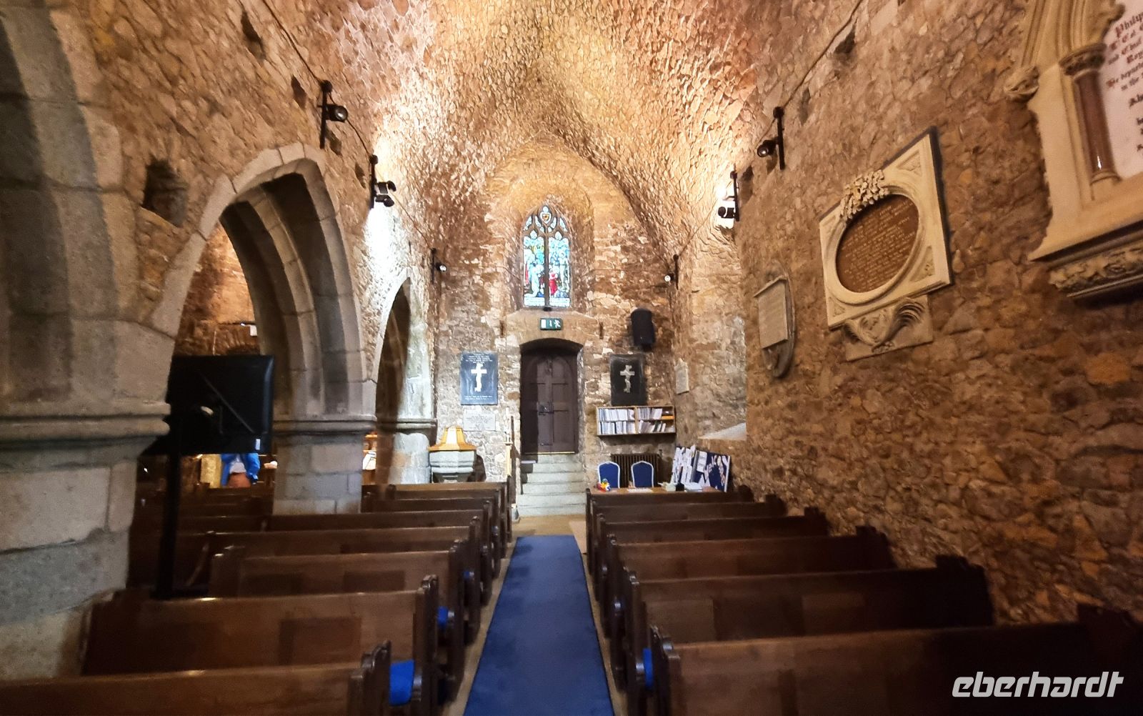 Bei dieser Wanderung ging es durch die üppig-grünen Waldgebiete im Inselinneren von Jersey und entlang der sogenannten Green Lanes, den schmalen Straßen, auf denen Wanderer und Radfahrer Vorrang haben und Autos maximal 25 km/h fahren dürfen. Unser Busfahrer Eddie und Wanderführer Rémi holten uns am Hotel ab und wir fuhren nach St. Lawrence. Bevor unsere Wanderung hier startete, besichtigten wir die St. Matthew’s Church, die auch als Glaskirche bekannt ist. Hier findet sich eine interessante Innenausstattung mit Glaswänden und Glasskulpturen des französischen Künstlers René Lalique, eines der bekanntesten Schmuck- und Glaskünstler des Art Déco und des Jugendstils.