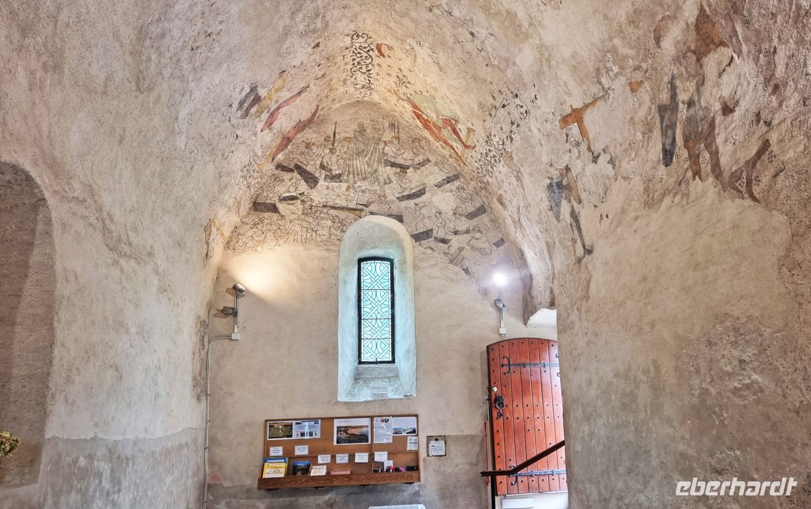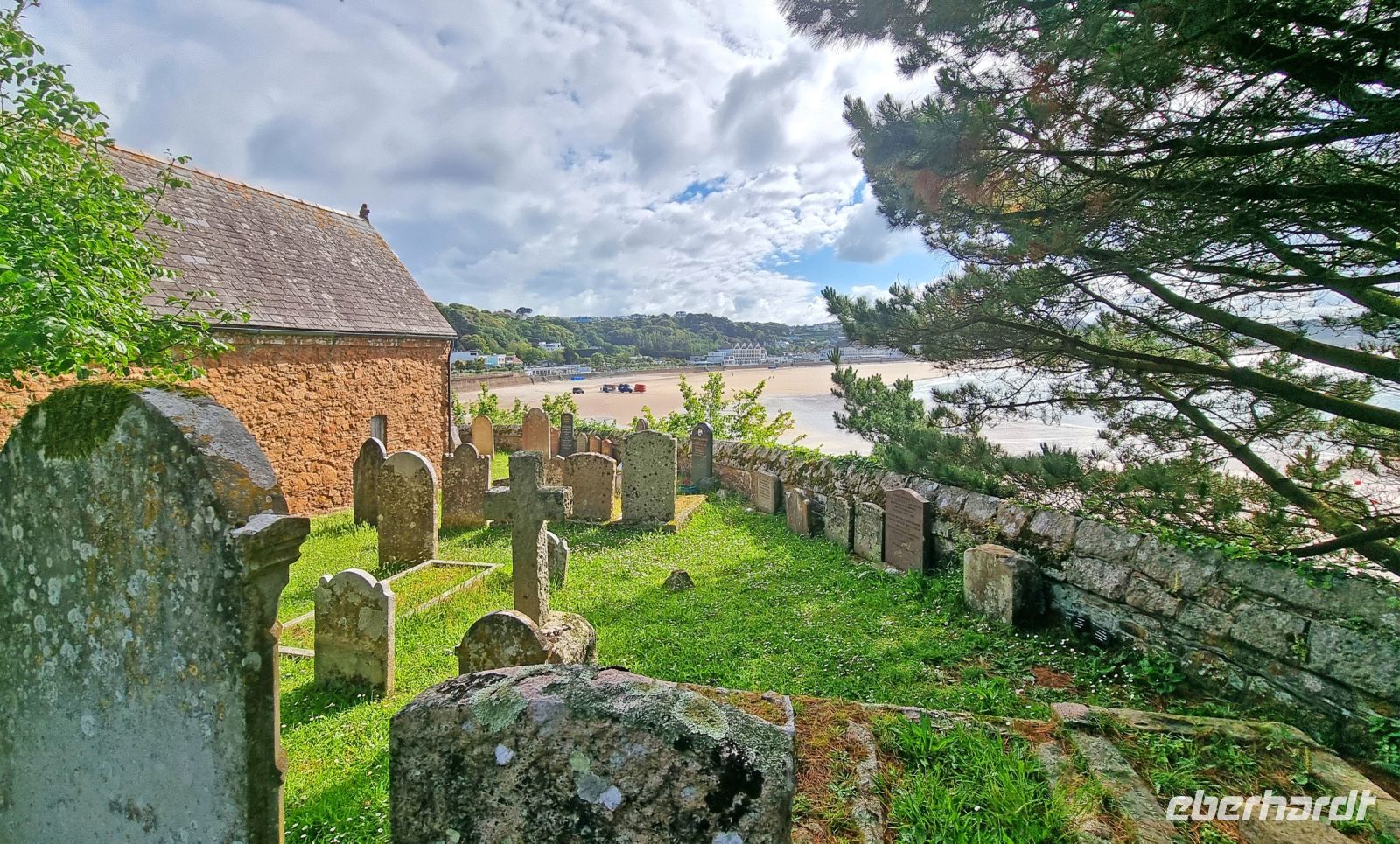 Am Donnerstag stand die nächste erlebnisreiche Wanderung auf dem Programm – diesmal an der Südwestküste von Jersey. Um 9.00 Uhr holte uns Eddie am Hotel ab und fuhr uns zur St. Brelade's Bay, eine weitläufige Sandbucht an der Südküste. Über den Strand wanderten wir zur St. Brelade's Church, der Pfarrkirche der gleichnamigen Gemeinde. Hier befindet sich auch die berühmte Fisherman's Chapel, eine kleine Kapelle, deren älteste Mauern schon aus dem 6. Jahrhundert stammen sollen. Rémi erklärt uns einiges zur Kirche und zur Kapelle. Bis heute ist strittig, ob die kleine Kapelle den Fischern gewidmet ist oder eher als Sünder-Kapelle übersetzt werden müsste, auf einem Fresko in der Kapelle ist die Himmelfahrt der Sünder oder der Fischer am Tag des jüngsten Gerichts zu sehen. Auf dem Mauerwerk in der Kirche sollen mehr als 150 Napfschneckenmuscheln zu erkennen sein, die auf den Steinen aus der Bucht waren, die zum Bau der Kirche verwendet wurden. Bis 1843 soll sogar eine Rauchergalerie existiert haben, von welcher man heute noch die Löcher in der Mauer sieht.