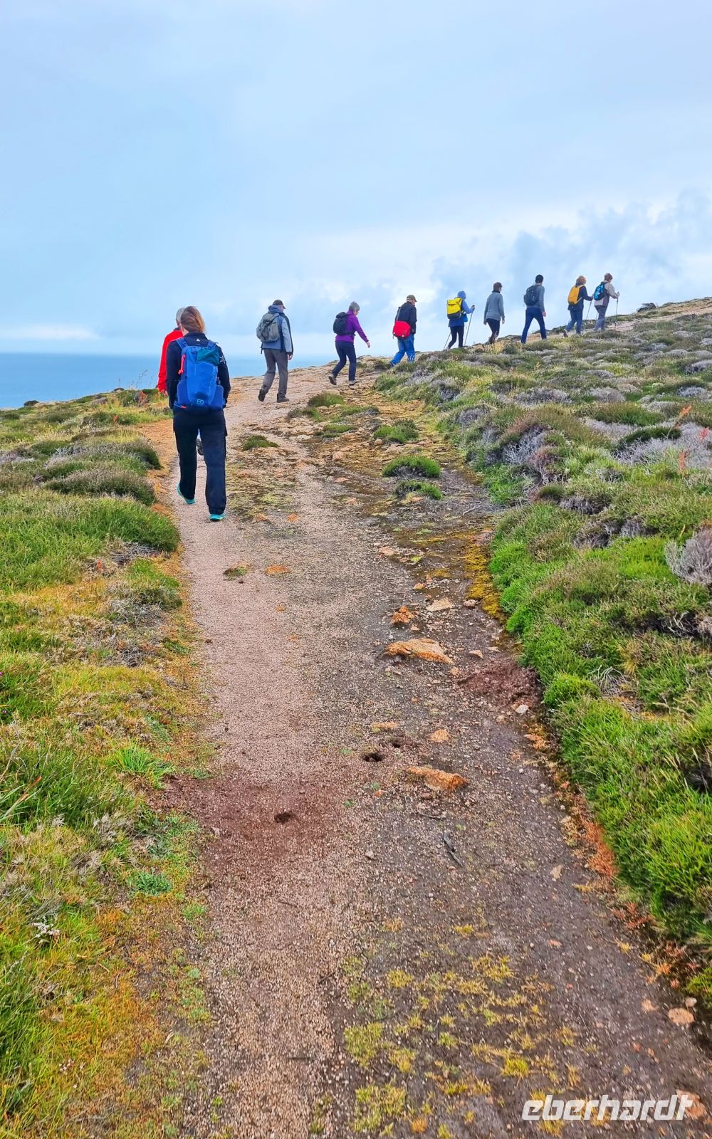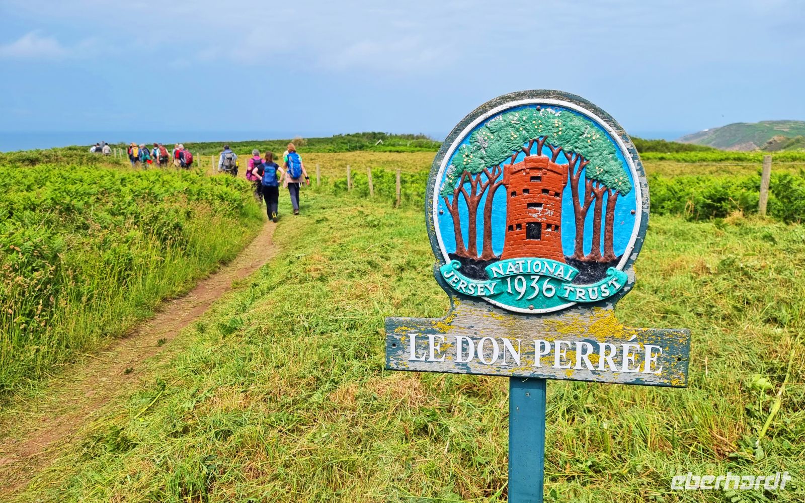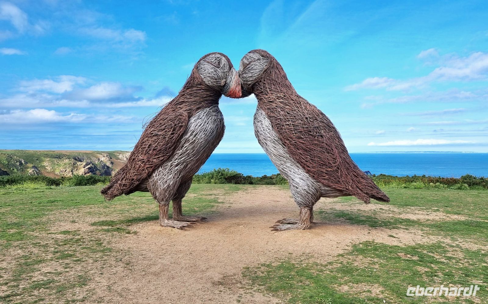 Am Sonntag ließen wir uns das reichhaltige Frühstück vom Buffet im Hotel de Normandie schmecken und starteten um 9 Uhr zu unserem ersten Wanderausflug. Unser Bus-Chauffeur Eddie und unser örtlicher Wanderguide Remi holten uns mit dem Bus direkt am Hotel ab, etwa 20 Minuten Fahrt an die Nordküste lagen vor uns. Unsere erste Wanderung ging an der Nordwestspitze von Jersey los, wo man heute noch die Ruinen des Grosnez Castle sehen kann. Die kleine Burg wurde schon im 13. Jahrhundert zur Verteidigung gegen französische Invasoren gebaut. Heute steht nur noch ein Torbogen und ein paar Mauern der Burg. Mit Windjacken ausgestattet ging es vom Wanderparkplatz nun zu Fuß weiter mit unserem Wanderführer Remi, der von Jersey stammt und die Insel kennt wie seine Westentasche. Auf dem Wanderpfad oberhalb der Steilküste ging es mit kleinen Abstiegen und Anstiegen zunächst zur Plémont Bay, wo wir die erste kurze Pause einlegten. Über Treppen ging es schließlich wieder hinauf auf das Küstenplateau und wir machten einen Fotostopp an den Giant Puffins, den vier Meter hohen Papageientauchern aus Weidengeflecht, die hier als mahnendes Kunstprojekt aufgestellt wurden, um an den Schutz der seltenen Vögel zu erinnern. Früher gab es hier zwischen 200 und 300 Papageientaucher, heute sind wegen der sich ändernden Umweltbedingungen nur noch 3 Nistpaare ansässig. Die meisten sind in kühlere Regionen im Norden Schottlands abgewandert.