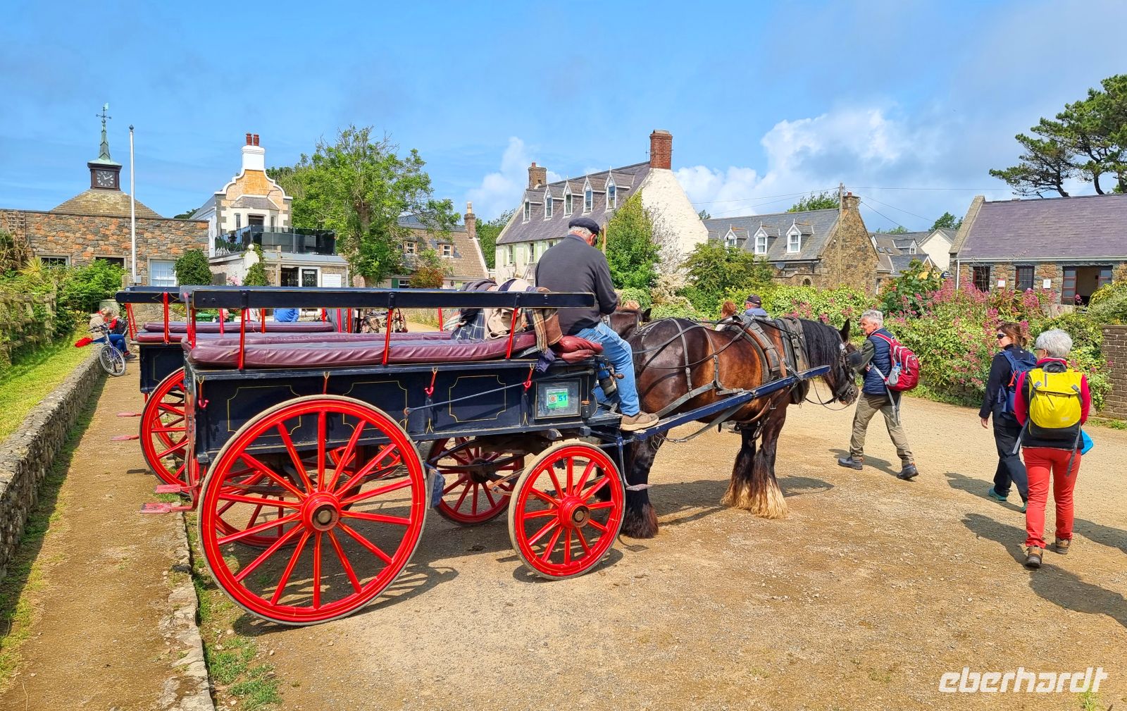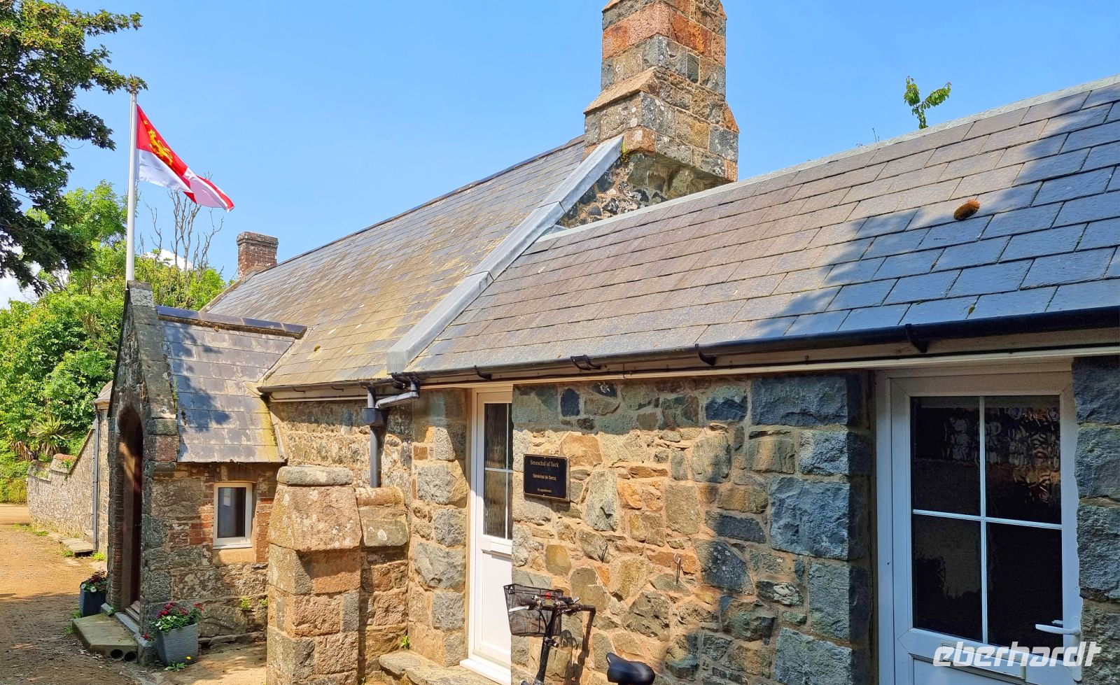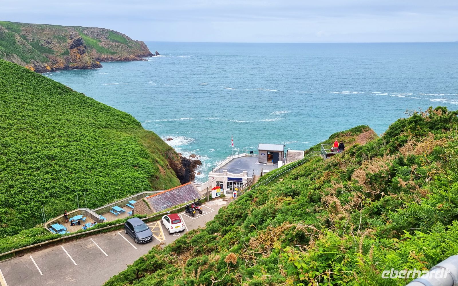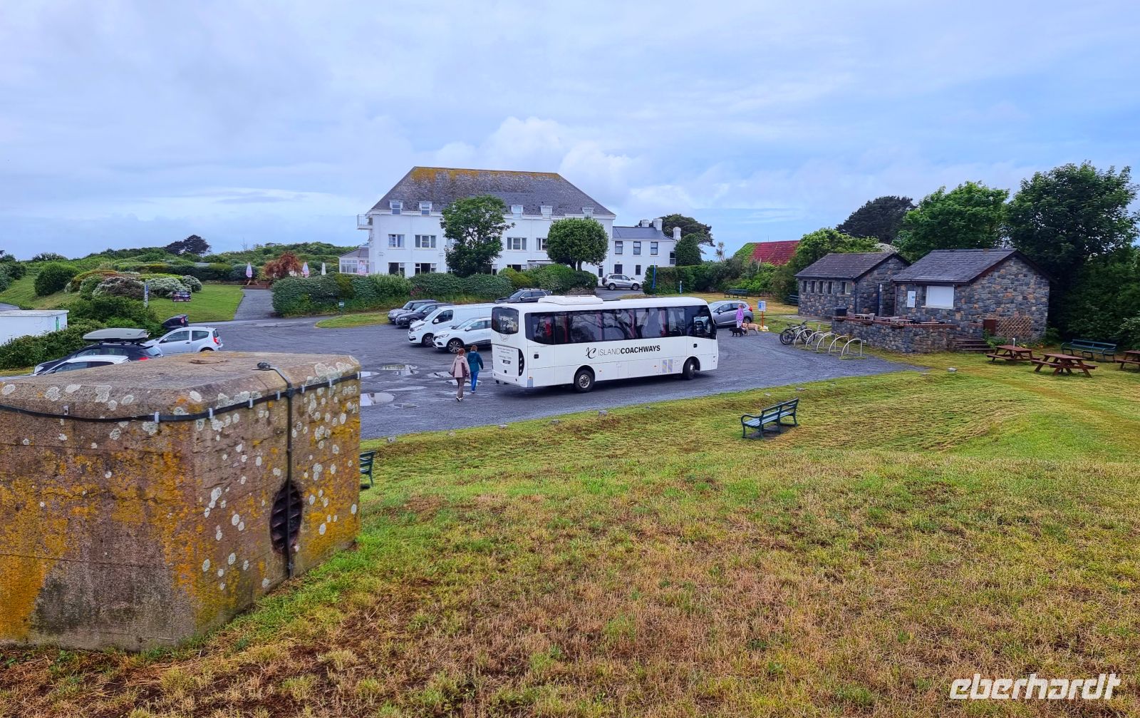 Am Mittwoch stand ein Ausflug auf die viertgrößte Kanalinsel auf dem Programm, die Insel Sark. Unser privater Bus holte uns am frühen Morgen nach einem Early-Bird-Frühstück am Hotel ab und wir fuhren zum Hafen von St. Helier. Mindestens eine Stunde vor Fahrtbeginn muss man sich hier einchecken. Jeder bekommt ein Fährticket mit seinem Namen, auch den Reisepass muss jeder dabei haben. Mit dem Fährschiff der französischen Gesellschaft "Manche Iles Express" fuhren wir in etwa einer Stunde von St. Helier zur kleinen Insel Sark. Während der Schifffahrt kann man auch draußen an Deck sitzen. Er leicht seekrank wird, sollte Reisetabletten oder Reisekaugummis dabei haben, denn es kann je nach Seegang etwas schaukelig sein. Auf Sark gibt es kein Hafengebäude, sondern nur einen Pier, an dem die Fähren anlegen. Nach dem Verlassen des Schiffes trafen wir auf Sark unseren Deutsch sprechenden Reiseleiter Ken. Er führte uns zunächst durch einen Tunnel zum alten Hafen von Sark und erklärte uns einiges zur Geschichte und zum Leben auf der autofreien Insel. Außer Fahrräder, Pferdekutschen und Traktoren dürfen auf Sark nämlich keine Autos fahren. Weil es vom Hafen ins Dorf steil bergauf geht, nahmen wir einen der Traktoren mit Anhänger, der uns als Gruppe nach oben bringt. Oben im Dorf, es ist der einzige Ort auf der Insel, begann unsere Wanderung mit Ken. Entlang der Dorfstraße (Avenue) ging es vorbei an den Geschäften, dem Postgebäude und dem kleinsten Gefängnis der Kanalinseln zunächst in den Westteil der Insel. Hier befindet sich der Damm La Coupèe, eine schmale Landverbindung 60 Meter über dem Meer, die Little Sark und die Hauptinsel Sark verbindet. La Coupèe ist eines der bekanntesten Fotomotive auf Sark und wir wanderten ein Stück auf dem Damm entlang. Ken erzählte uns dabei alles Wissenswerte zur Geschichte des Damms. Auf dem Feldweg und vorbei an der alten Windmühle und der kleinen Schokoladenmanufaktur gingen wir zurück zum Dorf. In der alten Gemeindehalle, die heute ein Restaurant ist, legten wir eine Mittagspause ein. Das Wetter hatte sich aufgeklart und wir konnten bei Sonnenschein draußen im Biergarten sitzen.