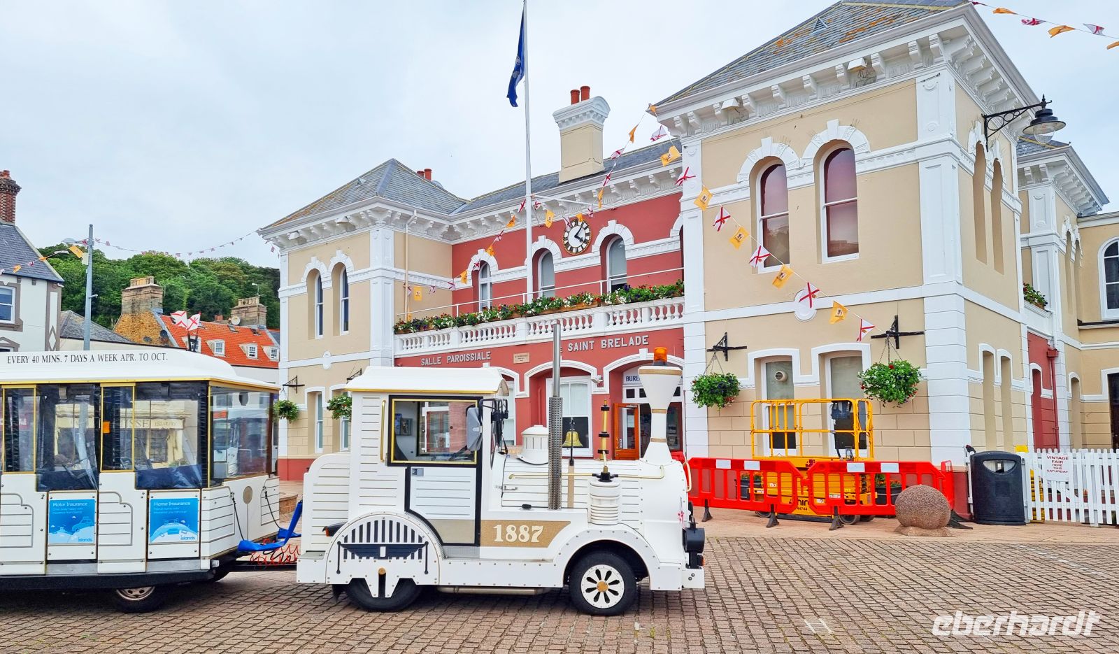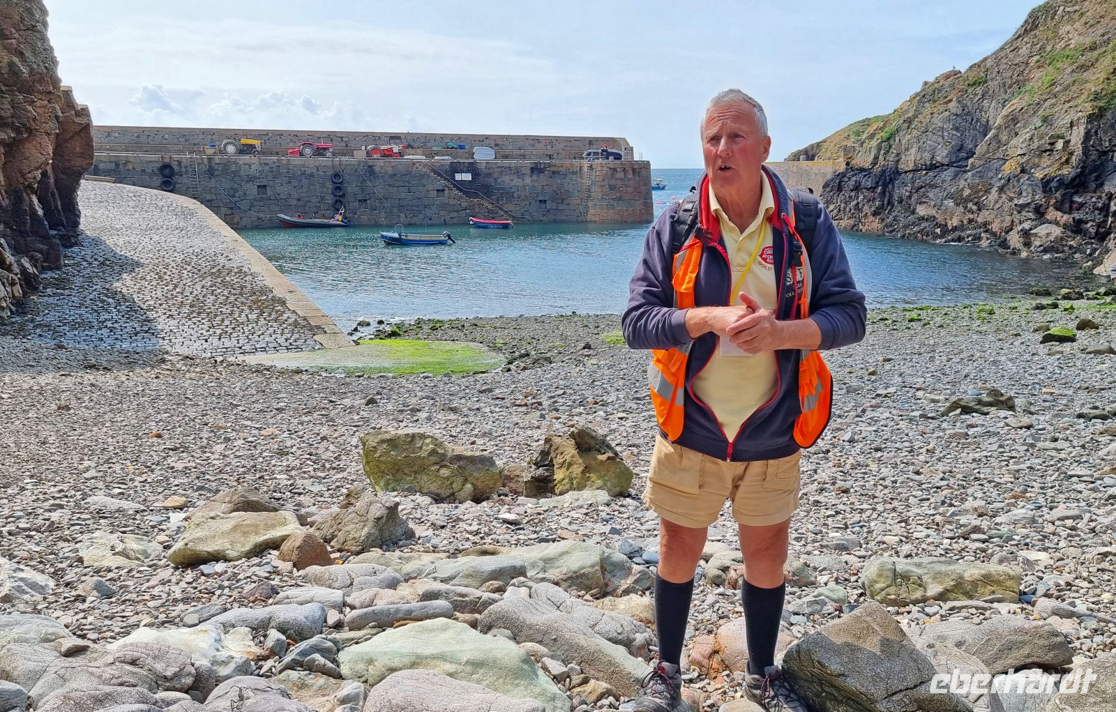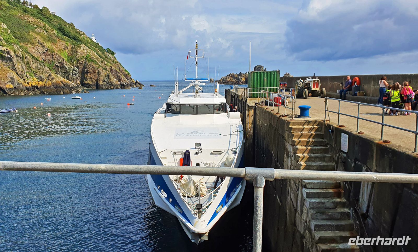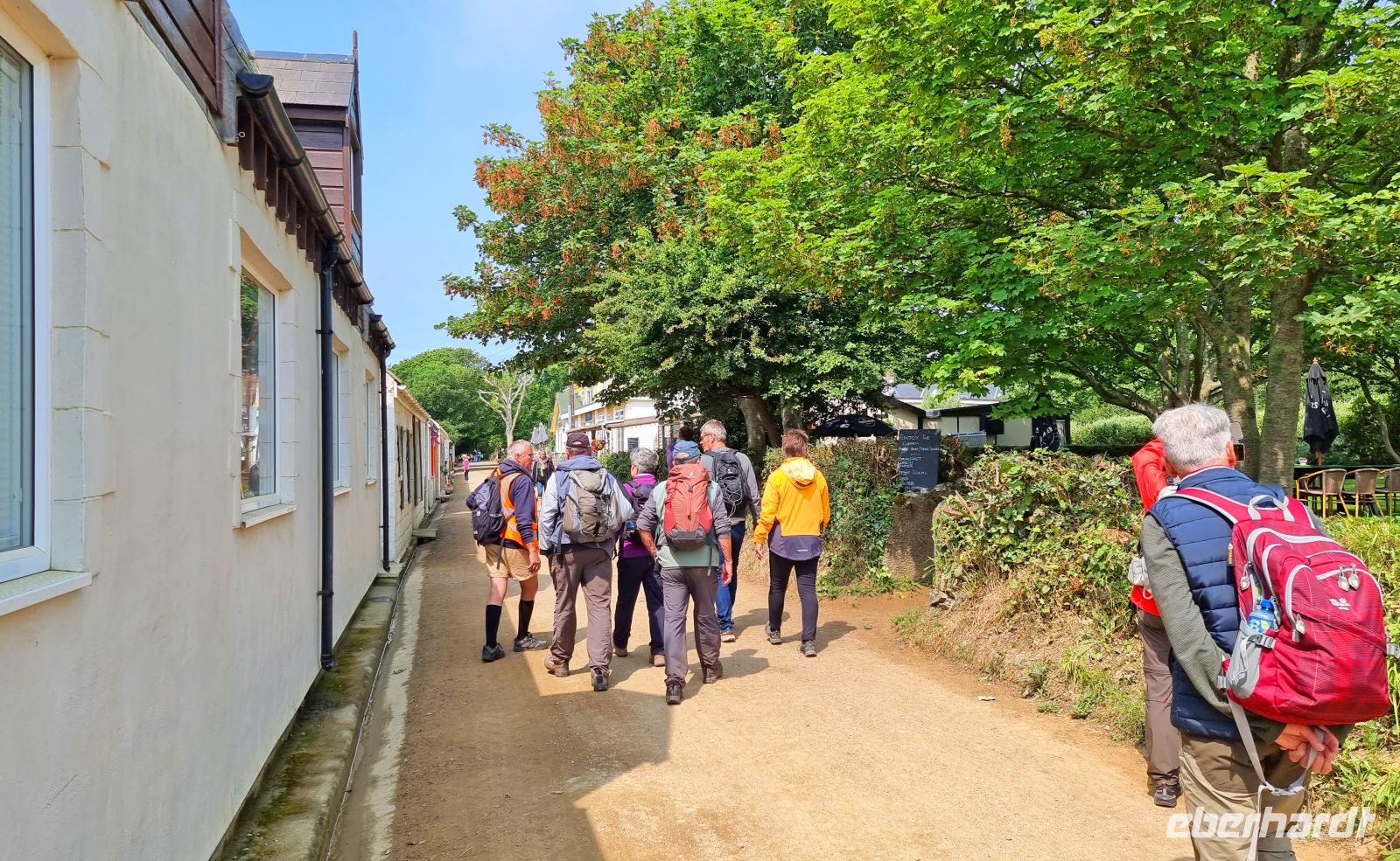 Am Mittwoch stand ein Ausflug auf die viertgrößte Kanalinsel auf dem Programm, die Insel Sark. Unser privater Bus holte uns am frühen Morgen nach einem Early-Bird-Frühstück am Hotel ab und wir fuhren zum Hafen von St. Helier. Mindestens eine Stunde vor Fahrtbeginn muss man sich hier einchecken. Jeder bekommt ein Fährticket mit seinem Namen, auch den Reisepass muss jeder dabei haben. Mit dem Fährschiff der französischen Gesellschaft "Manche Iles Express" fuhren wir in etwa einer Stunde von St. Helier zur kleinen Insel Sark. Während der Schifffahrt kann man auch draußen an Deck sitzen. Er leicht seekrank wird, sollte Reisetabletten oder Reisekaugummis dabei haben, denn es kann je nach Seegang etwas schaukelig sein. Auf Sark gibt es kein Hafengebäude, sondern nur einen Pier, an dem die Fähren anlegen. Nach dem Verlassen des Schiffes trafen wir auf Sark unseren Deutsch sprechenden Reiseleiter Ken. Er führte uns zunächst durch einen Tunnel zum alten Hafen von Sark und erklärte uns einiges zur Geschichte und zum Leben auf der autofreien Insel. Außer Fahrräder, Pferdekutschen und Traktoren dürfen auf Sark nämlich keine Autos fahren. Weil es vom Hafen ins Dorf steil bergauf geht, nahmen wir einen der Traktoren mit Anhänger, der uns als Gruppe nach oben bringt. Oben im Dorf, es ist der einzige Ort auf der Insel, begann unsere Wanderung mit Ken. Entlang der Dorfstraße (Avenue) ging es vorbei an den Geschäften, dem Postgebäude und dem kleinsten Gefängnis der Kanalinseln zunächst in den Westteil der Insel. Hier befindet sich der Damm La Coupèe, eine schmale Landverbindung 60 Meter über dem Meer, die Little Sark und die Hauptinsel Sark verbindet. La Coupèe ist eines der bekanntesten Fotomotive auf Sark und wir wanderten ein Stück auf dem Damm entlang. Ken erzählte uns dabei alles Wissenswerte zur Geschichte des Damms. Auf dem Feldweg und vorbei an der alten Windmühle und der kleinen Schokoladenmanufaktur gingen wir zurück zum Dorf. In der alten Gemeindehalle, die heute ein Restaurant ist, legten wir eine Mittagspause ein. Das Wetter hatte sich aufgeklart und wir konnten bei Sonnenschein draußen im Biergarten sitzen.