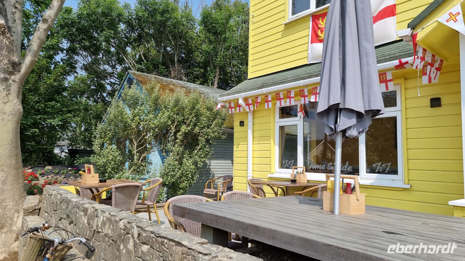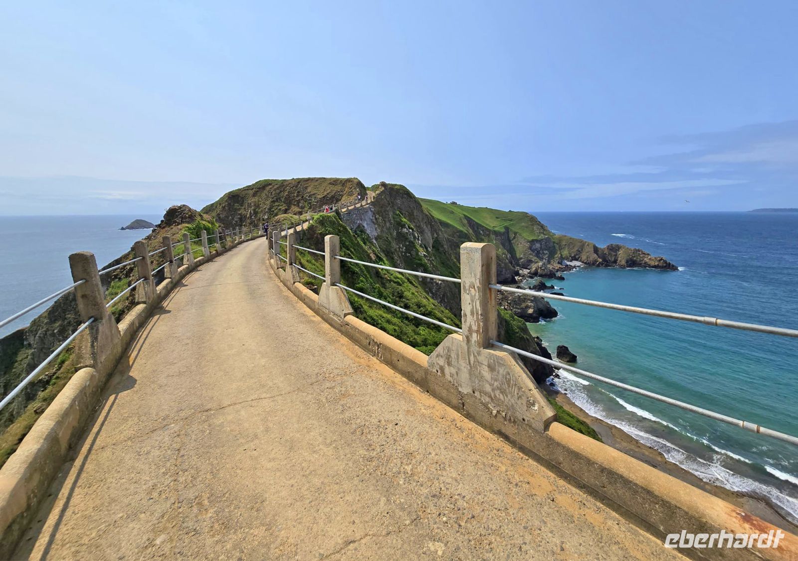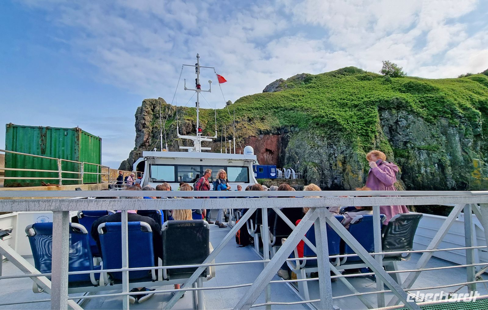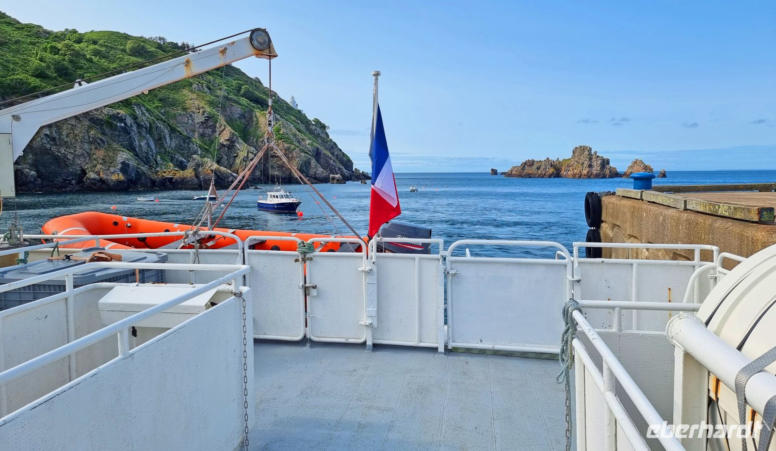 Am Mittwoch stand ein Ausflug auf die viertgrößte Kanalinsel auf dem Programm, die Insel Sark. Unser privater Bus holte uns am frühen Morgen nach einem Early-Bird-Frühstück am Hotel ab und wir fuhren zum Hafen von St. Helier. Mindestens eine Stunde vor Fahrtbeginn muss man sich hier einchecken. Jeder bekommt ein Fährticket mit seinem Namen, auch den Reisepass muss jeder dabei haben. Mit dem Fährschiff der französischen Gesellschaft "Manche Iles Express" fuhren wir in etwa einer Stunde von St. Helier zur kleinen Insel Sark. Während der Schifffahrt kann man auch draußen an Deck sitzen. Er leicht seekrank wird, sollte Reisetabletten oder Reisekaugummis dabei haben, denn es kann je nach Seegang etwas schaukelig sein. Auf Sark gibt es kein Hafengebäude, sondern nur einen Pier, an dem die Fähren anlegen. Nach dem Verlassen des Schiffes trafen wir auf Sark unseren Deutsch sprechenden Reiseleiter Ken. Er führte uns zunächst durch einen Tunnel zum alten Hafen von Sark und erklärte uns einiges zur Geschichte und zum Leben auf der autofreien Insel. Außer Fahrräder, Pferdekutschen und Traktoren dürfen auf Sark nämlich keine Autos fahren. Weil es vom Hafen ins Dorf steil bergauf geht, nahmen wir einen der Traktoren mit Anhänger, der uns als Gruppe nach oben bringt. Oben im Dorf, es ist der einzige Ort auf der Insel, begann unsere Wanderung mit Ken. Entlang der Dorfstraße (Avenue) ging es vorbei an den Geschäften, dem Postgebäude und dem kleinsten Gefängnis der Kanalinseln zunächst in den Westteil der Insel. Hier befindet sich der Damm La Coupèe, eine schmale Landverbindung 60 Meter über dem Meer, die Little Sark und die Hauptinsel Sark verbindet. La Coupèe ist eines der bekanntesten Fotomotive auf Sark und wir wanderten ein Stück auf dem Damm entlang. Ken erzählte uns dabei alles Wissenswerte zur Geschichte des Damms. Auf dem Feldweg und vorbei an der alten Windmühle und der kleinen Schokoladenmanufaktur gingen wir zurück zum Dorf. In der alten Gemeindehalle, die heute ein Restaurant ist, legten wir eine Mittagspause ein. Das Wetter hatte sich aufgeklart und wir konnten bei Sonnenschein draußen im Biergarten sitzen.