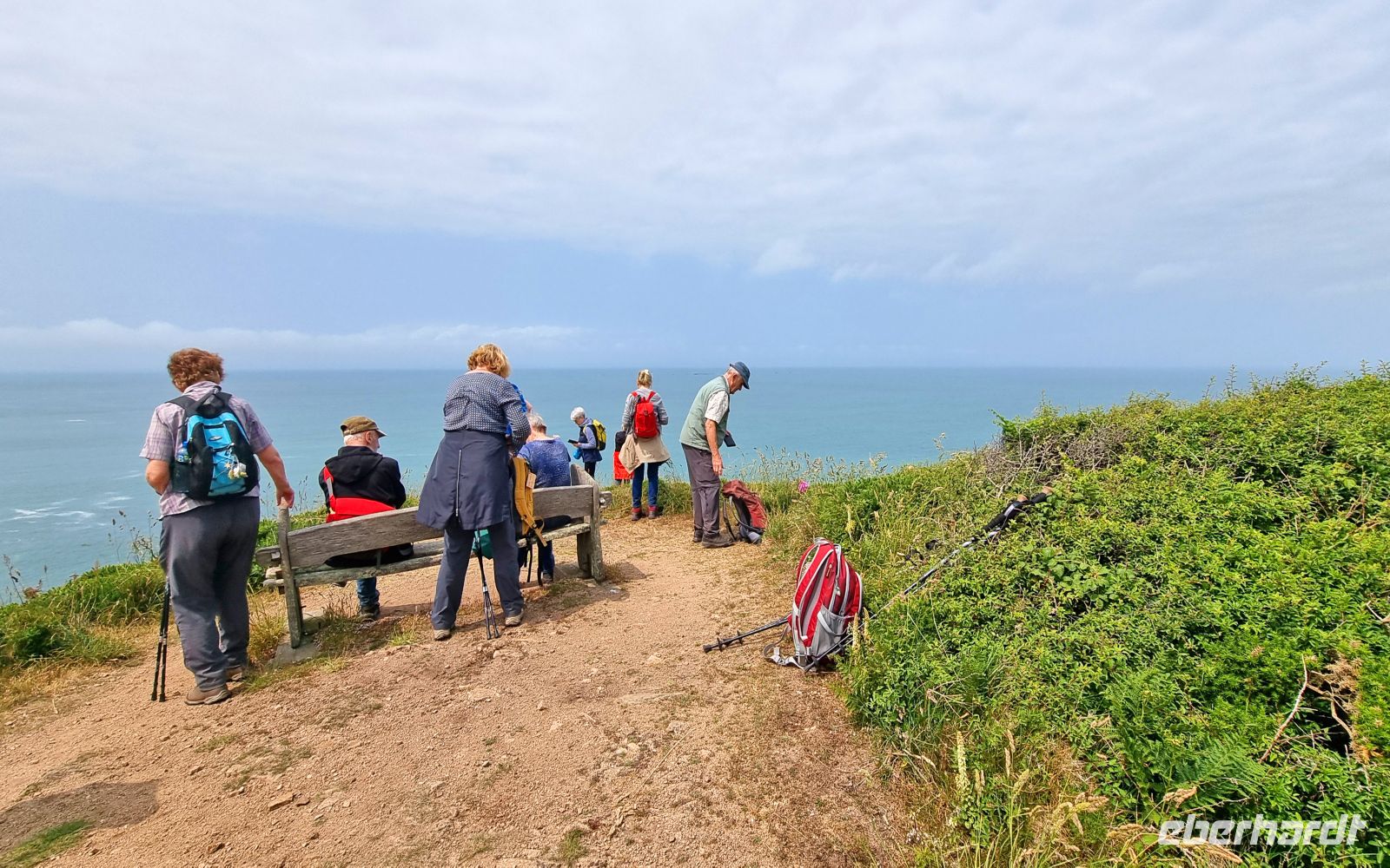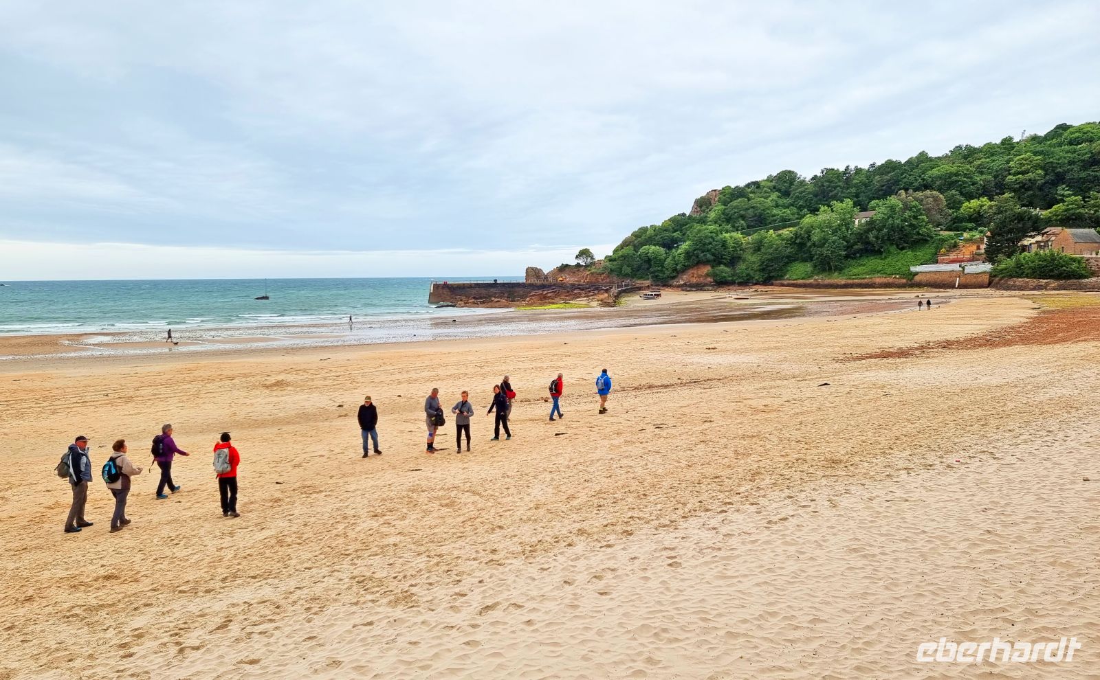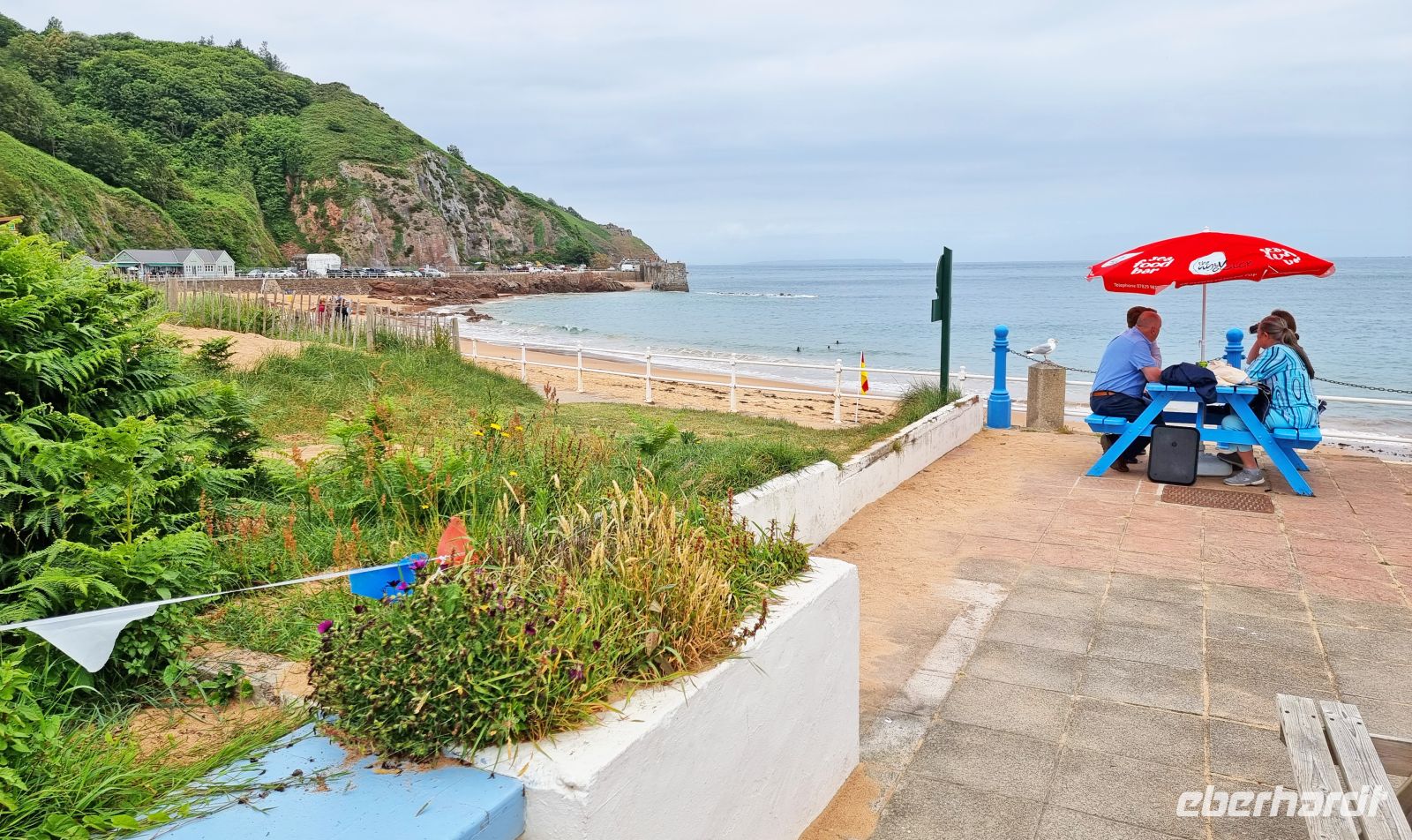 Dann ging es weiter zum Wanderparkplatz oberhalb der Bonne Nuit Bay. Heute war das Wetter recht wechselhaft, sodass wir uns gleich mit regenfesten Jacken ausgestattet hatten. Der Regen war nur leicht und so wanderten wir los in stetigem bergauf und bergab, teils über Treppen und durch kleine Waldstücke entlang des Küstenpfades. Von oben sahen wir die Bonne Nuit Bay (Gute-Nacht-Bucht) und das La Crête Fort, eine kleine Festungsanlage, die um 1830 erbaut wurde, um die Bucht zu schützen. Dann kamen wir an Wolfs Lair (Wolfsschanze) vorbei, wo im Jahr 1943 ein englischer Soldat bei einem Aufklärungseinsatz durch eine deutsche Landmine ums Leben kam. Im Wäldchen Egypt Woods erzählte uns Remi außerdem die Legende vom Bach, der Blinde wieder sehend macht. Weiter ging es zur Boley Bay, wo wir eine Mittagspause einlegten und uns Sandwiches, Kaffee, Kuchen oder Eis am Kiosk von "Mad?Mary’s Beach Café" holten. Ein Restaurant zum Drinnensitzen gibt es hier nicht, aber zum Glück regnete es nicht mehr, sodass wir mit schönem Blick auf das Meer pausierten.
