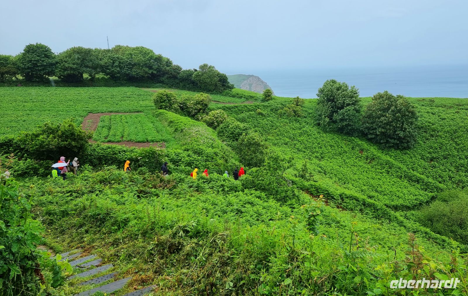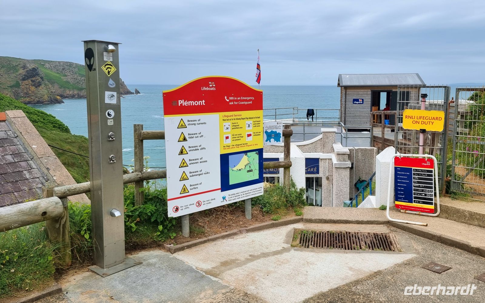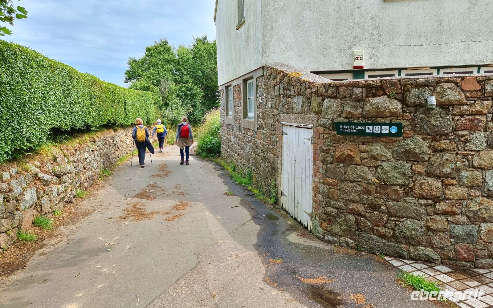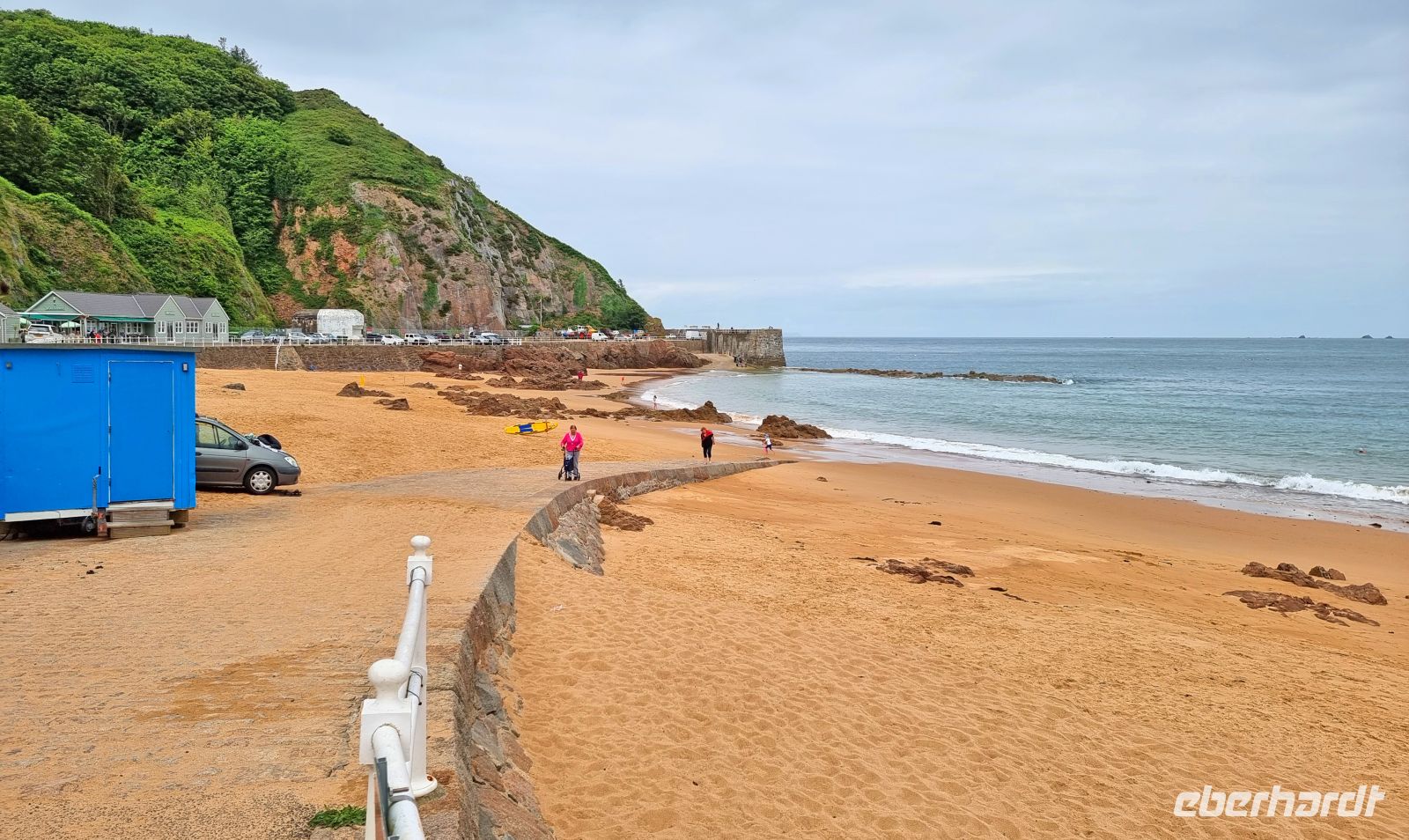 Dann ging es weiter zum Wanderparkplatz oberhalb der Bonne Nuit Bay. Heute war das Wetter recht wechselhaft, sodass wir uns gleich mit regenfesten Jacken ausgestattet hatten. Der Regen war nur leicht und so wanderten wir los in stetigem bergauf und bergab, teils über Treppen und durch kleine Waldstücke entlang des Küstenpfades. Von oben sahen wir die Bonne Nuit Bay (Gute-Nacht-Bucht) und das La Crête Fort, eine kleine Festungsanlage, die um 1830 erbaut wurde, um die Bucht zu schützen. Dann kamen wir an Wolfs Lair (Wolfsschanze) vorbei, wo im Jahr 1943 ein englischer Soldat bei einem Aufklärungseinsatz durch eine deutsche Landmine ums Leben kam. Im Wäldchen Egypt Woods erzählte uns Remi außerdem die Legende vom Bach, der Blinde wieder sehend macht. Weiter ging es zur Boley Bay, wo wir eine Mittagspause einlegten und uns Sandwiches, Kaffee, Kuchen oder Eis am Kiosk von "Mad?Mary’s Beach Café" holten. Ein Restaurant zum Drinnensitzen gibt es hier nicht, aber zum Glück regnete es nicht mehr, sodass wir mit schönem Blick auf das Meer pausierten.