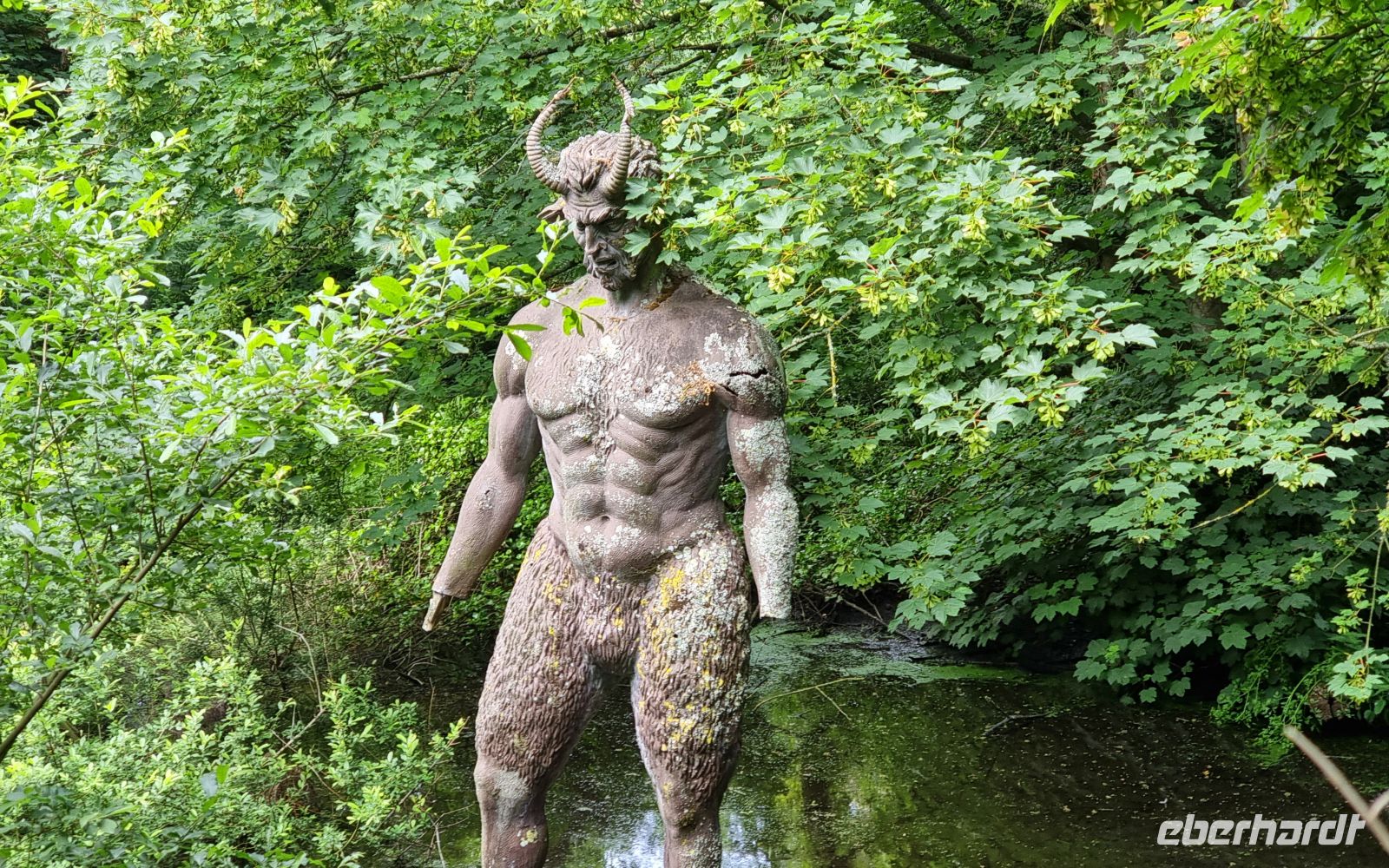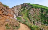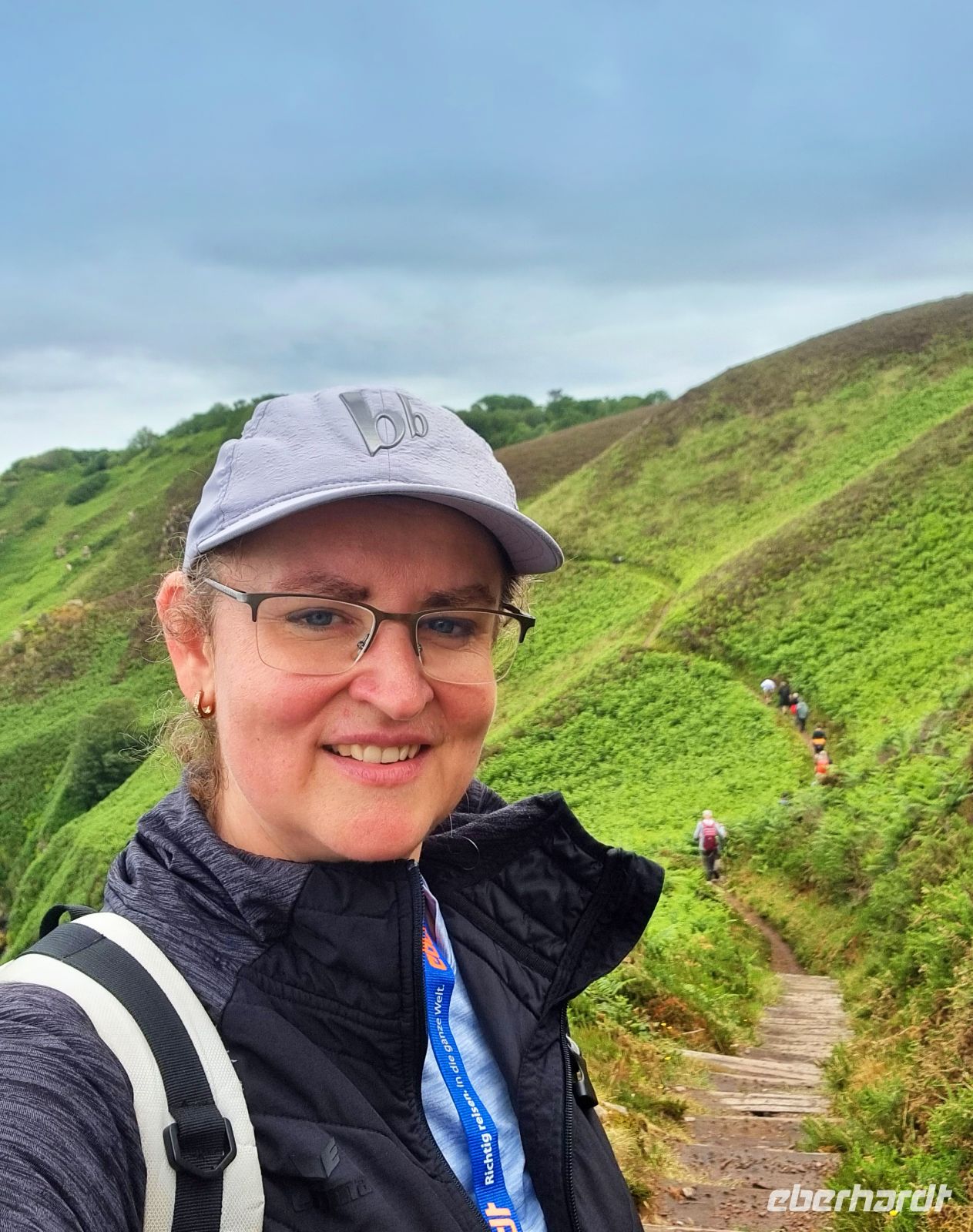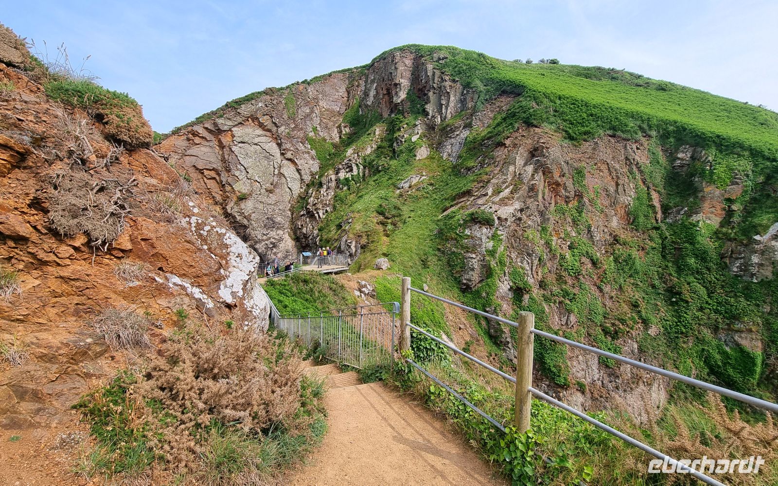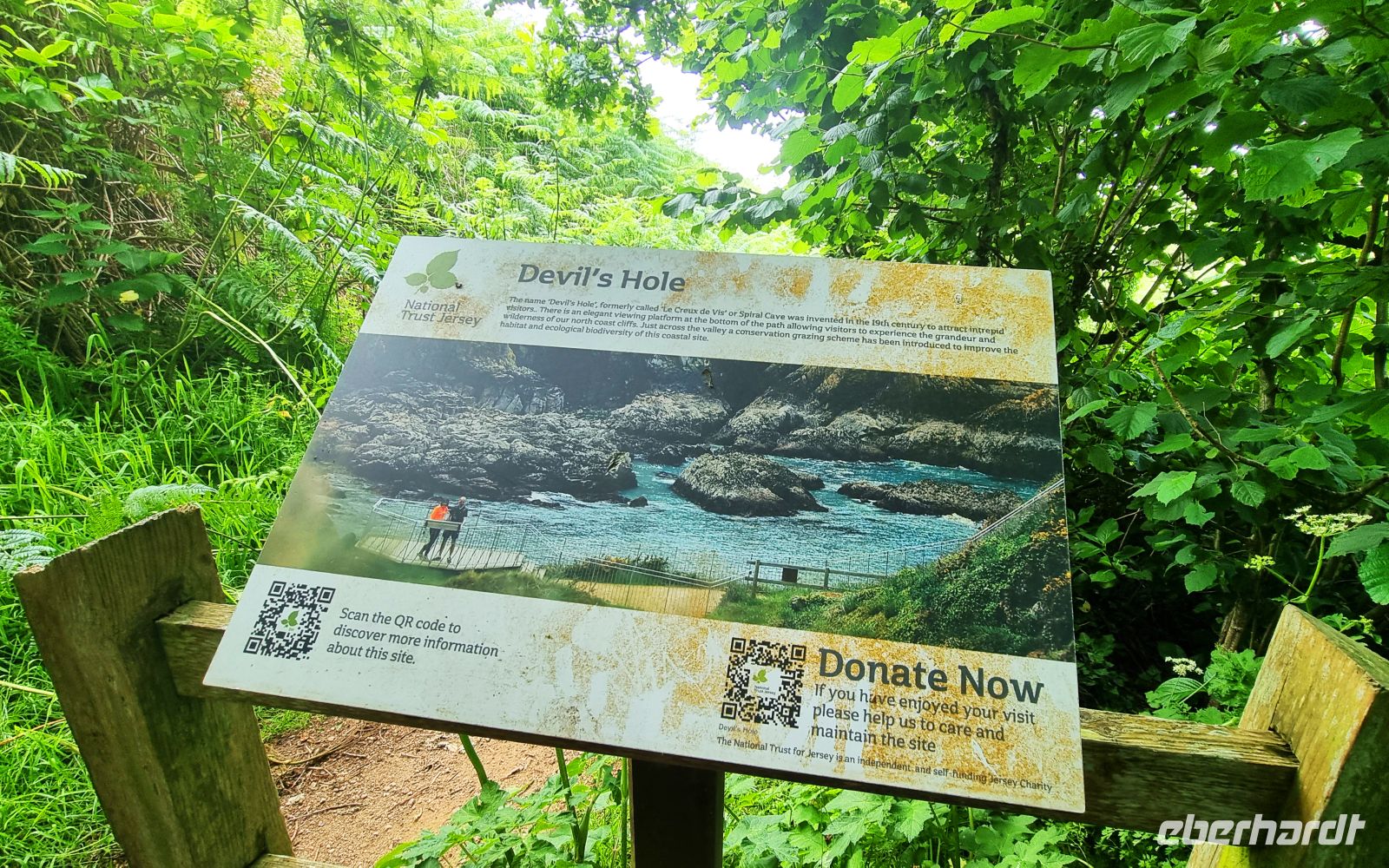 Weiter ging es dann vorbei an einigen Granit-Cottages und Kartoffelfeldern zur malerischen Bucht Grève de Lecq, einem beliebten Strand an der Nordküste von Jersey im Parish St.?Ouen. Zum Baden waren die Temperaturen um 15°C noch nicht geeignet, aber zum Wandern war es perfekt. Wir legten eine Mittagspause ein. Es gibt hier zwei Strandcafés zum draußen Sitzen. Wer wollte, konnte hier frische Austern, Fisch oder Jakobsmuscheln probieren. Aber auch Jersey Eis, Sandwiches, Kaffee und Kuchen war im Angebot. Die Stärkung war gut, denn nun lag ein steiler Anstieg von der Bucht hinauf auf das Plateau wieder vor uns. Jeder ging in seinem Tempo und so kamen wir ganz gut nach oben. Remi erklärte uns unterwegs immer wieder Wissenswertes zu den ehemaligen Wehranlagen, der kleinen Kaserne, dem Rundturm und den Mühlen der Region und ich übersetzte vom Englischen ins Deutsche. Auf dem nächsten Küstenpfad ging es bergauf und bergab mit einigen Fotostopps weiter bis zum Devil's Hole, dem Teufelsloch. Hier gab es früher eine Höhle in der Felsenküste, in die der Wind und das Meer hineinfuhren und jammernde Geräusche verursachten. 1851 soll hier außerdem das französische Schiff "La Josephine" im Sturm gesunken sein und eine mannshohe Holzfigur soll in die Höhle gespült worden sein. Der Betreiber des hiesigen Pubs hatte daraufhin eine originelle Geschäftsidee: Um mehr Gäste in seinen Pub zu locken, ließ er die Holzfigur zu einem Teufel umgestalten und stellte ihn an der Höhle auf. Mit Pferdekutschen wurden Besucher aus der Inselhauptstadt hier herauf gebracht und er verlangte Eintritt von allen, die den leibhaftigen Teufel im Devil's Hole sehen wollten. Das Dach der Höhle stürzte durch Erosion ein und heute hört man das Meer nur noch durch ein kleines Loch im Felsen rauschen, wenn man zur Besucherplattform hinunter wandert. Die originale Teufelsstatue wurde gestohlen und verbrannt, heute sieht man in einem Teich oberhalb von Devil's Hole aber eine Teufelsstatue aus Fiberglas und kann sich in die Zeit der Schauermärchen zurückversetzen.