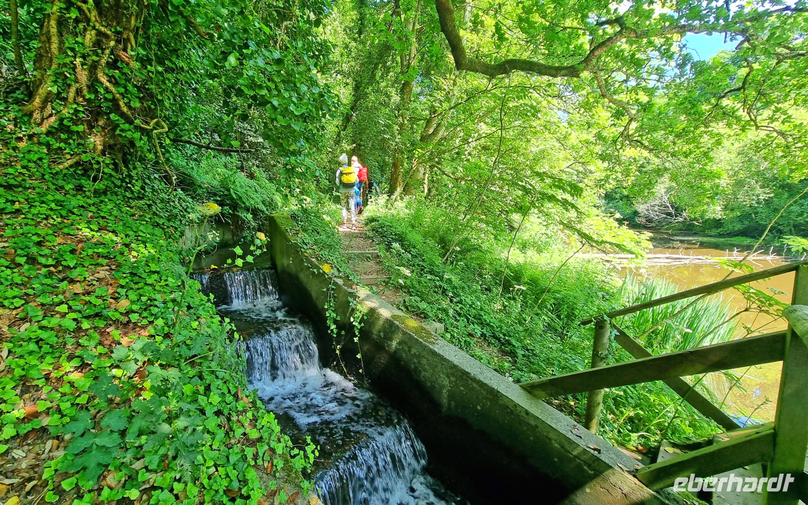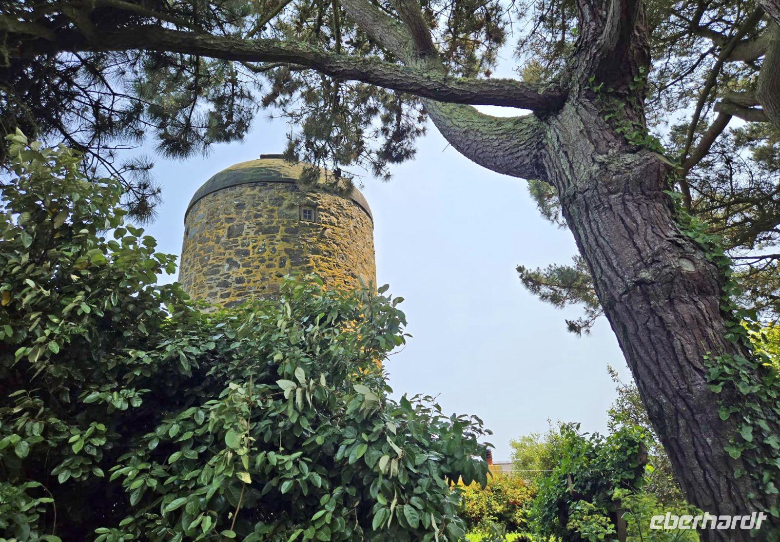 Insgesamt gab es früher etwa 80 Mühlen auf Jersey, sowohl Wind- als auch Wassermühlen. Im grünen Inselinneren wurden einige Bäche mit einem starken Gefälle versehen, um die Mühlräder anzutreiben. Die Mühlen verfielen oder wurden während der Besatzungszeit weitgehend zerstört, weil ihre Ruinen oft von Zwangsarbeitern als Versteck benutzt wurden. Unsere Wanderung führte uns nun hier entlang durch grün bewachsene Dschungelpfade. Wir erfuhren, wie die Wasserversorgung auf Jersey funktioniert und wanderten am Wasserwerk von "Jersey Water" und den darüber liegenden Stauseen vorbei. Auch Forellen werden hier in den Stauseen gezüchtet. Auf den kleinen Straßen, den sogenannten Green Lanes, und auf einem idyllischen Wanderweg am Bachlauf entlang kamen wir auch am Hamptonne Country Life Museum vorbei, einem Bauernmuseum mit Häusern aus den vergangenen Jahrhunderten und einem mittelalterlichen Taubenhaus (Colomberie).