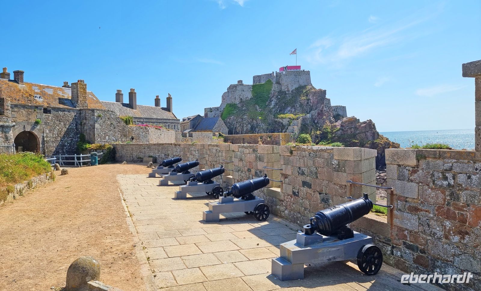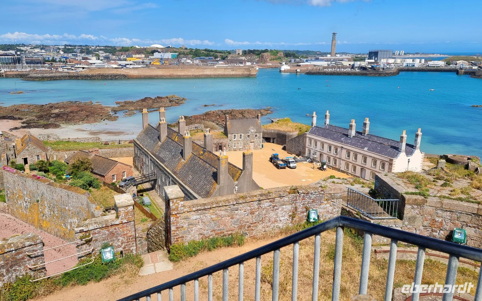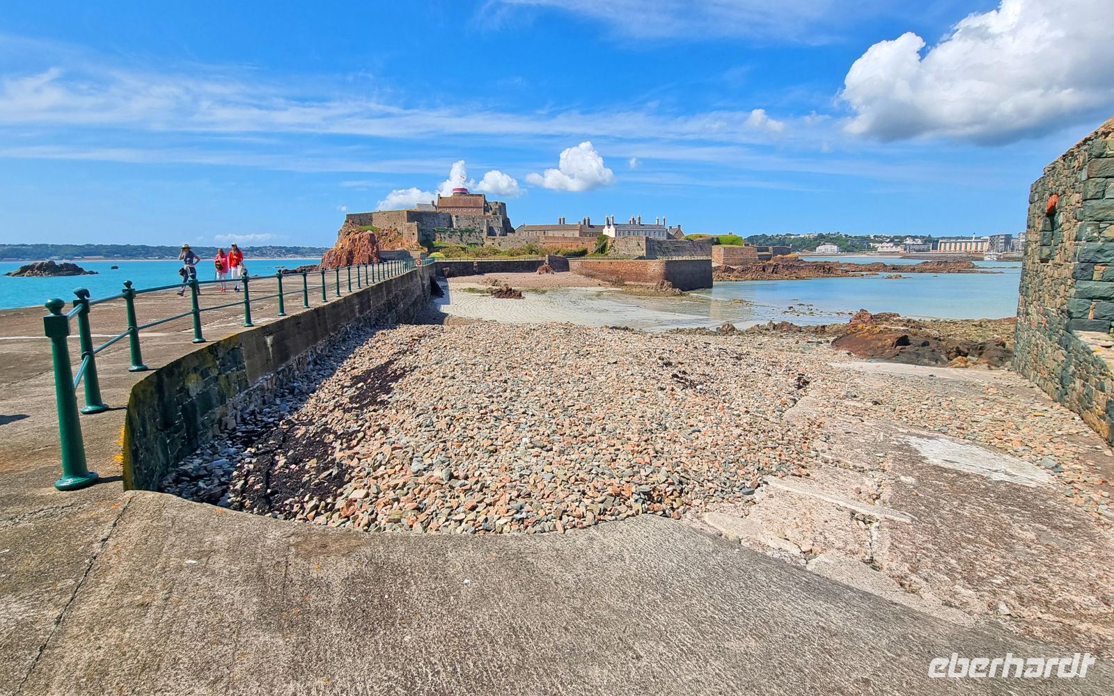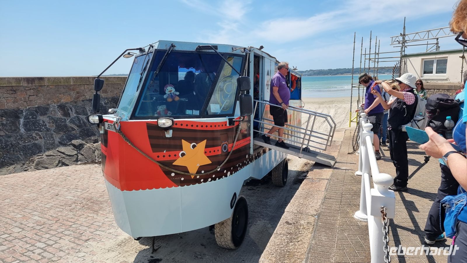 In der Gemeinde St. Lawrence legten wir eine kleine Mittagspause ein. Hier gab es Toiletten im Gemeinde-Rathaus und wer wollte, konnte einen Blick in die mittelalterliche Kirche werfen. Wir kauften Sandwiches, Kuchen und Kaffee im Dorfladen gegenüber der Kirche und pausierten im Liberation Garden, einem hübsch angelegten Gedenk-Garten mit Weidentunnel, Blumenbeeten und Sitzbänken. Hier holte uns Jane mit dem Bus ab und brachten uns hinunter zur St. Aubin's Bay. Nun war die Glaskirche geöffnet und wir erfuhren einiges zur Geschichte des Unternehmerpaares Boot. Über den weiten Sandstrand der St. Aubin's Bay wanderten wir von der Glaskirche in Richtung Elizabeth Castle. Hier war unsere Gruppe für die Überfahrt mit dem Puddleduck, dem Amphibienfahrzeug, angemeldet. Ich holte die Tickets und dann ging die lustige Überfahrt im Puddleduck los. Etwa 15 Minuten braucht das Amphibienfahrzeug für die etwa 600 Meter lange Strecke hinüber zur Gezeiteninsel, auf der die Burganlage liegt. Bei uns war gerade noch Flut, sodass wir auf dem Hinweg sogar ein bisschen mit dem Schiffsantrieb schwammen. Auf der Burganlage angekommen erklärte uns ein junger Mann auf einer Karte noch den besten Weg, die Burg zu erkunden und wir unternahmen einen Rundgang von der Unterburg zum Paradeplatz, auf dem Wellenbrecher hinüber zur Einsiedelei des Heiligen Helier und hinauf in die Oberburg mit dem Gouverneurs-Haus und dem Wachturm aus der Besatzungszeit. Auch Elizabeth Castle wurde während der deutschen Besatzung als Festungsanlage im Atlantikwall ausgebaut und mit einigen Bunkern und Geschützstellungen versehen. Die Geschichte der Burg reicht also vom 8. Jahrhundert bis zum Zweiten Weltkrieg und die Gebäude stammen aus verschiedenen geschichtlichen Epochen.