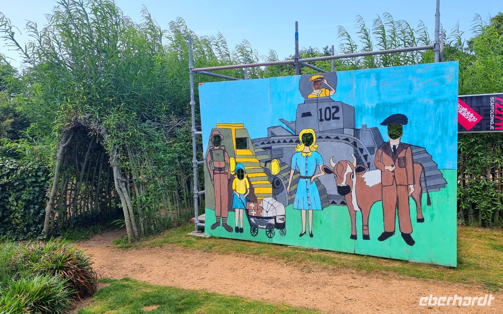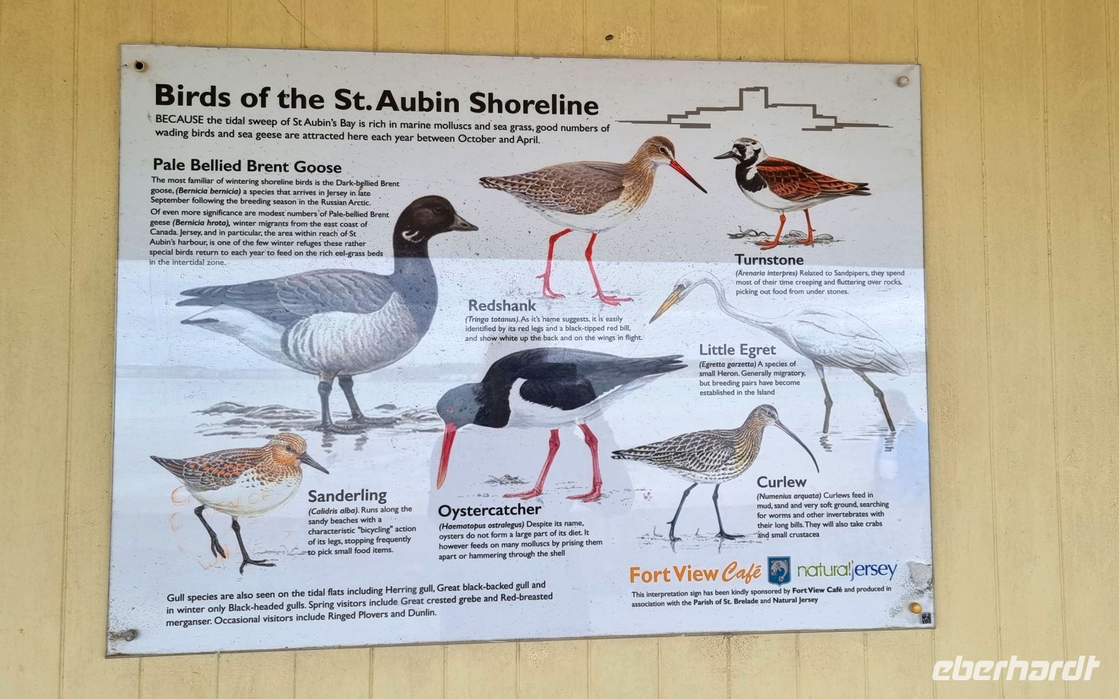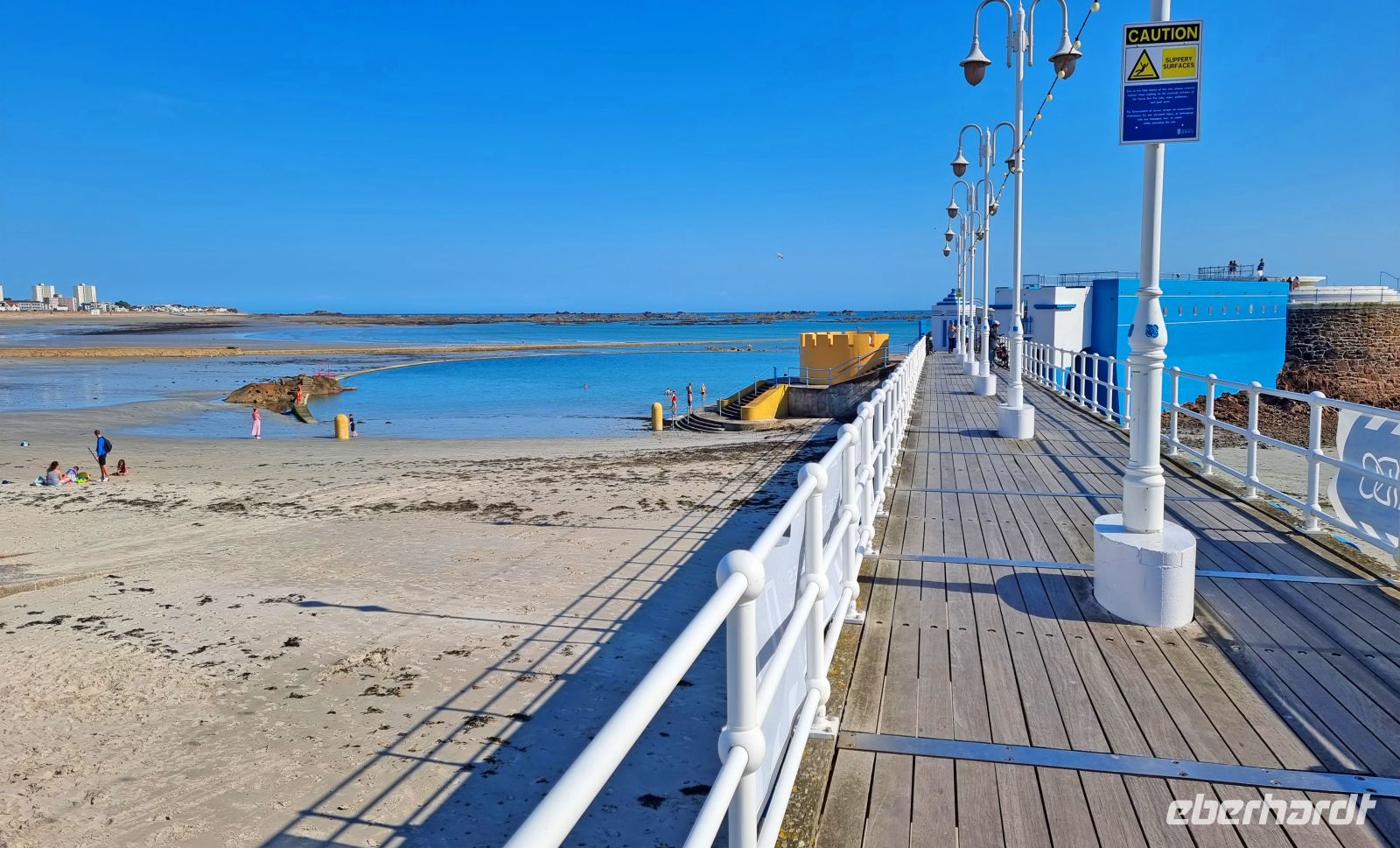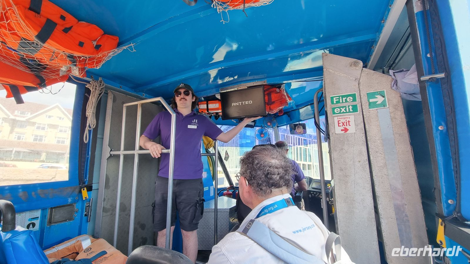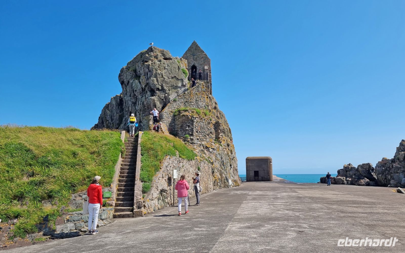 In der Gemeinde St. Lawrence legten wir eine kleine Mittagspause ein. Hier gab es Toiletten im Gemeinde-Rathaus und wer wollte, konnte einen Blick in die mittelalterliche Kirche werfen. Wir kauften Sandwiches, Kuchen und Kaffee im Dorfladen gegenüber der Kirche und pausierten im Liberation Garden, einem hübsch angelegten Gedenk-Garten mit Weidentunnel, Blumenbeeten und Sitzbänken. Hier holte uns Jane mit dem Bus ab und brachten uns hinunter zur St. Aubin's Bay. Nun war die Glaskirche geöffnet und wir erfuhren einiges zur Geschichte des Unternehmerpaares Boot. Über den weiten Sandstrand der St. Aubin's Bay wanderten wir von der Glaskirche in Richtung Elizabeth Castle. Hier war unsere Gruppe für die Überfahrt mit dem Puddleduck, dem Amphibienfahrzeug, angemeldet. Ich holte die Tickets und dann ging die lustige Überfahrt im Puddleduck los. Etwa 15 Minuten braucht das Amphibienfahrzeug für die etwa 600 Meter lange Strecke hinüber zur Gezeiteninsel, auf der die Burganlage liegt. Bei uns war gerade noch Flut, sodass wir auf dem Hinweg sogar ein bisschen mit dem Schiffsantrieb schwammen. Auf der Burganlage angekommen erklärte uns ein junger Mann auf einer Karte noch den besten Weg, die Burg zu erkunden und wir unternahmen einen Rundgang von der Unterburg zum Paradeplatz, auf dem Wellenbrecher hinüber zur Einsiedelei des Heiligen Helier und hinauf in die Oberburg mit dem Gouverneurs-Haus und dem Wachturm aus der Besatzungszeit. Auch Elizabeth Castle wurde während der deutschen Besatzung als Festungsanlage im Atlantikwall ausgebaut und mit einigen Bunkern und Geschützstellungen versehen. Die Geschichte der Burg reicht also vom 8. Jahrhundert bis zum Zweiten Weltkrieg und die Gebäude stammen aus verschiedenen geschichtlichen Epochen.