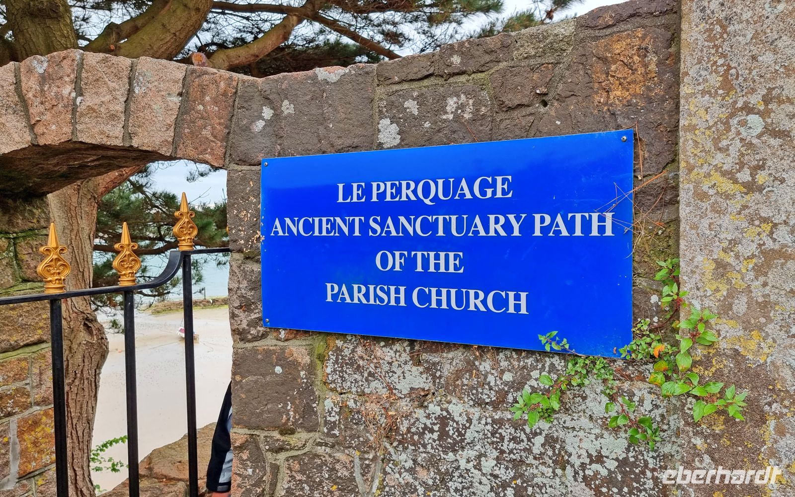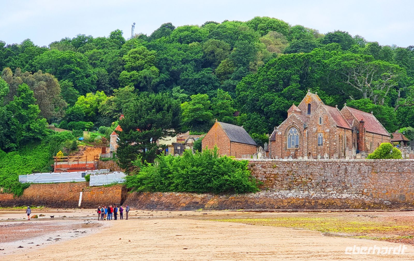 Unsere dritte Wanderung auf Jersey führte uns entlang der faszinierenden Südküste der Insel. Nach dem Frühstück im Hotel ging es los mit unserem privaten Bus nach St. Brelade. Hier starteten wir zu unserer Wanderung zunächst am Strand der St. Brelade's Bay entlang hinüber zur St. Brelade's Kirche. Über einen mittelalterlichen Fluchtweg "Le Perquage", der die Kirche direkt mit dem Meer verbindet, stiegen wir hinauf zum Kirchengelände. Die St. Brelade's Kirche ist die einzige Kirche auf Jersey, die direkt am Meer liegt und es ranken sich einige Legenden darum, warum sie gerade hier gebaut wurde. Die ältesten Teile der Kirche sollen schon aus dem 11. Jahrhundert stammen. Ein weiteres einmaliges Gebäude ist die kleine Fishermen's Chapel, die Fischerkapelle, die neben der eigentlichen Kirche steht. Im Mittelalter durften die Sünder nicht in der Hauptkirche sitzen, sondern mussten als Ausgeschlossene in einer separaten Kapelle Buße leisten.