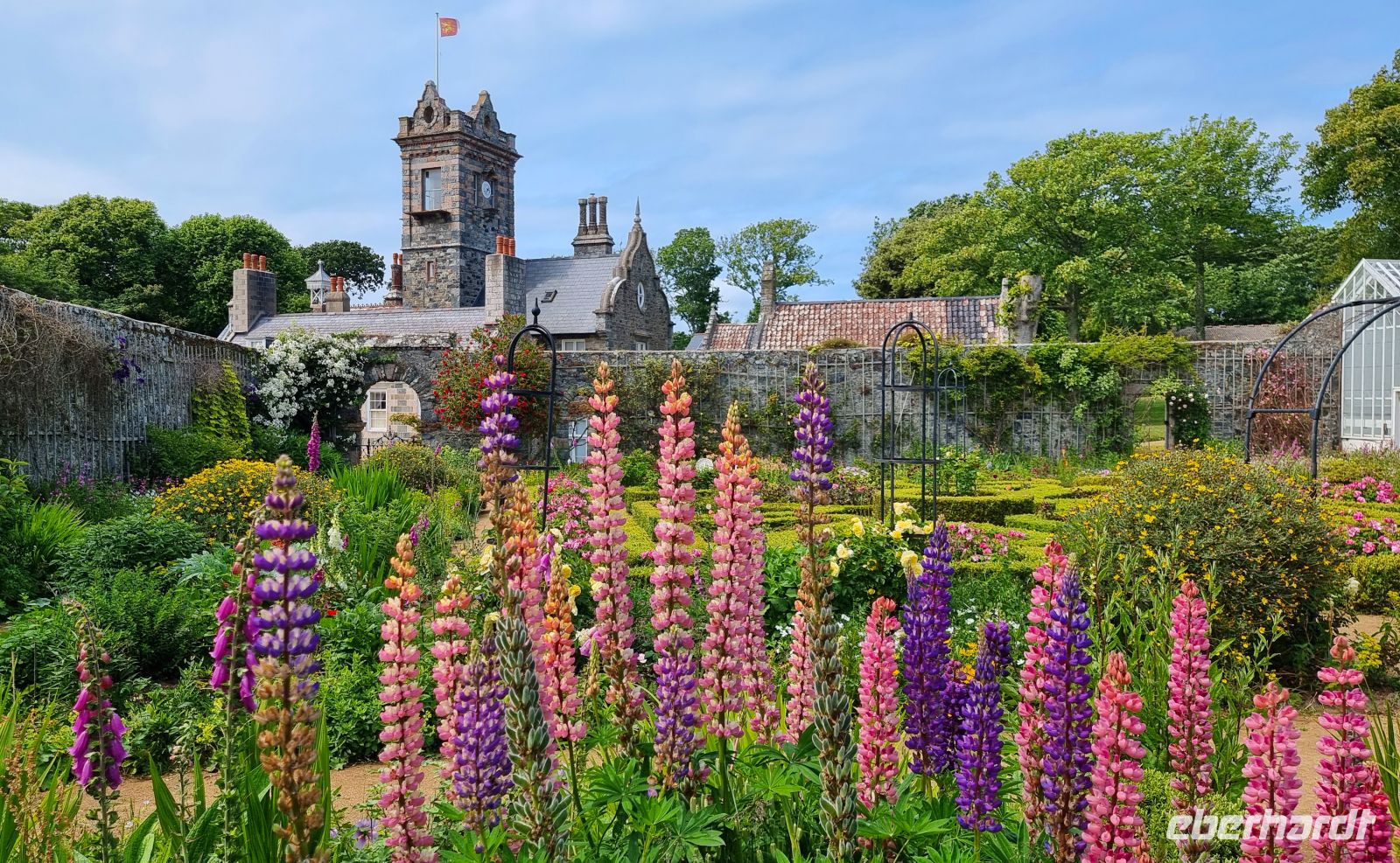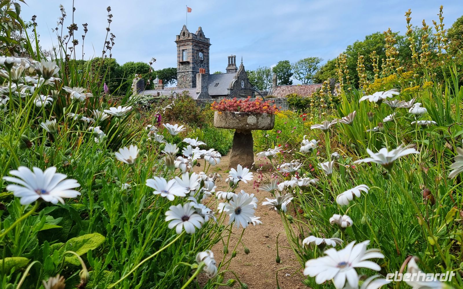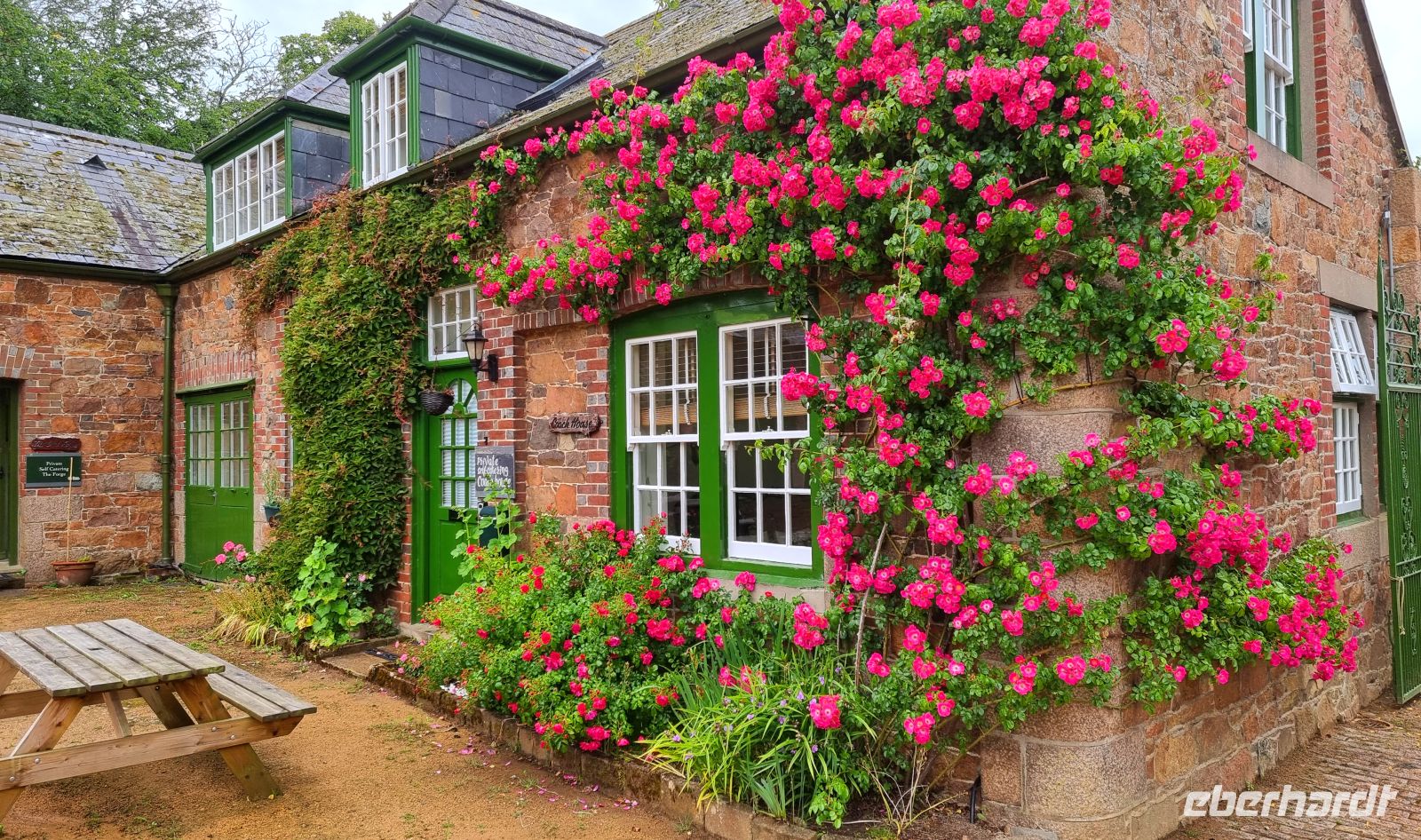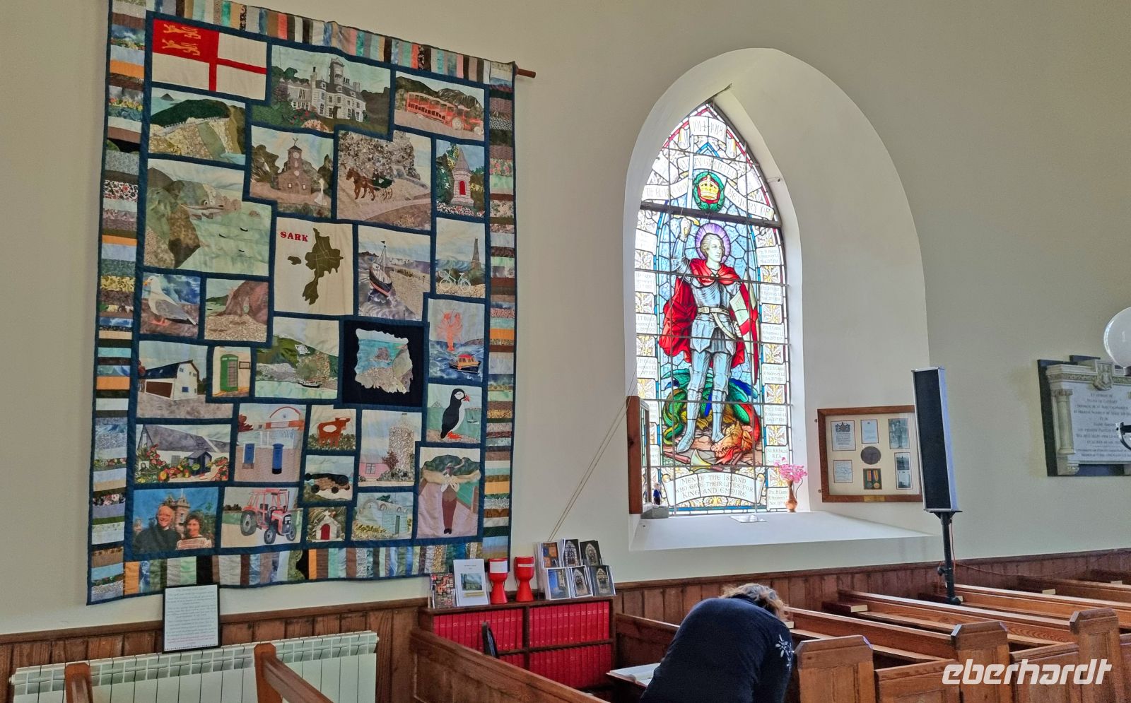 Dann stand der Besuch der wunderschönen Gärten des Seigneurs von Sark auf dem Programm. Wir wanderten entlang der schattigen Allee vorbei am Gemeindehaus, an der Arztpraxis und der Schule zur Seigneurie. Der Lehnsherr – heute der Seigneur Christopher Beaumont – wohnt hier mit seiner Familie in einem historischen Herrenhaus. Seine weitläufigen Gartenanlagen rund um das Haus hat er für die Öffentlichkeit zugänglich gemacht, ein Eintrittsgeld muss man aber schon bezahlen. Wir hatten Freizeit, um durch die Gärten oder zum kleinen Teich hinunter zu schlendern und Fotos von den herrlichen Blüten zu machen. Auch ein Café, einen kleinen Souvenirladen und Toiletten gibt es hier. Nach dem Gartenbummel ging es zu Fuß zurück zum Dorf und wir schauten uns auf dem Weg noch die kleine St. Peter Church an. Eine Besonderheit sind hier die gestickten Sitzkissen für jede der 40 Lehnsfamilien der Insel und die Wandteppiche, die die Geschichte der Insel zeigen.