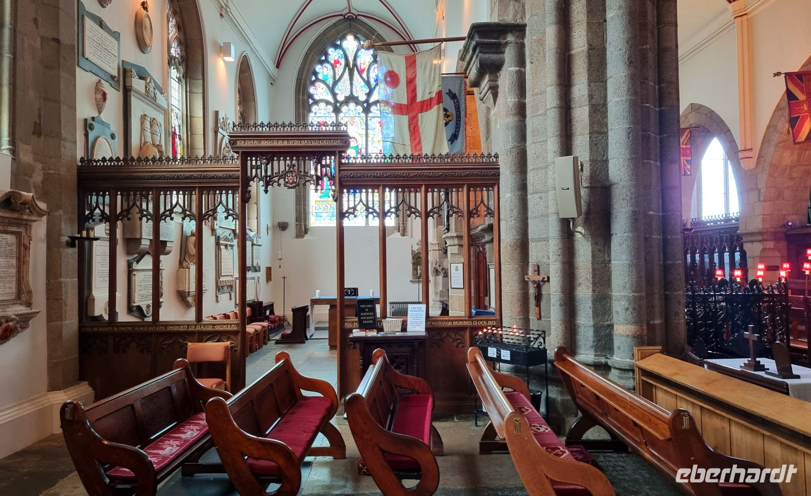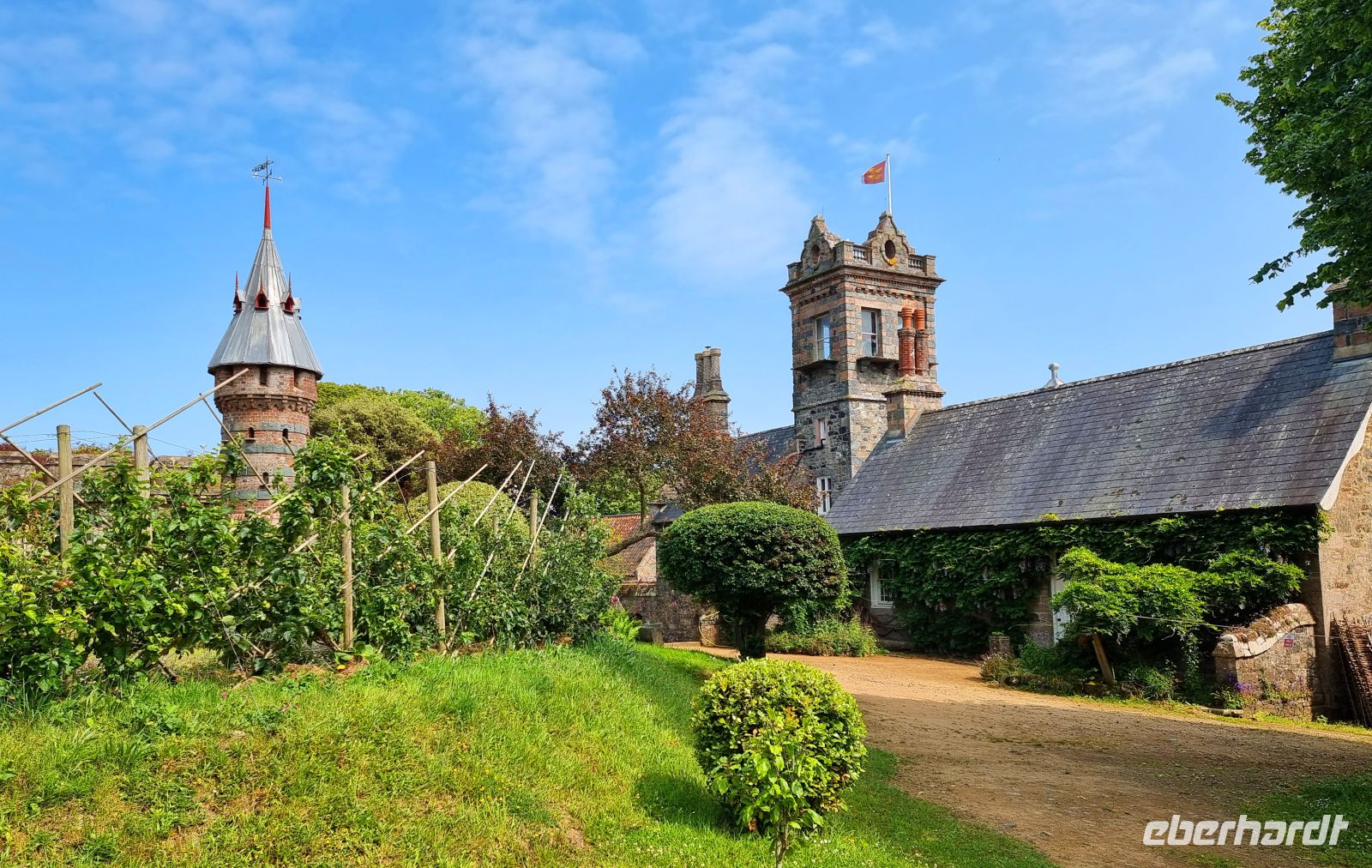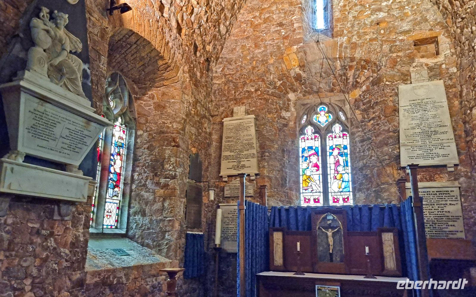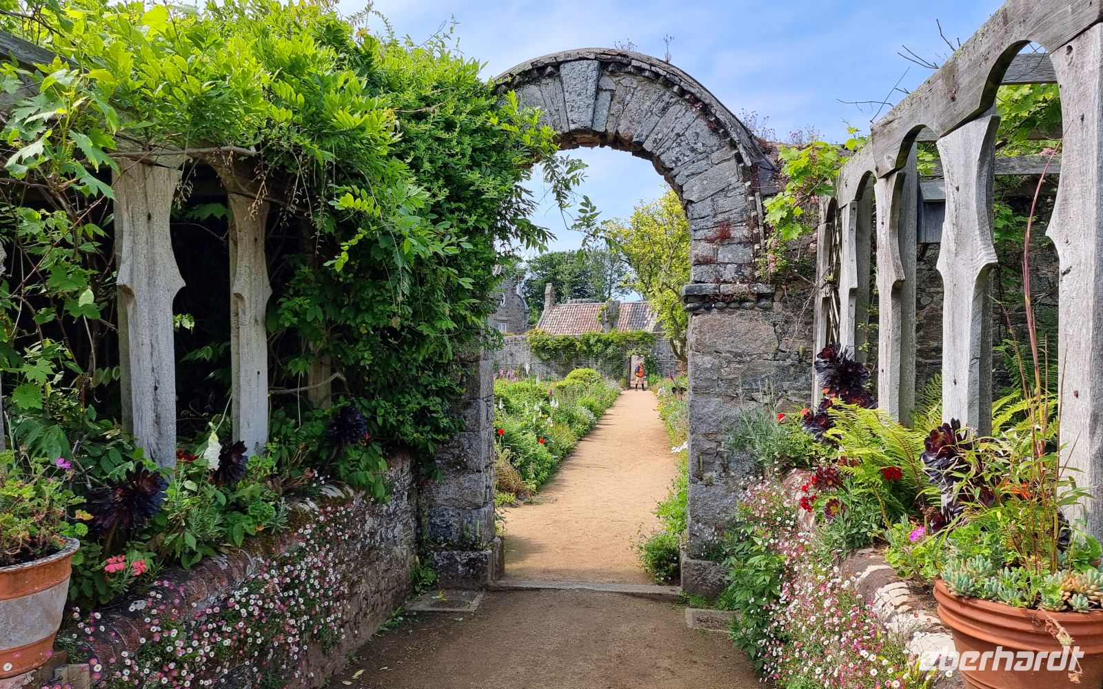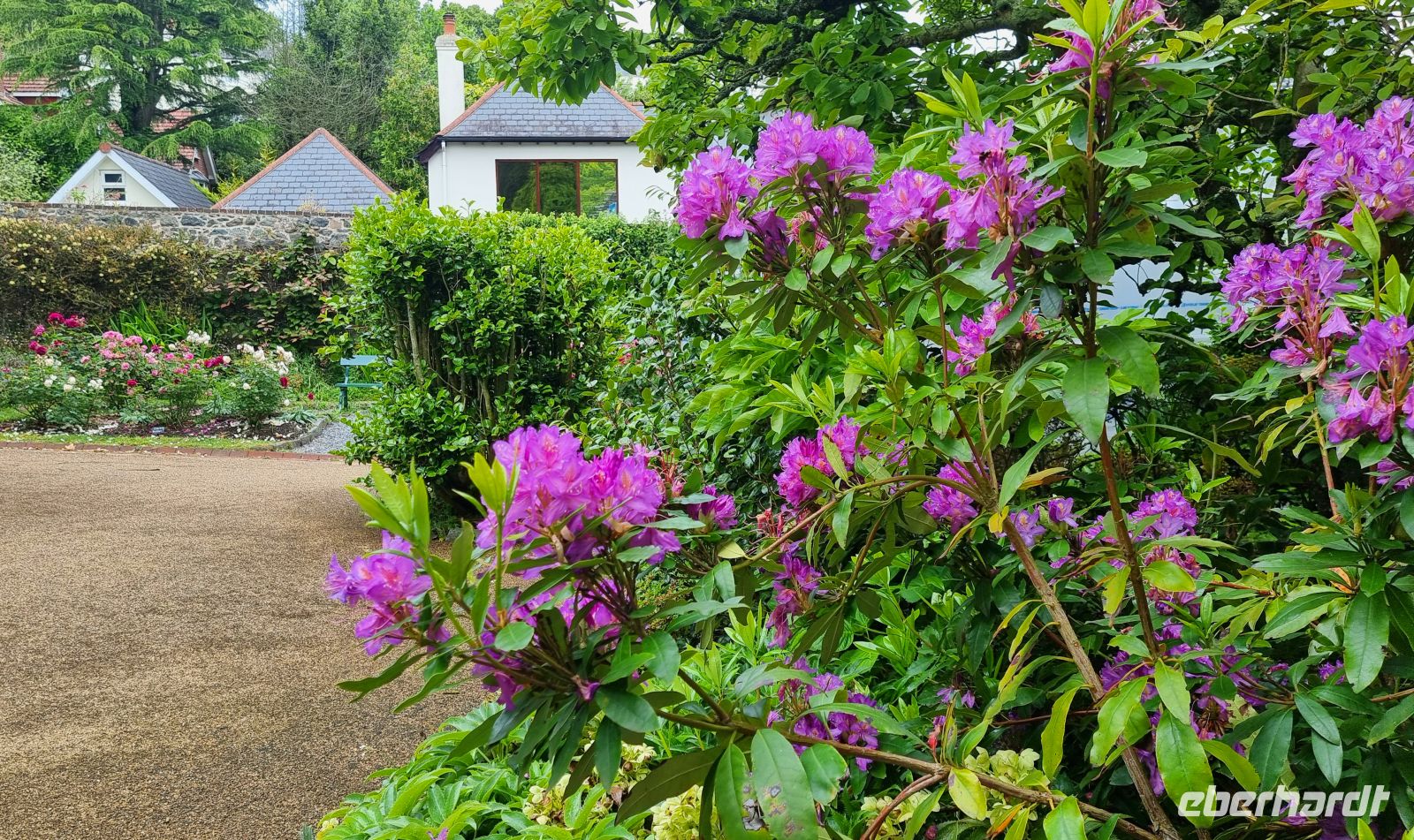 Dann stand der Besuch der wunderschönen Gärten des Seigneurs von Sark auf dem Programm. Wir wanderten entlang der schattigen Allee vorbei am Gemeindehaus, an der Arztpraxis und der Schule zur Seigneurie. Der Lehnsherr – heute der Seigneur Christopher Beaumont – wohnt hier mit seiner Familie in einem historischen Herrenhaus. Seine weitläufigen Gartenanlagen rund um das Haus hat er für die Öffentlichkeit zugänglich gemacht, ein Eintrittsgeld muss man aber schon bezahlen. Wir hatten Freizeit, um durch die Gärten oder zum kleinen Teich hinunter zu schlendern und Fotos von den herrlichen Blüten zu machen. Auch ein Café, einen kleinen Souvenirladen und Toiletten gibt es hier. Nach dem Gartenbummel ging es zu Fuß zurück zum Dorf und wir schauten uns auf dem Weg noch die kleine St. Peter Church an. Eine Besonderheit sind hier die gestickten Sitzkissen für jede der 40 Lehnsfamilien der Insel und die Wandteppiche, die die Geschichte der Insel zeigen.