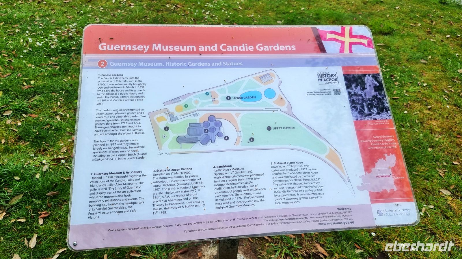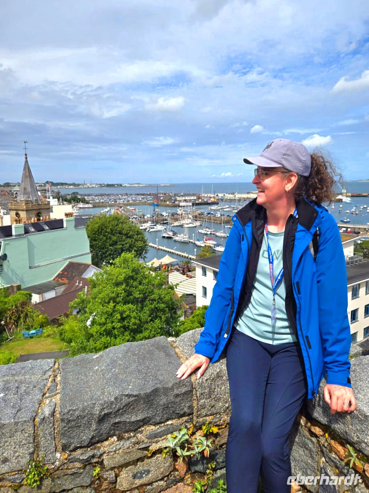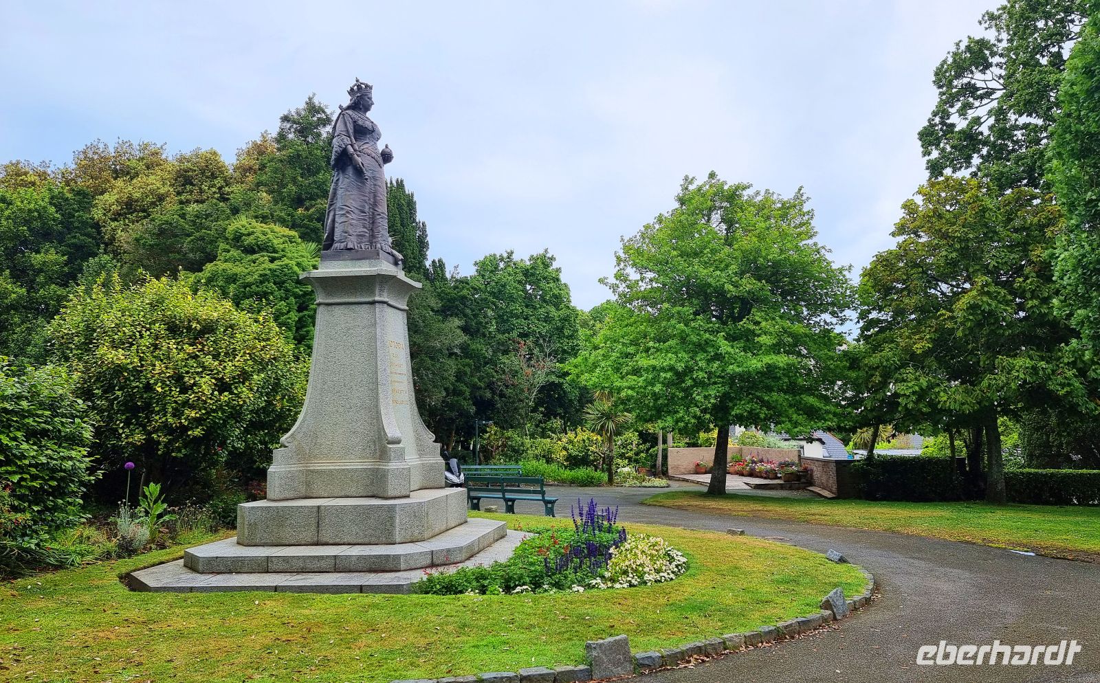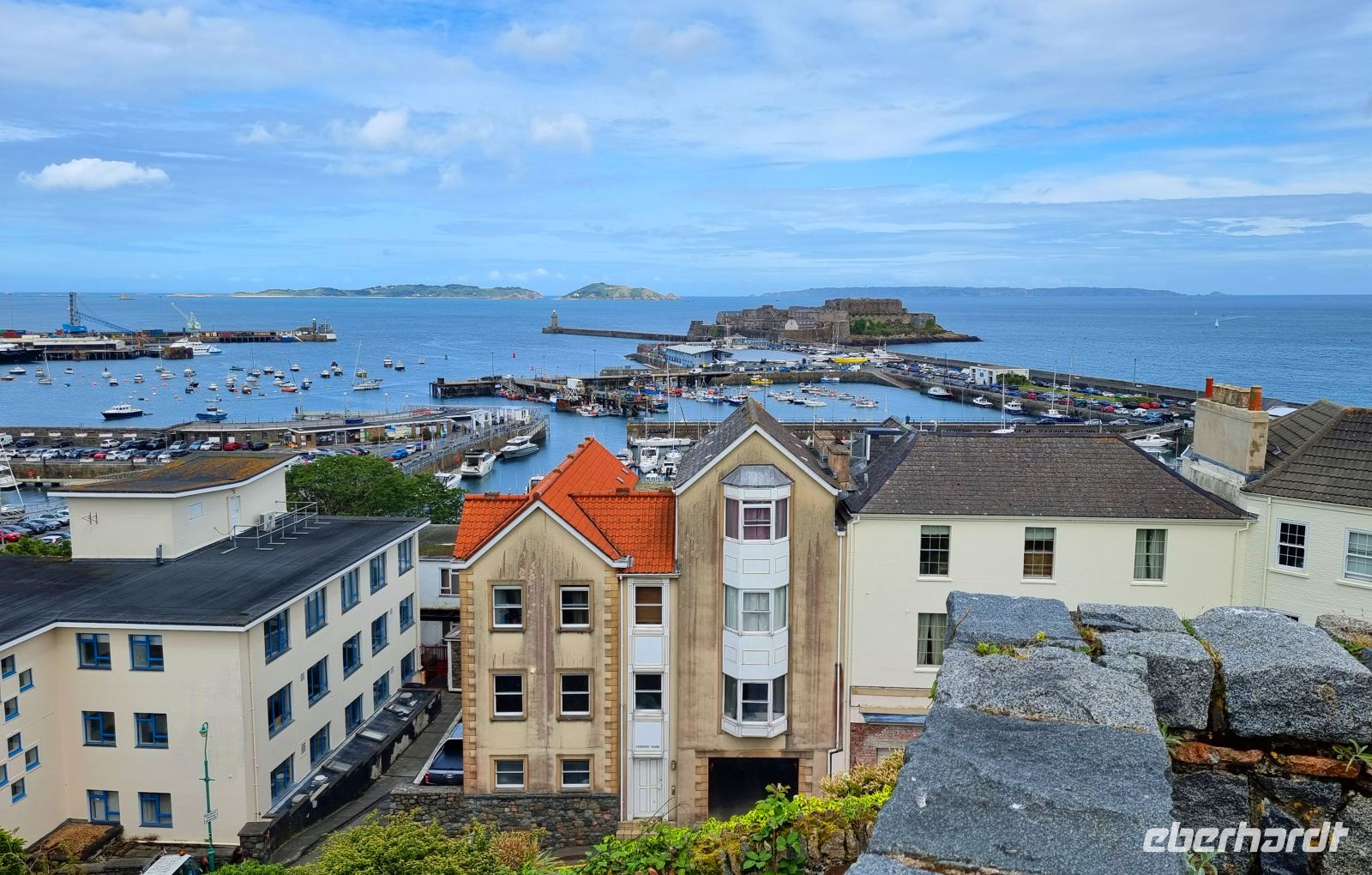 Schließlich brachte uns Michael mit dem Bus wieder zurück in die Inselhauptstadt St. Peter Port und wir verabschiedeten uns von ihm. Nun ging es zu Fuß weiter mit Gaby und einem Spaziergang durch Candie Garden. Diese herrliche Parkanlage mit Denkmälern von Queen Victoria und Victor Hugo wurden von der Familie Priaulx der Öffentlichkeit zugänglich gemacht. Blumenbeete, Palmen, ein Teich und exotische Pflanzen machen den Garten zu einem schönen Kleinod oberhalb der Innenstadt. Dann liefen wir hinunter ins Stadtzentrum von St. Peter Port und wer wollte, konnte ein wenig auf eigene Faust bummeln. Ein Großteil schloss sich Gaby an und wir legten erstmal eine Mittagspause in einem Restaurant in der Stadt ein. Danach führte uns Gaby noch an der Hafenpromenade entlang und zu einem weiteren Aussichtspunkt auf dem Tower Hill, wo wir einen weiten Blick über den Hafen hatten. Auch die Stadtkirche sahen wir uns an, bevor es zu Fuß zurück zum Hafen ging. Um 17 Uhr startete unsere Fähre von St. Peter Port zurück nach Jersey. Die Überfahrt war sehr ruhig und entspannt. Den letzten Abend ließen wir beim Buffet im Hotel und einem Absacker in der Hotelbar ausklingen.