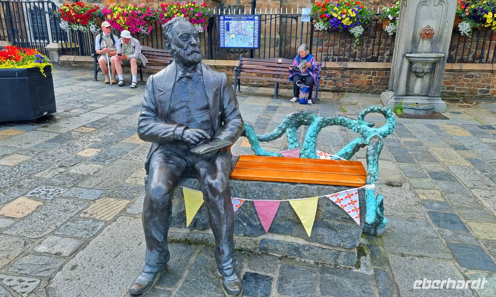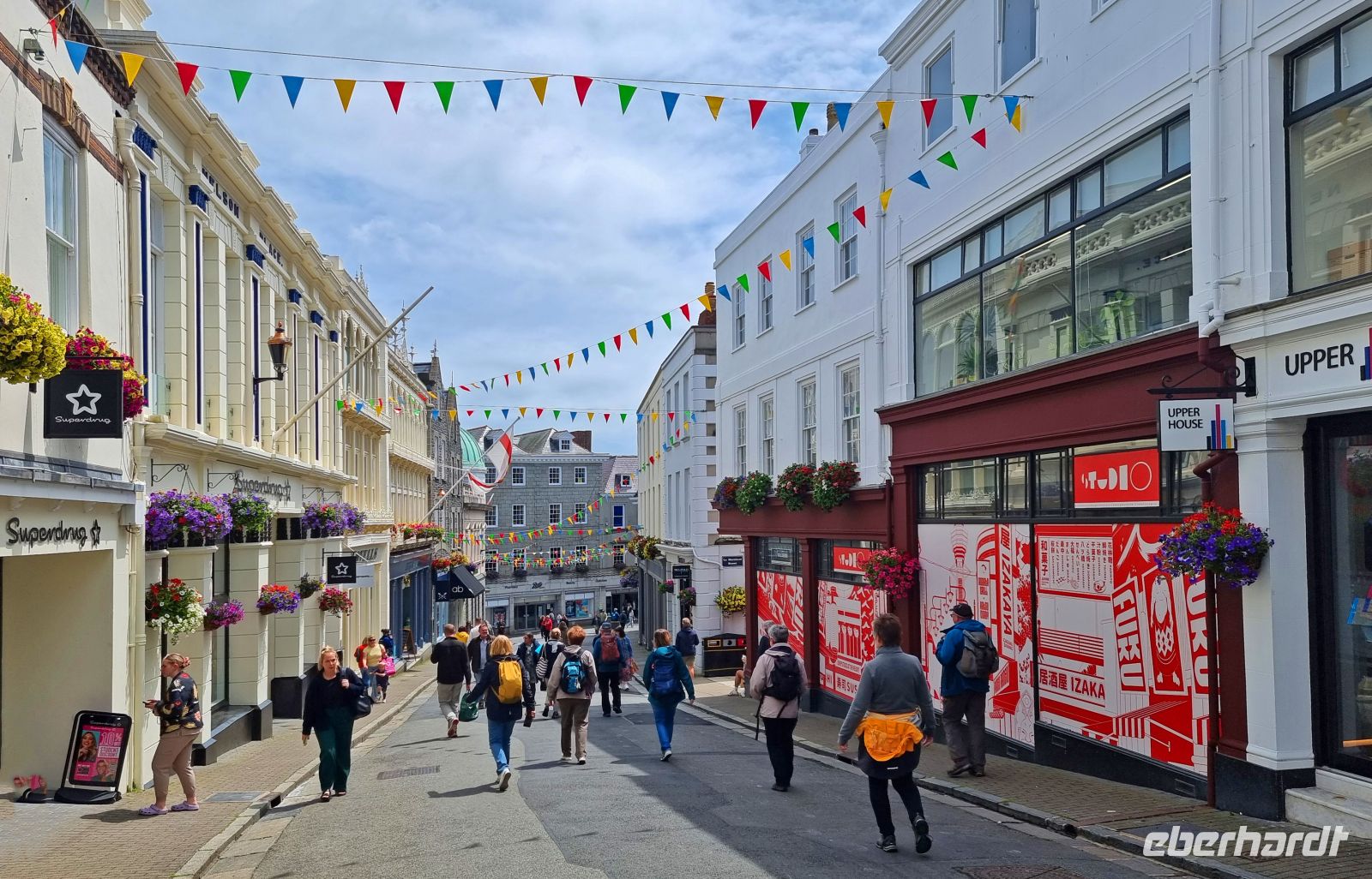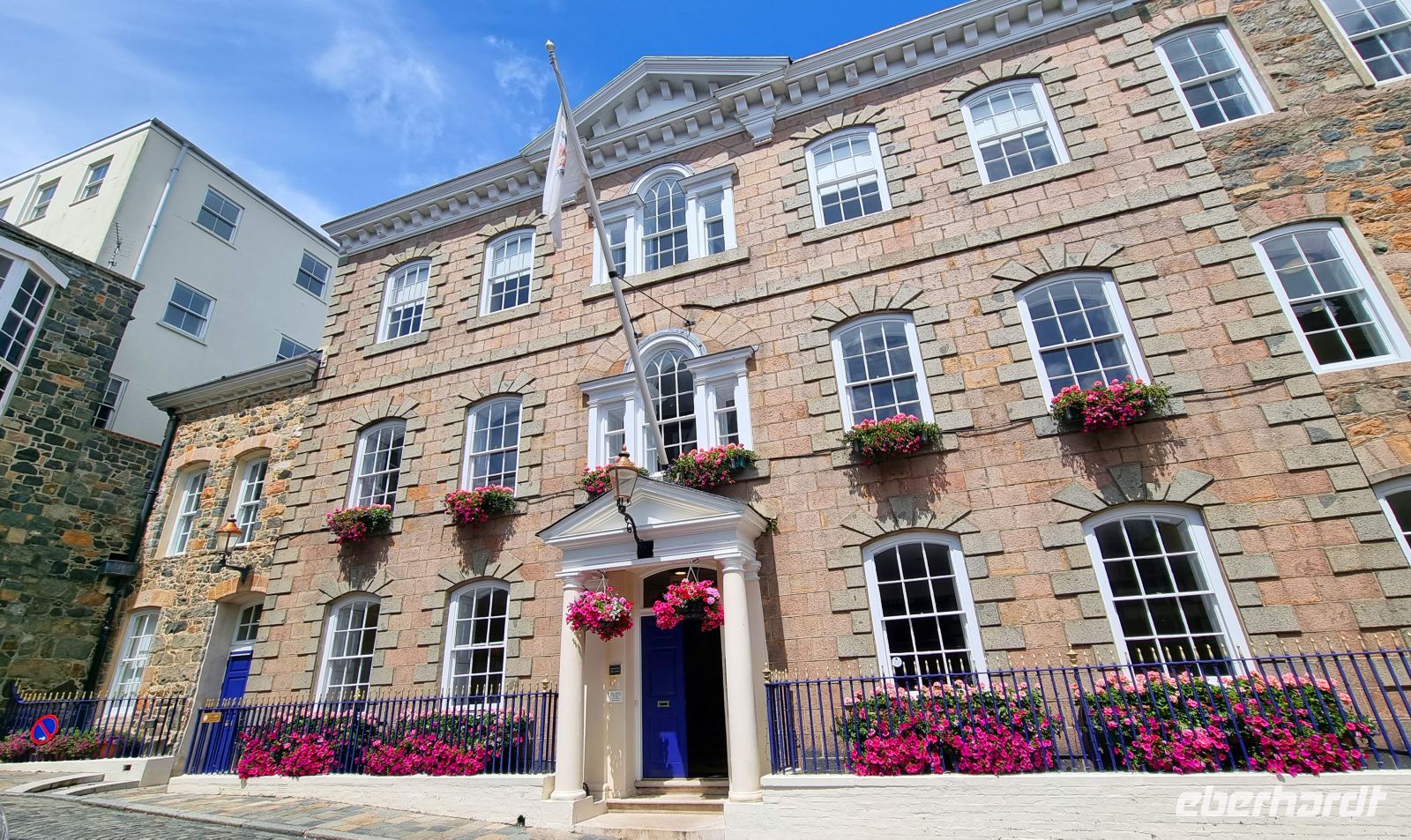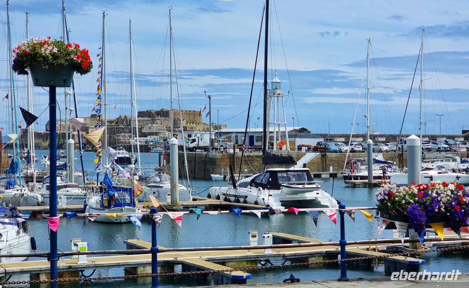 Schließlich brachte uns Michael mit dem Bus wieder zurück in die Inselhauptstadt St. Peter Port und wir verabschiedeten uns von ihm. Nun ging es zu Fuß weiter mit Gaby und einem Spaziergang durch Candie Garden. Diese herrliche Parkanlage mit Denkmälern von Queen Victoria und Victor Hugo wurden von der Familie Priaulx der Öffentlichkeit zugänglich gemacht. Blumenbeete, Palmen, ein Teich und exotische Pflanzen machen den Garten zu einem schönen Kleinod oberhalb der Innenstadt. Dann liefen wir hinunter ins Stadtzentrum von St. Peter Port und wer wollte, konnte ein wenig auf eigene Faust bummeln. Ein Großteil schloss sich Gaby an und wir legten erstmal eine Mittagspause in einem Restaurant in der Stadt ein. Danach führte uns Gaby noch an der Hafenpromenade entlang und zu einem weiteren Aussichtspunkt auf dem Tower Hill, wo wir einen weiten Blick über den Hafen hatten. Auch die Stadtkirche sahen wir uns an, bevor es zu Fuß zurück zum Hafen ging. Um 17 Uhr startete unsere Fähre von St. Peter Port zurück nach Jersey. Die Überfahrt war sehr ruhig und entspannt. Den letzten Abend ließen wir beim Buffet im Hotel und einem Absacker in der Hotelbar ausklingen.