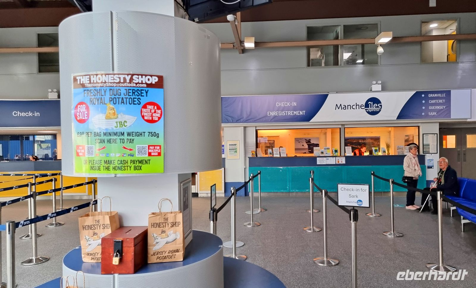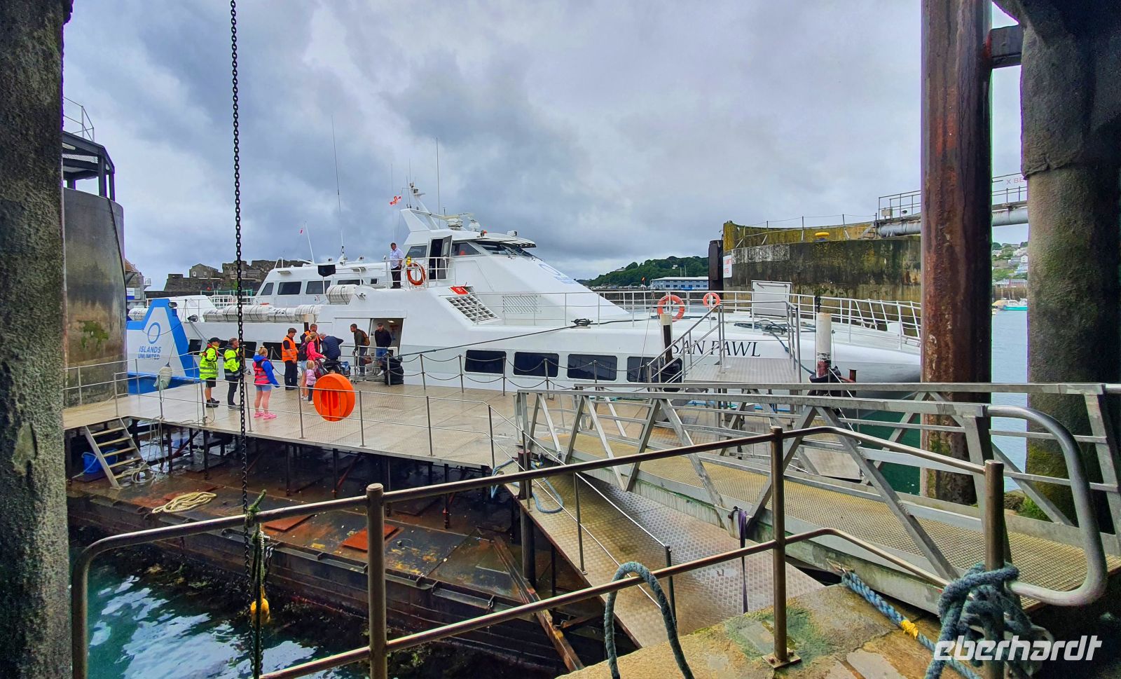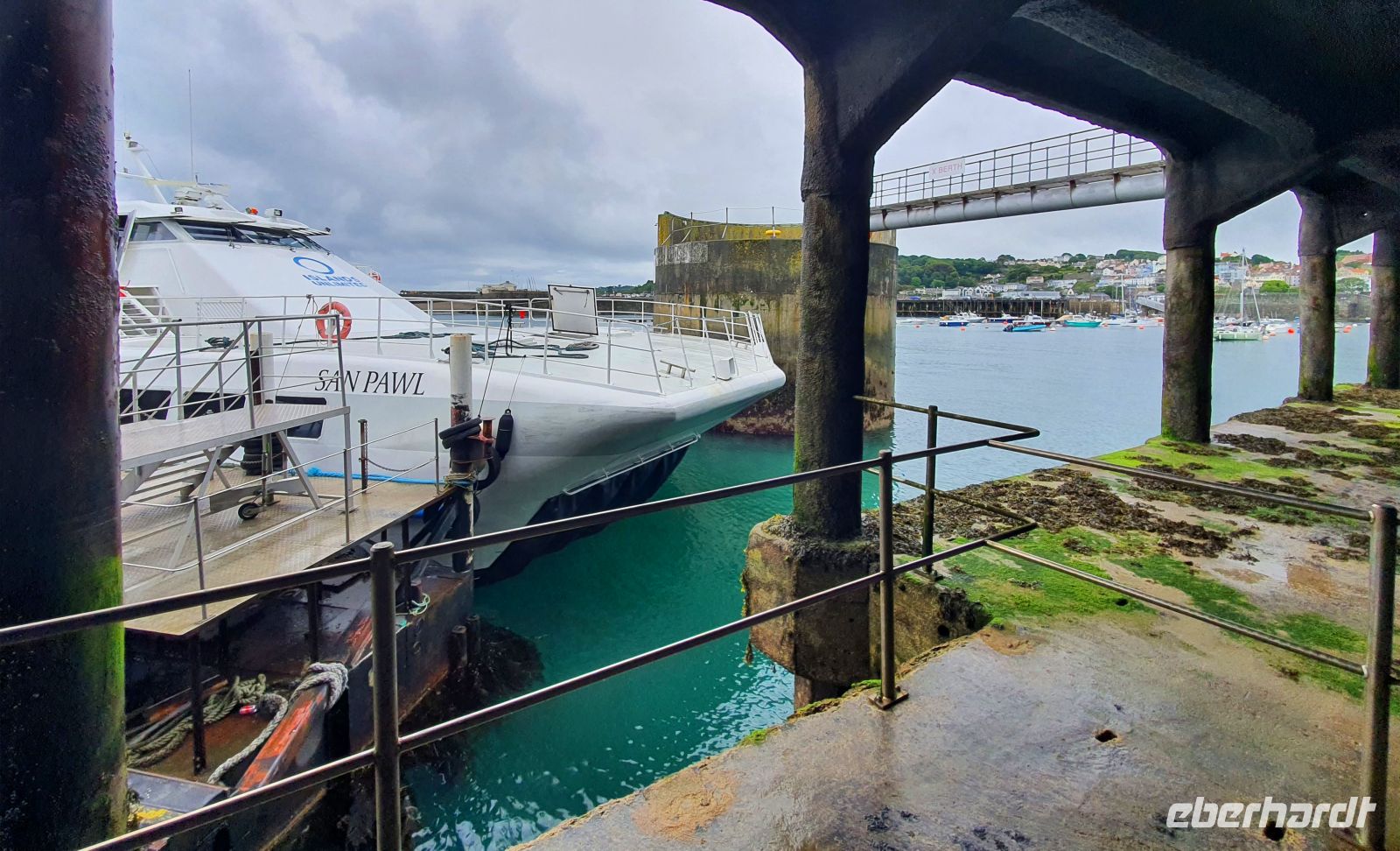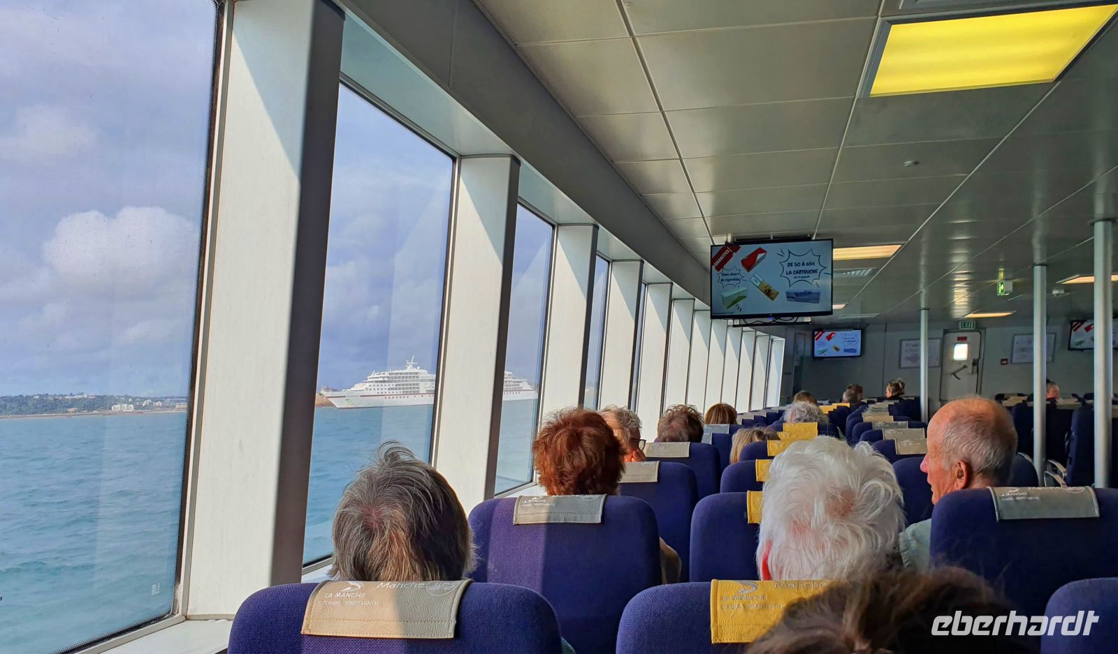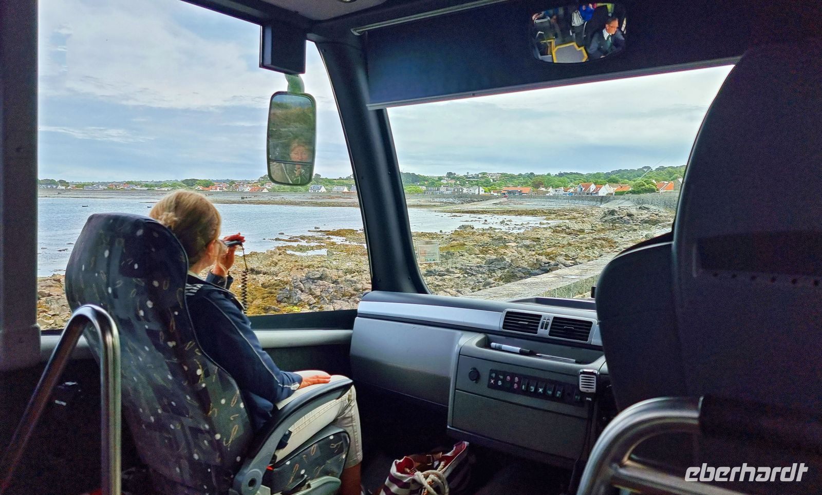 Am Freitag stand der Ausflug auf die zweitgrößte Kanalinsel Guernsey auf dem Programm. Um möglichst viel Zeit auf Guernsey zu haben, ging es wieder früh los. Nach einem kontinentalen, kleinen Frühstück im Hotel holte uns Jane mit dem Bus ab und wir fuhren zum Hafen von St. Helier. Diesmal hatten wir bereits die Bordkarten als QR-Code, die auf jeden Namen ausgestellt waren. Durch die Sicherheitskontrolle und die Passkontrolle ging es zum Schiff der neuen Jerseyer Fährgesellschaft "Islands Unlimited". Unser Fähre fuhr 8.30 Uhr. Diesmal war ein Hovercraft, also ein Luftkissenschiff, was quasi über das Wasser gleitet ohne tief ins Wasser einzutauchen. Die Überfahrt kam uns trotz etwas Wellengang daher relativ ruhig vor. Nach etwa 1 Stunde und 10 Minuten kamen wir mit der Fähre im Hafen von St. Peter Port an der Ostküste von Guernsey an. Hier gibt es ein Hafenterminal, durch das man vom Schiff durchgehen muss. Hier erwartete uns schon Gaby, unsere Deutsch sprechende Reiseleiterin auf Guernsey und unser Busfahrer Michael mit einem Bus, der nur für unsere Gruppe gemietet war.