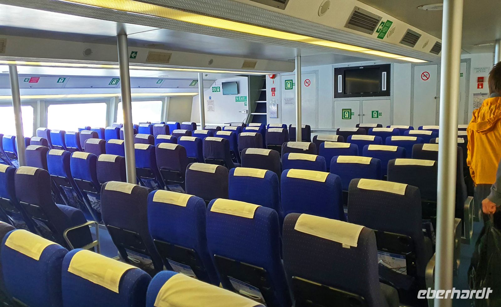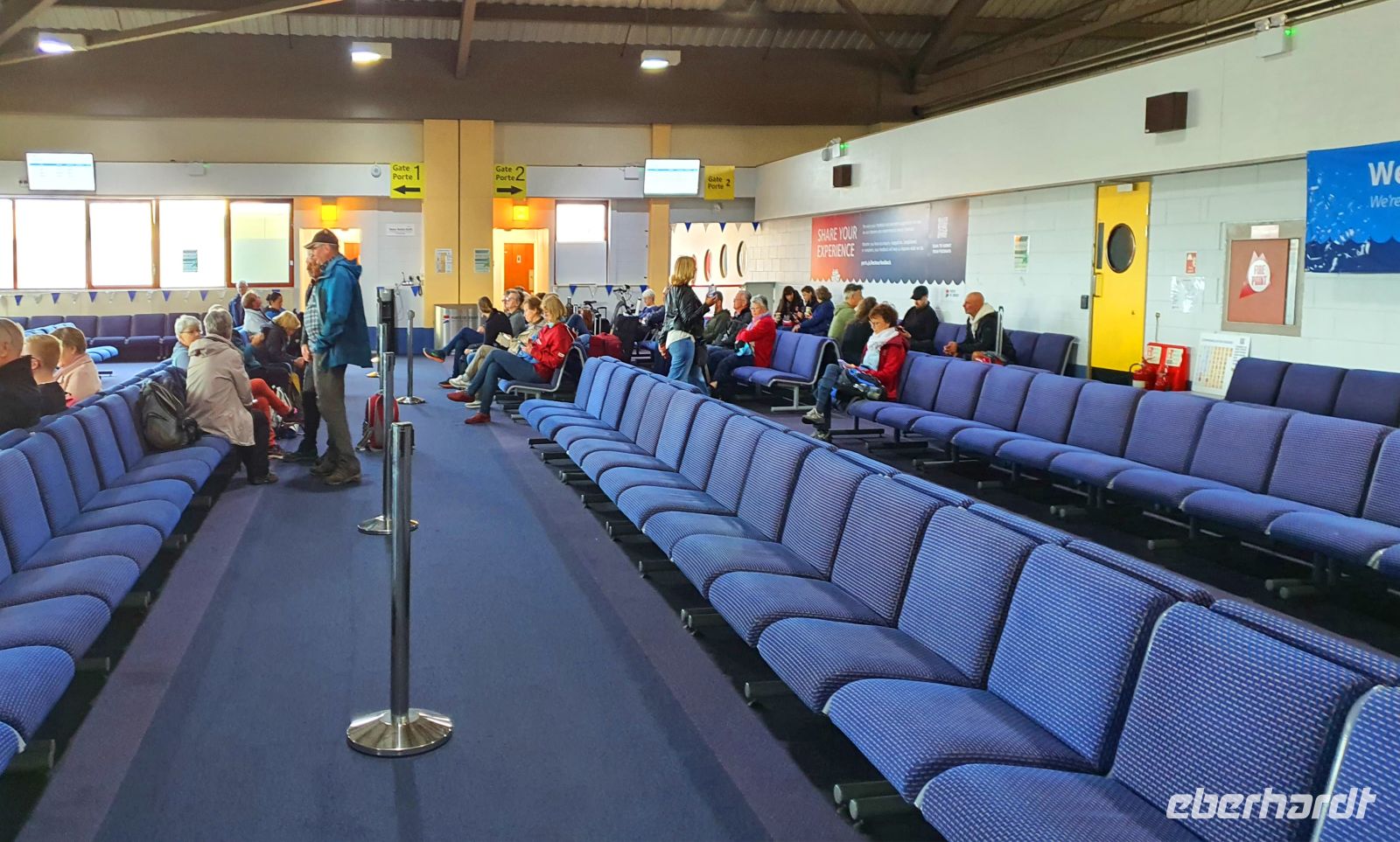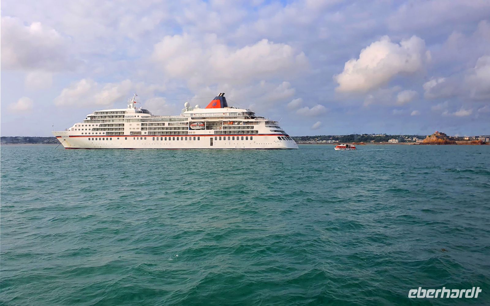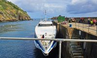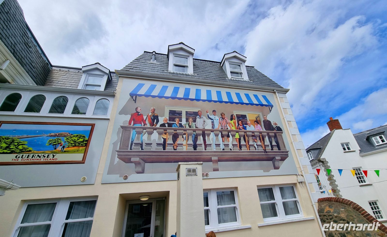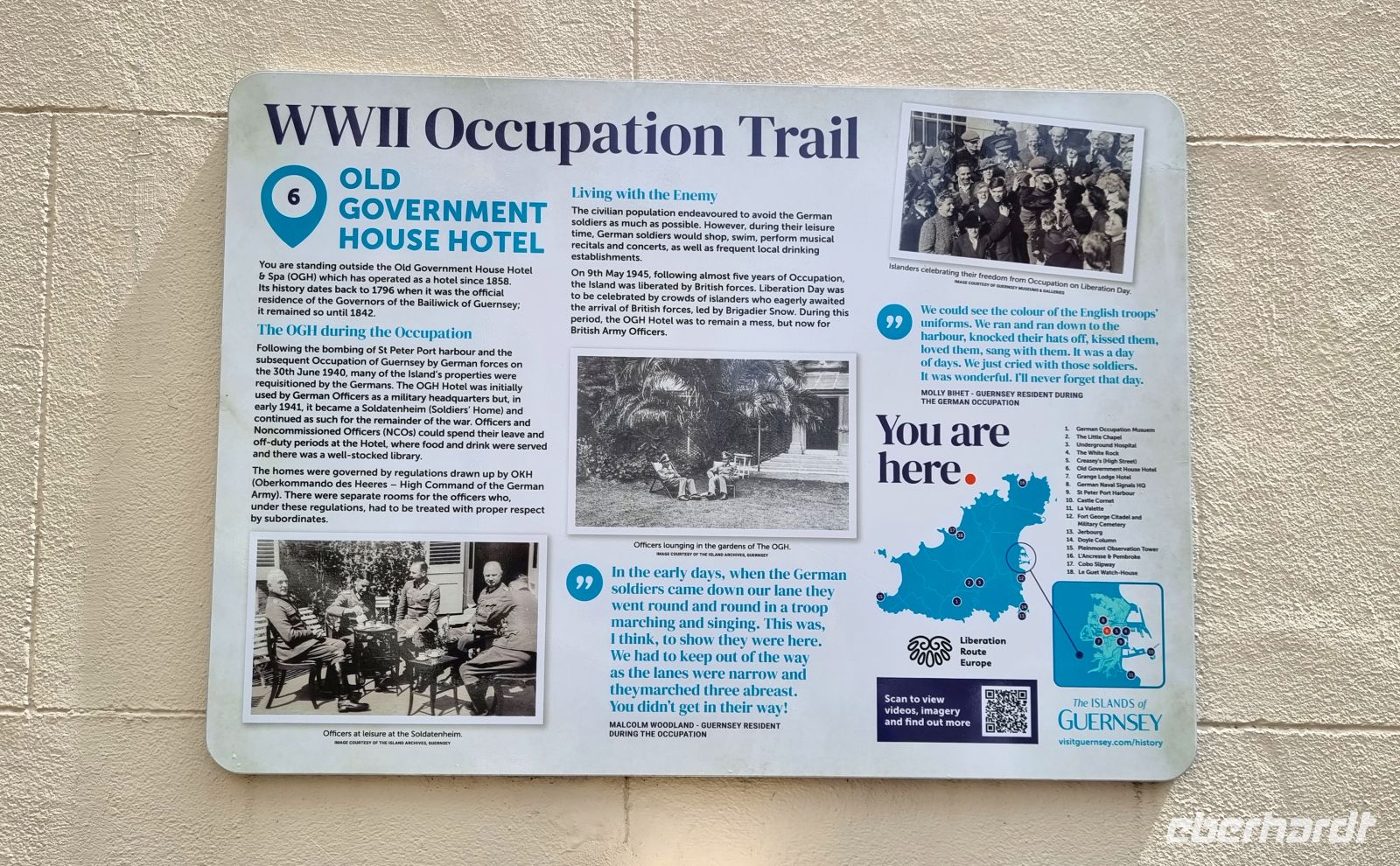 Am Freitag stand der Ausflug auf die zweitgrößte Kanalinsel Guernsey auf dem Programm. Um möglichst viel Zeit auf Guernsey zu haben, ging es wieder früh los. Nach einem kontinentalen, kleinen Frühstück im Hotel holte uns Jane mit dem Bus ab und wir fuhren zum Hafen von St. Helier. Diesmal hatten wir bereits die Bordkarten als QR-Code, die auf jeden Namen ausgestellt waren. Durch die Sicherheitskontrolle und die Passkontrolle ging es zum Schiff der neuen Jerseyer Fährgesellschaft "Islands Unlimited". Unser Fähre fuhr 8.30 Uhr. Diesmal war ein Hovercraft, also ein Luftkissenschiff, was quasi über das Wasser gleitet ohne tief ins Wasser einzutauchen. Die Überfahrt kam uns trotz etwas Wellengang daher relativ ruhig vor. Nach etwa 1 Stunde und 10 Minuten kamen wir mit der Fähre im Hafen von St. Peter Port an der Ostküste von Guernsey an. Hier gibt es ein Hafenterminal, durch das man vom Schiff durchgehen muss. Hier erwartete uns schon Gaby, unsere Deutsch sprechende Reiseleiterin auf Guernsey und unser Busfahrer Michael mit einem Bus, der nur für unsere Gruppe gemietet war.