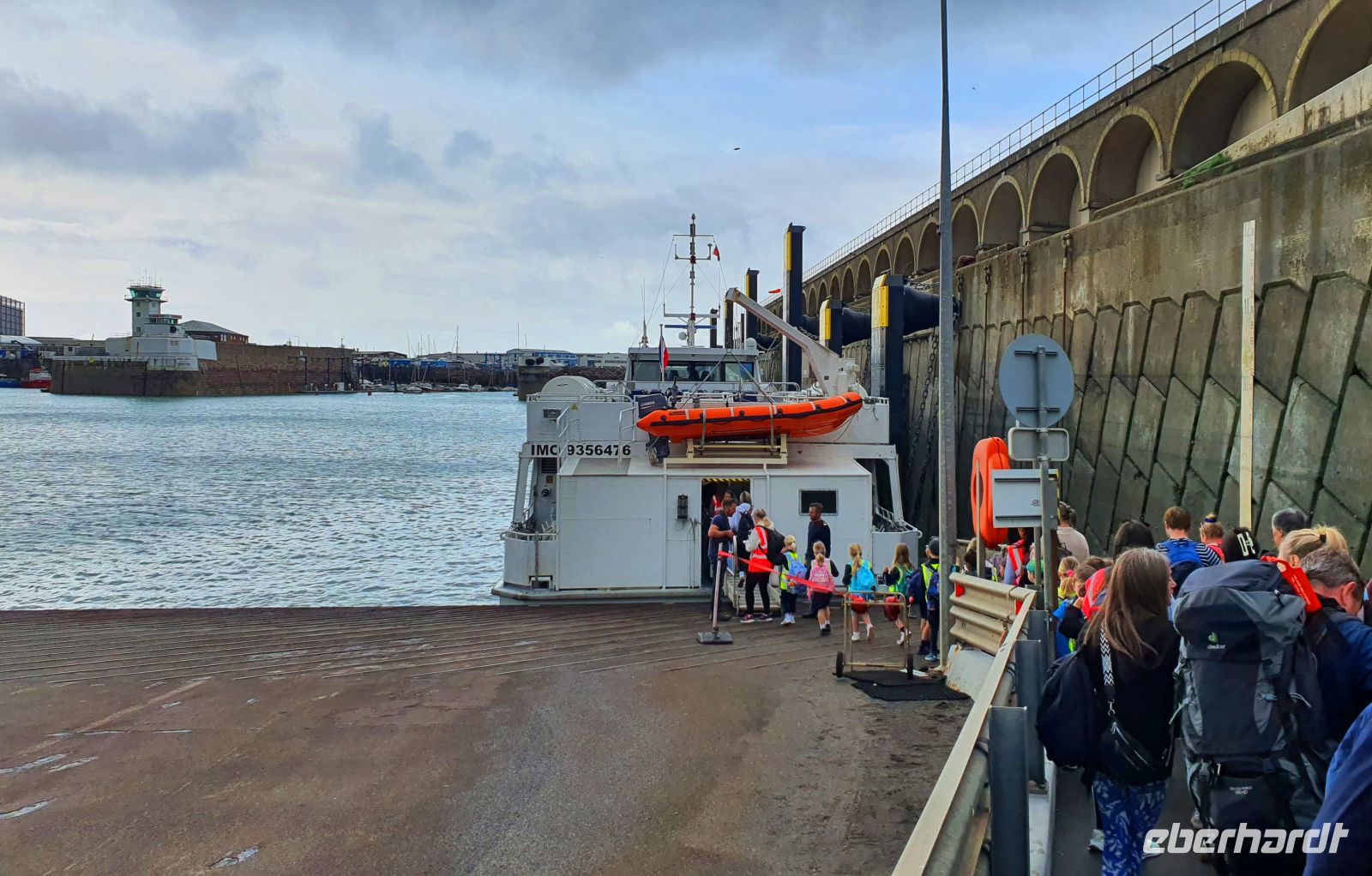 Schon war es Zeit, zurück zum Hafen hinunter zu gehen, denn um 17 Uhr fuhr unsere Fähre zurück nach Jersey. Diesmal wanderten wir zu Fuß den idyllischen Wanderpfad durch den Wald hinunter. Ich checkte die Gruppe beim Hafenmeister ein und erhielt für jede Person ein Plasteticket, welches wir abgeben mussten, sobald wir auf die Fähre gingen. Es hat alles problemlos geklappt und so verabschiedeten wir uns von Ken und fuhren mit der Fähre zurück nach St. Helier. Auf dem Rückweg war die See ruhiger und wir kamen pünktlich in Jersey an. Unser Bus stand schon am Hafen bereit und wir freuten uns alle auf das Abendessen in unserem Hotel.