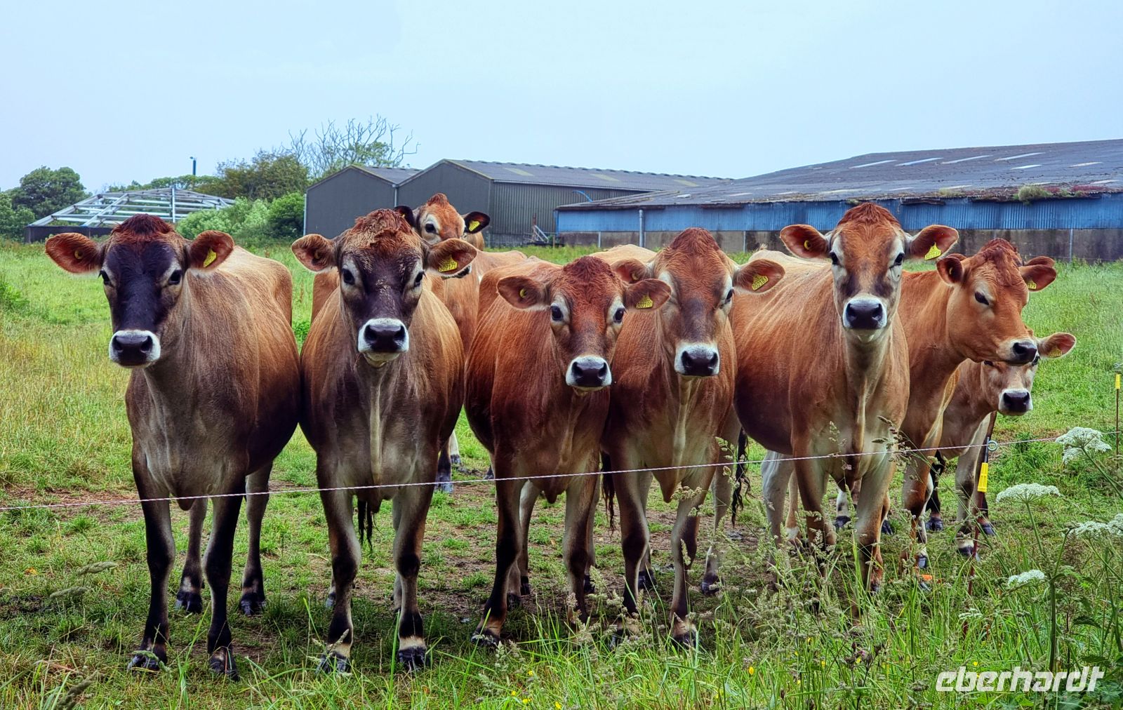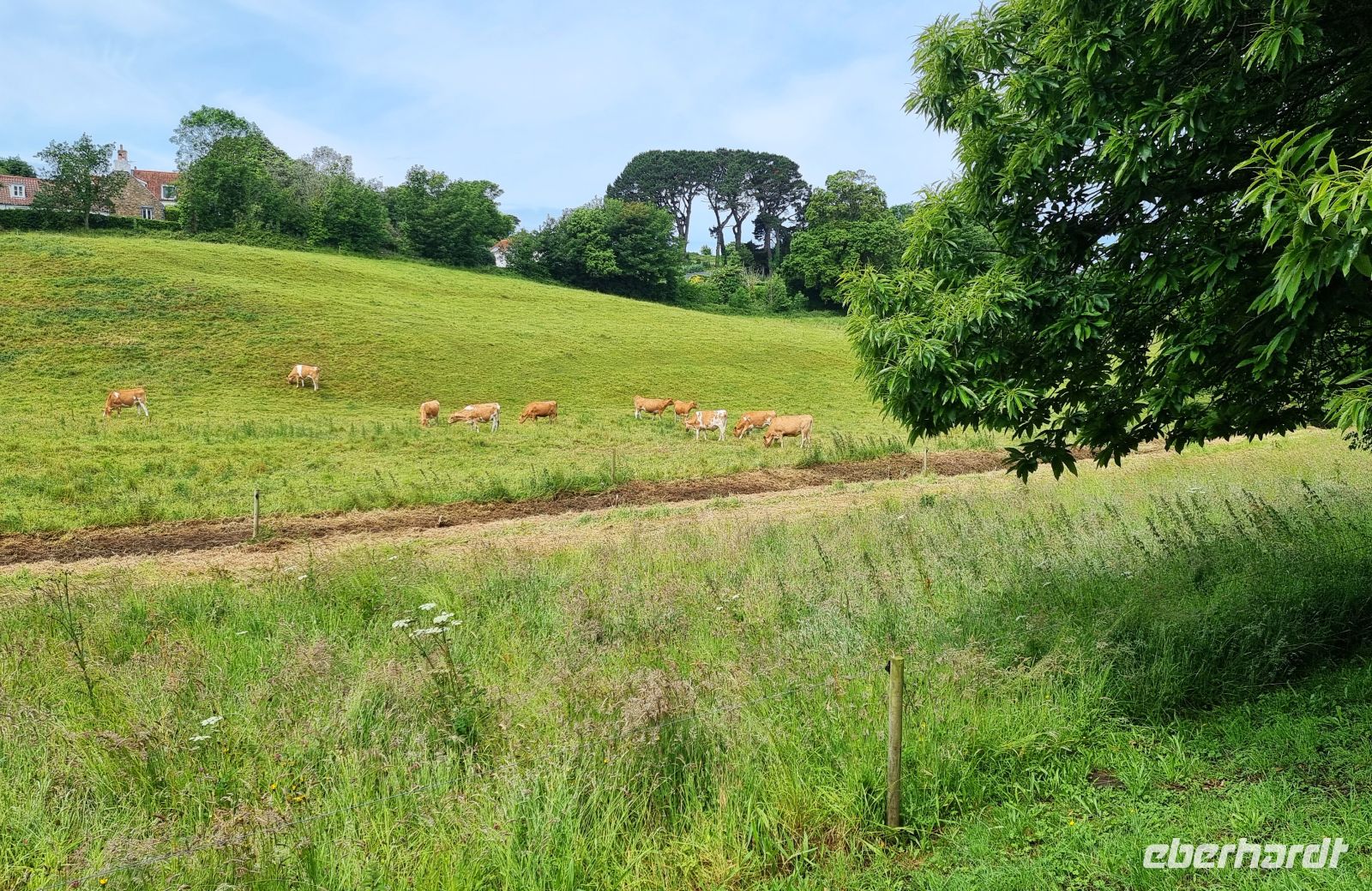 Unsere letzte Wanderung auf Jersey führte uns noch einmal an die Nordküste, nun aber in den Nordosten der Insel. Unsere Bus-Chauffeurin Jane holte uns am Hotel ab und wir fuhren durch das Inselinnere, wobei uns Remi einiges zur Landwirtschaft und zum früheren Schiffsbau auf Jersey erzählte. Auf einer Weide konnten wir sogar die niedlichen Jersey Kühe ausfindig machen, die sogleich zum Bus gelaufen kamen und sich bereitwillig für ein Foto in Position stellten.