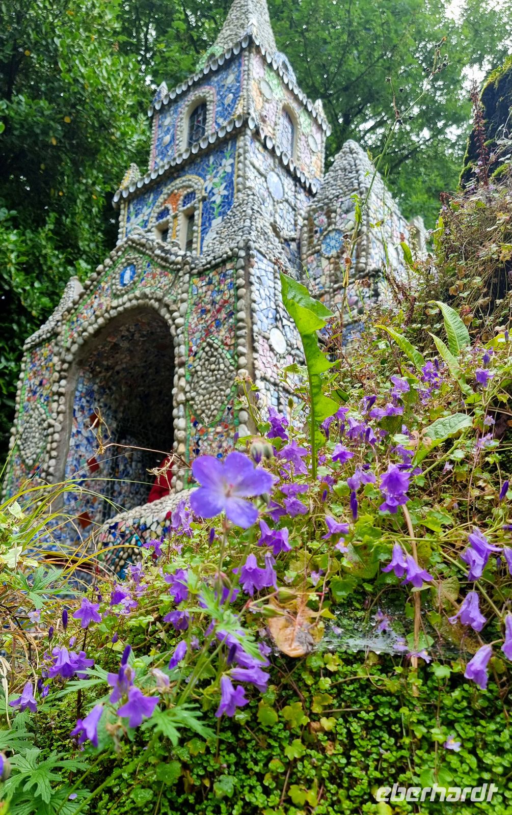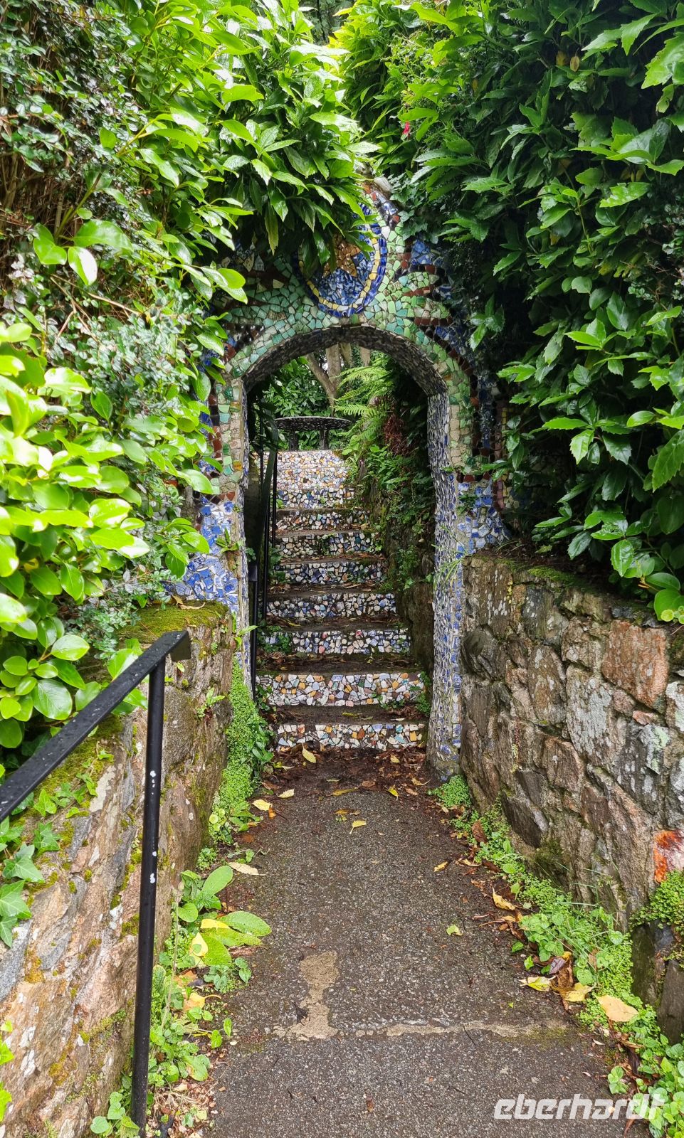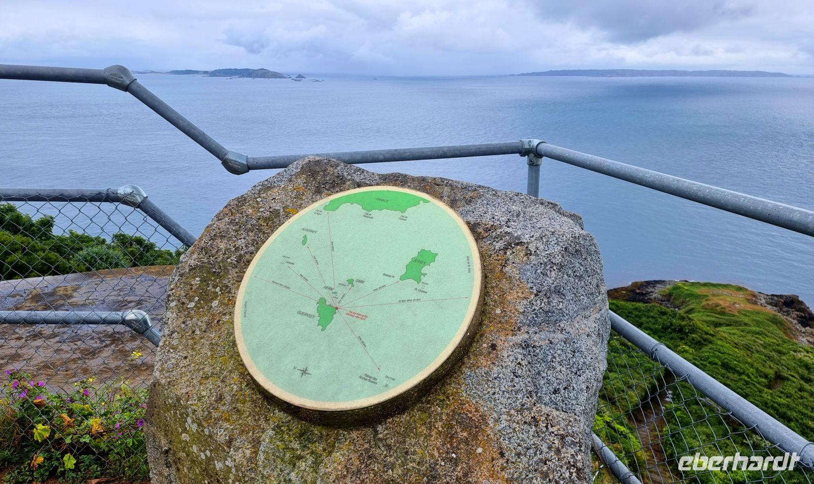 Bei unserer Inselrundfahrt im Bus fuhren wir von der Hauptstadt St. Peter Port in die Gemeinde St. Martin zur Halbinsel Jerbourg. Hier führte uns ein kurzer Spazierweg zu den Klippen an der Südspitze mit einem schönen Blick auf das Meer. Hier soll auch der französische Maler Pierre-Auguste Renoir schon gesessen und seine Bilder von Guernsey gemalt haben. Gaby erzählt uns etwas zur Doyle Column, die zu Ehren von General Sir John Doyle, einem Gouverneur von Guernsey, auf dem höchsten Punkt von Jerbourg Point errichtet wurde. Ein kurzer Spaziergang führte uns zum Jerbourg Hotel und zu einem Aussichtspunkt an der Südspitze, von dem man bis zu den den Nachbarinseln Sark und Herm schauen konnte. Weiter ging die Fahrt im Bus zur Little Chapel in der Gemeinde St. Andrew. Sie gilt als eine der kleinsten geweihten Kirchen der Welt und wurde mit Muscheln, Kieseln und Porzellanscherben an allen Wänden und Decken verziert.