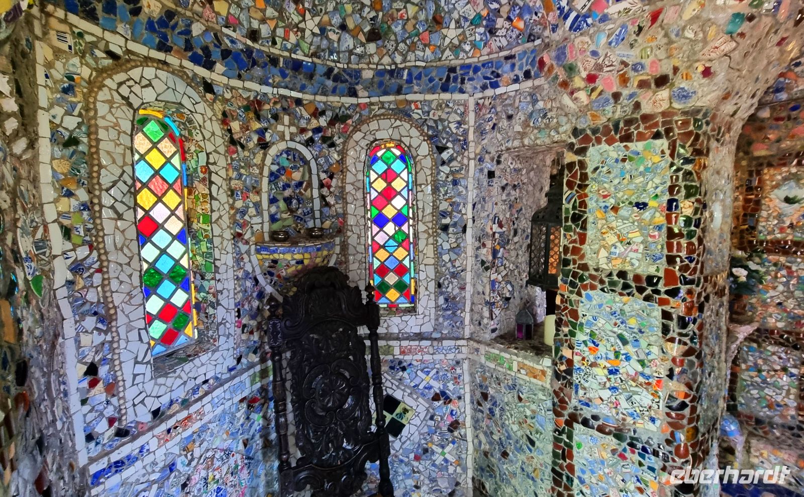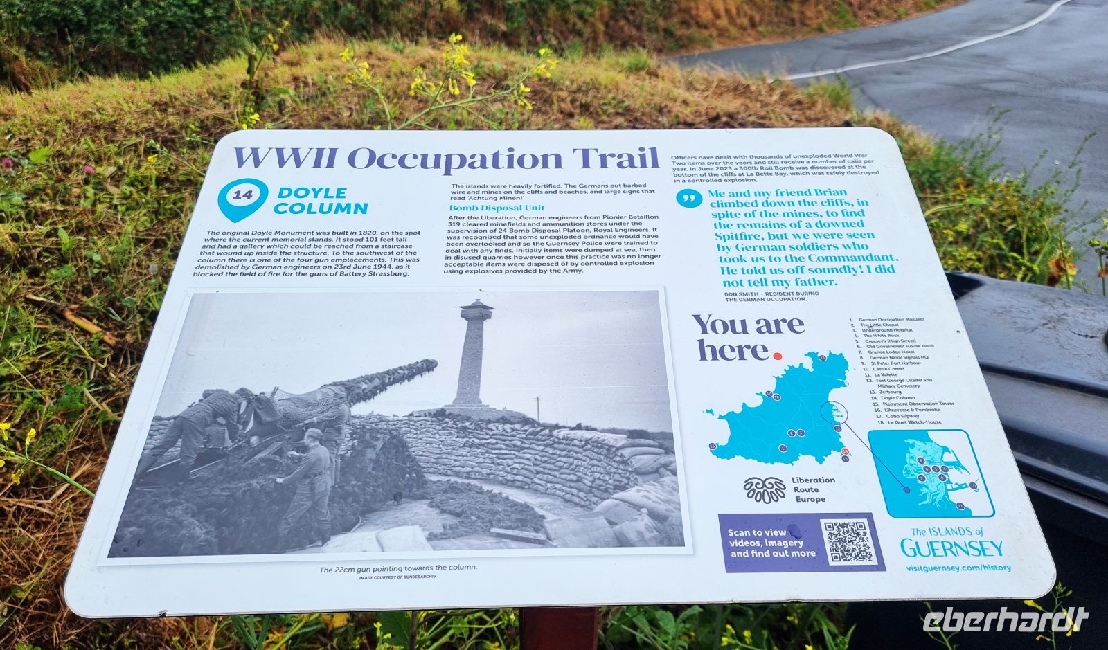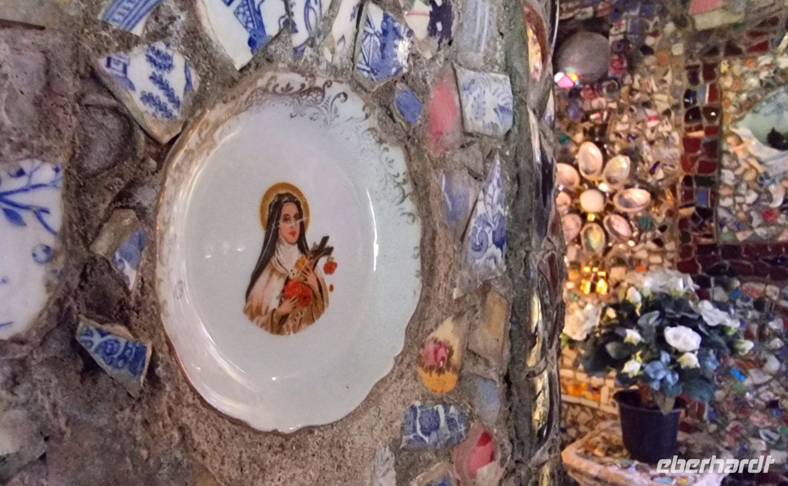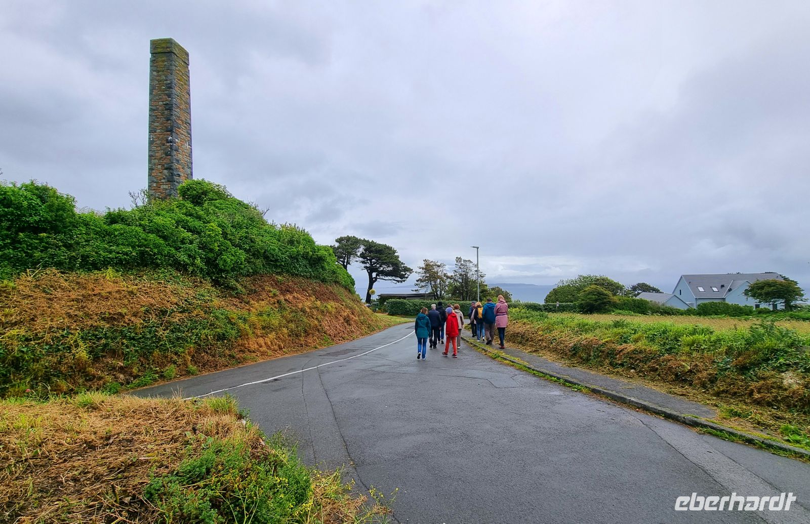 Bei unserer Inselrundfahrt im Bus fuhren wir von der Hauptstadt St. Peter Port in die Gemeinde St. Martin zur Halbinsel Jerbourg. Hier führte uns ein kurzer Spazierweg zu den Klippen an der Südspitze mit einem schönen Blick auf das Meer. Hier soll auch der französische Maler Pierre-Auguste Renoir schon gesessen und seine Bilder von Guernsey gemalt haben. Gaby erzählt uns etwas zur Doyle Column, die zu Ehren von General Sir John Doyle, einem Gouverneur von Guernsey, auf dem höchsten Punkt von Jerbourg Point errichtet wurde. Ein kurzer Spaziergang führte uns zum Jerbourg Hotel und zu einem Aussichtspunkt an der Südspitze, von dem man bis zu den den Nachbarinseln Sark und Herm schauen konnte. Weiter ging die Fahrt im Bus zur Little Chapel in der Gemeinde St. Andrew. Sie gilt als eine der kleinsten geweihten Kirchen der Welt und wurde mit Muscheln, Kieseln und Porzellanscherben an allen Wänden und Decken verziert.