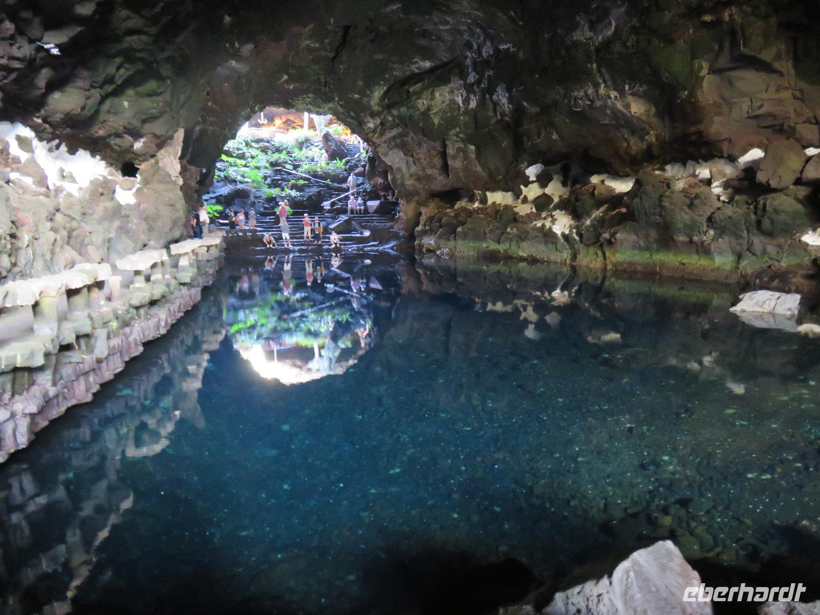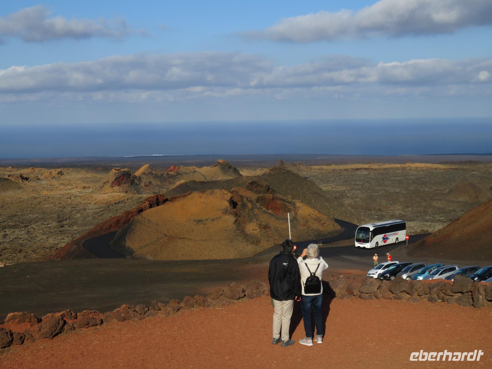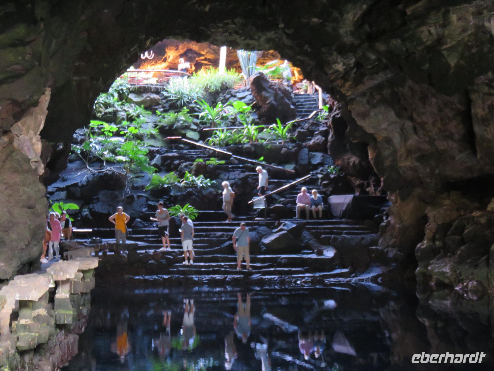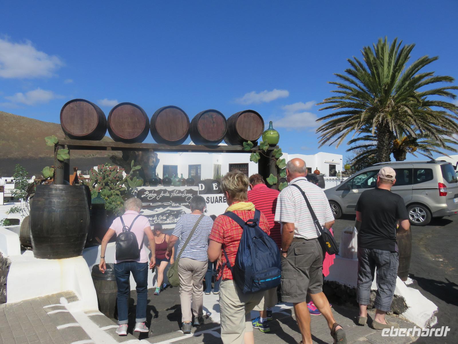 zeigte uns das typische der Insel: schwarzer, brauner, beiger und roter Vulkanboden, zerklüftete Krater, grüne Palmen, weiße Häuser und die einzigartigen Kunstwerke des Künstlers César Manrique. Zuerst fuhren wir in den Timanfaya-Nationalpark. Im Besucherzentrum bestaunten wir die Demonstrationen der Erdaktivitäten: in 20 Zentimetern Tiefe befindet sich bereits heiße Vulkanerde, in einem Erdloch wurden trockene Zweige zum Brennen gebracht und schließlich wurde mittels Wasser eine Dampffontäne, ein kleiner Geysire, erzeugt. Am Erdwärme-Grill konnten Kartoffeln gegart werden. Ganz langsam, fast zaghaft legten wir unsere Hände an der Seite zum Fühlen hin: Es war richtig heiß und nicht nur lau warm. Nach etwas Freizeit fuhren wir mit dem Bus durch das beeindruckende Lavafeld, vorbei an weiteren Vulkanen, an unterschiedlichen Formationen erkalteter Lava ... ein Spiel der Farben und Formen. Dabei lauschten wir einem Vortrag. Darin eingebettet der Bericht des Ortspfarrers vom letzten Ausbruch der Vulkane vor 300 Jahren. Es scheint als sei es eine leblose Fläche. In der Nacht soll sich viel Kleingetier diese bizarre Landschaft erobern. Das können wir nicht überprüfen. Aber die Moose und Flechten, hier und da die entstehende Krautschicht und kleine Sträucher sind zu sehen. Da es in den letzten beiden Wochen geregnet hat, tragen die sonst kahlen Vulkanflanken einen grünen Flaum. Selbst Eva betonte, dass die im Moment fast grüne Insel untypisch ist. Obwohl ich zum vierten Mal hier weilen durfte, war es auch für mich ein völlig neuer Anblick. Am Rand des Nationalparks beobachteten wir die Kamelreiter, die hoch zu Kamel diese Welt aus Asche und Stein erkundeten. Am Atlantik beobachteten wir, wie sich die Brandung an den schwarzen Felsen bricht, wie sich im Lavagestein Grotten gebildet haben und sich hier in Los Hervideros, am Hexenkessel, eine zerklüftete Küste präsentiert. Nach dem Mittagessen in Yaiza, einem schmucken Dorf mit weißen Häusern und vielen Gärten, fuhren wir schließlich in das Weinanbaugebiet von La Geria. Hier werden die Trauben im traditionellen Trockenanbau gezüchtet: eine sicher mühsame Art und Weise auf dem fruchtbaren vulkanischen Boden. Uns zeigt sich ein faszinierendes Landschaftsbild. Nach einem kleine Schluck des typischen Muskateller bringt uns unser Fahrer vorbei am Bauerndenkmal zum Mirador de la Haria. Wir genießen den Blick ins Tal der Tausend Palmen und bis zum Meer. Abschließender Höhepunkt ist die Besichtigung eines der Meisterwerke von César Manrique: Die Höhlen Jameos del Aqua mit dem unterirdischen See, in dem winzige weiße Albinokrebse leben, die sonst nur in Meerestiefen von 3.000 Metern vorkommen. Natürlich erfreuen wir uns auch an den Pflanzen am blauweißen Pool und am Konzertsaal. Leider müssen wir nun am späten Nachmittag langsam an die Rückfahrt zum Schiffe denken. Wir hatten alles bei bestem Wetter und sommerlichen Temperaturen betrachtet. Weitere Kunstwerke von César Manrique, immer mit Bedacht und voller Rücksicht auf die Natur gestaltet, wie das Mirador del Rio an einer fast 500 Meter hohen Steilküste, der Jardín de Cactus oder sein Wohnhaus warten bei einem erneuten Aufenthalt auf Lanzarote auf unseren Besuch.