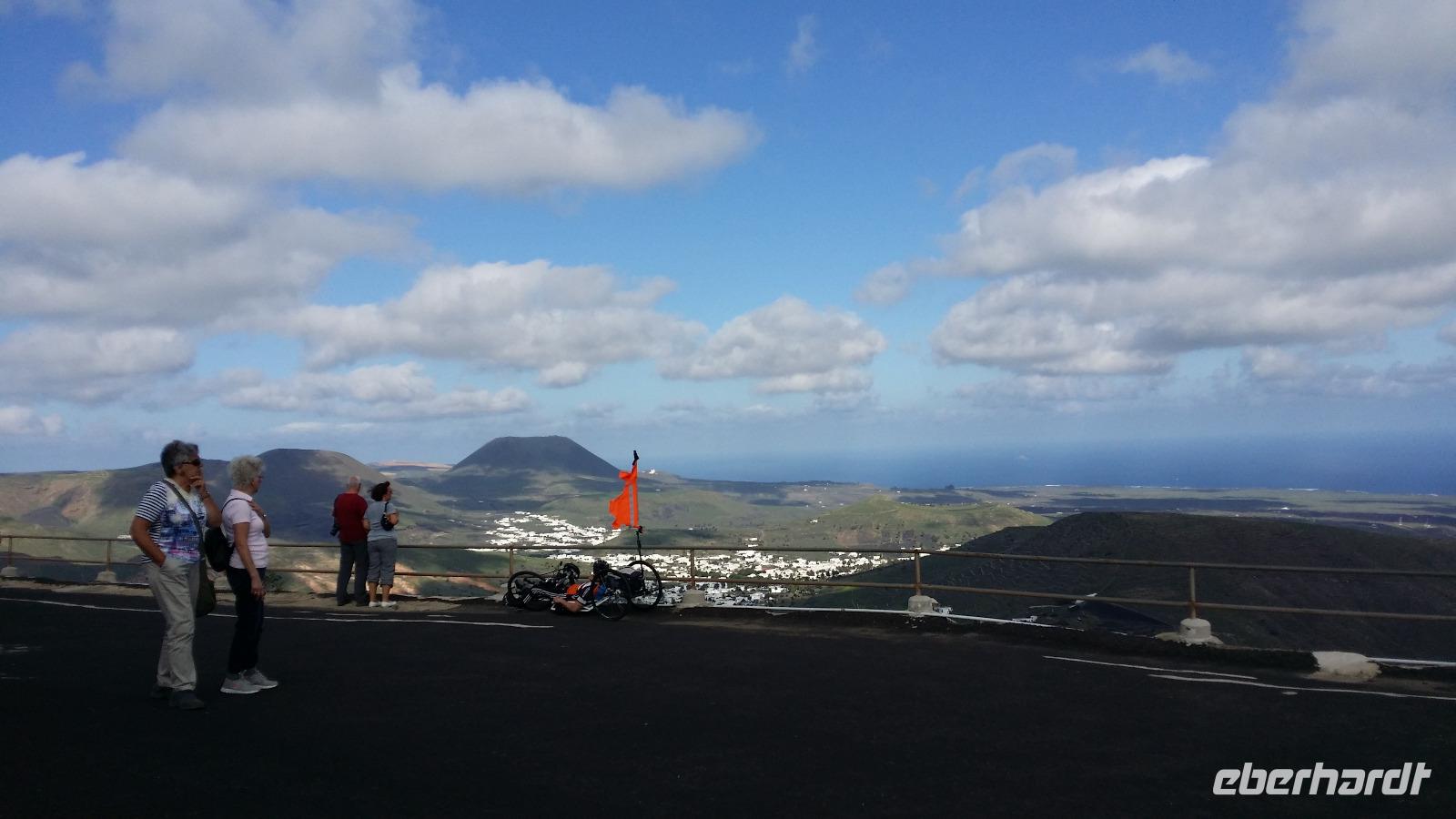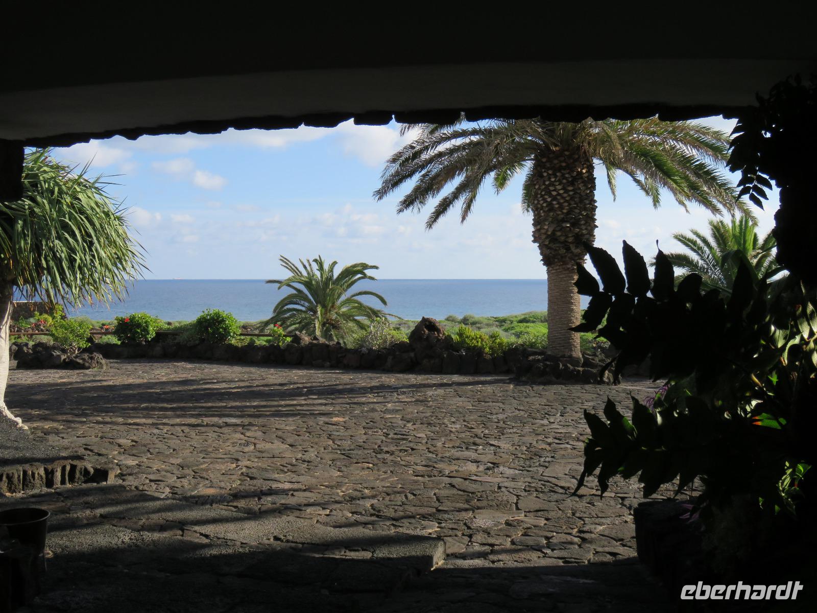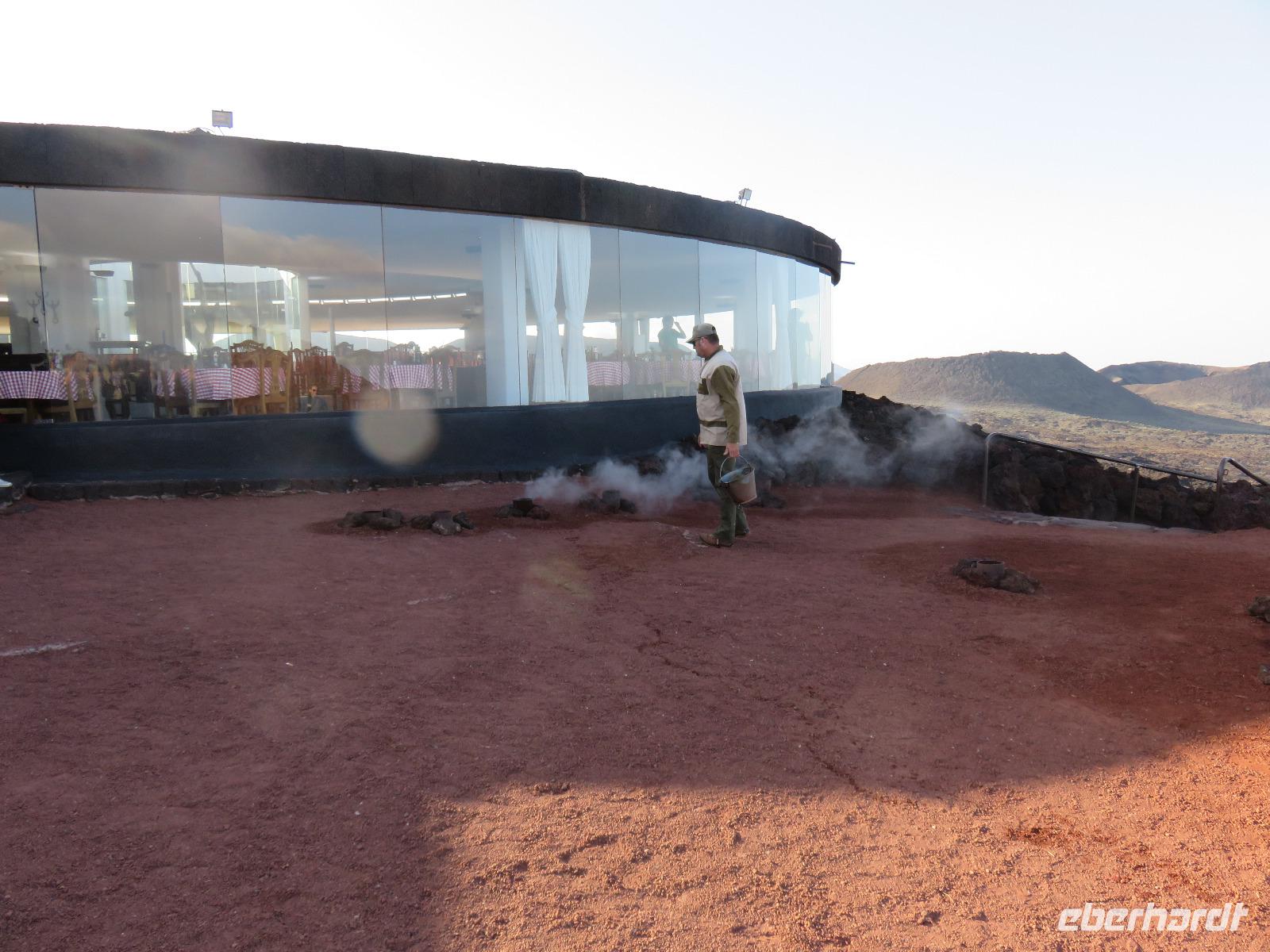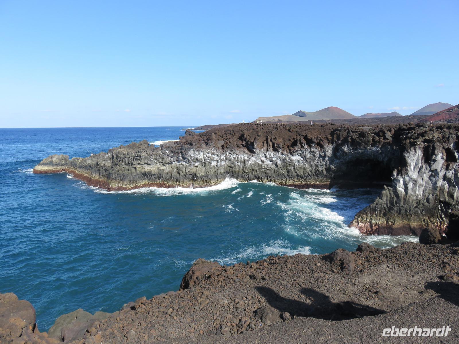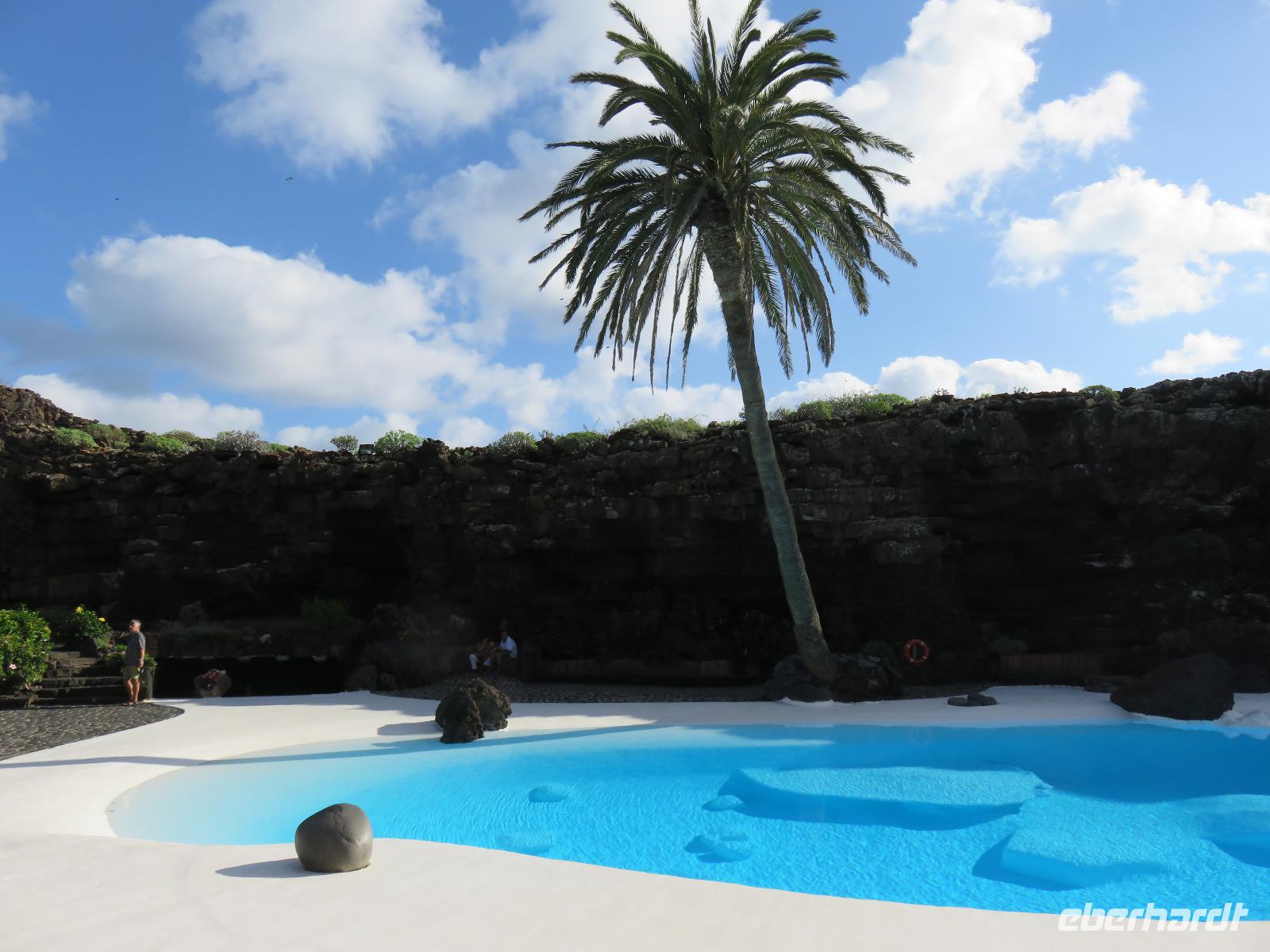zeigte uns das typische der Insel: schwarzer, brauner, beiger und roter Vulkanboden, zerklüftete Krater, grüne Palmen, weiße Häuser und die einzigartigen Kunstwerke des Künstlers César Manrique. Zuerst fuhren wir in den Timanfaya-Nationalpark. Im Besucherzentrum bestaunten wir die Demonstrationen der Erdaktivitäten: in 20 Zentimetern Tiefe befindet sich bereits heiße Vulkanerde, in einem Erdloch wurden trockene Zweige zum Brennen gebracht und schließlich wurde mittels Wasser eine Dampffontäne, ein kleiner Geysire, erzeugt. Am Erdwärme-Grill konnten Kartoffeln gegart werden. Ganz langsam, fast zaghaft legten wir unsere Hände an der Seite zum Fühlen hin: Es war richtig heiß und nicht nur lau warm. Nach etwas Freizeit fuhren wir mit dem Bus durch das beeindruckende Lavafeld, vorbei an weiteren Vulkanen, an unterschiedlichen Formationen erkalteter Lava ... ein Spiel der Farben und Formen. Dabei lauschten wir einem Vortrag. Darin eingebettet der Bericht des Ortspfarrers vom letzten Ausbruch der Vulkane vor 300 Jahren. Es scheint als sei es eine leblose Fläche. In der Nacht soll sich viel Kleingetier diese bizarre Landschaft erobern. Das können wir nicht überprüfen. Aber die Moose und Flechten, hier und da die entstehende Krautschicht und kleine Sträucher sind zu sehen. Da es in den letzten beiden Wochen geregnet hat, tragen die sonst kahlen Vulkanflanken einen grünen Flaum. Selbst Eva betonte, dass die im Moment fast grüne Insel untypisch ist. Obwohl ich zum vierten Mal hier weilen durfte, war es auch für mich ein völlig neuer Anblick. Am Rand des Nationalparks beobachteten wir die Kamelreiter, die hoch zu Kamel diese Welt aus Asche und Stein erkundeten. Am Atlantik beobachteten wir, wie sich die Brandung an den schwarzen Felsen bricht, wie sich im Lavagestein Grotten gebildet haben und sich hier in Los Hervideros, am Hexenkessel, eine zerklüftete Küste präsentiert. Nach dem Mittagessen in Yaiza, einem schmucken Dorf mit weißen Häusern und vielen Gärten, fuhren wir schließlich in das Weinanbaugebiet von La Geria. Hier werden die Trauben im traditionellen Trockenanbau gezüchtet: eine sicher mühsame Art und Weise auf dem fruchtbaren vulkanischen Boden. Uns zeigt sich ein faszinierendes Landschaftsbild. Nach einem kleine Schluck des typischen Muskateller bringt uns unser Fahrer vorbei am Bauerndenkmal zum Mirador de la Haria. Wir genießen den Blick ins Tal der Tausend Palmen und bis zum Meer. Abschließender Höhepunkt ist die Besichtigung eines der Meisterwerke von César Manrique: Die Höhlen Jameos del Aqua mit dem unterirdischen See, in dem winzige weiße Albinokrebse leben, die sonst nur in Meerestiefen von 3.000 Metern vorkommen. Natürlich erfreuen wir uns auch an den Pflanzen am blauweißen Pool und am Konzertsaal. Leider müssen wir nun am späten Nachmittag langsam an die Rückfahrt zum Schiffe denken. Wir hatten alles bei bestem Wetter und sommerlichen Temperaturen betrachtet. Weitere Kunstwerke von César Manrique, immer mit Bedacht und voller Rücksicht auf die Natur gestaltet, wie das Mirador del Rio an einer fast 500 Meter hohen Steilküste, der Jardín de Cactus oder sein Wohnhaus warten bei einem erneuten Aufenthalt auf Lanzarote auf unseren Besuch.