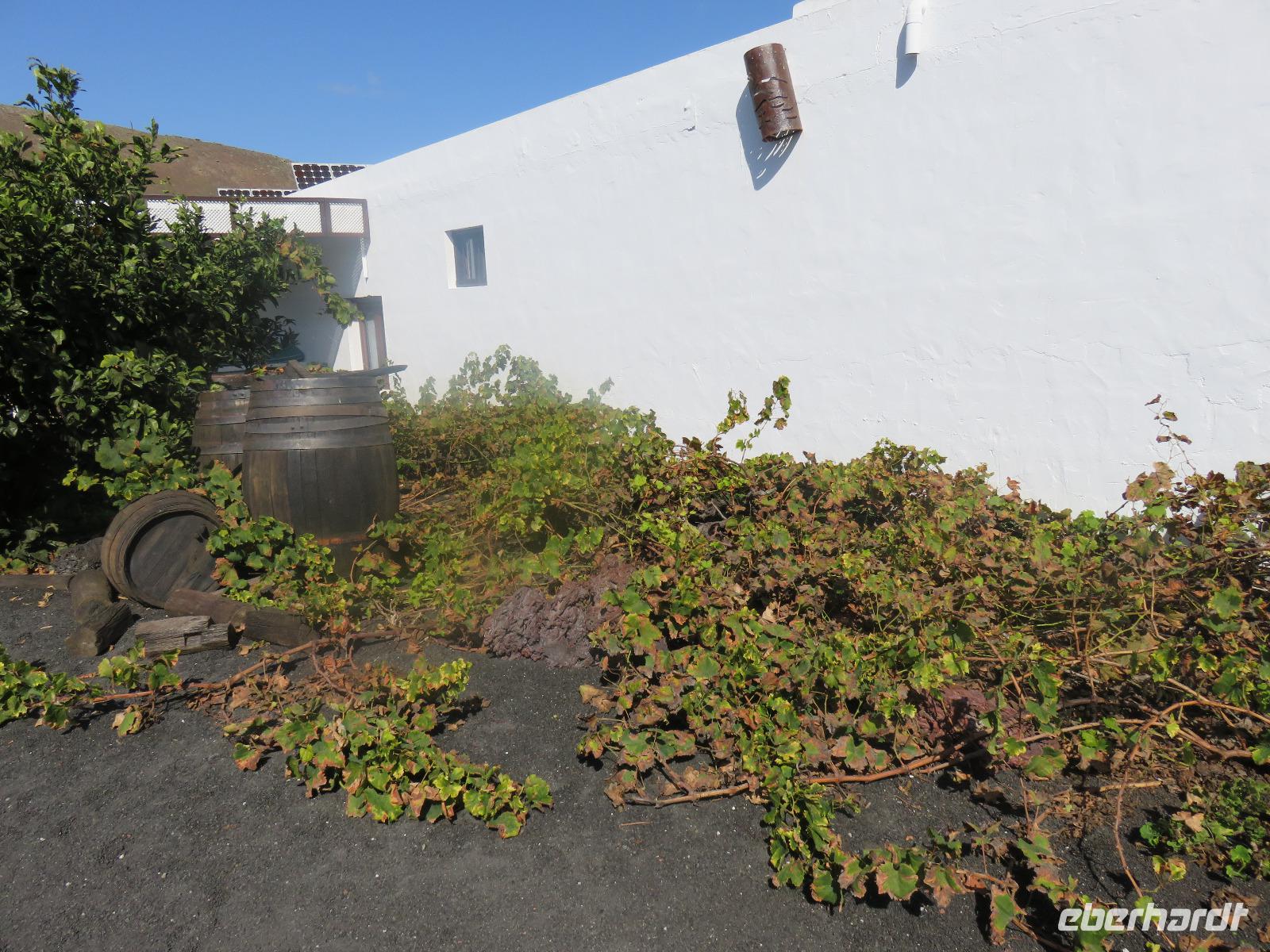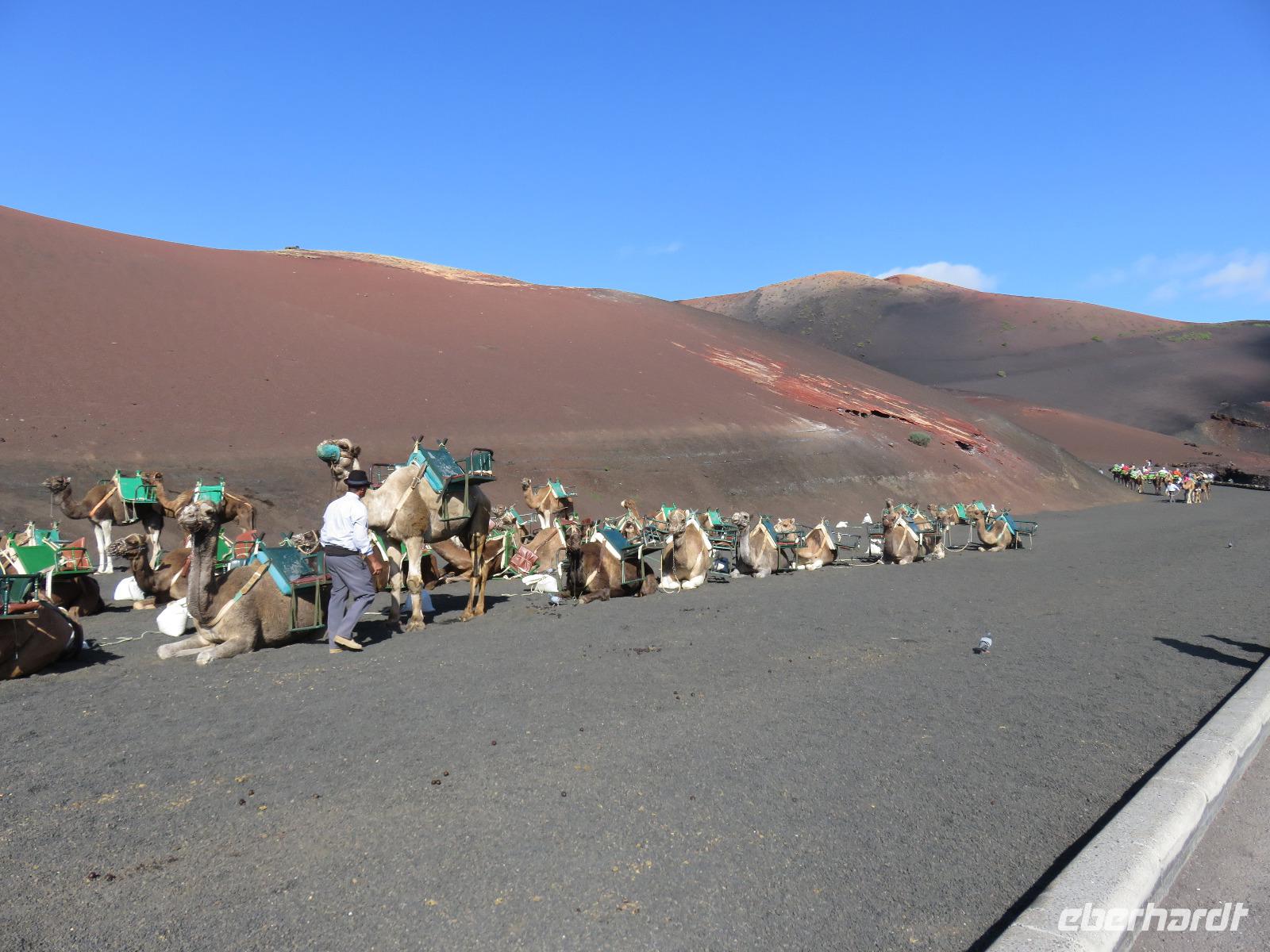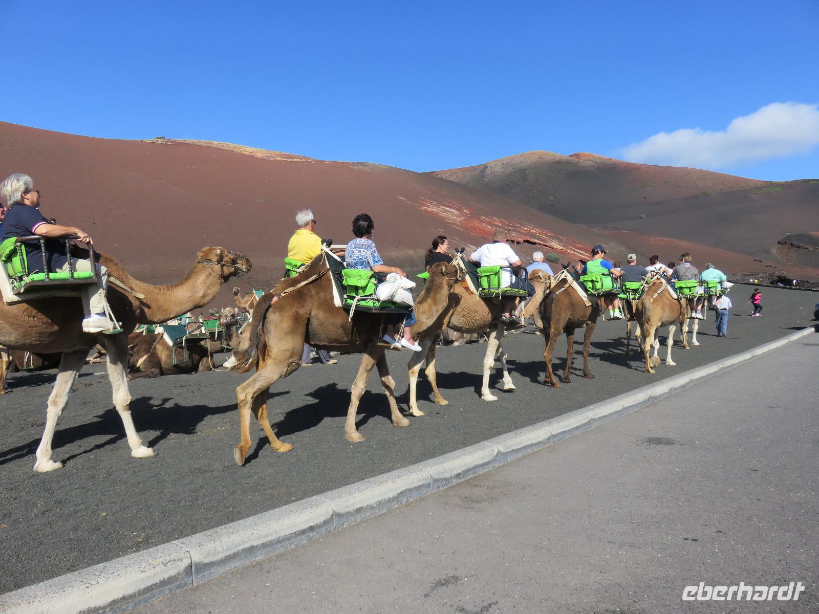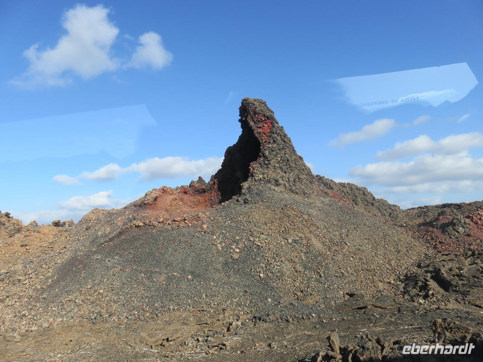 zeigte uns das typische der Insel: schwarzer, brauner, beiger und roter Vulkanboden, zerklüftete Krater, grüne Palmen, weiße Häuser und die einzigartigen Kunstwerke des Künstlers César Manrique. Zuerst fuhren wir in den Timanfaya-Nationalpark. Im Besucherzentrum bestaunten wir die Demonstrationen der Erdaktivitäten: in 20 Zentimetern Tiefe befindet sich bereits heiße Vulkanerde, in einem Erdloch wurden trockene Zweige zum Brennen gebracht und schließlich wurde mittels Wasser eine Dampffontäne, ein kleiner Geysire, erzeugt. Am Erdwärme-Grill konnten Kartoffeln gegart werden. Ganz langsam, fast zaghaft legten wir unsere Hände an der Seite zum Fühlen hin: Es war richtig heiß und nicht nur lau warm. Nach etwas Freizeit fuhren wir mit dem Bus durch das beeindruckende Lavafeld, vorbei an weiteren Vulkanen, an unterschiedlichen Formationen erkalteter Lava ... ein Spiel der Farben und Formen. Dabei lauschten wir einem Vortrag. Darin eingebettet der Bericht des Ortspfarrers vom letzten Ausbruch der Vulkane vor 300 Jahren. Es scheint als sei es eine leblose Fläche. In der Nacht soll sich viel Kleingetier diese bizarre Landschaft erobern. Das können wir nicht überprüfen. Aber die Moose und Flechten, hier und da die entstehende Krautschicht und kleine Sträucher sind zu sehen. Da es in den letzten beiden Wochen geregnet hat, tragen die sonst kahlen Vulkanflanken einen grünen Flaum. Selbst Eva betonte, dass die im Moment fast grüne Insel untypisch ist. Obwohl ich zum vierten Mal hier weilen durfte, war es auch für mich ein völlig neuer Anblick. Am Rand des Nationalparks beobachteten wir die Kamelreiter, die hoch zu Kamel diese Welt aus Asche und Stein erkundeten. Am Atlantik beobachteten wir, wie sich die Brandung an den schwarzen Felsen bricht, wie sich im Lavagestein Grotten gebildet haben und sich hier in Los Hervideros, am Hexenkessel, eine zerklüftete Küste präsentiert. Nach dem Mittagessen in Yaiza, einem schmucken Dorf mit weißen Häusern und vielen Gärten, fuhren wir schließlich in das Weinanbaugebiet von La Geria. Hier werden die Trauben im traditionellen Trockenanbau gezüchtet: eine sicher mühsame Art und Weise auf dem fruchtbaren vulkanischen Boden. Uns zeigt sich ein faszinierendes Landschaftsbild. Nach einem kleine Schluck des typischen Muskateller bringt uns unser Fahrer vorbei am Bauerndenkmal zum Mirador de la Haria. Wir genießen den Blick ins Tal der Tausend Palmen und bis zum Meer. Abschließender Höhepunkt ist die Besichtigung eines der Meisterwerke von César Manrique: Die Höhlen Jameos del Aqua mit dem unterirdischen See, in dem winzige weiße Albinokrebse leben, die sonst nur in Meerestiefen von 3.000 Metern vorkommen. Natürlich erfreuen wir uns auch an den Pflanzen am blauweißen Pool und am Konzertsaal. Leider müssen wir nun am späten Nachmittag langsam an die Rückfahrt zum Schiffe denken. Wir hatten alles bei bestem Wetter und sommerlichen Temperaturen betrachtet. Weitere Kunstwerke von César Manrique, immer mit Bedacht und voller Rücksicht auf die Natur gestaltet, wie das Mirador del Rio an einer fast 500 Meter hohen Steilküste, der Jardín de Cactus oder sein Wohnhaus warten bei einem erneuten Aufenthalt auf Lanzarote auf unseren Besuch.