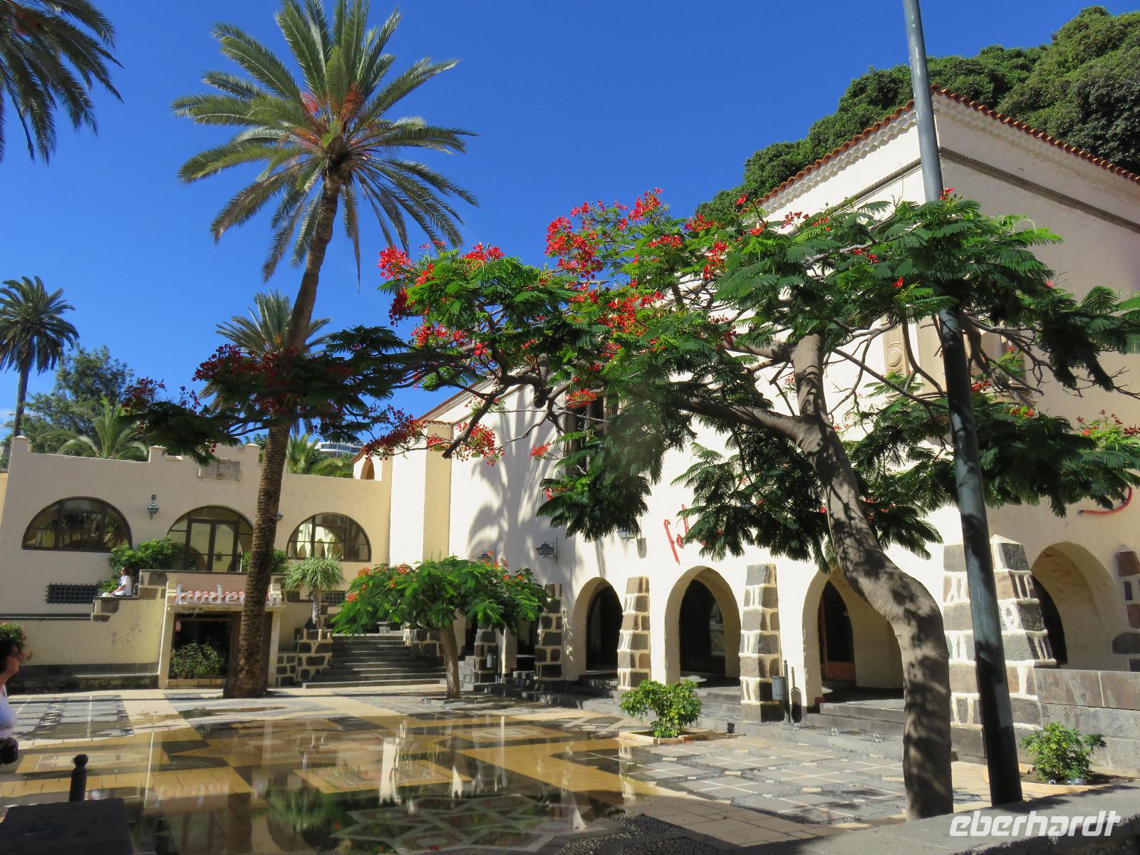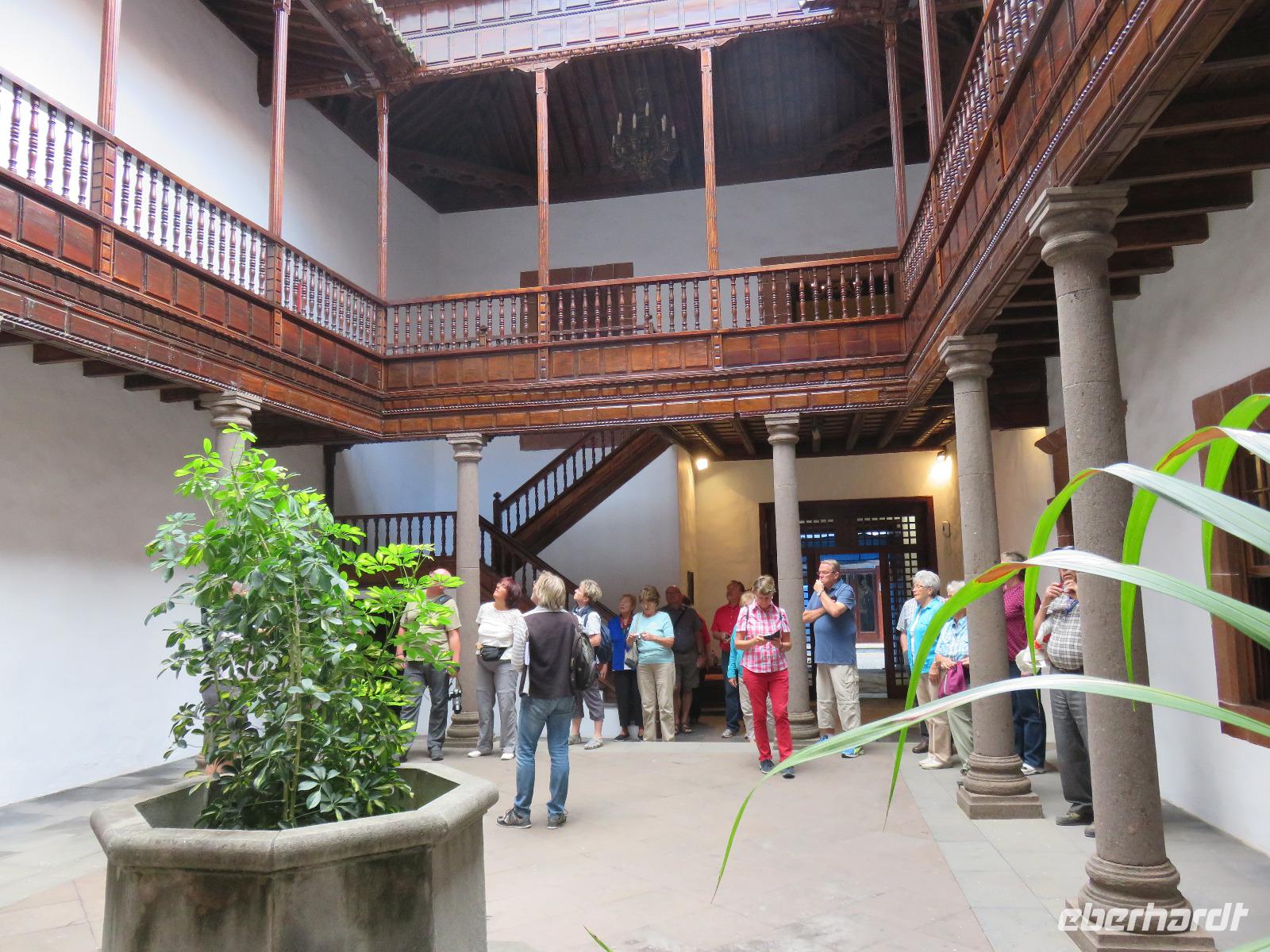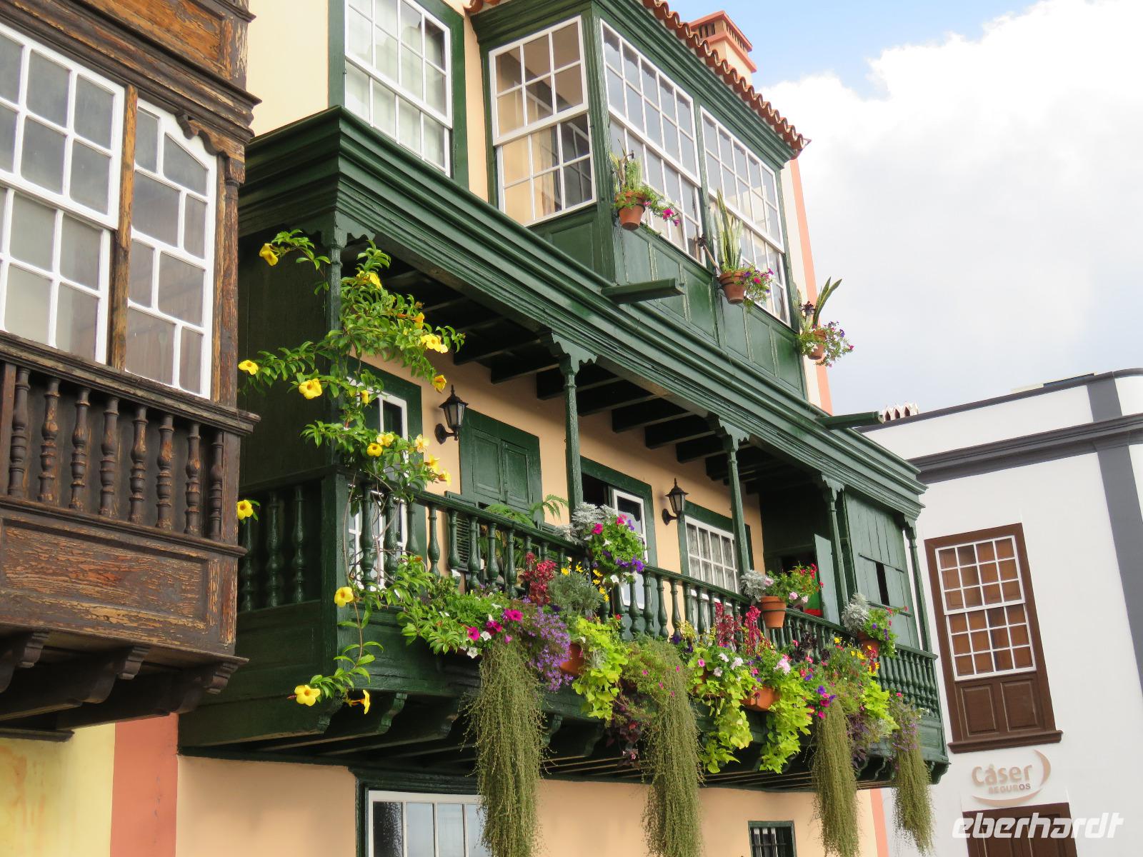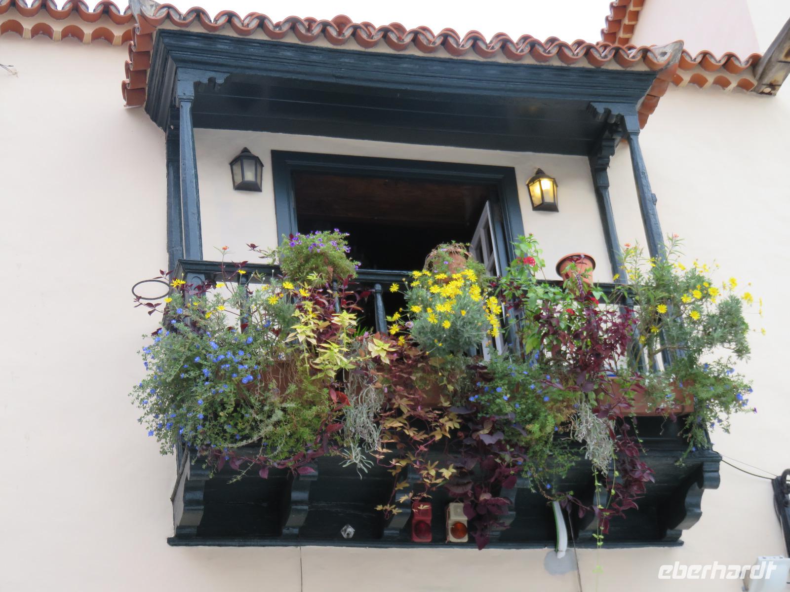 Pünktlich 7 Uhr ankerte die AIDAcara im Hafen von Santa Cruz de la Palma an. Wir trafen uns zu unserem fünften Eberhardt-Inklusiv-Ausflug. Mit Manfred Holst, unserem örtlichen Guide, und unserem Fahrer Sergio starteten wir zu unseren Besichtigungen. Nach kurzer Busfahrt spazierten wir in der schmucken Altstadt, bestaunten die Fassaden der Herrschaftshäuser mit den typischen Holzbalkonen, im kleinen Museum den Innenhof ... Im Rathaus am Plaza de Espana erfreuten wir uns an den Wandgemälden zur Geschichte der Insel und an den kunstvoll geschnitzten hölzernen Decken, den Mudejár - eine Mischung aus maurischen Mustern und christlichen Symbolen. Auch konnten wir einen Blick in den Sitzungssaal werfen. Noch ein kurzer Spaziergang durch die Markthalle mit ihren bunten Ständen und entlang der Avenue de la Maritima. Unsere Blicke galten immer wieder den äußerst geschmackvoll arrangierten Blumenbalkons.