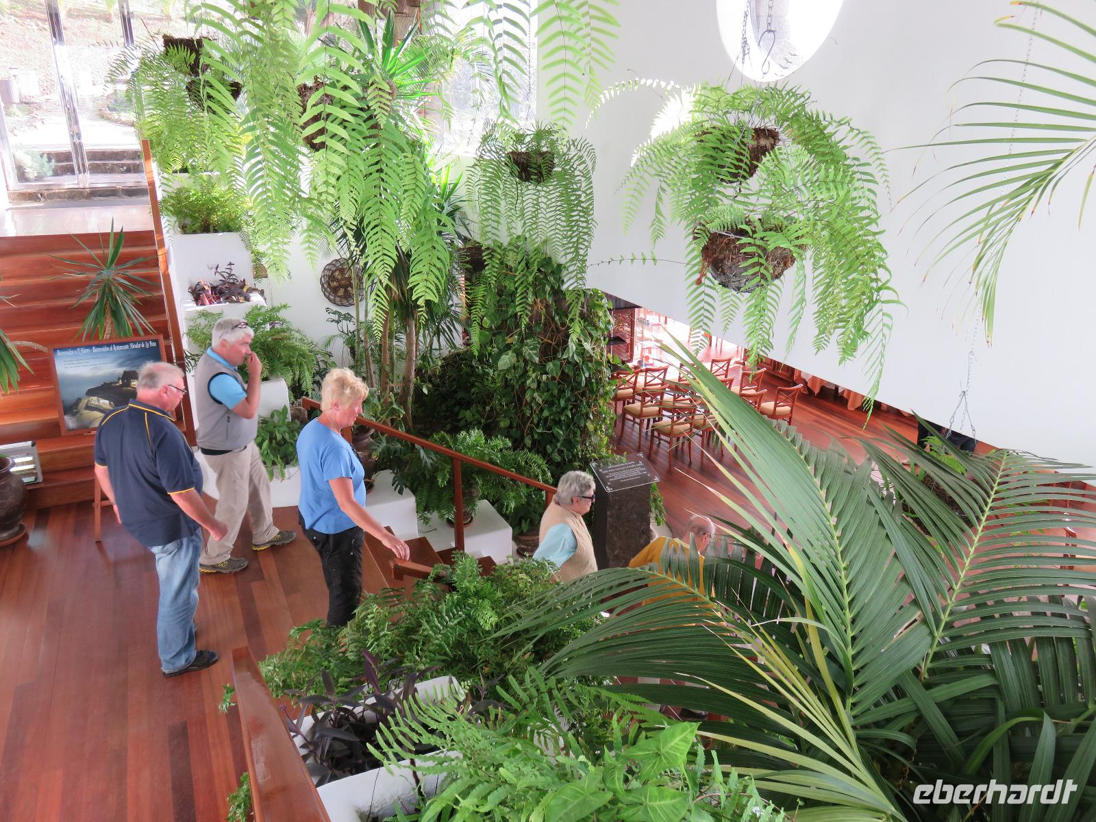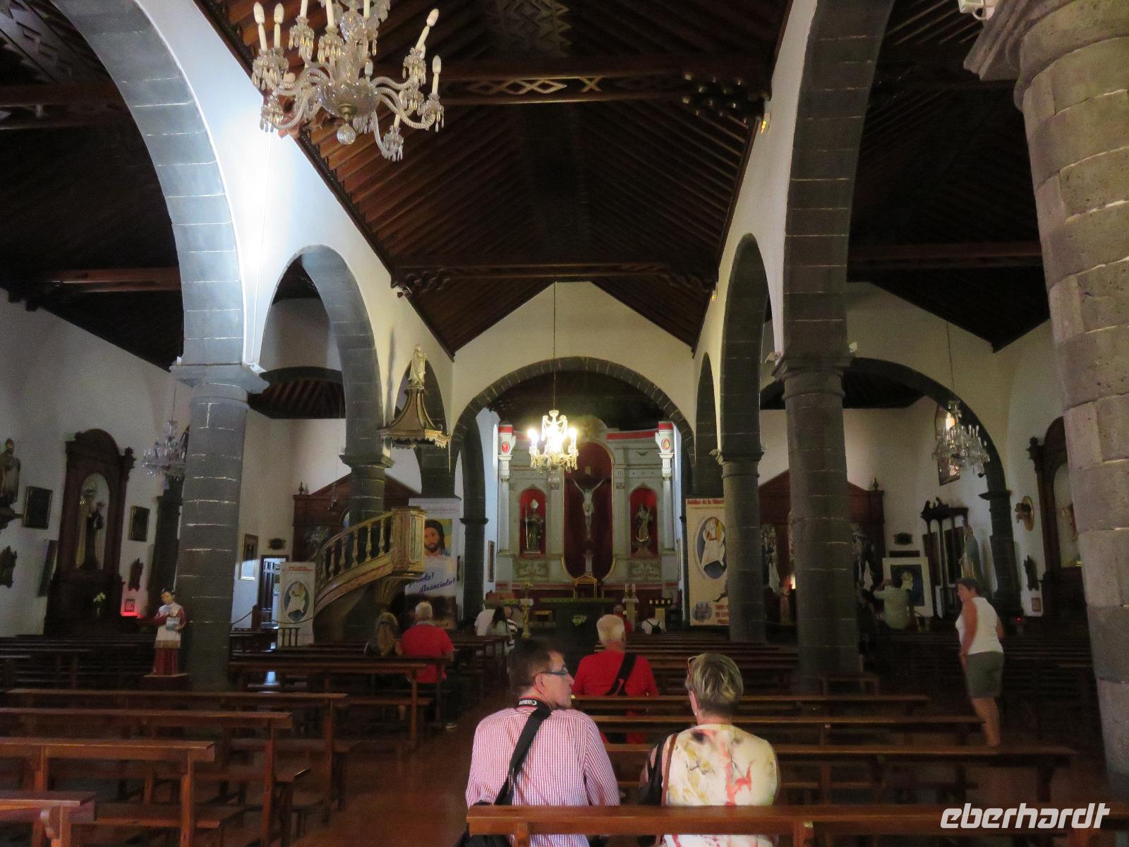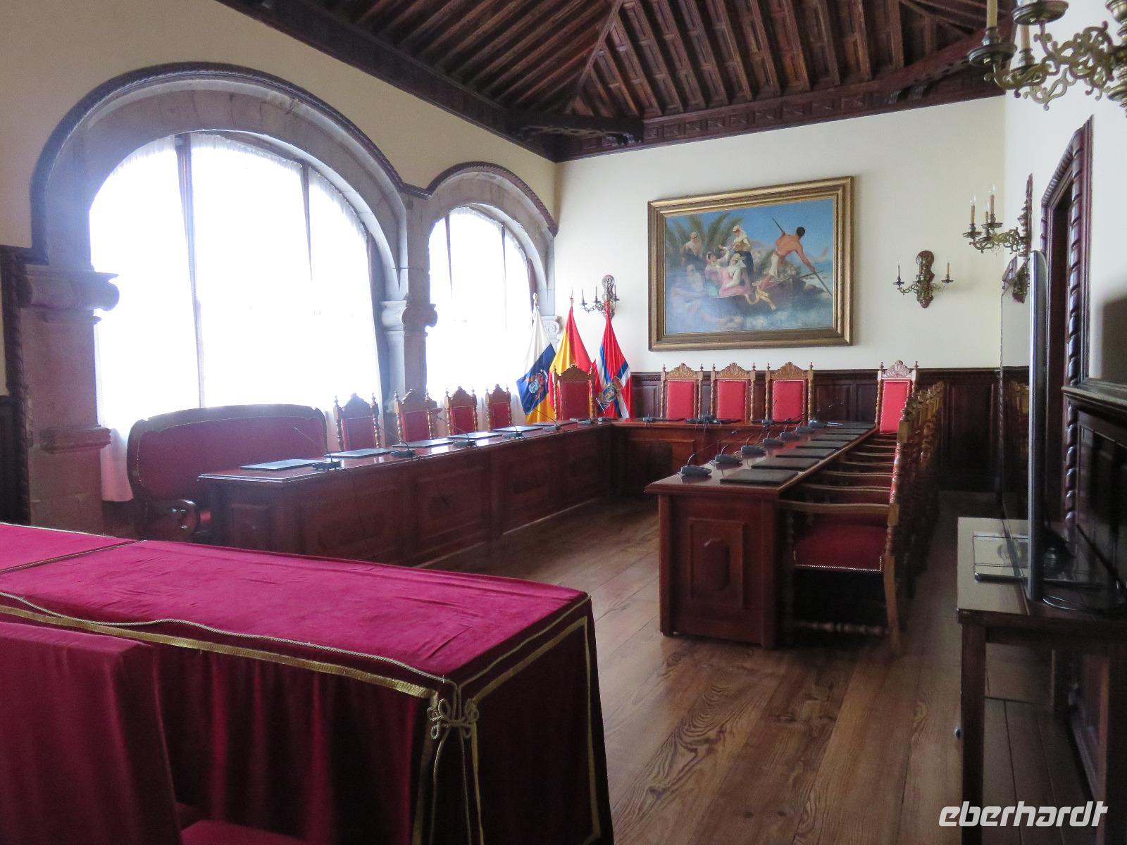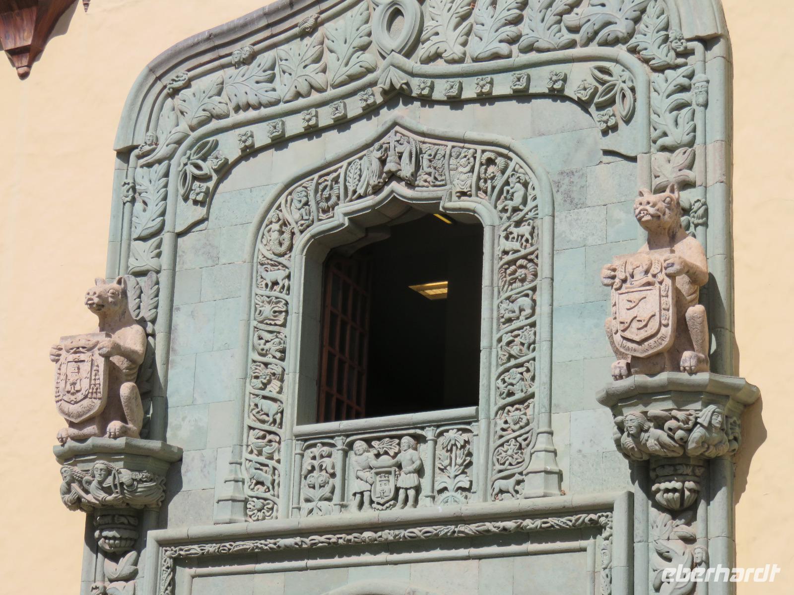 Pünktlich 7 Uhr ankerte die AIDAcara im Hafen von Santa Cruz de la Palma an. Wir trafen uns zu unserem fünften Eberhardt-Inklusiv-Ausflug. Mit Manfred Holst, unserem örtlichen Guide, und unserem Fahrer Sergio starteten wir zu unseren Besichtigungen. Nach kurzer Busfahrt spazierten wir in der schmucken Altstadt, bestaunten die Fassaden der Herrschaftshäuser mit den typischen Holzbalkonen, im kleinen Museum den Innenhof ... Im Rathaus am Plaza de Espana erfreuten wir uns an den Wandgemälden zur Geschichte der Insel und an den kunstvoll geschnitzten hölzernen Decken, den Mudejár - eine Mischung aus maurischen Mustern und christlichen Symbolen. Auch konnten wir einen Blick in den Sitzungssaal werfen. Noch ein kurzer Spaziergang durch die Markthalle mit ihren bunten Ständen und entlang der Avenue de la Maritima. Unsere Blicke galten immer wieder den äußerst geschmackvoll arrangierten Blumenbalkons.