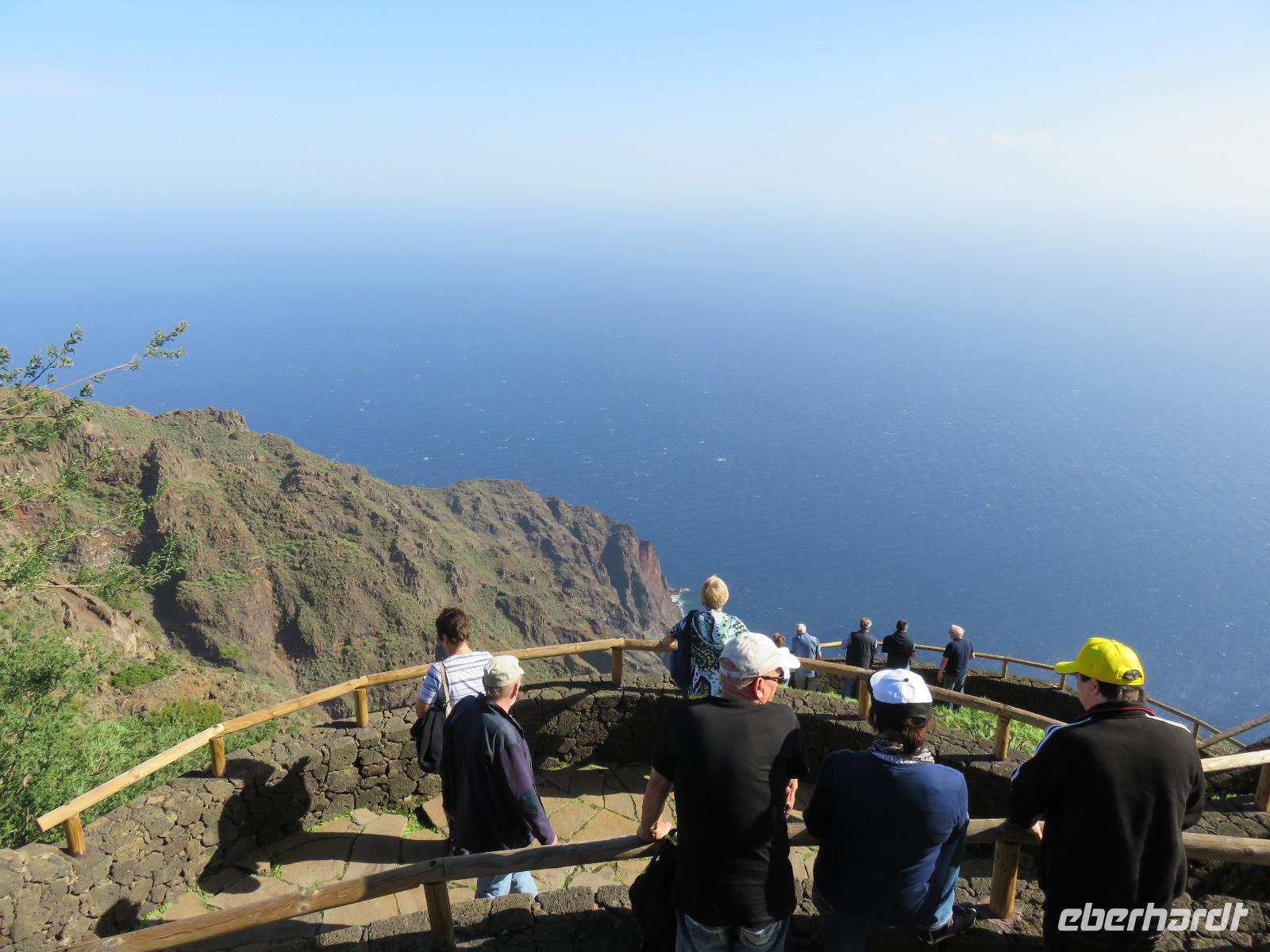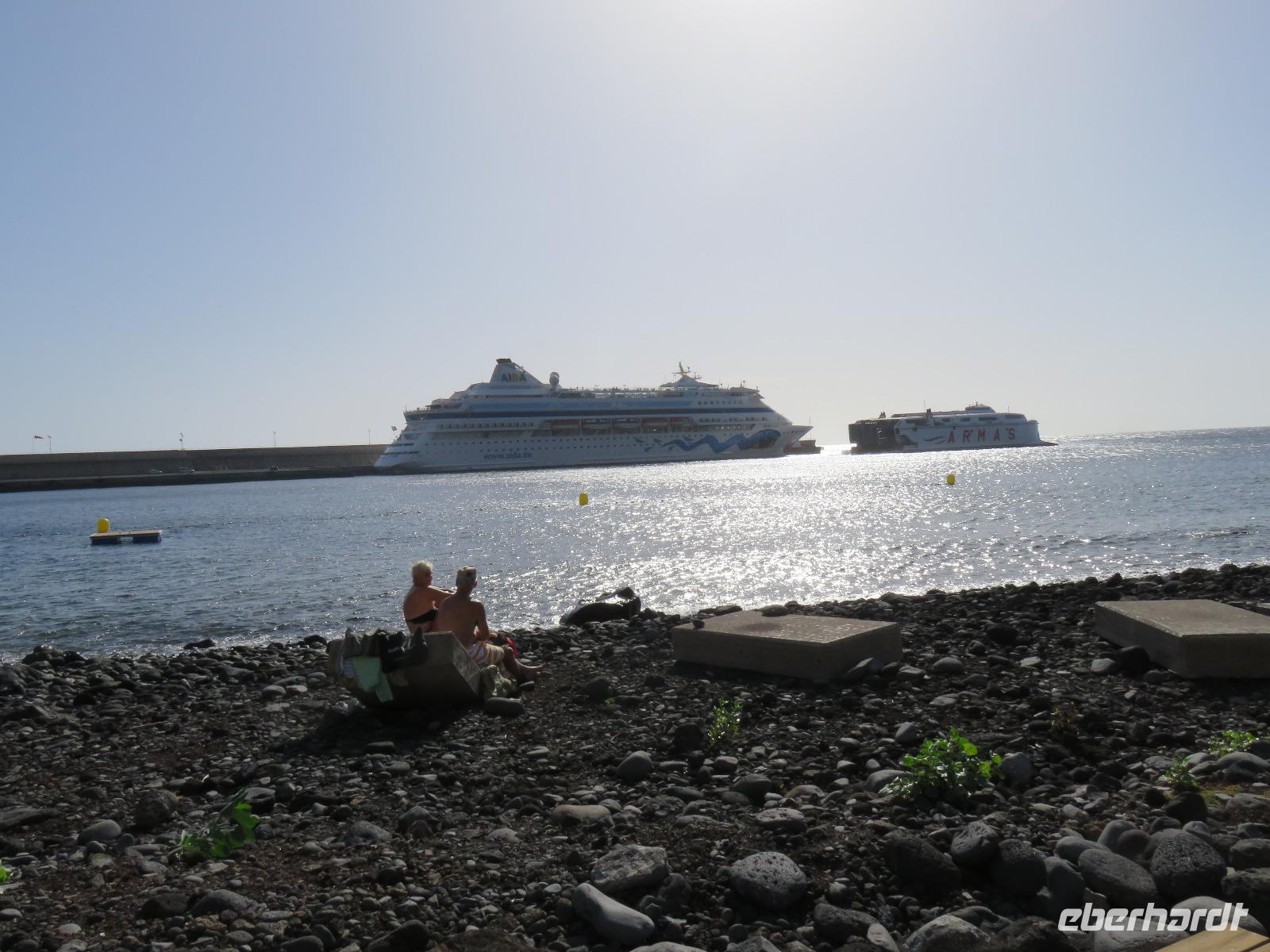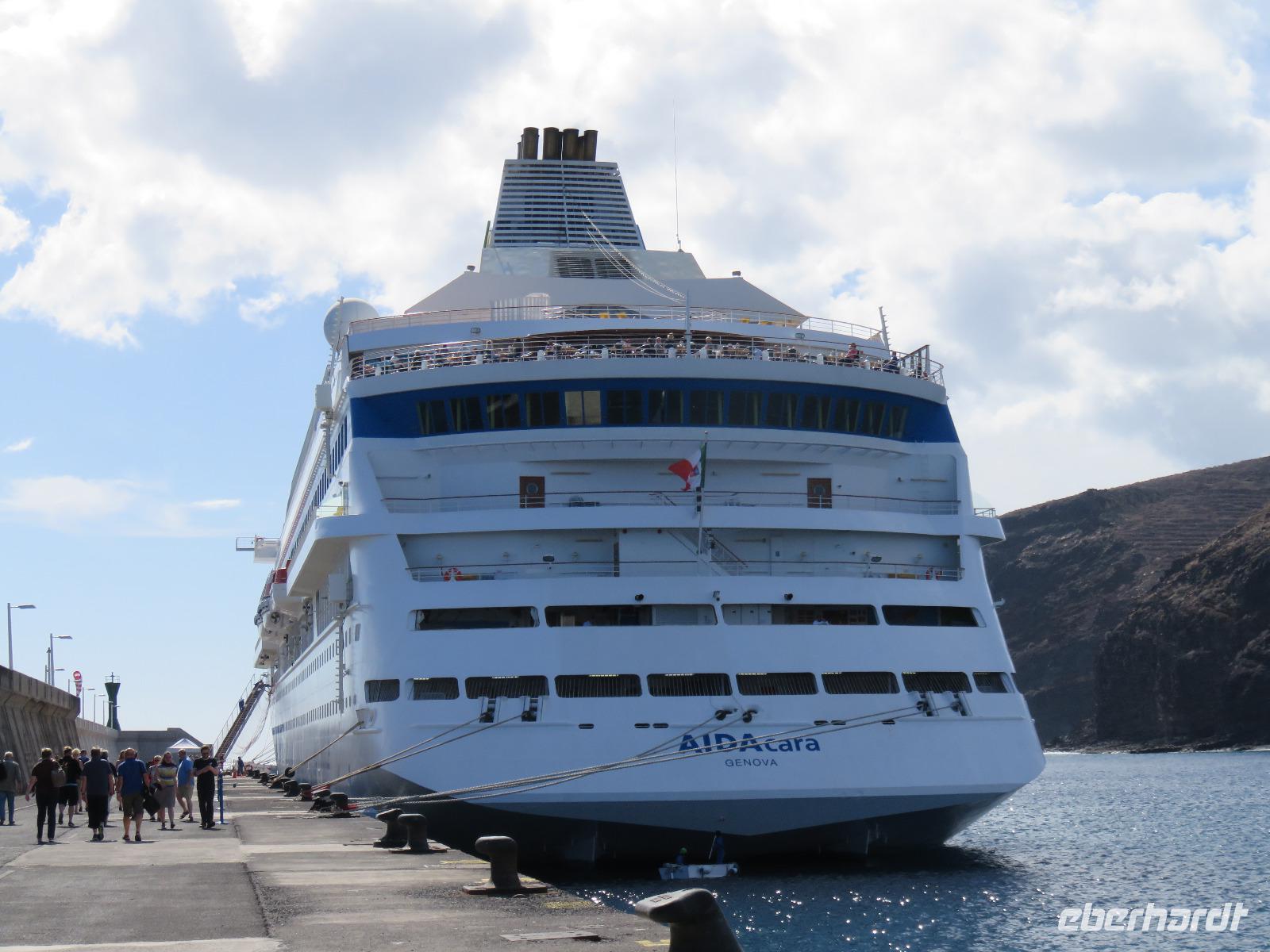 Heute erreichten wir mit der Insel El Hierro den westlichsten Punkt unserer Kreuzfahrt. Bis zur Entdeckung Amerikas durch Kolumbus galt sie als das westlichste Ende der Welt, weshalb dort im Jahr 150 der Astronom Claudius Ptolemäus den ersten Meridian Null festlegte. Deshalb trägt die Insel auch den Beinamen Meridianinsel. Überall war zu lesen, dass das Eiland ein Geheimtipp für Naturliebhaber sei. Der kleine Hafen schmuck mit neuer Pier, dahinter ragen kahle, dunkle, steile Vulkanberge auf. Der erste Blick trügt gewaltig. Auf unterschiedlichen AIDA-Ausflügen lernen wir Landschaften voller Gegensätze kennen: kleine verträumte Orte, fantastische Ausblicke an steilen Buchten, saftig-grüne Weiden im Hochland, Wälder mit Kiefern und Buchen, Vulkankrater ... und dann die Miradors, die Aussichtspunkte. Vom Mirador Isora überblickten wir die ganze Bucht von Las Playas, die eigentlich ein eingebrochener Vulkankrater ist. Davon zeugen die steilen, fast senkrecht abfallenden Felswände. Am Mirador Jinama eröffnete sich für alle Gäste der Vormittagstour der Panoramablick in das bis zu 1.200 Meter tiefe Golfo-Tal. Am Nachmittag war uns dies verwehrt. Die Passatwolken stauten sich ganz dicht. Wir standen über, neben und vor den Wolkenbergen, die immer in Bewegung waren - eine Faszination, dieses Spiel der Natur zu bestaunen. Die Szenerie war in strahlendes Sonnenlicht getaucht. Nach einer kurzen Busfahrt erreichten wir das berühmteste Aussichtsplateau, das Mirador de La Pena, gestaltet vom bekannten Künstler César Manrique. Wie immer ist alles wunderbar in die Natur eingepasst - ein Meisterwerk der Architektur und des Gartenbaus. Von hier blickten wir ca. 1.000 Meter tief in das Golfo-Tal. Vom Mirador de La Pernades blickten wir schließlich auf den kleinen Flughafen der Insel. Unser örtlicher Gästeführer Karsten berichtete über das Leben auf der Insel, die Flora und Fauna, sein Bio-Haus, über die Gelbschnabelstummtaucher, über das Welt-Biosphärenreservat ... 2014 wurde die gesamte Energieversorgung der Insel umgestellt: Das Wasserkraftwerk Gorona del Viento wird zum größten Teil mit Windenergie betrieben. An guten Windtagen kann sich bereits heute die gesamte Insel mit erneuerbarer Energie versorgen. Auch Solarenergie wird zunehmend genutzt. Einige Gäste nutzten auch die Möglichkeit zu einem Bad im Hafen. Direkt gegenüber der AIDAcara befindet sich ein Strand mit einer Badestelle. Das Wasser hatte eine wohlige Temperatur von 23,8 °C.