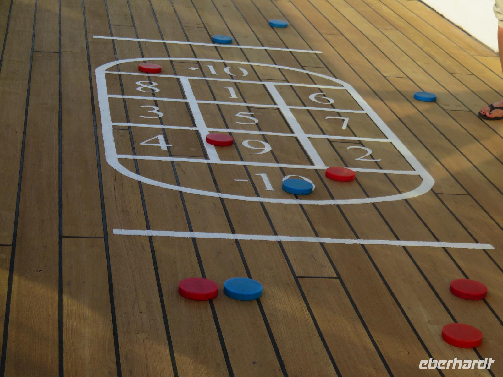 Nach einer etwas unruhigen Nacht schliefen wir etwas länger. Im Kleinen Markt Restaurant stellte ich für unsere Gruppe die Kreuzfahrt Östliches Mittelmeer mit AIDA vor. Anschließend nutzten wir die Möglichkeiten des äußerst breitgefächerten Bordprogramms. Und am Nachmittag trafen wir uns zu einer Runde Shuffleboard, einem der ältesten Spiele der Seefahrer. Wir hatten viel Spaß: Es traten die Männer gegen die Frauen an. Leider unterlagen wir Frauen. Am Anfang sehr gut hatten wir einfach vergessen, die hohen Punkte zu machen und mit mehreren -10 war im wahrsten Sinn des Wortes kein Blumentopf zu gewinnen. Oder war der starke Wind schuld? Schnell vereinbarten wir eine Revanche für den kommenden Tag. Der Tag klang mit der stimmungsvollen Show Songbook: Bryan Adams aus.