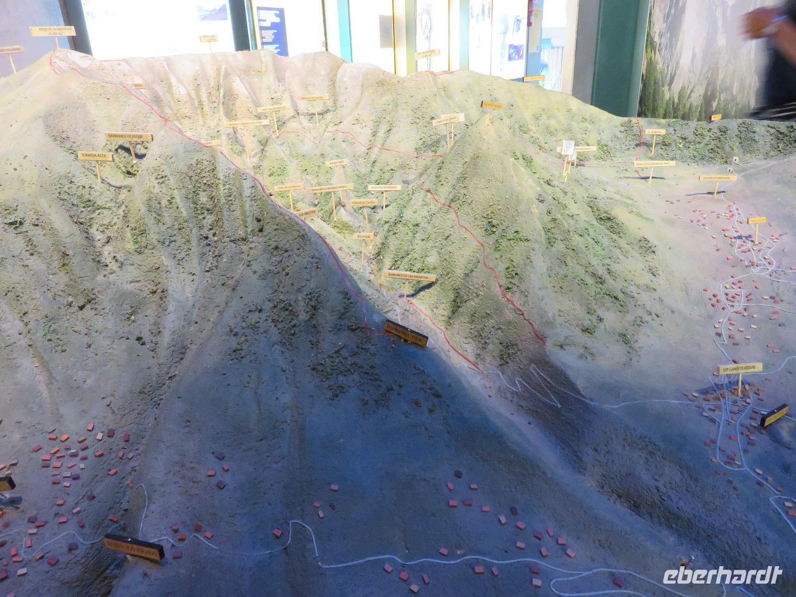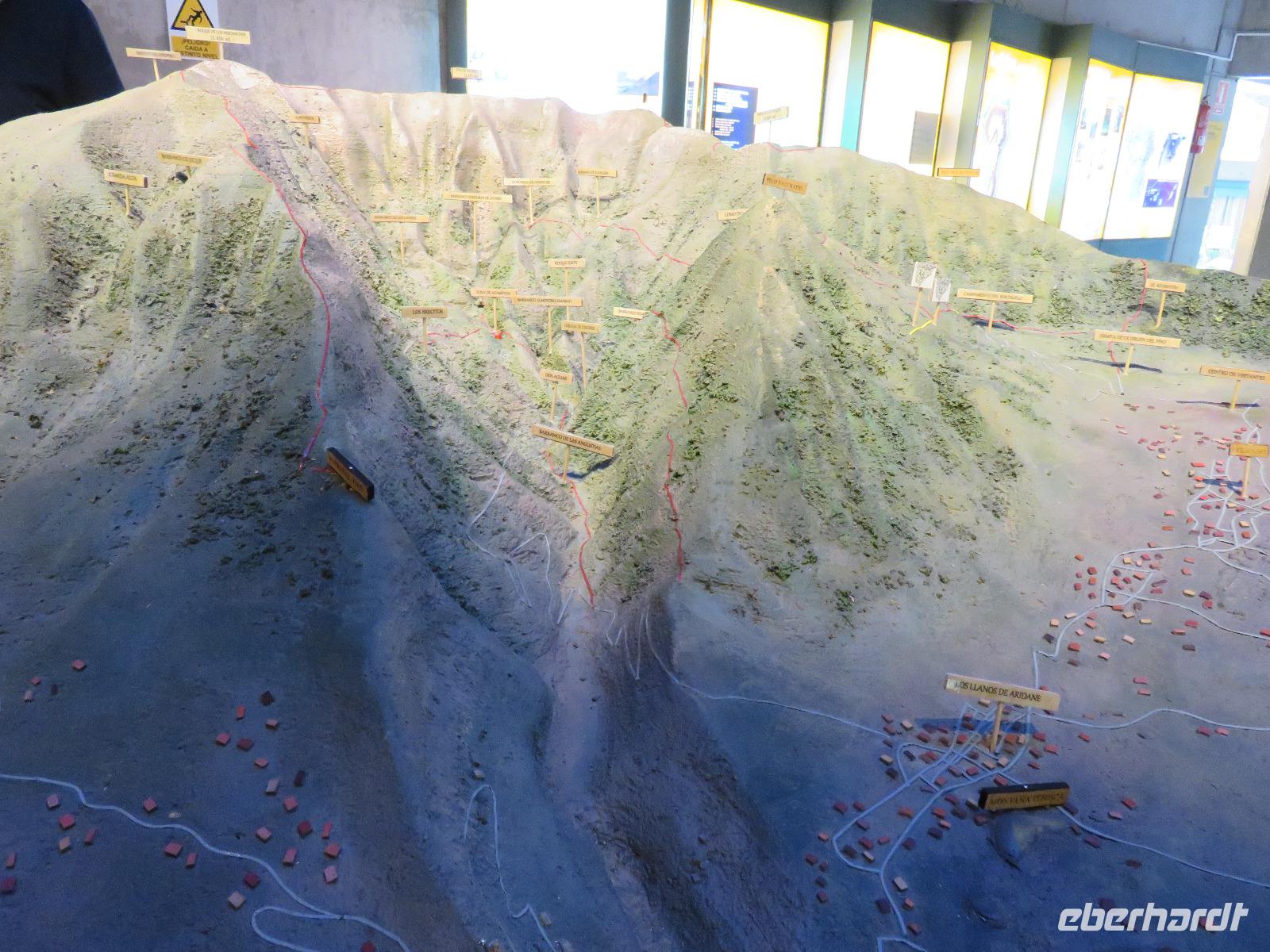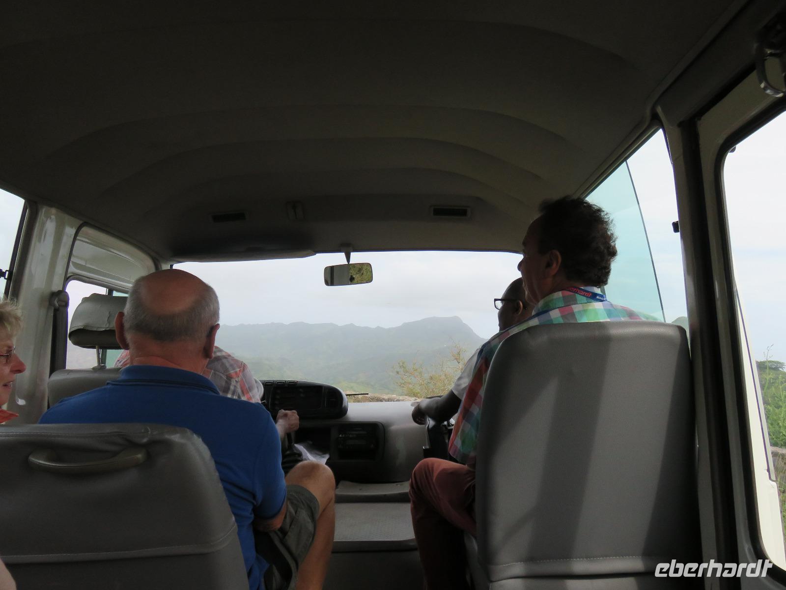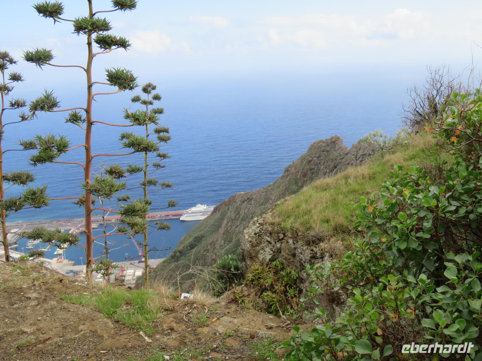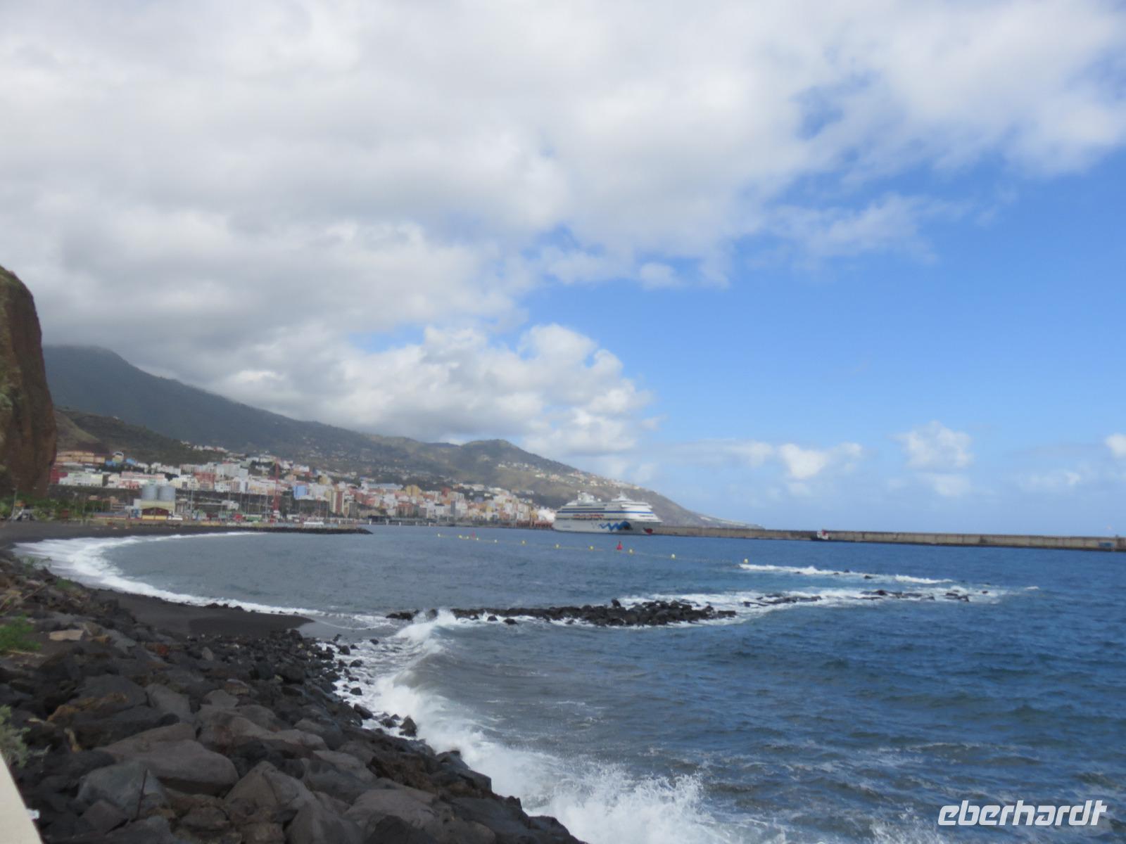 Danach fuhren wir vorbei am Nachbau der Santa Maria, dem berühmten Schiff von Kolumbus, hinauf zur kleinen Kirche der Jungfrau Maria zum Schnee. Wir besichtigten diese Wallfahrtskirche mit der Inselheiligen. Manfred erzählte die Legende der Maria zum Schnee und ihre Verehrung mit einem großen Fest aller fünf Jahre. Das nächste wird 2020 sein. Das Wetter blieb uns gewogen. Aber was war das? Auf unserer Weiterfahrt zur Caldera de Taburiente stauten sich die Wolken an den Gipfeln der Cumbre Nueva. Sollten wir kein Glück haben bei unserem Besuch im Vulkankrater? Ich vertraute darauf, dass sich hinter diesem Bergmassiv, einer Wetterscheide, uns sonniges Wetter mit guter Sicht erwartet. Am Ende des einen Kilometer langen Tunnels zeigte sich ein nahezu wolkenloser, blauer Himmel. Wow, was hatten wir für ein Reiseglück, besser konnte es nicht sein! Zuerst besichtigten wir im Besucherzentrum des Nationalparks das große Modell der Insel La Palma. Manfred zeigte die unterschiedlichen Regionen der Insel: den großen Graben, die Caldera de Taburiente, einzelne Vulkankrater, den höchsten Berg der Insel, den Roque de los Muchachos (2.426 Meter), die Stadt Tazacorte, von wo einst die Spanier das Eiland eroberten ... Auch blieb etwas Zeit zu einem Bummel im Botanischen Garten des Zentrums. Faszinierend war der Blick hinauf zu den Wolken, die in dichten Schwaden über die Gipfel der Cumbre in die Hochebene hineinschwebten. Nun mussten wir uns sputen, um in unserem Zeitfenster in den Nationalpark einzufahren. Sergio brachte uns bis zum Parkplatz La Cumbrecita (1.287 Meter). Wir spazierten auf einem Forstweg am Rand der Caldera, die mit dem Durchmesser von ca. zehn Kilometern eine der größten der Welt ist. Die Passatwolken waren bereits aus dem Inneren aufgestiegen und so hatten wir einen freien Blick hinein in Krater, zur kleinen Alm, hinüber zum Roque de los Muchachos, zu den Observatoren und Sternwarten. Nach dem südlichsten und dem höchsten Punkt, stießen wir mit einem Feigenlikör nun auf einen der schönsten Punkte unserer Reise an. Wir spazierten durch den Kiefernwald und bestaunen das Öko-System der Kanarischen Kiefern. Nach diesem Naturerlebnis traten wir die Rückfahrt nach Santa Cruz an. Aber halt, einen Panorama-Stopp mussten wir noch einlegen. Vom Kraterrand des Buenavista blickten wir auf die Inselhauptstadt hinab. Zurück am Schiff gestaltete jeder den weiteren Tag für sich. Entlang der Blauen Linie ist die Altstadt schnell zu Fuß zu erreichen. Am Abend erfreuten wir uns an der Poolshow Schlagergranaten. Leider blies den AIDA-Stars heute eine steife Brise entgegen. Schade. Unser Schiff nahm den Kurs nach Osten.