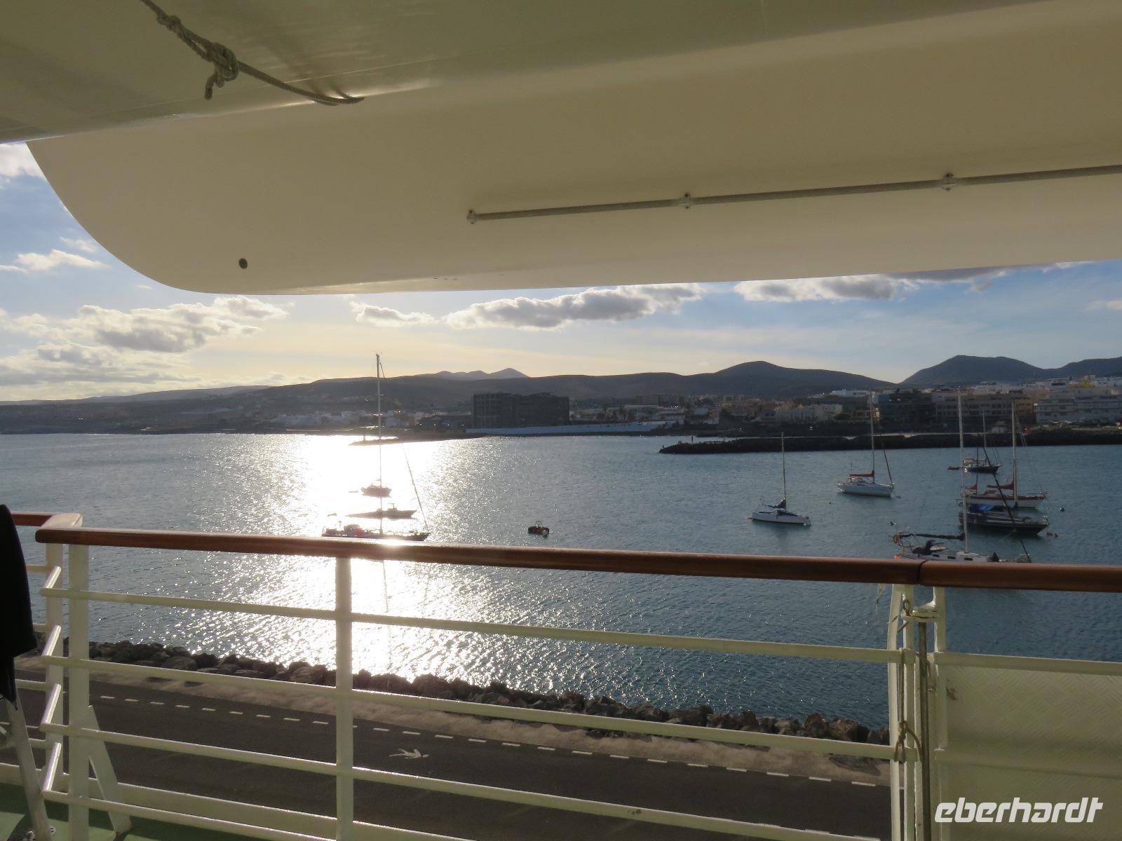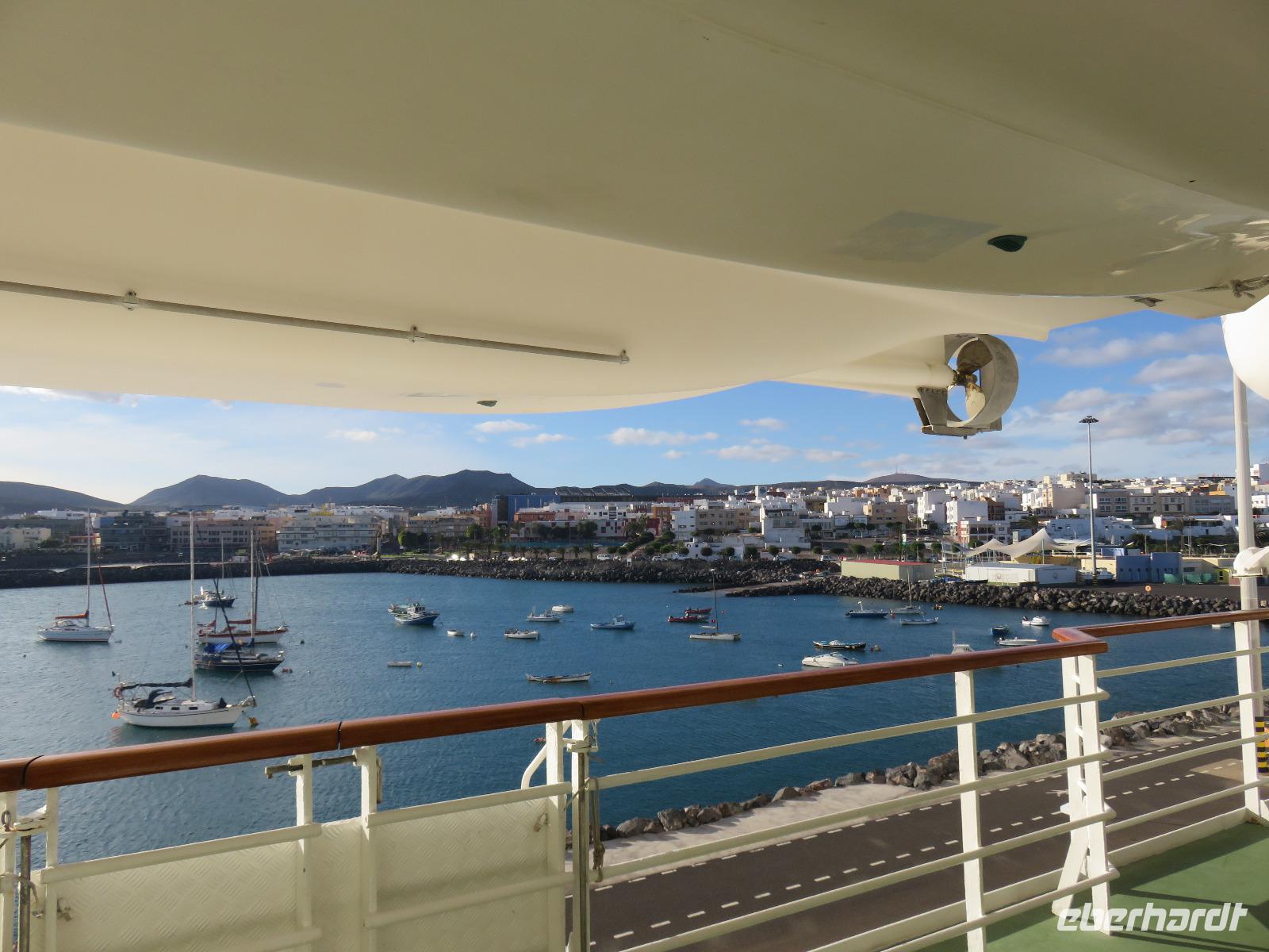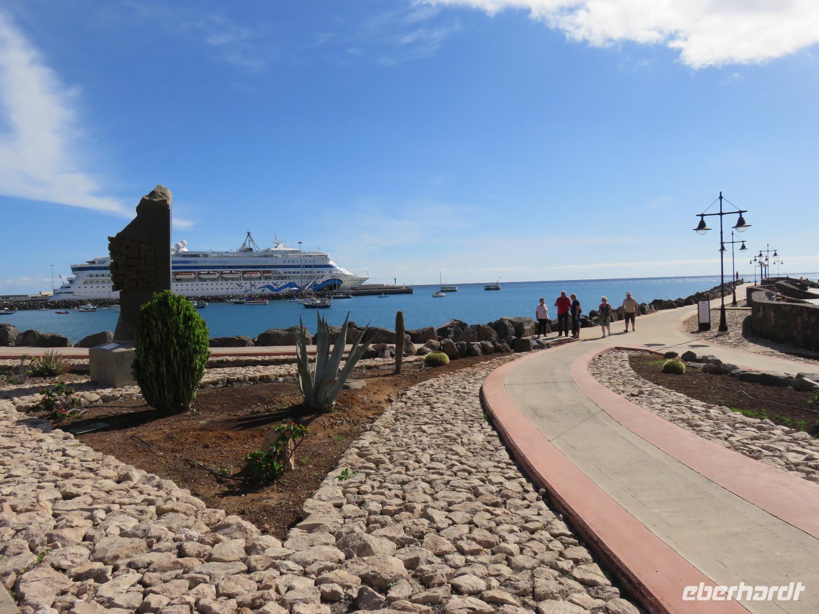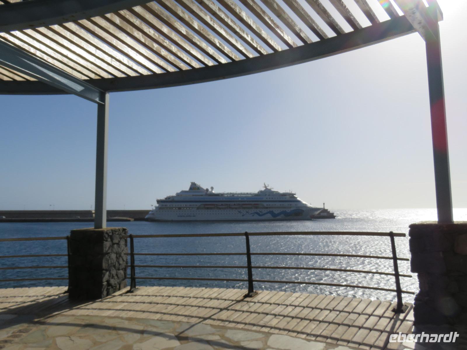 Eigentlich sollten wir die Hauptstadt der Feuerinsel erst gegen 16 Uhr erreichen. Aber unser Kapitän hatte entschieden, mit größerer Geschwindigkeit zu kreuzen. So erreichten wir bereits 10 Uhr Lanzarote. Es dauerte etwas bis das Schiff durch die Behörden zum Landgang freigegeben wurde. Deshalb entschlossen wir uns, den dritten Vortrag unseres Lektors Jörg. J. Reiche zu besuchen. Er stellte die östlichen Inseln der Kanaren vor: La Gomera, Lanzarote und Fuerteventura. Er löste auch das Wolkenspiel auf, das wir an den letzten Tagen beobachten konnten. Die Passatwolken sind in der Höhe von 600 bis 1.600 Metern zu finden. Daher die Sonne am Teide auf Teneriffa und die über die Cumbre wallenden Wolken auf La Palma. Nach dem Mittagessen nutzten die meisten Gäste unter uns den Shuttle vom Schiff in die Altstadt von Arrecife. Diese präsentierte sich klein und fein. Am Stadthafen bestaunten wir die schmucken Häuser in dem für die Küste typischen weiß-blauen Stil. In der Fußgängerzone buhlten die Geschäfte namhafter Hersteller um unsere Gunst. Zurück führte der Weg entlang der schmucken Uferpromenade. Wir nahmen nicht den direkten Weg. Das Castello de San Gabriel mit dem Historischen Museum lockte unsere Schritte hinüber zur kleinen Insel. Vorbei an der Regionalverwaltung und einem Botanischen Garten spazierten wir zurück zur Touristinformation. Eigentlich wollte ich für unsere Gruppe Material zur Insel und zur Stadt besorgen. Aber leider dauerte die Siesta noch an. Also zurück zur AIDAcara.