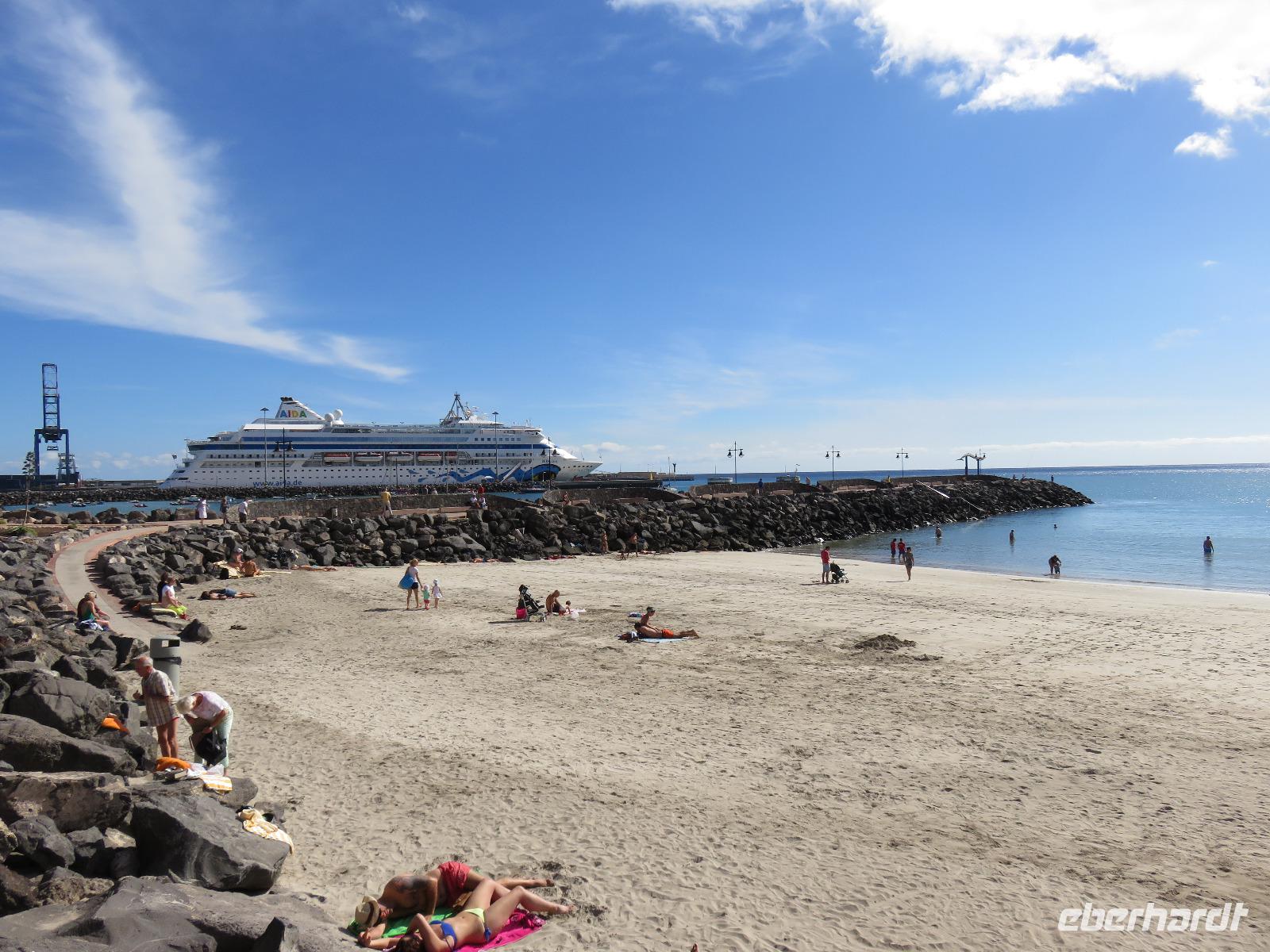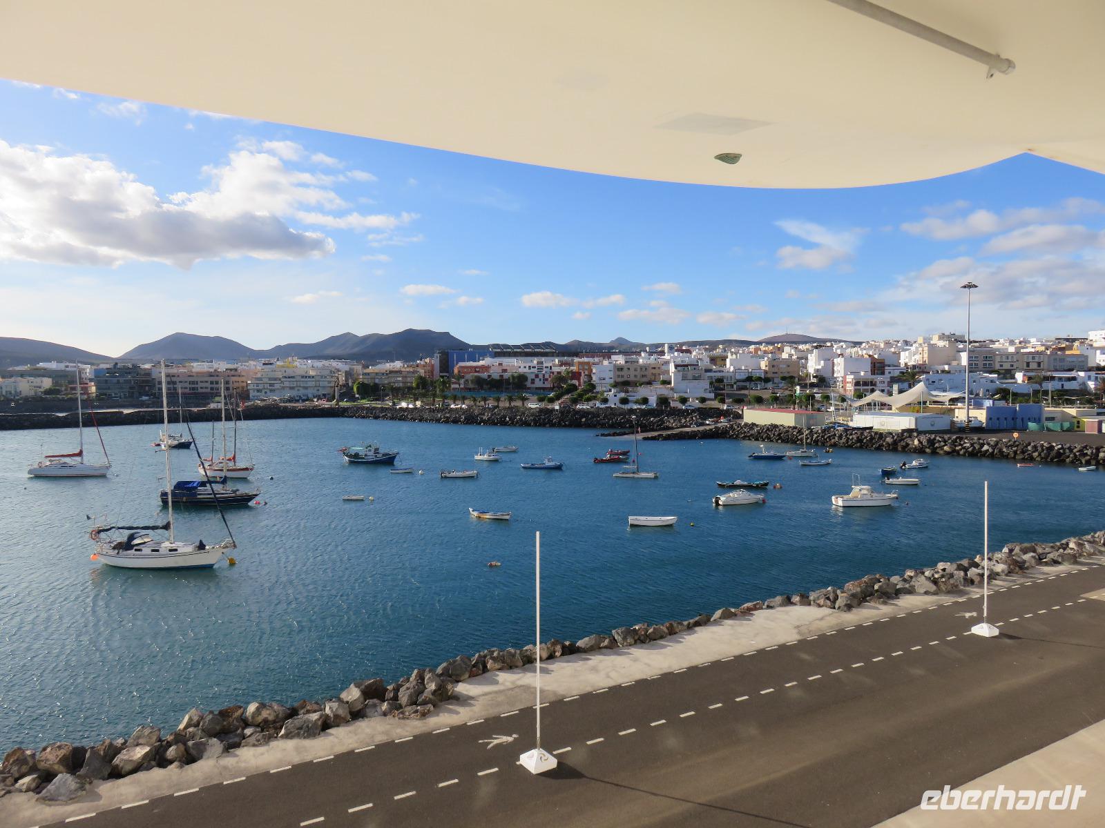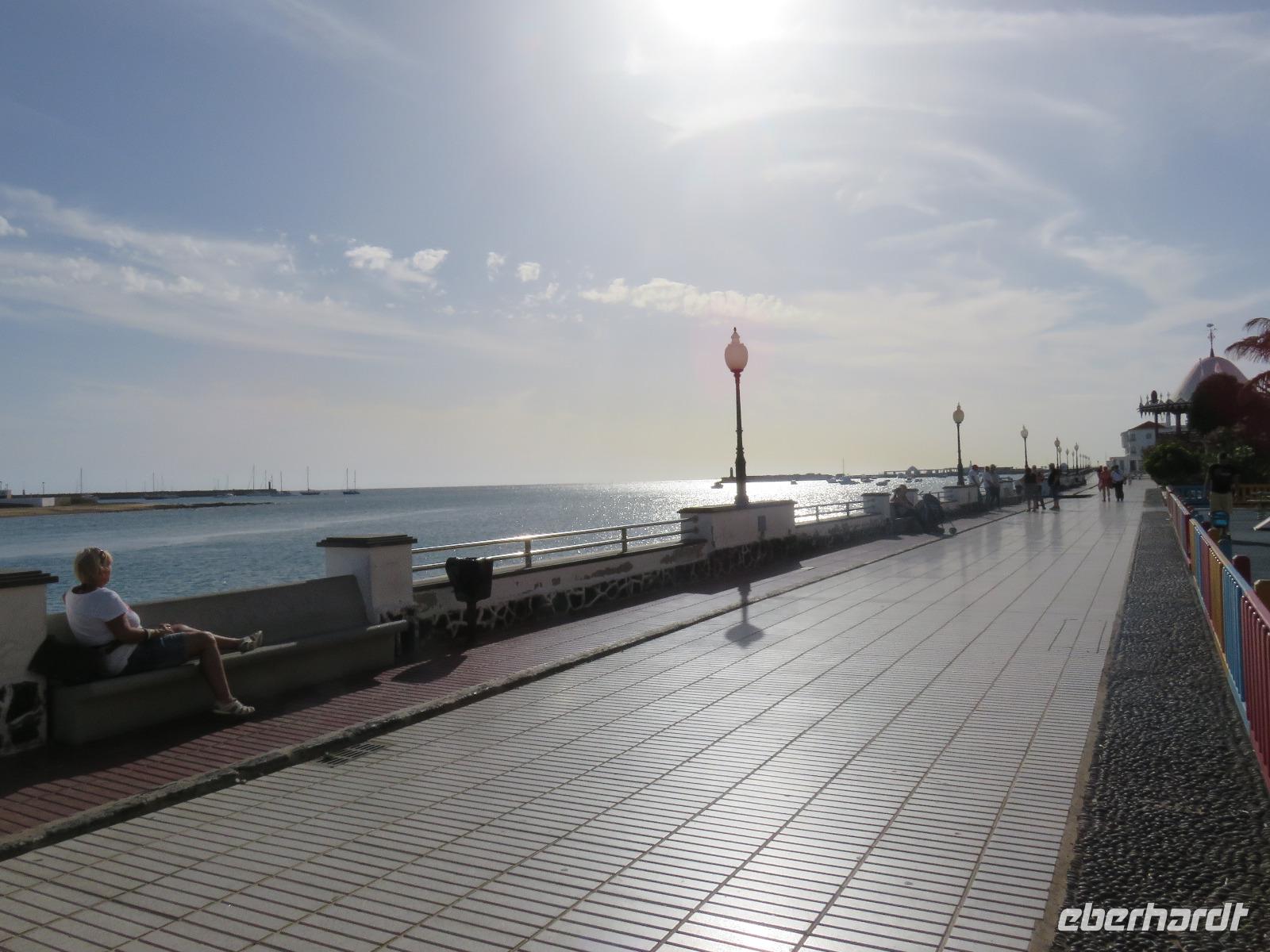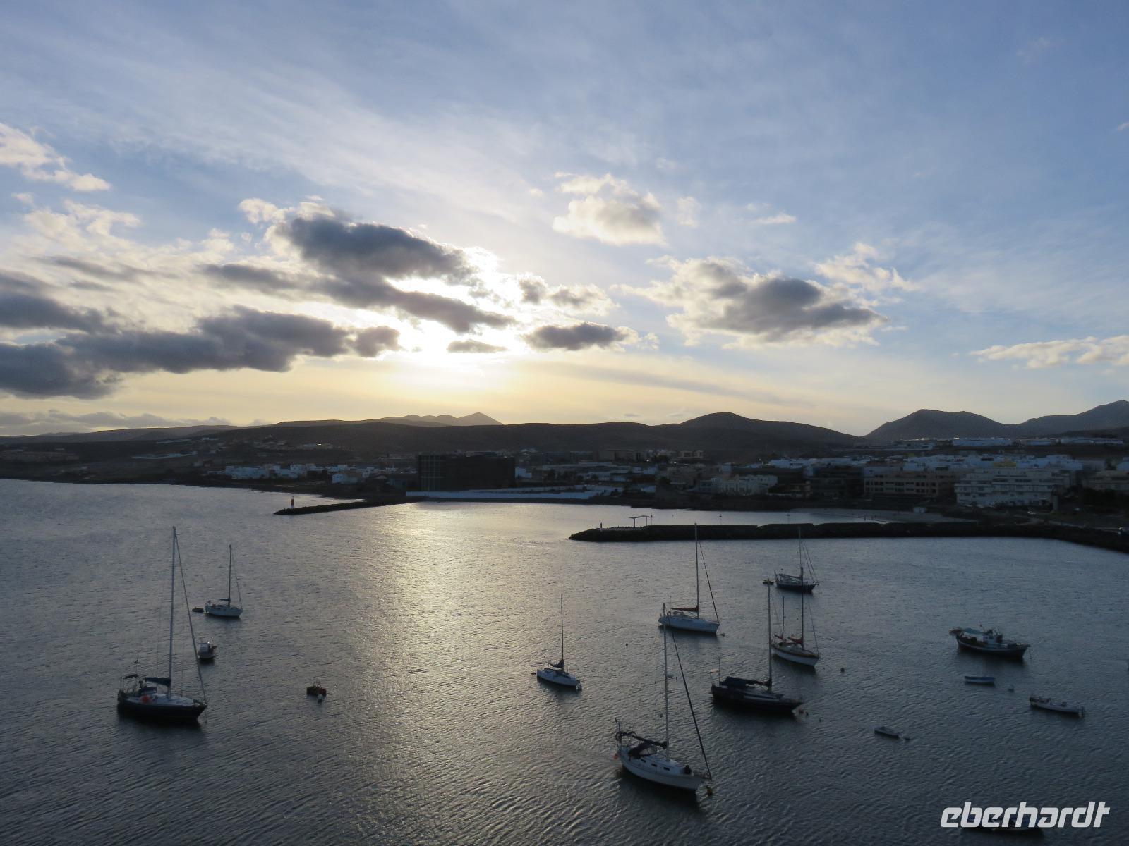 Eigentlich sollten wir die Hauptstadt der Feuerinsel erst gegen 16 Uhr erreichen. Aber unser Kapitän hatte entschieden, mit größerer Geschwindigkeit zu kreuzen. So erreichten wir bereits 10 Uhr Lanzarote. Es dauerte etwas bis das Schiff durch die Behörden zum Landgang freigegeben wurde. Deshalb entschlossen wir uns, den dritten Vortrag unseres Lektors Jörg. J. Reiche zu besuchen. Er stellte die östlichen Inseln der Kanaren vor: La Gomera, Lanzarote und Fuerteventura. Er löste auch das Wolkenspiel auf, das wir an den letzten Tagen beobachten konnten. Die Passatwolken sind in der Höhe von 600 bis 1.600 Metern zu finden. Daher die Sonne am Teide auf Teneriffa und die über die Cumbre wallenden Wolken auf La Palma. Nach dem Mittagessen nutzten die meisten Gäste unter uns den Shuttle vom Schiff in die Altstadt von Arrecife. Diese präsentierte sich klein und fein. Am Stadthafen bestaunten wir die schmucken Häuser in dem für die Küste typischen weiß-blauen Stil. In der Fußgängerzone buhlten die Geschäfte namhafter Hersteller um unsere Gunst. Zurück führte der Weg entlang der schmucken Uferpromenade. Wir nahmen nicht den direkten Weg. Das Castello de San Gabriel mit dem Historischen Museum lockte unsere Schritte hinüber zur kleinen Insel. Vorbei an der Regionalverwaltung und einem Botanischen Garten spazierten wir zurück zur Touristinformation. Eigentlich wollte ich für unsere Gruppe Material zur Insel und zur Stadt besorgen. Aber leider dauerte die Siesta noch an. Also zurück zur AIDAcara.
