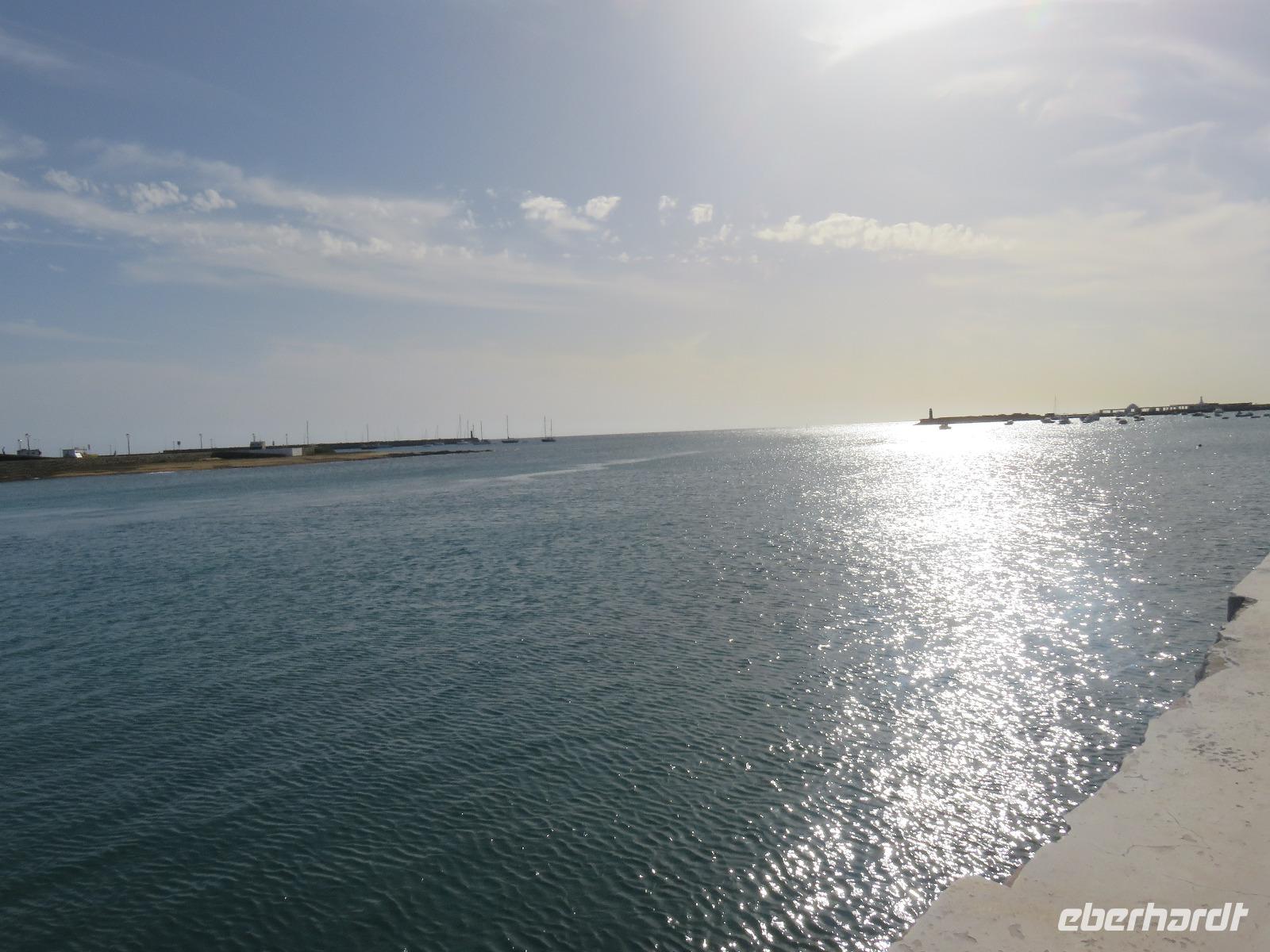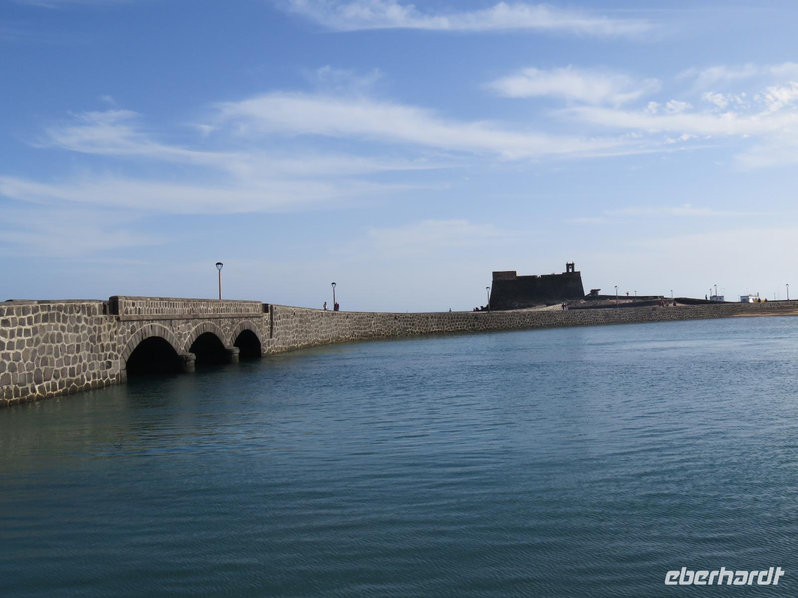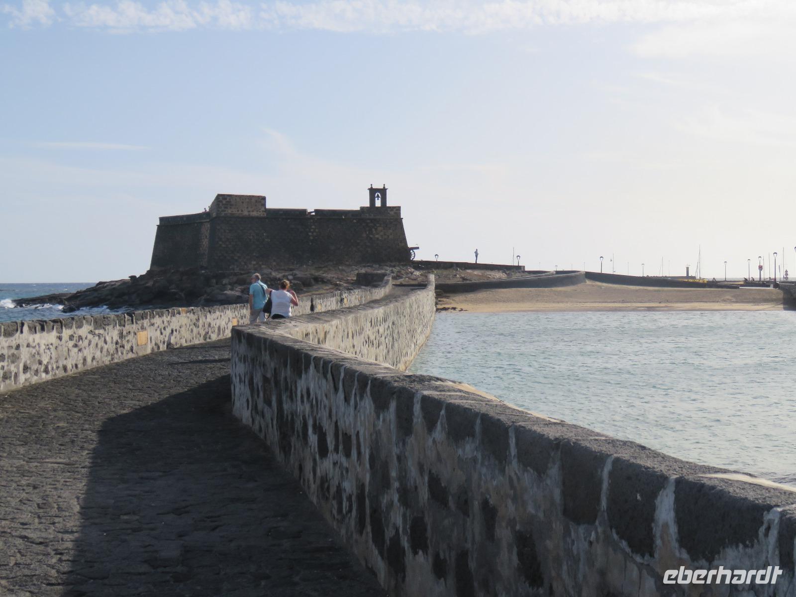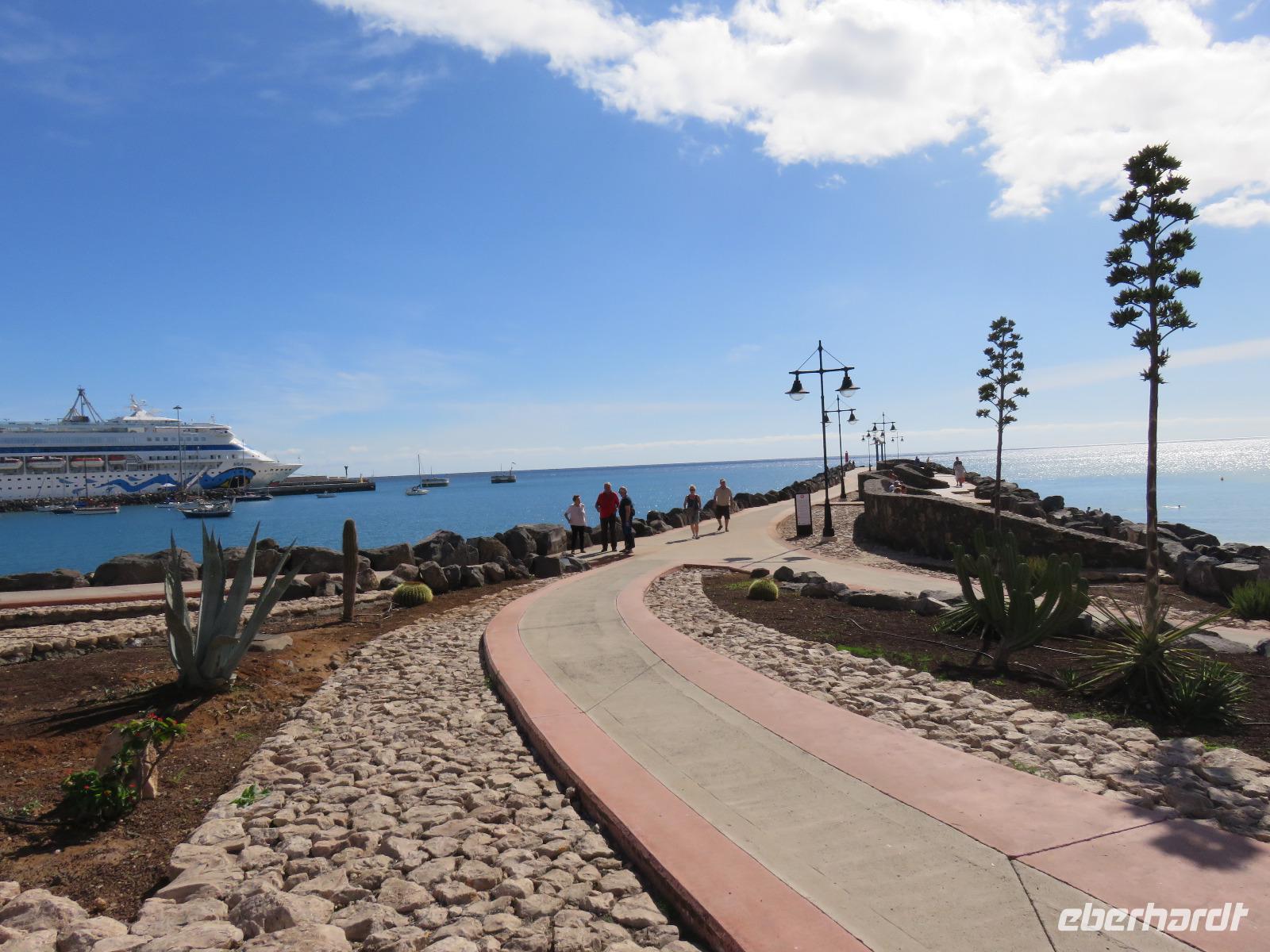 Eigentlich sollten wir die Hauptstadt der Feuerinsel erst gegen 16 Uhr erreichen. Aber unser Kapitän hatte entschieden, mit größerer Geschwindigkeit zu kreuzen. So erreichten wir bereits 10 Uhr Lanzarote. Es dauerte etwas bis das Schiff durch die Behörden zum Landgang freigegeben wurde. Deshalb entschlossen wir uns, den dritten Vortrag unseres Lektors Jörg. J. Reiche zu besuchen. Er stellte die östlichen Inseln der Kanaren vor: La Gomera, Lanzarote und Fuerteventura. Er löste auch das Wolkenspiel auf, das wir an den letzten Tagen beobachten konnten. Die Passatwolken sind in der Höhe von 600 bis 1.600 Metern zu finden. Daher die Sonne am Teide auf Teneriffa und die über die Cumbre wallenden Wolken auf La Palma. Nach dem Mittagessen nutzten die meisten Gäste unter uns den Shuttle vom Schiff in die Altstadt von Arrecife. Diese präsentierte sich klein und fein. Am Stadthafen bestaunten wir die schmucken Häuser in dem für die Küste typischen weiß-blauen Stil. In der Fußgängerzone buhlten die Geschäfte namhafter Hersteller um unsere Gunst. Zurück führte der Weg entlang der schmucken Uferpromenade. Wir nahmen nicht den direkten Weg. Das Castello de San Gabriel mit dem Historischen Museum lockte unsere Schritte hinüber zur kleinen Insel. Vorbei an der Regionalverwaltung und einem Botanischen Garten spazierten wir zurück zur Touristinformation. Eigentlich wollte ich für unsere Gruppe Material zur Insel und zur Stadt besorgen. Aber leider dauerte die Siesta noch an. Also zurück zur AIDAcara.