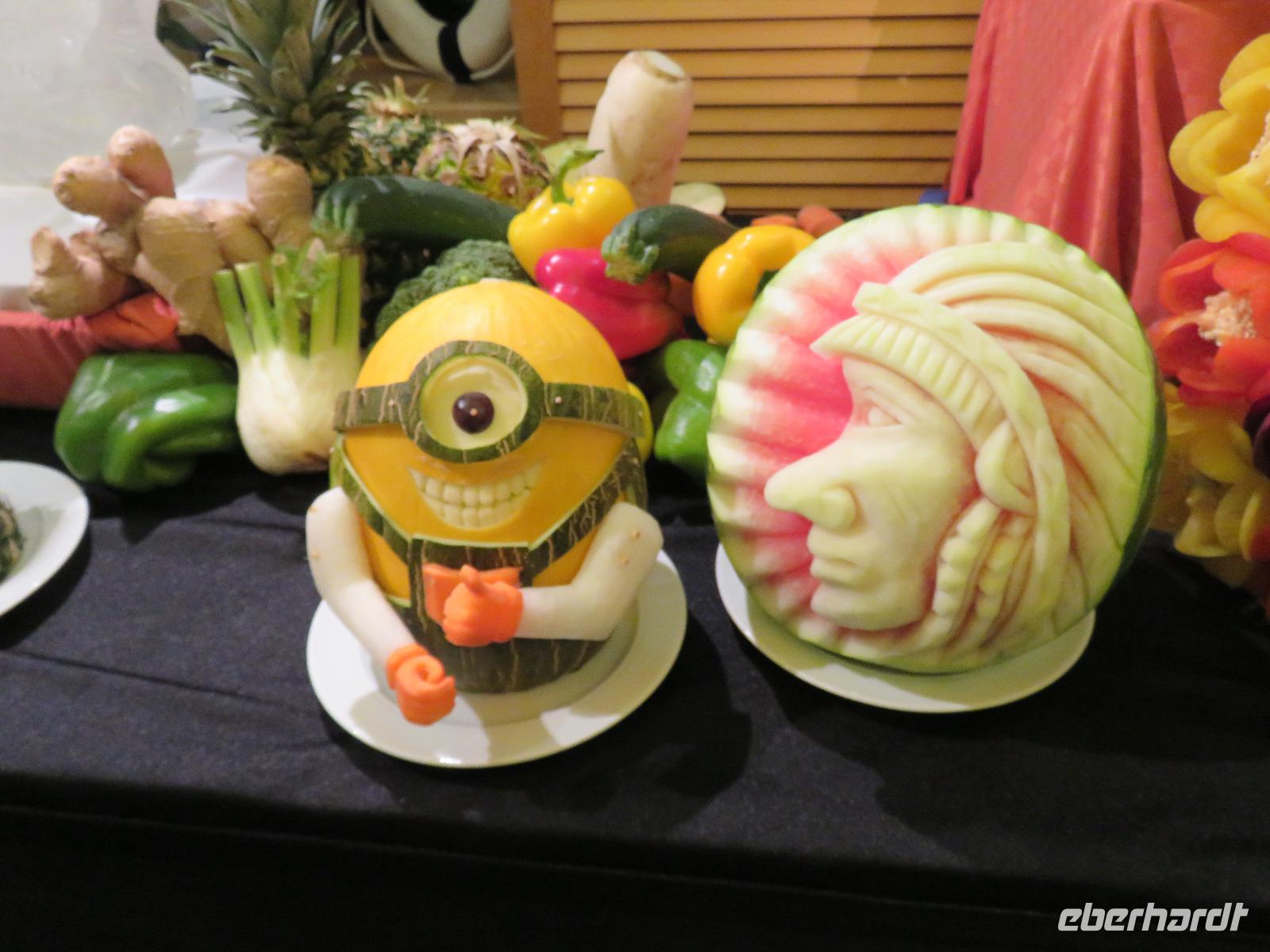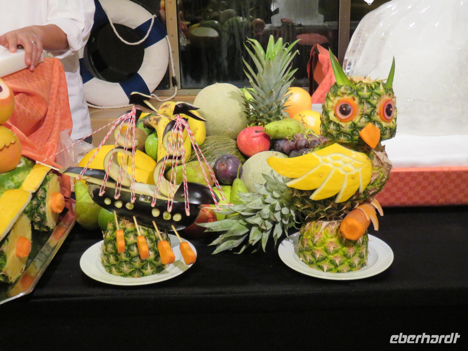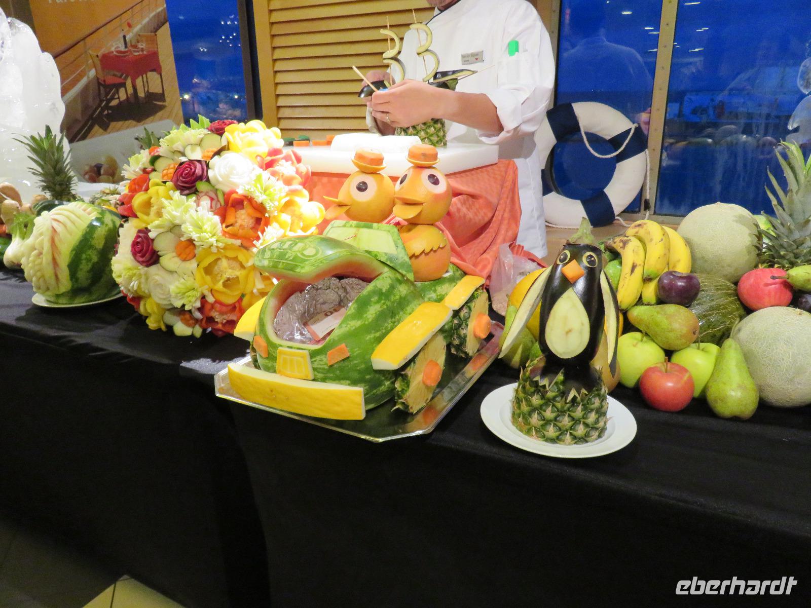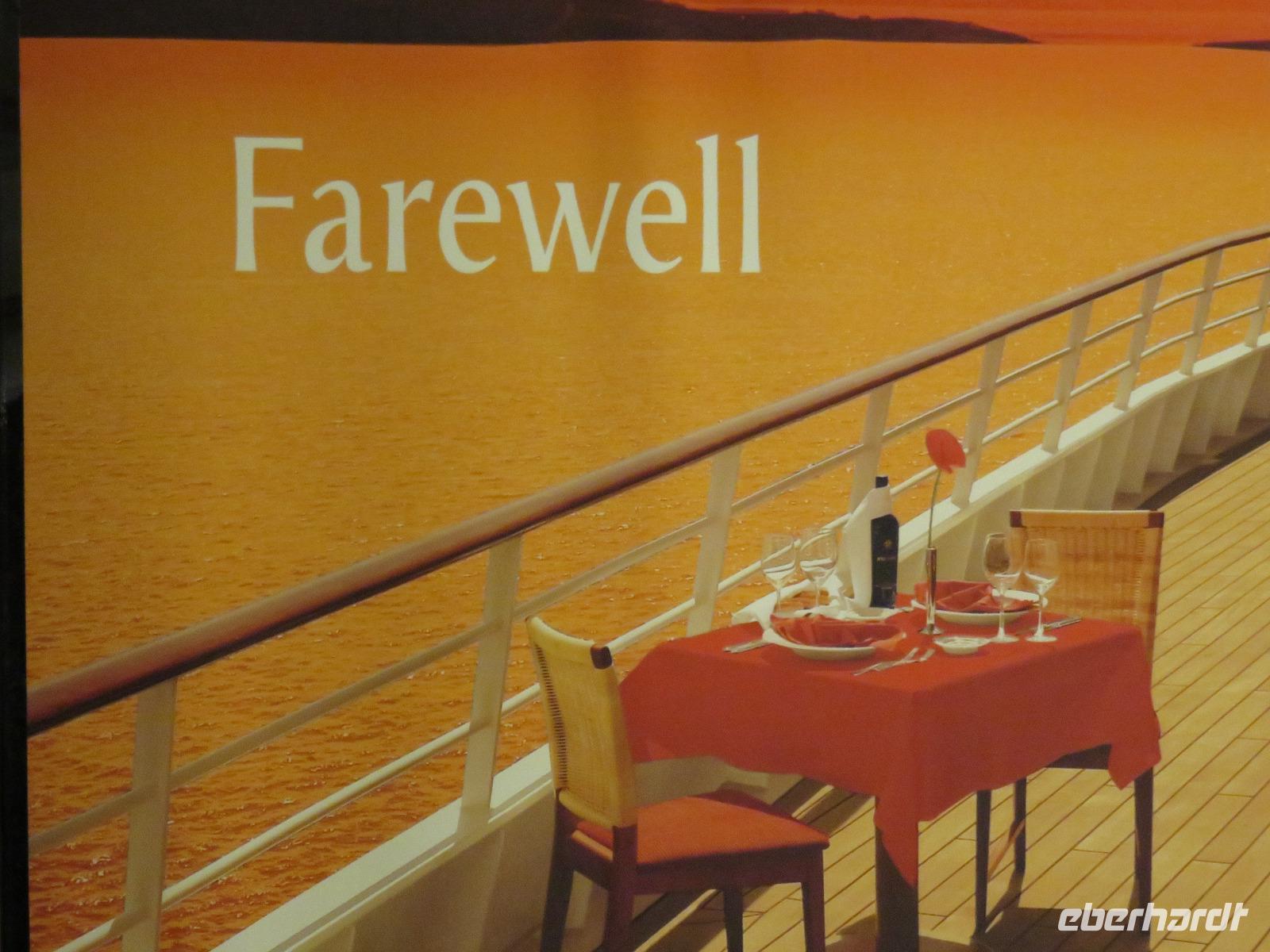 17.45 Uhr trafen wir uns in der AIDA-Bar zu unserem Abreisetreff. Zugleich übergab ich allen Reisegästen unser Erinnerungs-Gruppen-Foto. Unsere Tage an Bord und bei den Ausflügen auf den Inseln waren wie im Fluge vergangen und unser letzter Abend an Bord angebrochen: Die Küchen-Crew verwöhnte uns erneut kulinarisch und hatte sich die ein oder andere Überraschung einfallen lassen. Für uns waren heute Plätze im Kleinen Markt Restaurant reserviert. So konnten wir in einer ruhigen Atmosphäre die leckeren Speisen vom Farewell-Buffet genießen. Anschließend hieß es Kofferpacken. Wir legen uns ein letztes Mal für diese Kreuzfahrt in unsere Kojen.