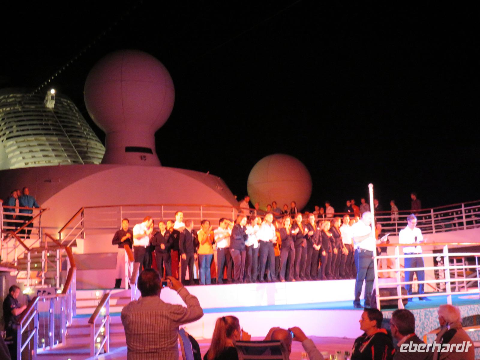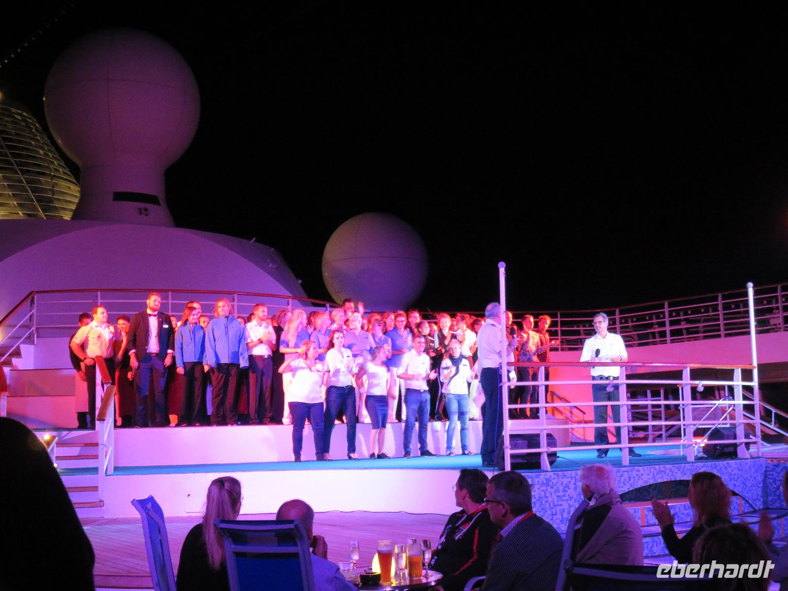 Da es am Abend wieder eine steife Brise gab, musste die Show Rhythm vom Pooldeck in das Theater verlegt werden. Auch kein Problem, der Stimmung tat es keinen Abbruch.