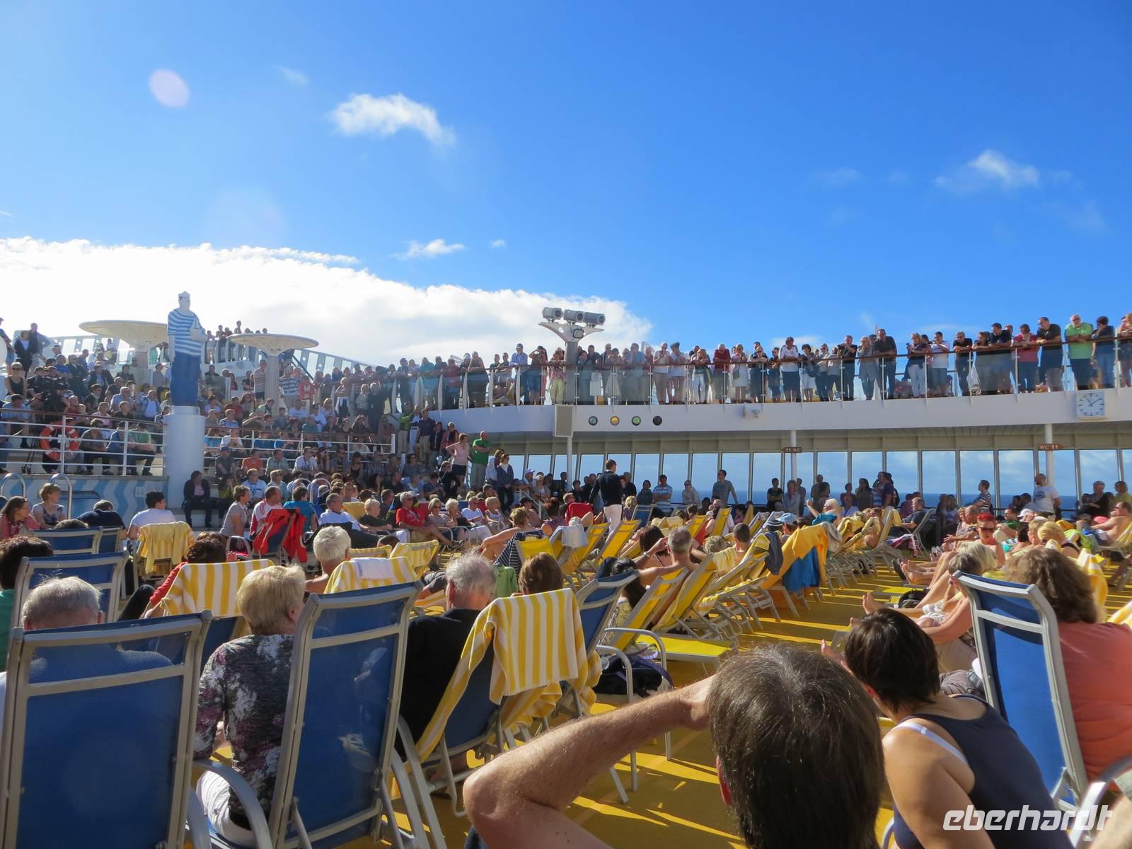 Ganz so unruhig war das Meer nicht und wir erwachten ausgeschlafen ... die Sonne zeigte sich - ein Traum! Vor uns lag ein Tag zum Ausruhen und Genießen. Jeder nutzte die verschiedenen Einrichtungen an Bord: Sonnen auf den Decks, Ausflugspräsentationen, Frühschoppen im Brauhaus, Blumenworkshop, Tanzkurse, 4-D-Kino, Kunstauktion, Sportkurse, Sauna ... es gab genügend zu tun. So ein Seetag ist nie langweilig. Wir buchten weitere Ausflüge an Bord nach oder um. Nach dem Abendessen stellte uns Kapitän Rümmler im Theatrium seine Offiziere vor und erläuterte die einzelnen Aufgabenbereiche.