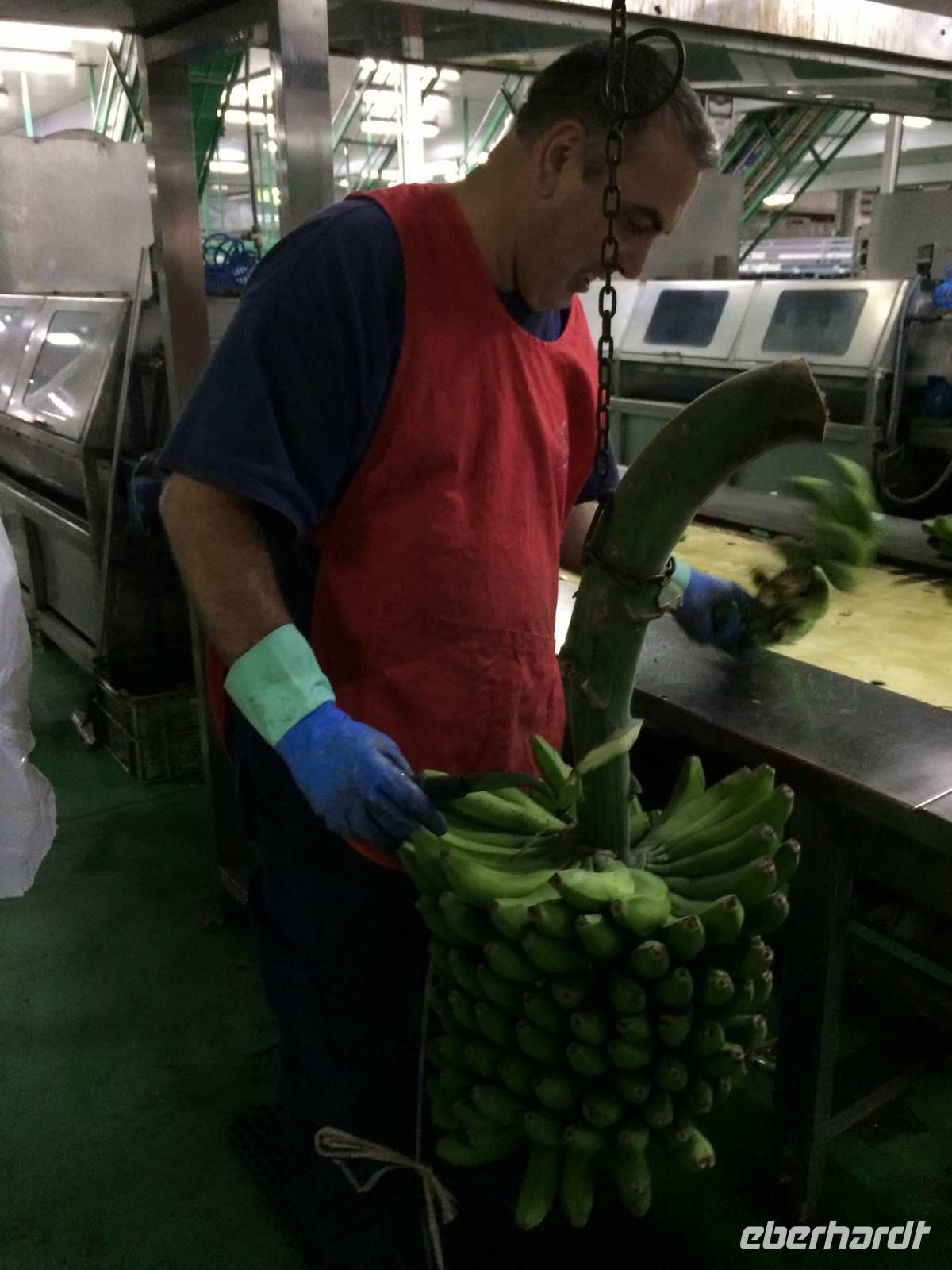 Bei strahlendem Sonnenschein starten wir in einen spannenden Tag. Gestärkt begeben sich die Reisegäste zusammen mit unserem örtlichen Reiseleiter Eduardo, seit vielen Jahren mit Herz und Seele als Fremdenführer auf den Kanaren unterwegs und unserem Chauffeur Manuel in den Norden Teneriffas. Auf einer kleinen Bananenplantage erklärt uns Eduardo, wie eine Banane angepflanzt und geerntet wird und wieso die Banane krumm ist. Ende des 19. Jahrhunderts wurde damit begonnen auf den Kanarischen Inseln, vor allem an der Nord- und Südwestküste, Bananenplantagen anzulegen. Teneriffa hat den größten Produktionsanteil im Vergleich zu den anderen Inseln. Erstaunt waren wir, dass jede Pflanze pro Tag 21 Liter Wasser aufnehmen muss und die Plastiktüten um die Stauden herum helfen, das Wasser nicht verdunsten zu lassen. Letztendlich benötigt man fast 900 Liter Wasser für den Anbau von einem Kilo Banane. In der Fabrik begegnen wir sogar den einen oder anderen Bauern wieder, den wir auf der Plantage gesehen haben. Die Bananen werden vorsichtig in Decken gewickelt und in die Fabrik gebracht. In schicken weißen Plastikkitteln werden wir durch die Fabrik FAST geführt und bekommen erklärt, welche Prozesse die Bearbeitung der Bananenstauden von der Ernte bis hin zur Verpackung durchlaufen. Bei den Maschinen kommt es auf jedes Gramm Genauigkeit an. Für so einen Aufwand und die schwere Arbeit auf den Plantagen erhalten wir die Früchte im Supermarkt zu spöttischen Preisen, denn allein der Stundenlohn dürfte schon höher sein als der Verkaufspreis des Produktes. Viele Menschen sind in diesem Sektor beschäftigt und daher abhängig von den staatlichen Subventionen. Wir dürfen im Anschluss die wohlschmeckenden krummen Früchte verköstigen. Wir schmecken auch den Unterschied zu den in Deutschland angebotenen Bananen. Auf Teneriffa sind sie wesentlich schmackhafter und energiereicher, da sie doppelt so lange bis zur Reifung benötigen und entfalten somit einen wesentlich intensiveren Geschmack. Mhhh...