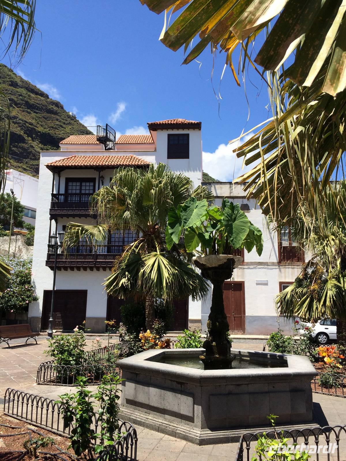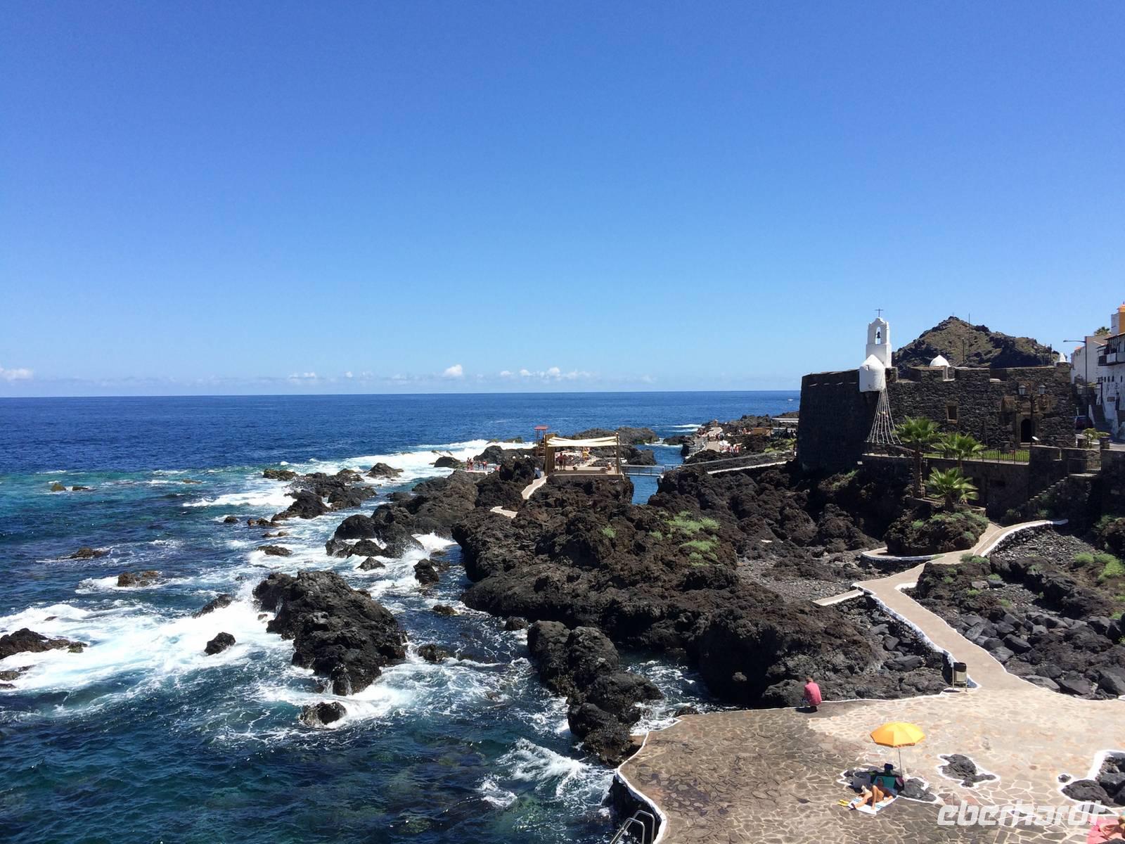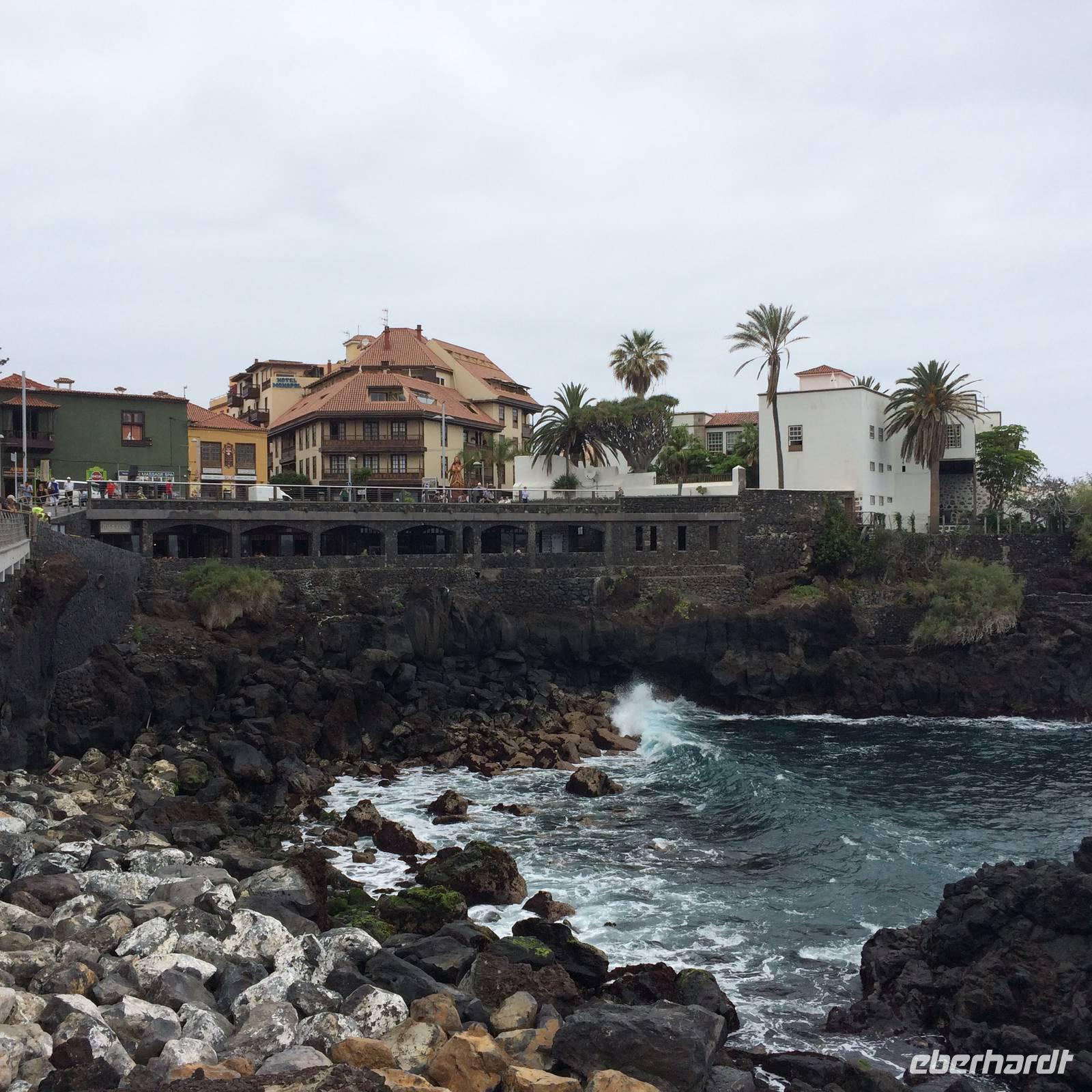 Weiter geht es in die Innenstadt von Puerto de la Cruz, der erste touristische Ort der Insel. Englische Besucher haben diese Gegend Ende des 19. Jahrhunderts als Urlaubsziel ausgesucht. Berühmt ist die Stadt für den farbenprächtigen Karnevalsumzug, der An der brandungsreichen Felsenküste spazieren wir bis zum Hauptplatz Plaza del Charco, was soviel wie Pfütze bedeutet. Bei Sturm sammelte sich Meerwasser, welches vom Hafen überschwappte und diesen Platz füllte. Zwischen Palmen und Lorbeerbäumen vernaschen wir spanische Tapas in einer kleinen Tasca (Tapasbar).