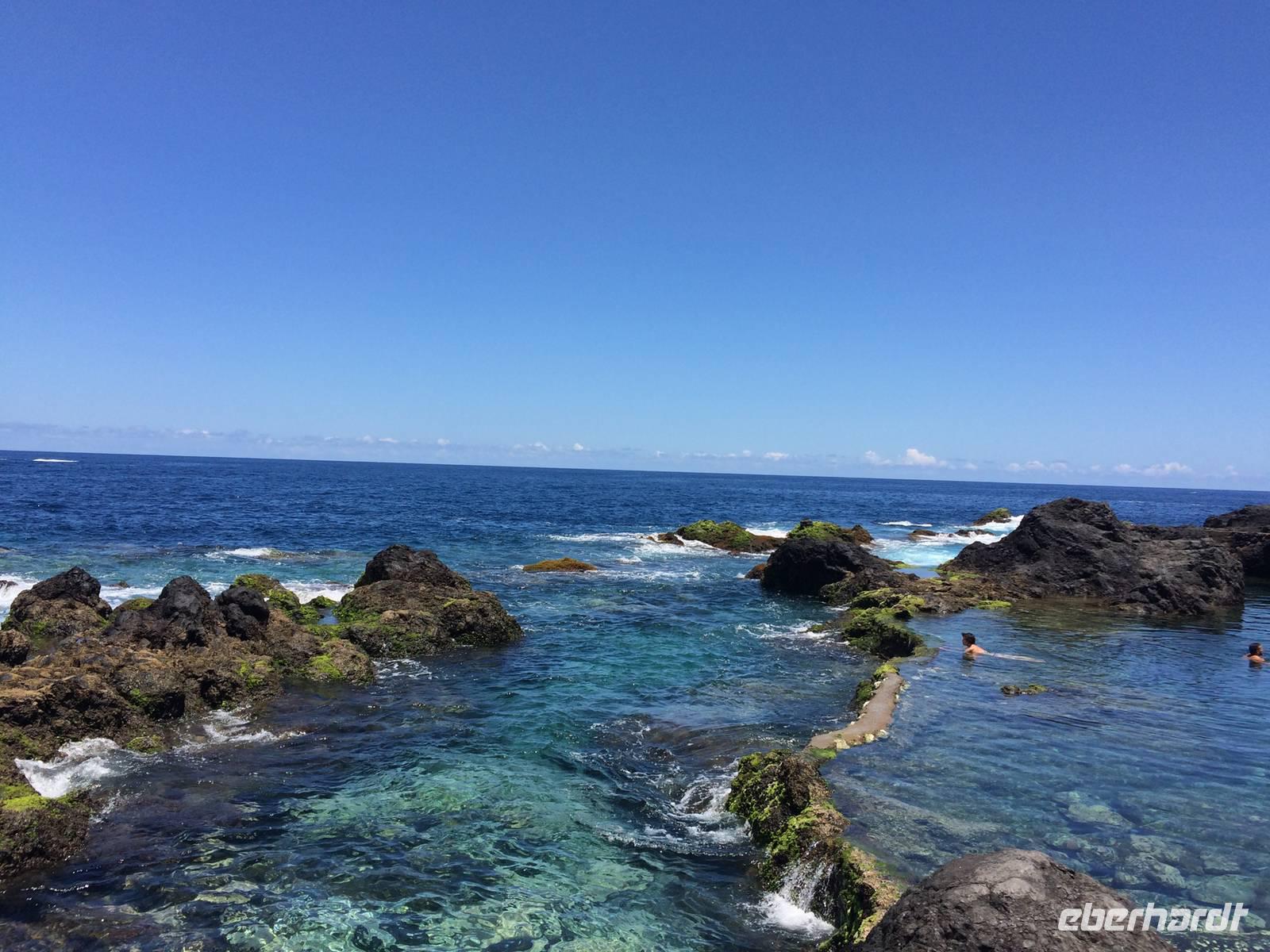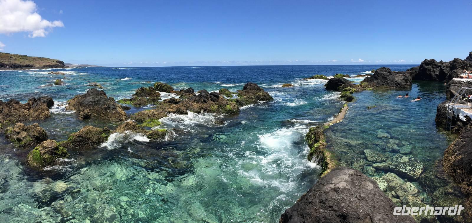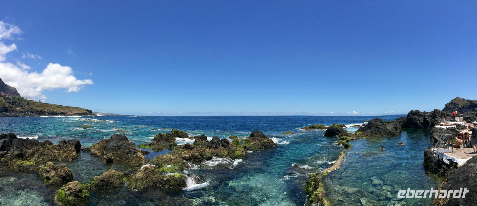 Weiter geht es in die Innenstadt von Puerto de la Cruz, der erste touristische Ort der Insel. Englische Besucher haben diese Gegend Ende des 19. Jahrhunderts als Urlaubsziel ausgesucht. Berühmt ist die Stadt für den farbenprächtigen Karnevalsumzug, der An der brandungsreichen Felsenküste spazieren wir bis zum Hauptplatz Plaza del Charco, was soviel wie Pfütze bedeutet. Bei Sturm sammelte sich Meerwasser, welches vom Hafen überschwappte und diesen Platz füllte. Zwischen Palmen und Lorbeerbäumen vernaschen wir spanische Tapas in einer kleinen Tasca (Tapasbar).