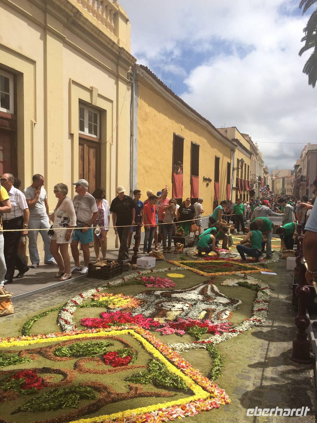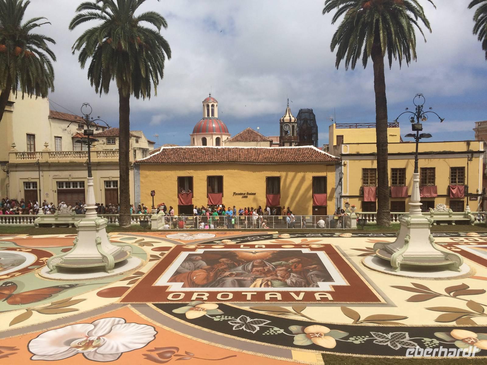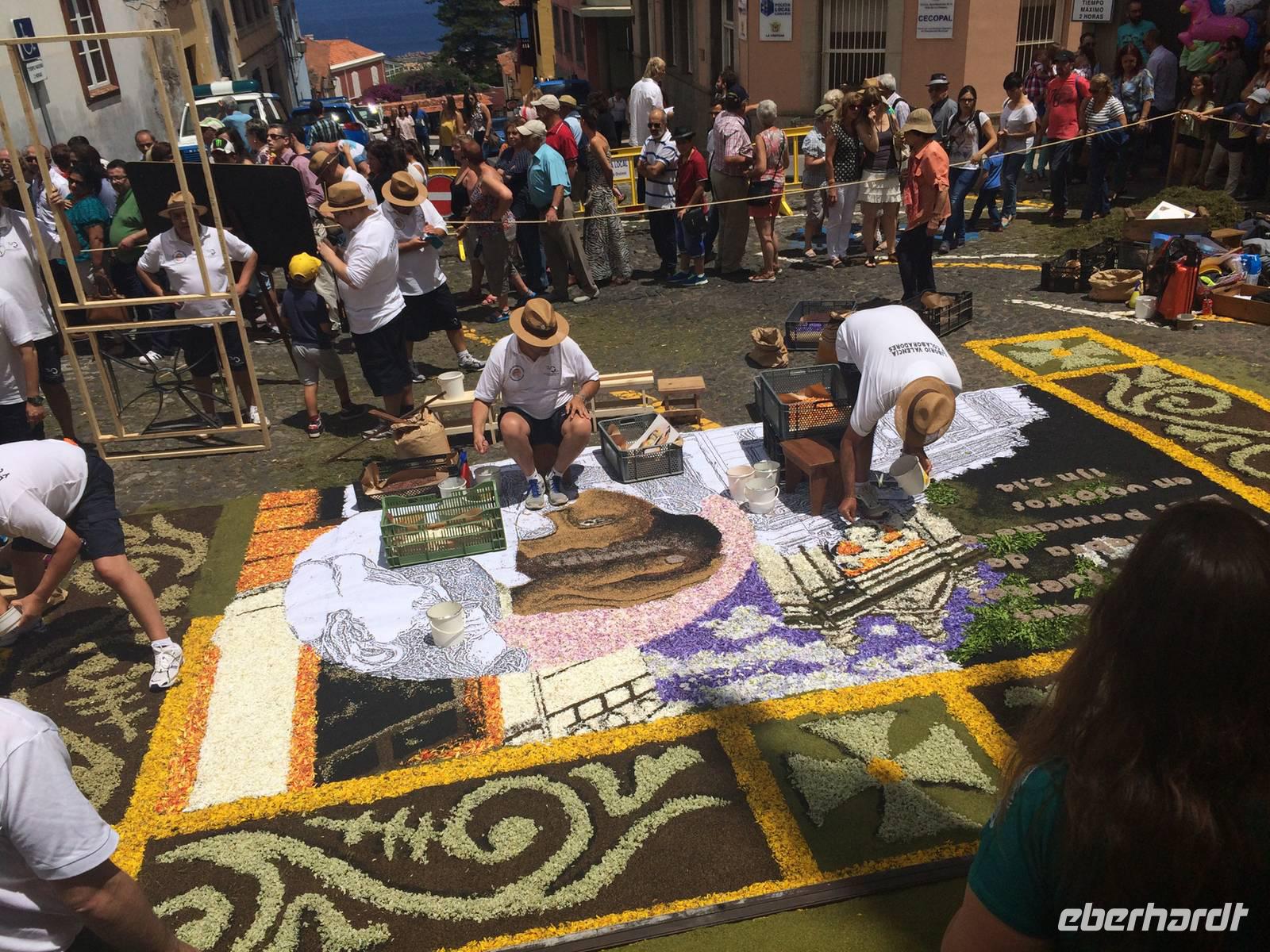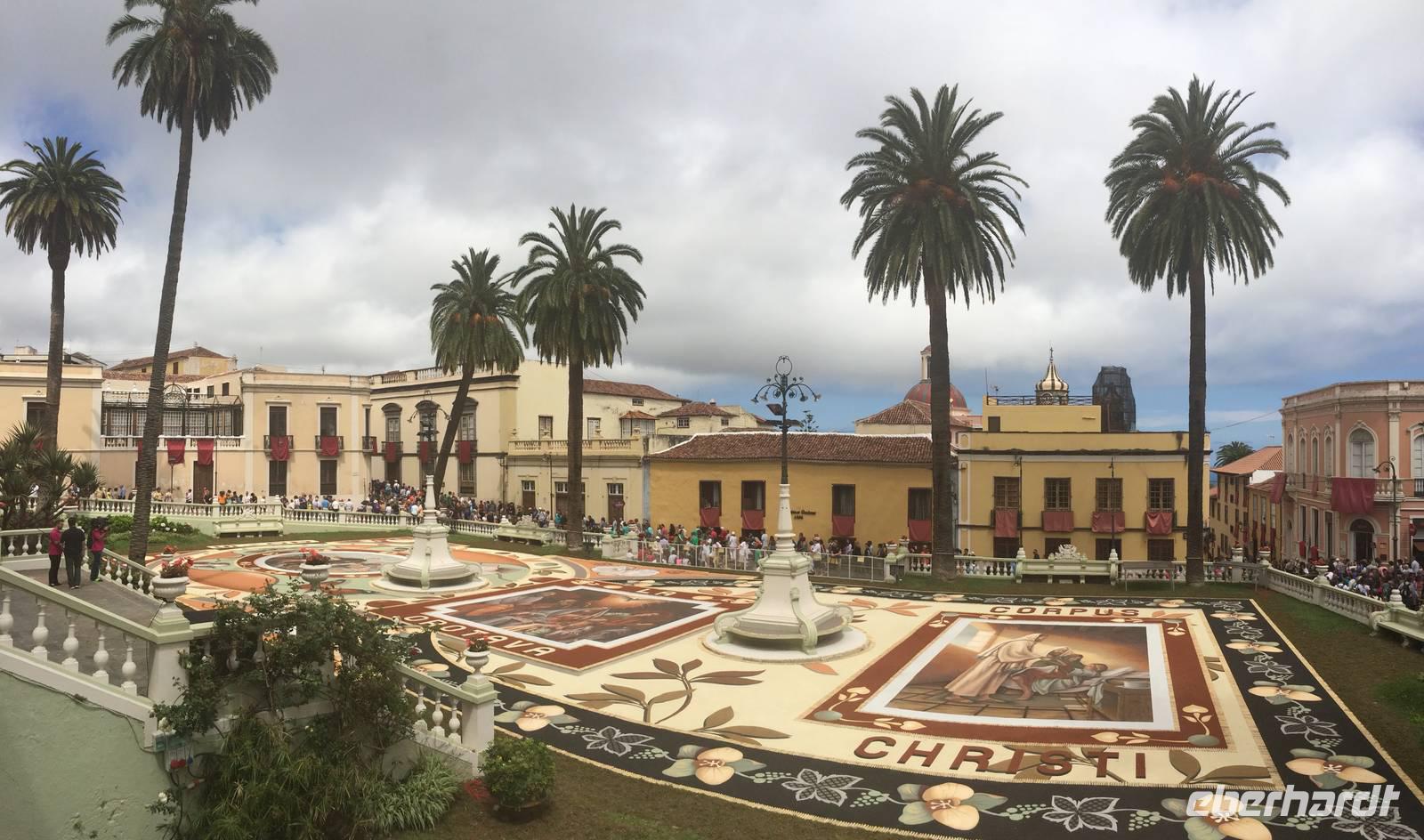 Alljährlich gibt es die Möglichkeit an Frohnleichnam ein riesiges aber leider nur kurzlebiges Kunstwerk zubestaunen. Wir sind Zeugen, wie riesige aus Tausende von Blüten und fein gemahlenem, bunten Vulkangestein bestehende Teppiche entlang der Altstadtgassen gestaltet werden. Wunderschöne Ornamente und Heiligenbilder entstehen in mühseliger Handarbeit, bei der sowohl Groß und Klein mitwirken. Die Hauptattraktion ist das überdimensional große Monument aus färbigem Sand vom Teide auf dem Rathausvorplatz und der Plaza. Diese künstlerische und aufwendige Tradition geht zurück bis in die Mitte des 19. Jahrhunderts.