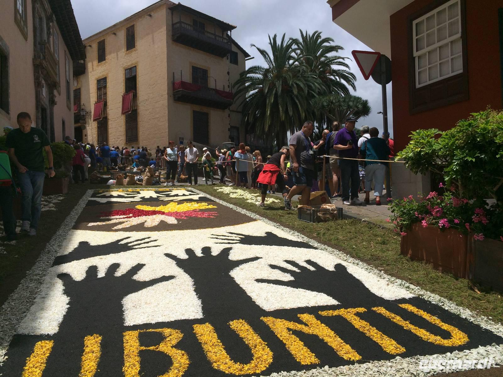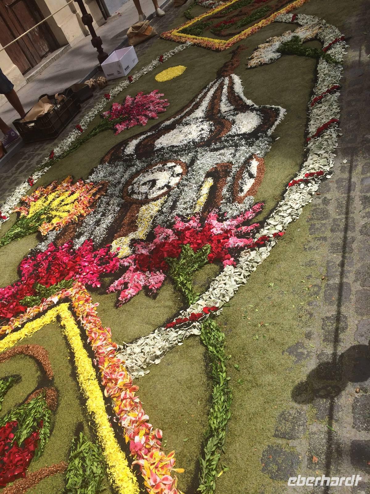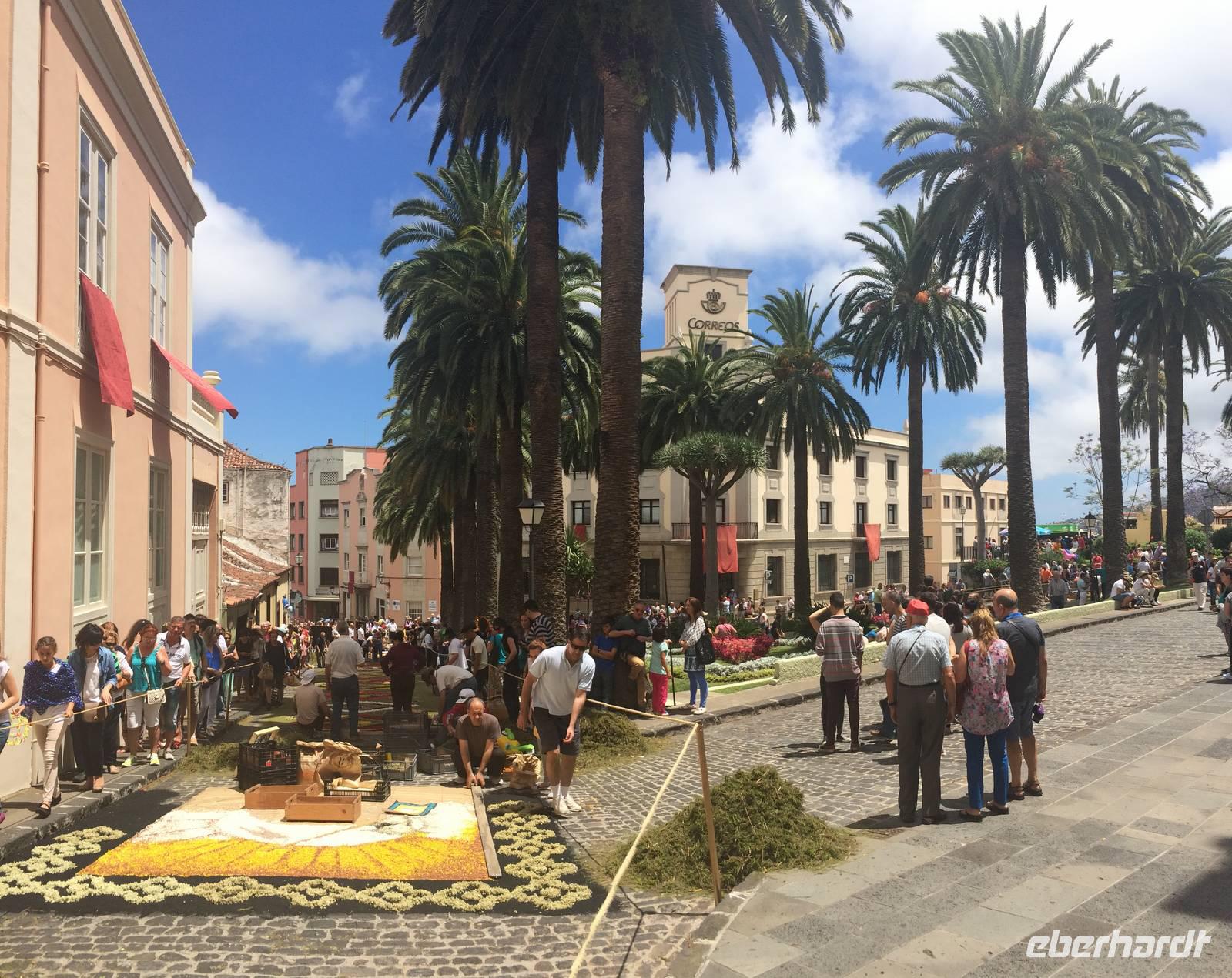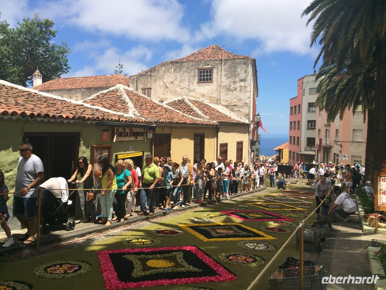 Alljährlich gibt es die Möglichkeit an Frohnleichnam ein riesiges aber leider nur kurzlebiges Kunstwerk zubestaunen. Wir sind Zeugen, wie riesige aus Tausende von Blüten und fein gemahlenem, bunten Vulkangestein bestehende Teppiche entlang der Altstadtgassen gestaltet werden. Wunderschöne Ornamente und Heiligenbilder entstehen in mühseliger Handarbeit, bei der sowohl Groß und Klein mitwirken. Die Hauptattraktion ist das überdimensional große Monument aus färbigem Sand vom Teide auf dem Rathausvorplatz und der Plaza. Diese künstlerische und aufwendige Tradition geht zurück bis in die Mitte des 19. Jahrhunderts.