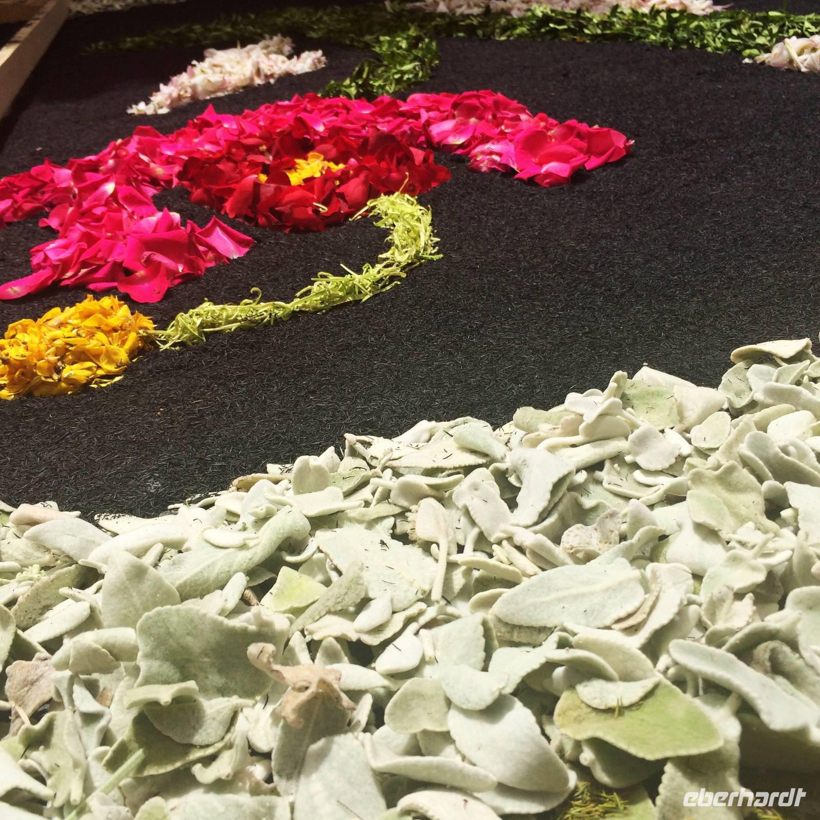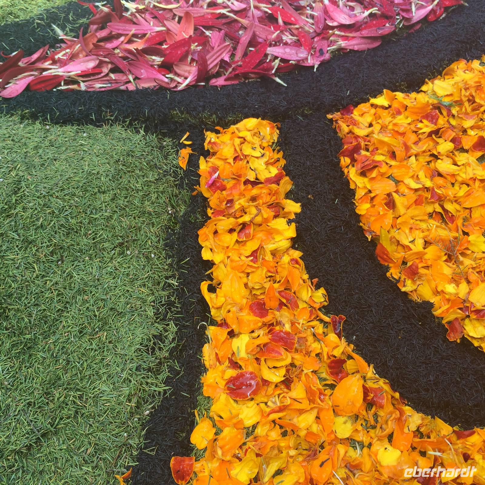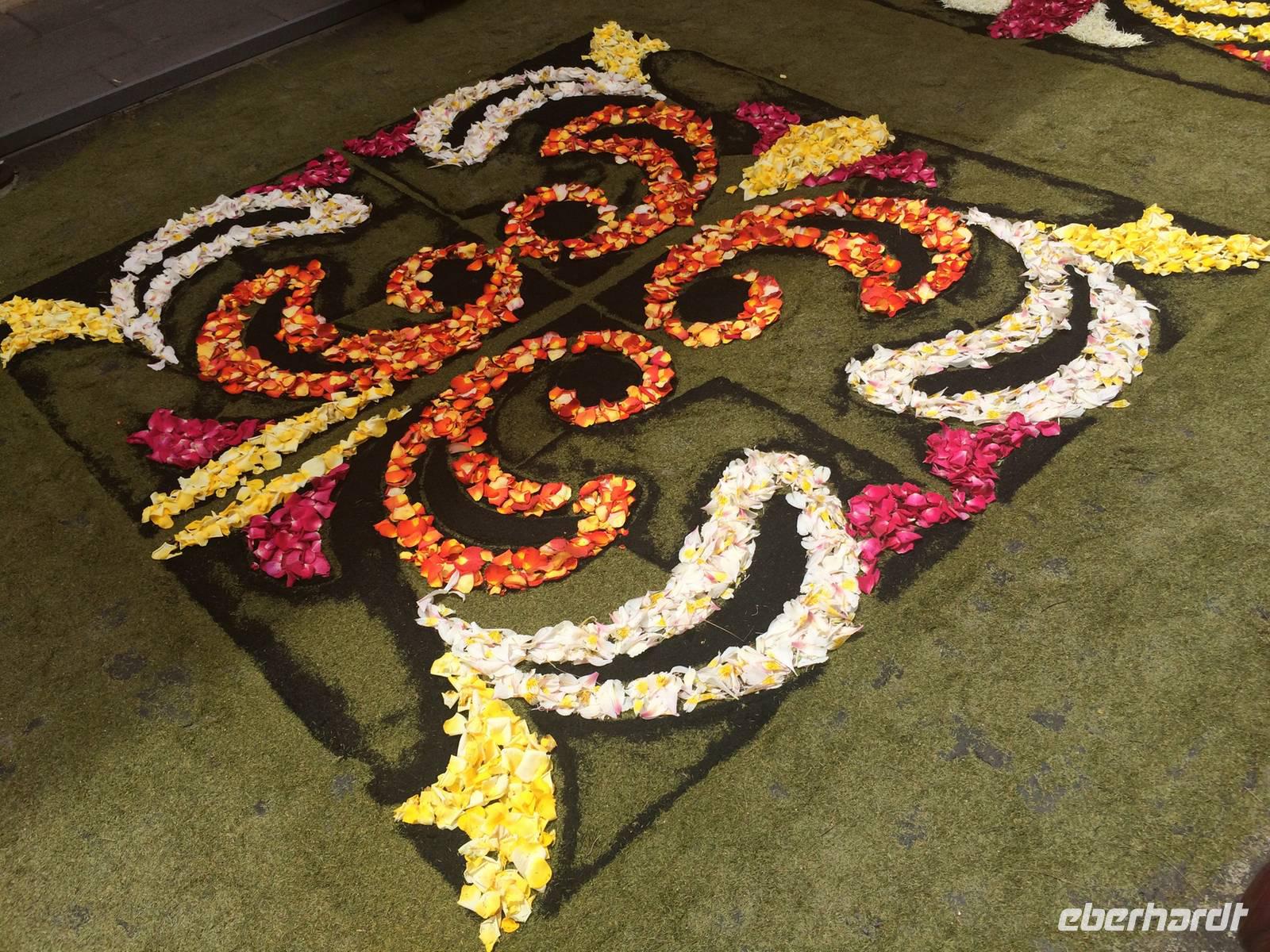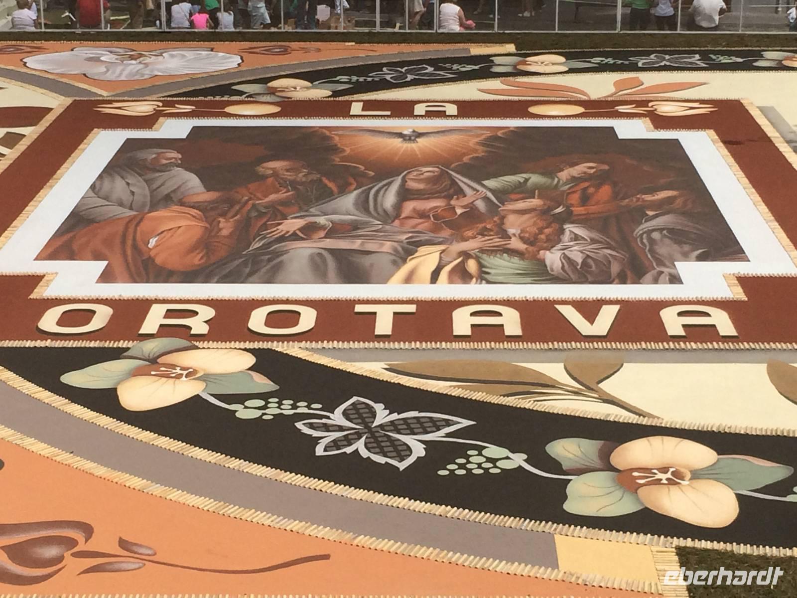 Alljährlich gibt es die Möglichkeit an Frohnleichnam ein riesiges aber leider nur kurzlebiges Kunstwerk zubestaunen. Wir sind Zeugen, wie riesige aus Tausende von Blüten und fein gemahlenem, bunten Vulkangestein bestehende Teppiche entlang der Altstadtgassen gestaltet werden. Wunderschöne Ornamente und Heiligenbilder entstehen in mühseliger Handarbeit, bei der sowohl Groß und Klein mitwirken. Die Hauptattraktion ist das überdimensional große Monument aus färbigem Sand vom Teide auf dem Rathausvorplatz und der Plaza. Diese künstlerische und aufwendige Tradition geht zurück bis in die Mitte des 19. Jahrhunderts.