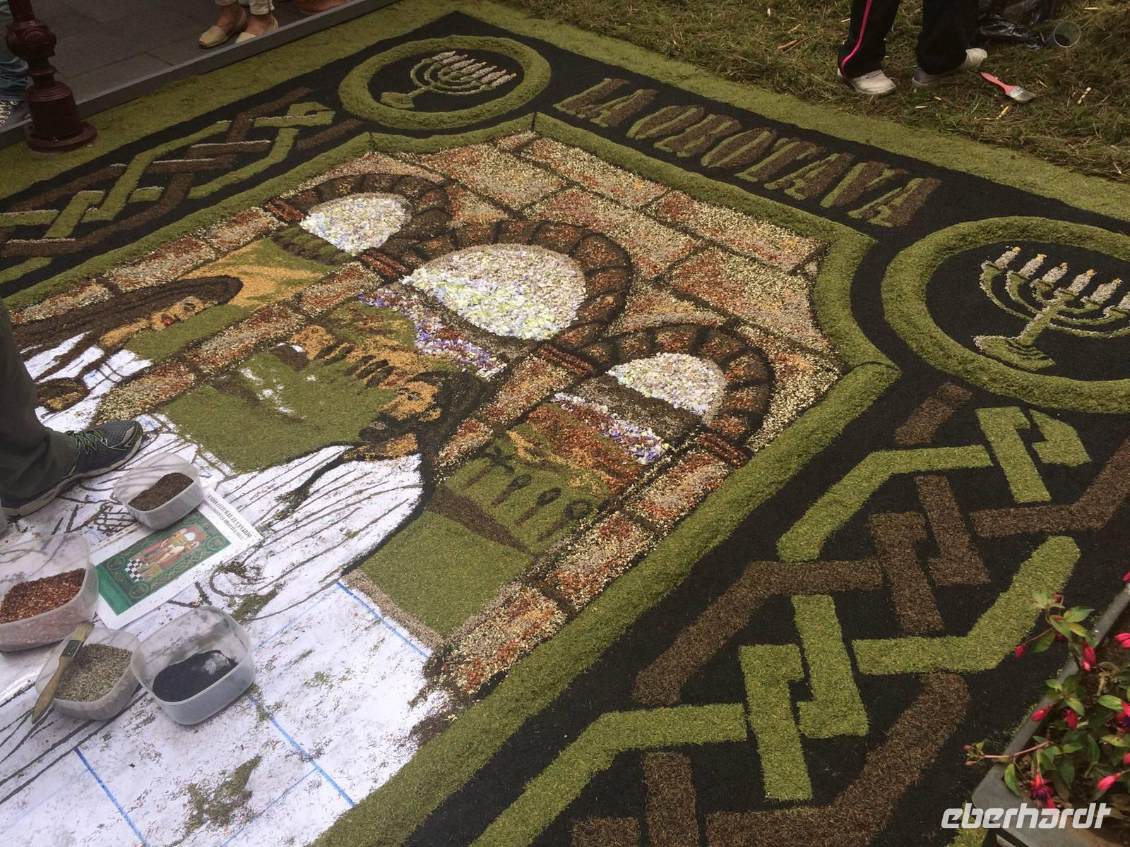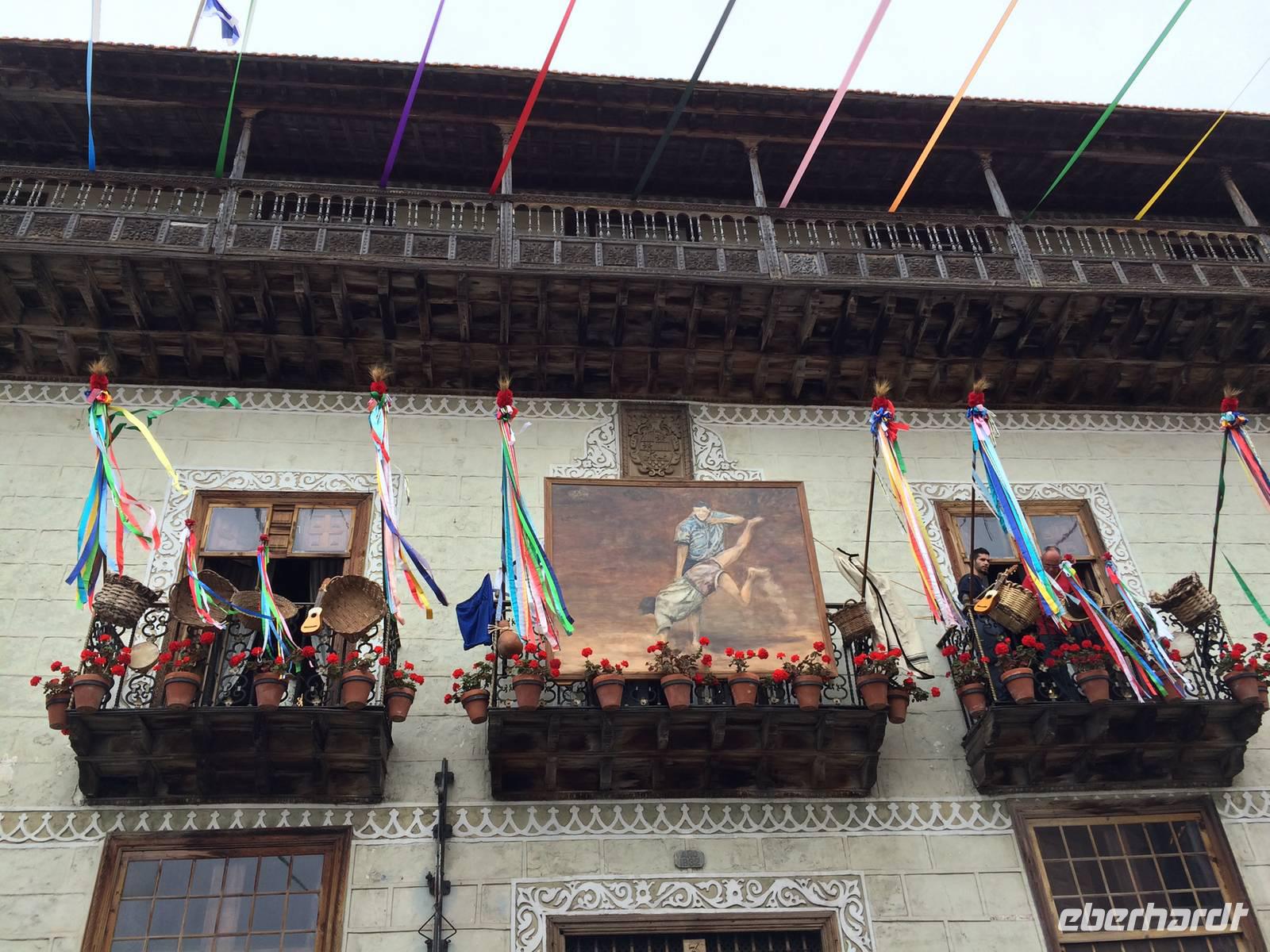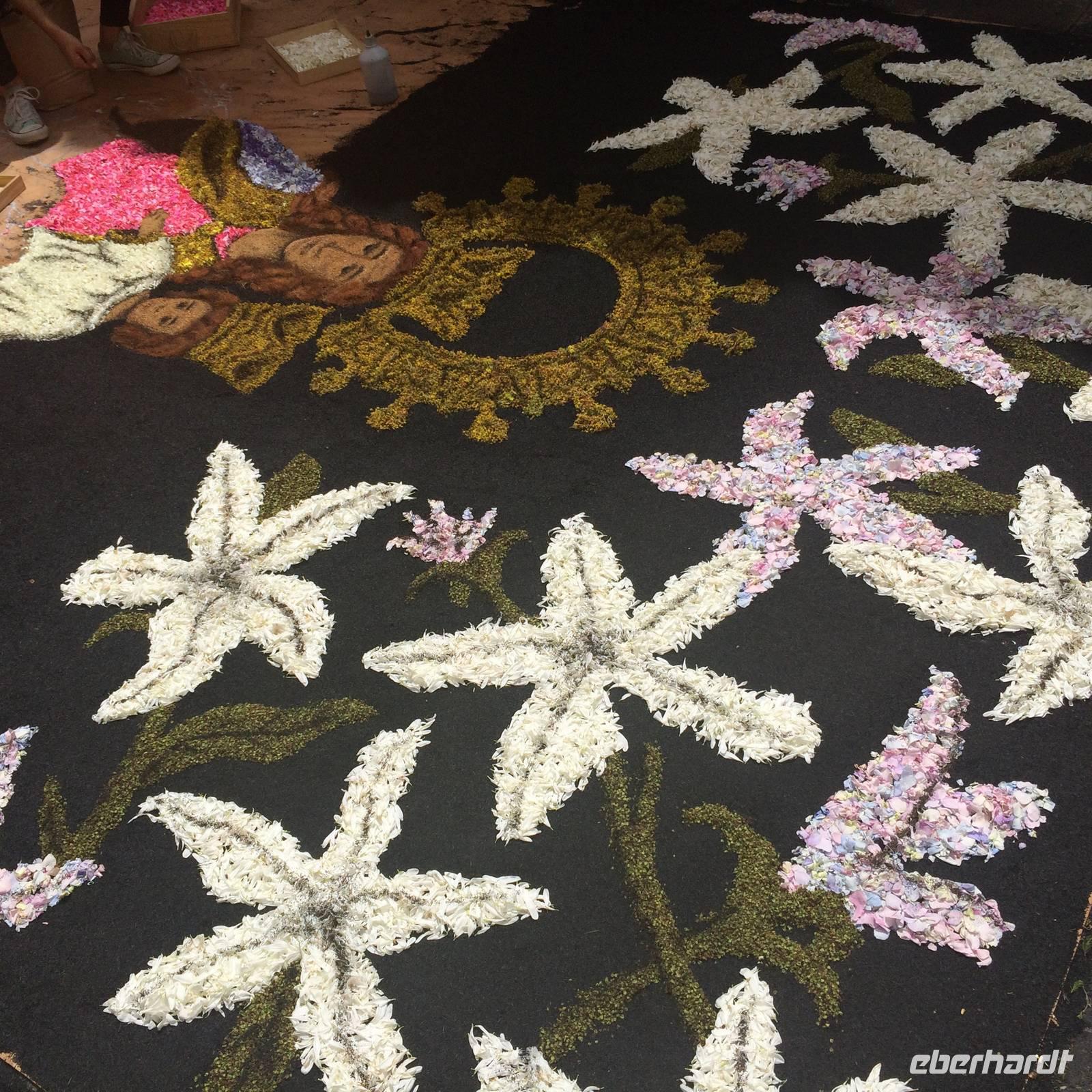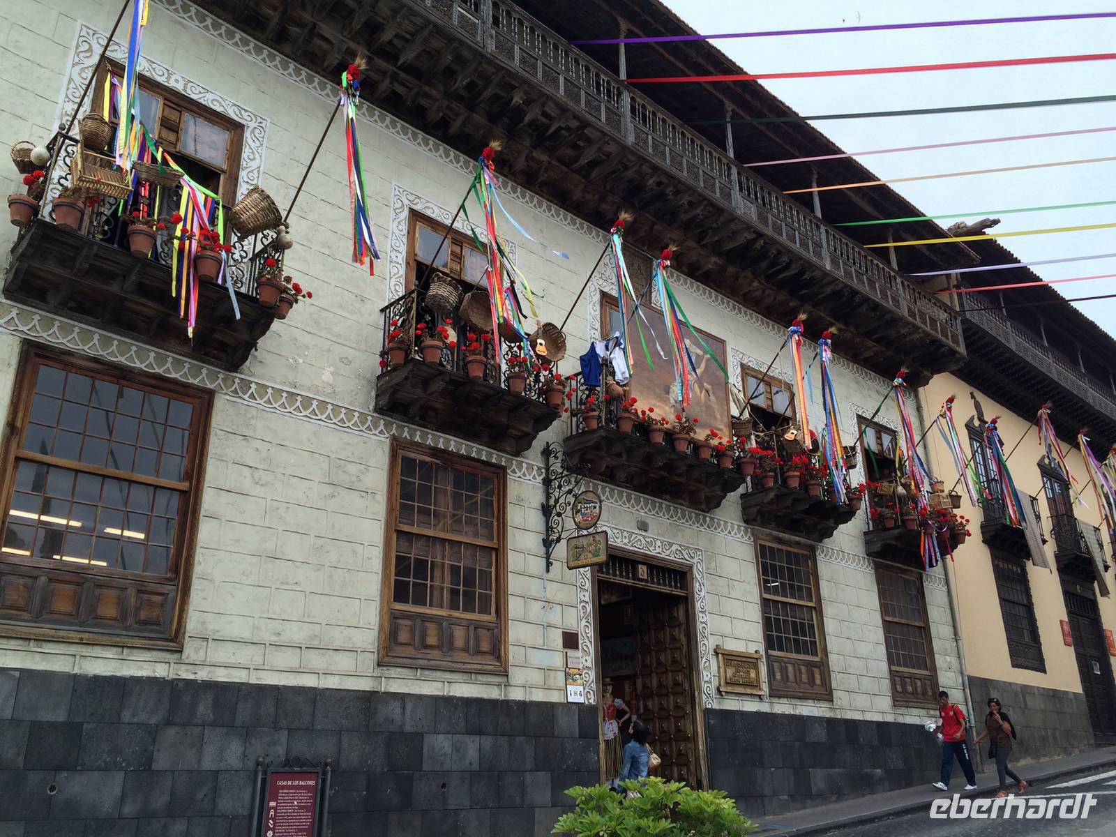 Alljährlich gibt es die Möglichkeit an Frohnleichnam ein riesiges aber leider nur kurzlebiges Kunstwerk zubestaunen. Wir sind Zeugen, wie riesige aus Tausende von Blüten und fein gemahlenem, bunten Vulkangestein bestehende Teppiche entlang der Altstadtgassen gestaltet werden. Wunderschöne Ornamente und Heiligenbilder entstehen in mühseliger Handarbeit, bei der sowohl Groß und Klein mitwirken. Die Hauptattraktion ist das überdimensional große Monument aus färbigem Sand vom Teide auf dem Rathausvorplatz und der Plaza. Diese künstlerische und aufwendige Tradition geht zurück bis in die Mitte des 19. Jahrhunderts.
