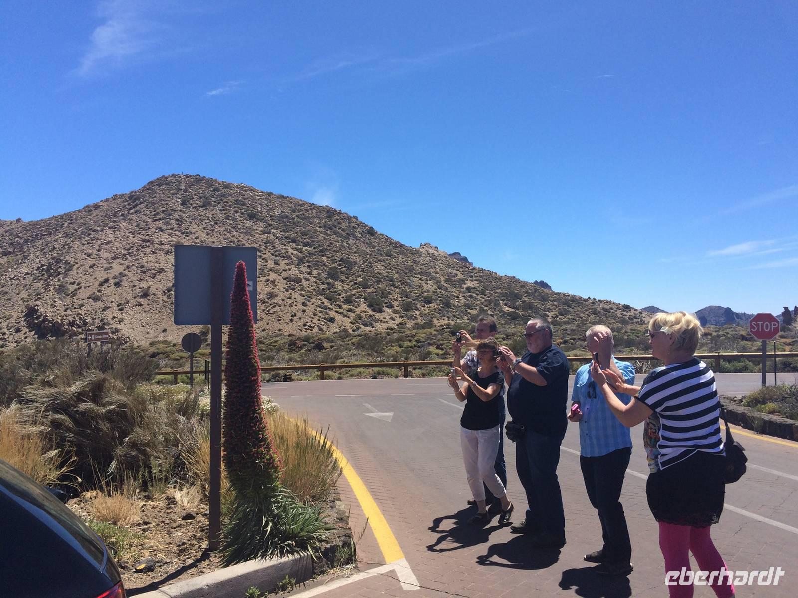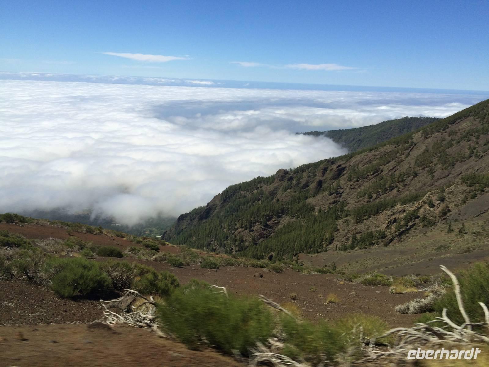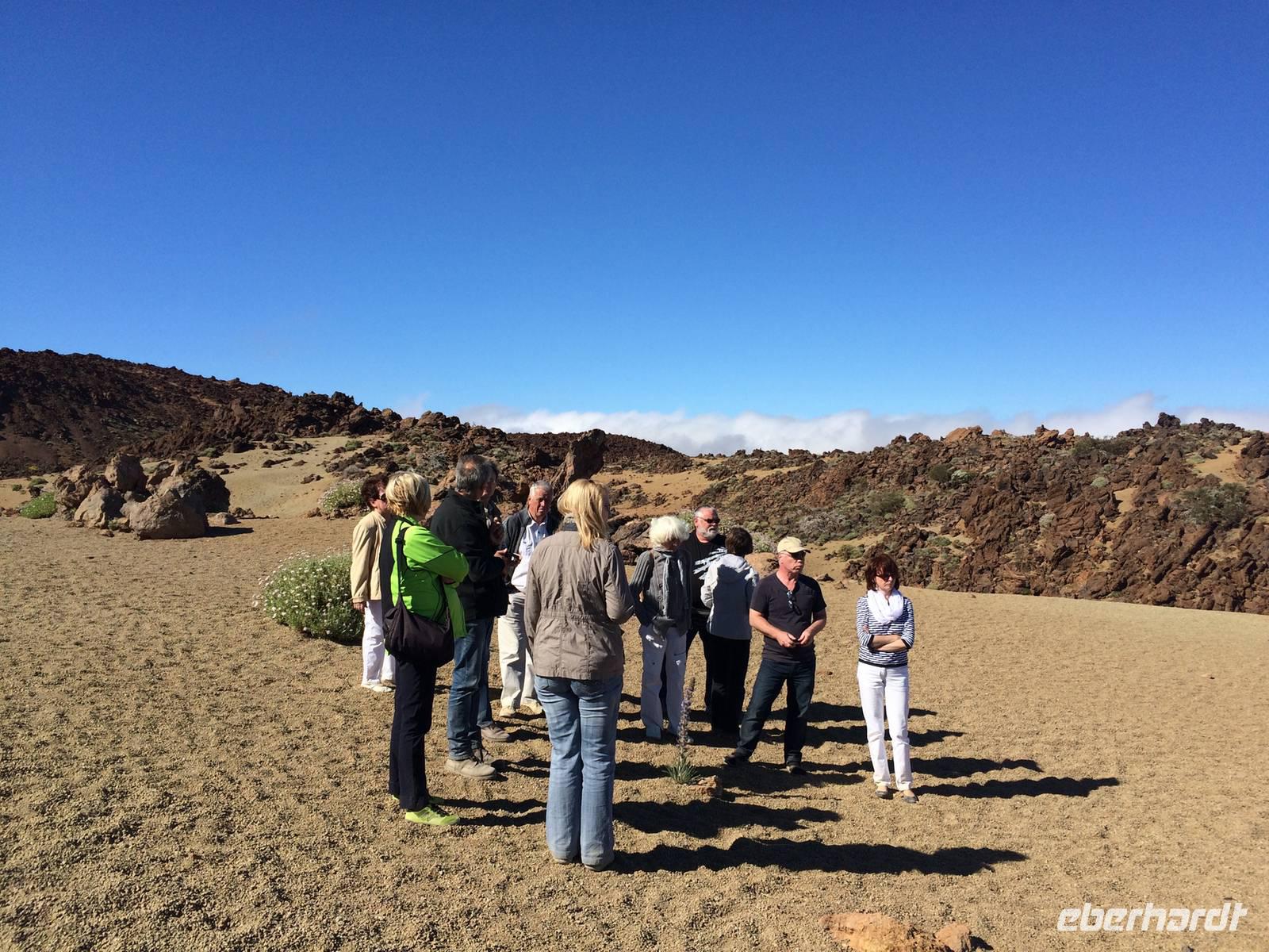 Nach soviel kulturgeschichtlicher Auseinandersetzung mit der Vergangenheit wenden wir uns der Natur zu. Anstatt der Weinverkostung in einer Bodega unternehmen wir nun den Ausflug in den Teide-Nationalpark. Vorbei an einer Corfio-Mühle verlassen wir die städtischen Gebiete und fahren durch den dichten Esperanzawald. Nachdem wir durch die dichte Wolkendecke gefahren sind, heißt es Vorhang auf für Mutternatur! Bei strahlendem Sonnenschein eröffnet sich uns ein spektakulärer Blick auf den Teide, den höchsten Berg Spaniens, der sich aus dem Wolkenmeer erhebt. Uns verschlägt es fast die Sprache, so traumhaft ist der Anblick! Auf dem Gipfel und an den Flanken des 3.718 Meter hohen Berges liegt sogar Schnee! Wir fahren weiter durch die bizarre Mondlandschaft und sehen die verschieden farbigen Lavaströme, an denen sich dessen Alter ablesen lässt. Über den Wolken, ... mh mh mh...