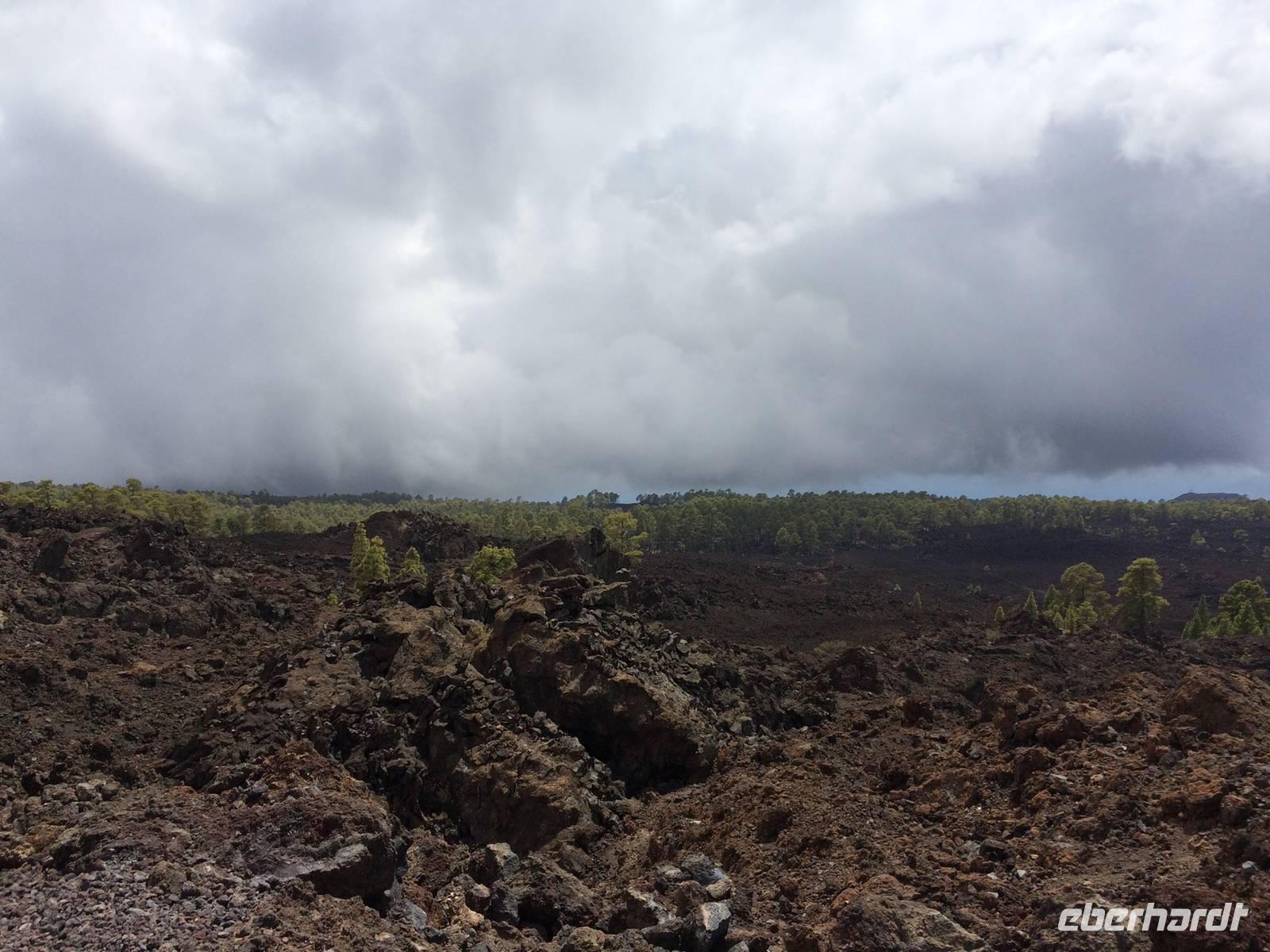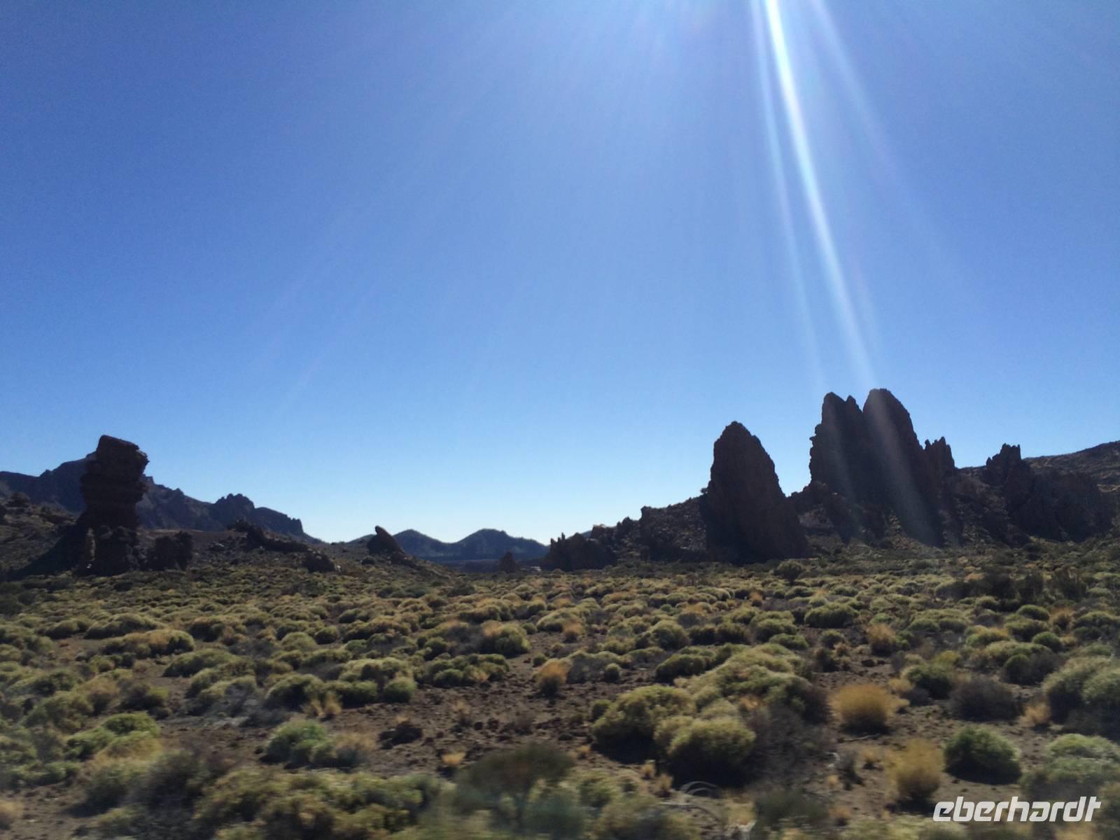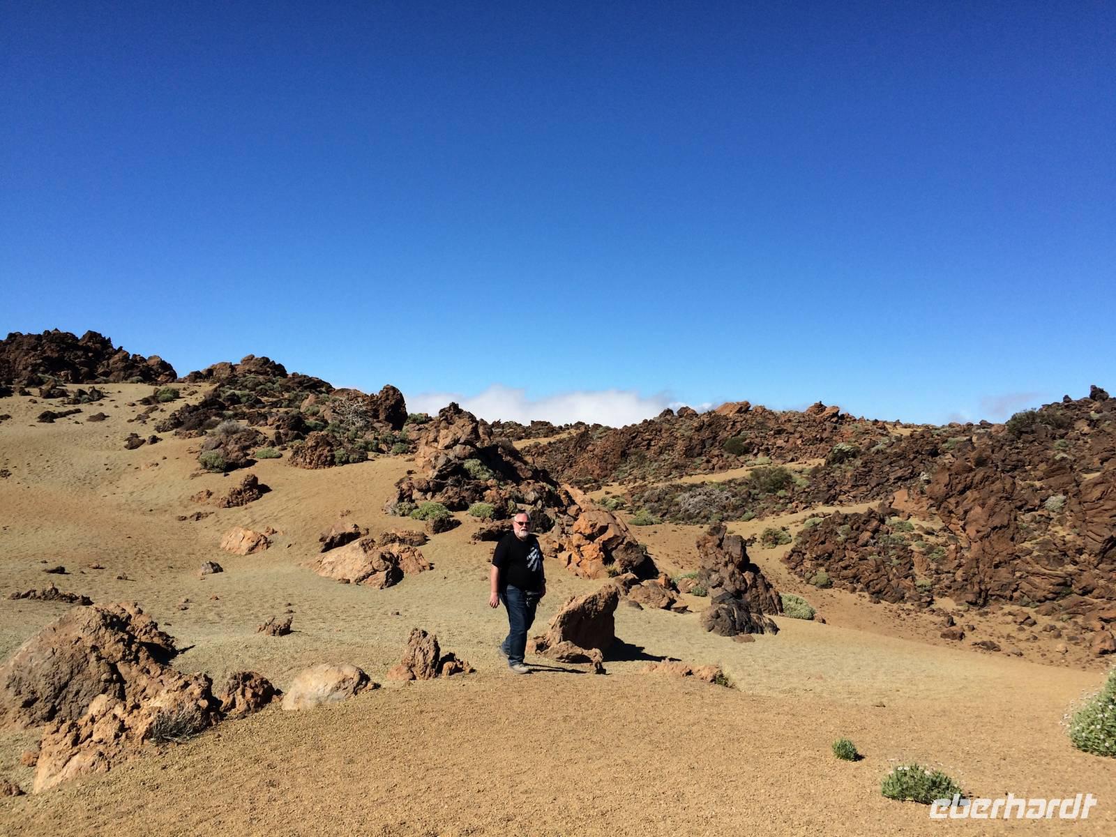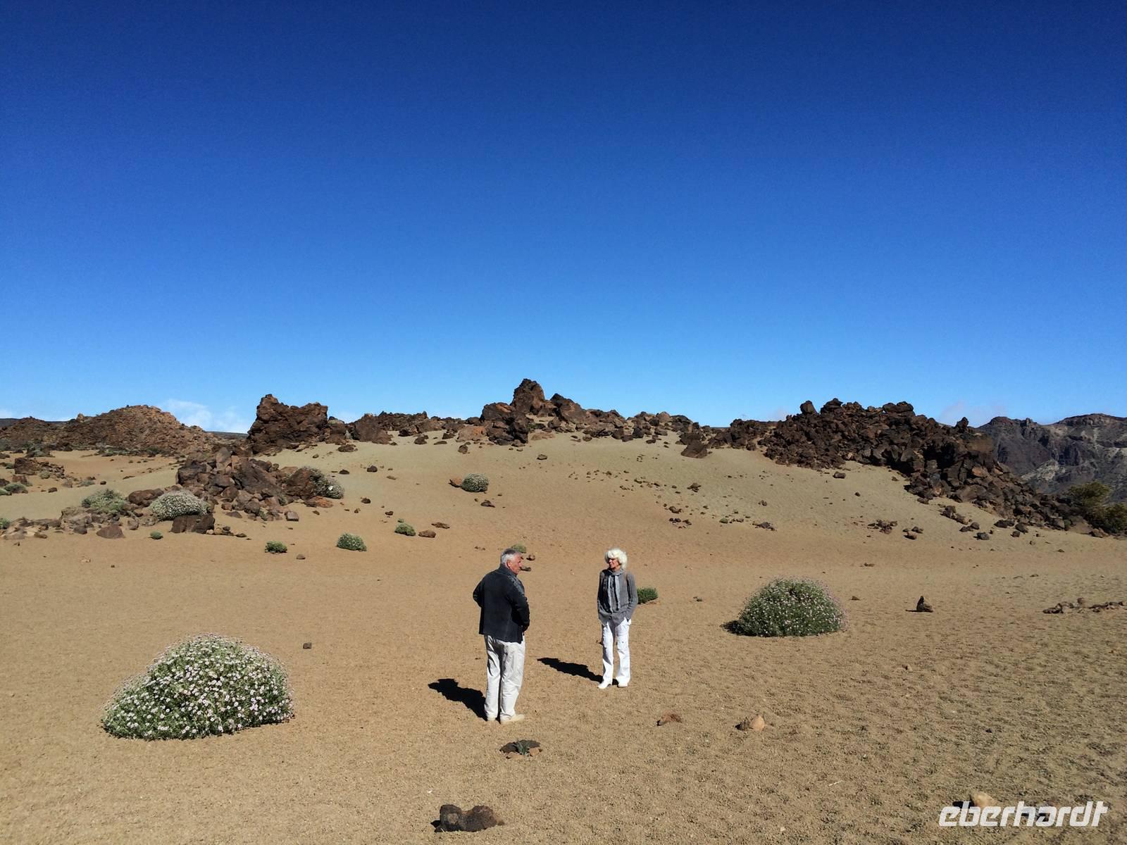 Petrus ist noch ein Mal gnädig und lässt die Sonne immer wieder durch die Wolkendecke hindurch. Eduardo und Pedro begrüßen uns am Nachmittag und wetten mit uns, dass es auf dem Teide definitiv sonnig sein wird. Und wie könnte es auch anders sein. Wir fahren zum dritten Mal und ebenfalls eine neue Route über Santiago del Teide in den Teide-Nationalpark. Von anderen Seiten und Perspektiven bewundern wir die Schönheit des Teides und seine Umgebung mit Kiefern bewachsenen Hängen. Bei einem kleinen Spaziergang durch die Mondlandschaft erhalten wir einen fantastischen Einblick über die Geschichte des seit 1954 bestehenden Nationalparkes. Mit ca. 3 Millionen Besucher im Jahr ist er der meist besuchte Park der Insel. Der Name "El Teide" stammt von den Ureinwohnern Guanchen, die den Berg "Echeyde" nannten (zu Deutsch Hölle oder Dämon). Die Legende besagt, dass der Dämon sie für die schlechten Taten der Menschen mit Vulkanausbrüchen bestrafte.