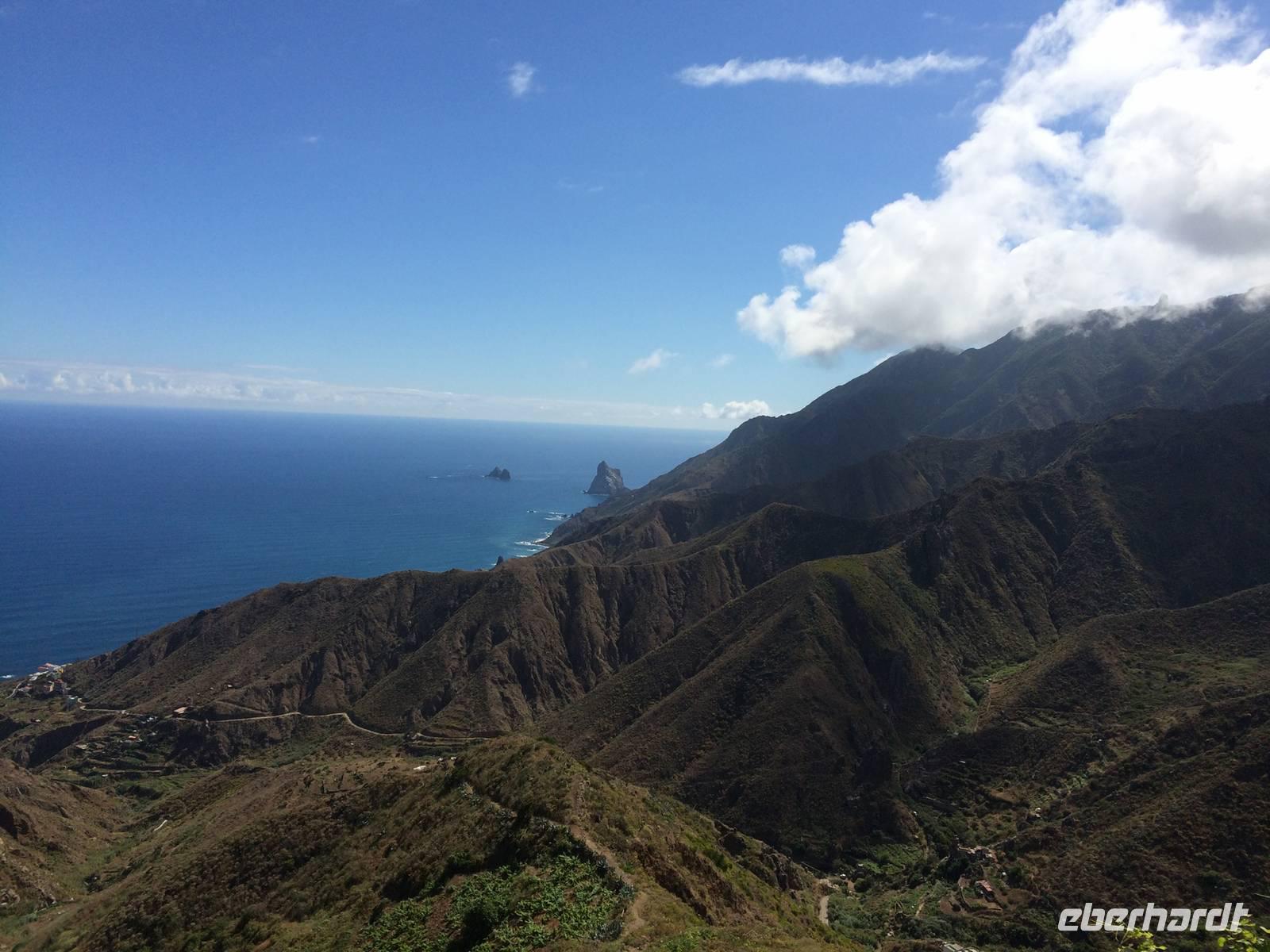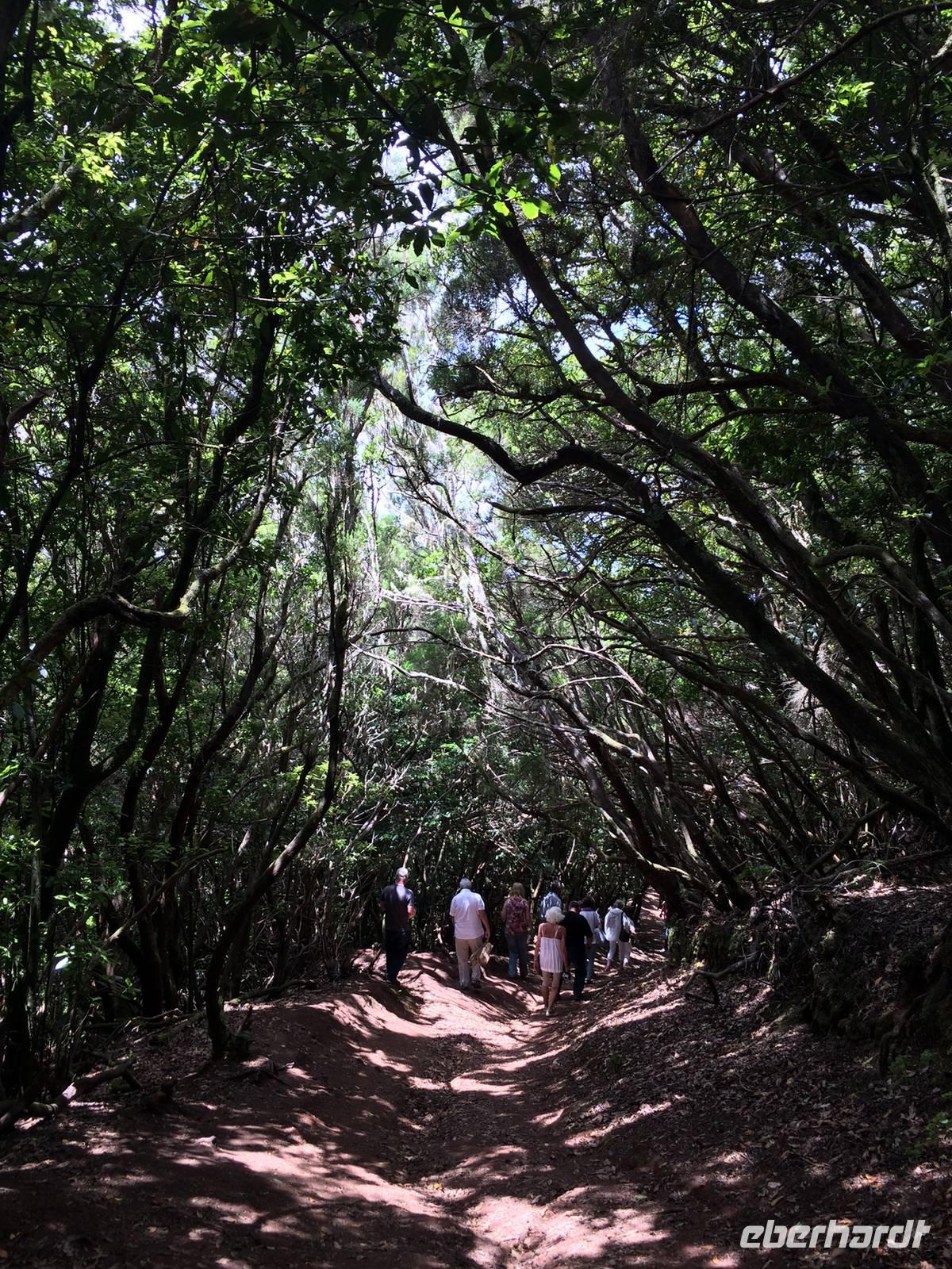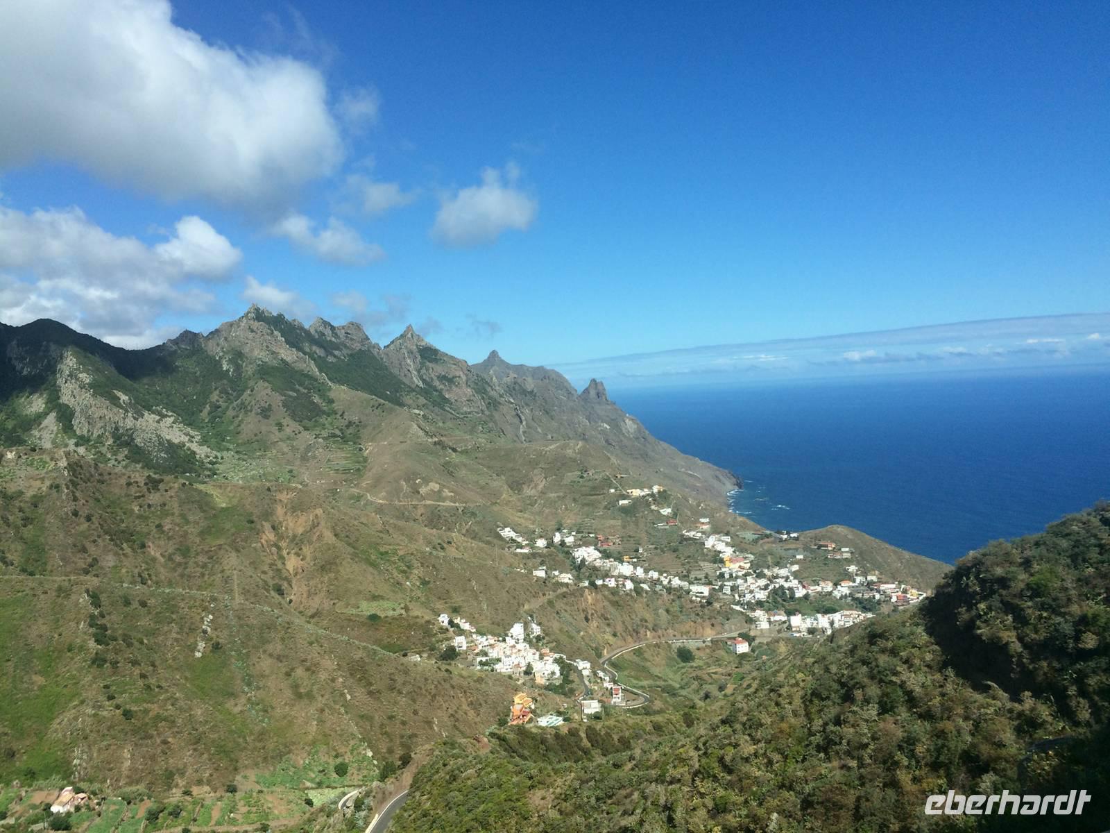 Die Vorfreude auf einen weiteren Tag in die Natur lässt mit einem zufriedenen Lächeln auf den Lippen beginnen. Santiago begrüßt uns am Hotel, unser neuer Chauffeur für heute. Dieses Mal erkunden wir die östliche Spitze des Nordens. Auch er bringt uns auf dem spannenden serpentinenreichen Weg durch die dichte Vegetation in die unvergleichlich schöne Landschaft aus steilen Erhebungen des Anaga-Gebirges. An manchen Punkten können wir deutlich die zwei Klimawelten sehen - der karge, graue Süden steht dem grünen Norden gegenüber. Eduardo erklärt uns wie sich die Fall- und Passatwinde auf die Vegetation auswirken. Die Nebelschwaden ziehen über die kargen Gebiete weg und fallen wie ein Vorhang auf der anderen Seite des Kammes hinunter und versorgen dort die Pflanzen mit Wasser.