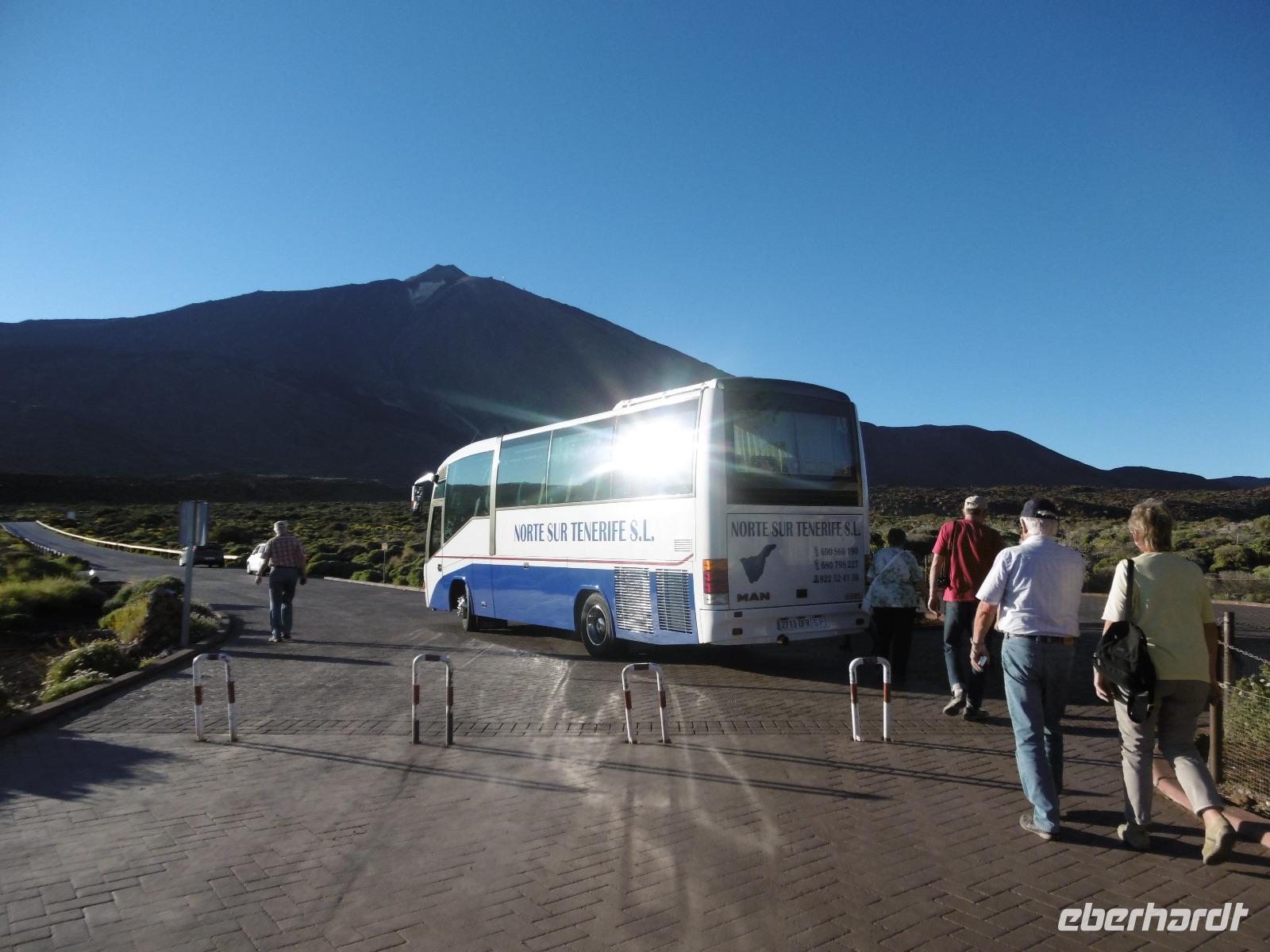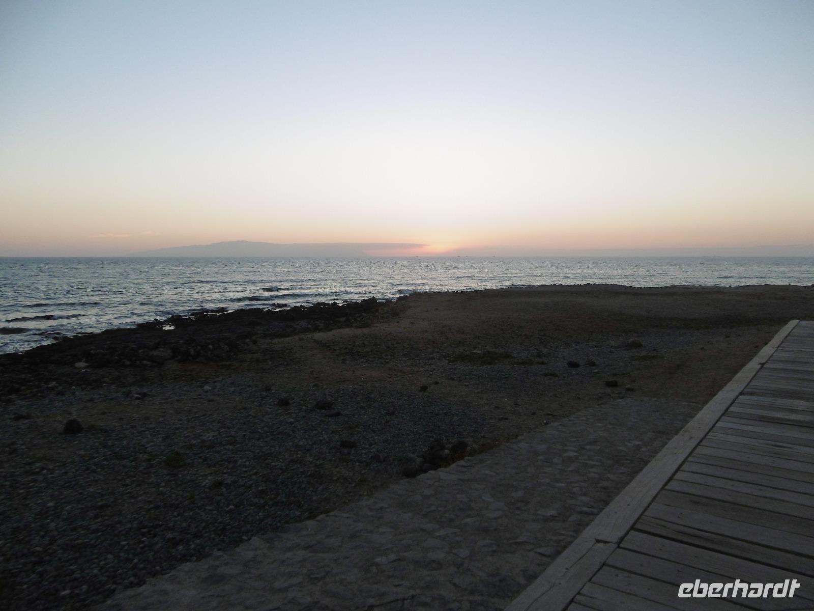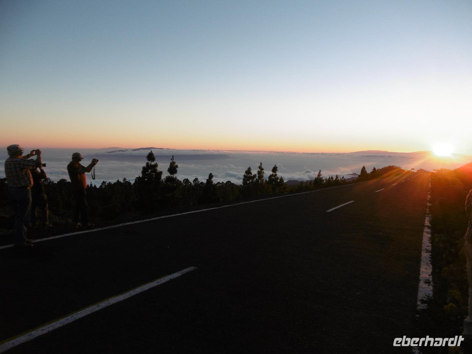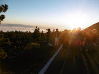 Per Bustransfer fahren wir zum Flughafen Berlin-Tegel, wo wir früh am Morgen gen Teneriffa starten. Bei der Air Berlin werden wir bereits etwas auf die spanische Pünktlichkeit und Gelassenheit eingestellt. ;) Bei Anflug auf Teneriffa begrüßt uns schon ein aus den Wolken ragender Teide. Hier angekommen fahren wir in den sonnigen Urlaubsort Playa de las Americas. Wer schon in Teneriffa angekommen ist, kennt den ersten weniger positiven Eindruck bei der Fahrt vom Flughafen in den Süden. Die Strecke besteht nur aus Wüste und Gestein. Doch schon bald werden wir die Insel in all ihrer Vielfalt entdecken. Da wir sehr zeitig im Hotel ankommen, begeben wir uns zunächst auf einen kurzen orientierenden Spaziergang in die nähere Umgebungung und sehen dabei den nächstgelegenen Strand und die Surfer-Steinküste. Nach dem Check In im Hotel heißt es erstmal Mittagspause - wir alle sind sehr müde, da die ersten von uns bereits um 23 Uhr des Vortages zu Hause abgeholt wurden. Am Nachmittag landen auch die Frankfurter Gäste und unsere Reisegruppe ist komplett. Nach dem reichhaltigen Abendessen im Hotel begeben sich einige noch zum Strand um den Sonnenuntergang zu sehen. Die Sonne geht neben der Nachbarinsel La Gomera unter und färbt manchmal den Teide sagenhaft rot. Bei guten Wetter sind alle drei Nachbarinseln (El Hierro, La Gomera und La Palma) zu sehen.
